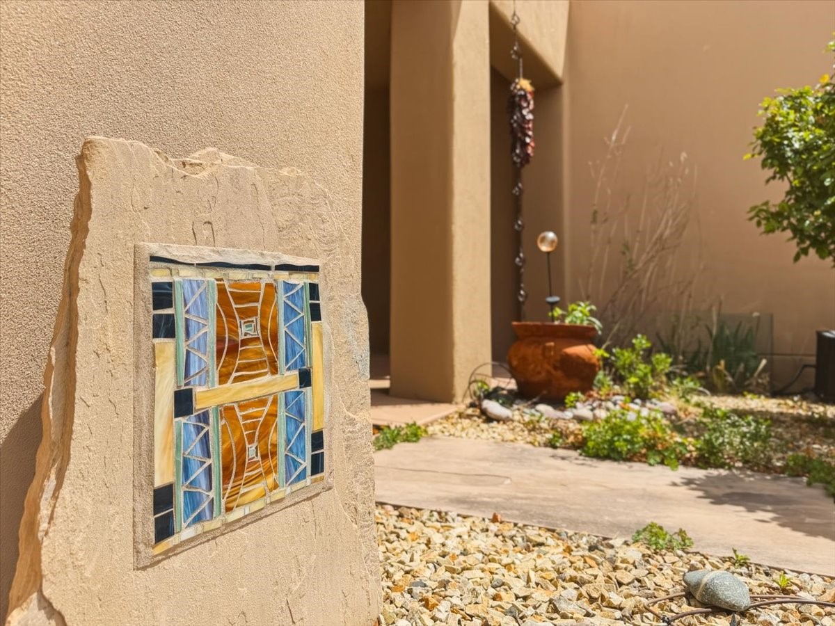 Beautiful 3 bed/2.5-bath home built in 2015. Mostly single-level with 3 stair drop to bedrooms. Perfectly situated on a 0.34-acre lot surrounded by natural pinon and juniper open space, 8 minutes from downtown Santa Fe. Offering 1,850 sq ft of thoughtfully designed living space and a finished 3-car EV-ready garage with workbench area, shelves, and overhead storage, this single-owner home blends Santa Fe charm with modern efficiency. Tall ceilings and large-format tile floors enhance the open feel, while wood ceilings with vigas and latillas add warmth. The kitchen features granite countertops, under-cabinet lighting, gas range, ENERGY STAR® appliances, and hood-mounted microwave. Expansive picture windows frame Sangre de Cristo views, filling the home with natural light. Step from the dining area to a covered patio and a private screened spa retreat with multi-person 220V hot tub off the primary suite. The spacious primary suite offers room for a home office or yoga area, plus a walk-in closet with custom Modular Closets® and built-in staircase to high-bay storage. The primary bath boasts an oversized walk-in shower with no glass door and a private toilet area. Energy efficiency abounds with 31 owned solar panels to power spa, home and 300 miles daily for up to 3 EVs, foam-core insulation, radiant floor heat, solar tubes, recirculating hot water, whole-house fan, and motorized exterior sunshades. Additional features include a water softening and revese osmosis systems, radon mitigation, low-VOC finishes, and a partially concrete driveway for easy snow removal. The driveway can accommodate 5 cars in addition to garage. Outdoors, enjoy professional landscaping, drip irrigation, a secluded flagstone patio for dining or stargazing, a fully fenced garden area with shed, and rainwater barrels. Scenic walking trails with mountain views. Convenient access to Hwy 599 makes commuting to Los Alamos or the Santa Fe Airport a breeze. Views and comfort in one perfect package.