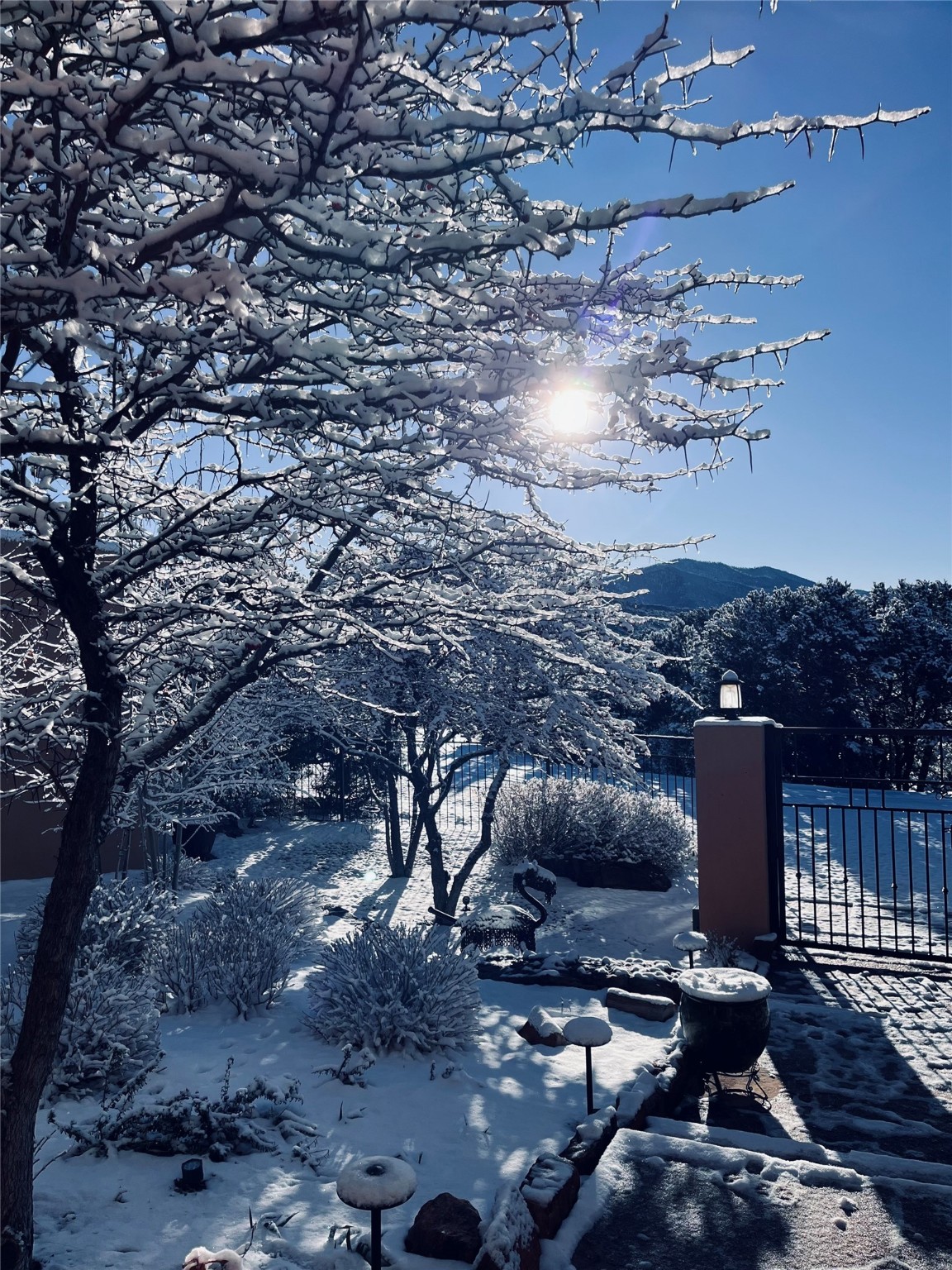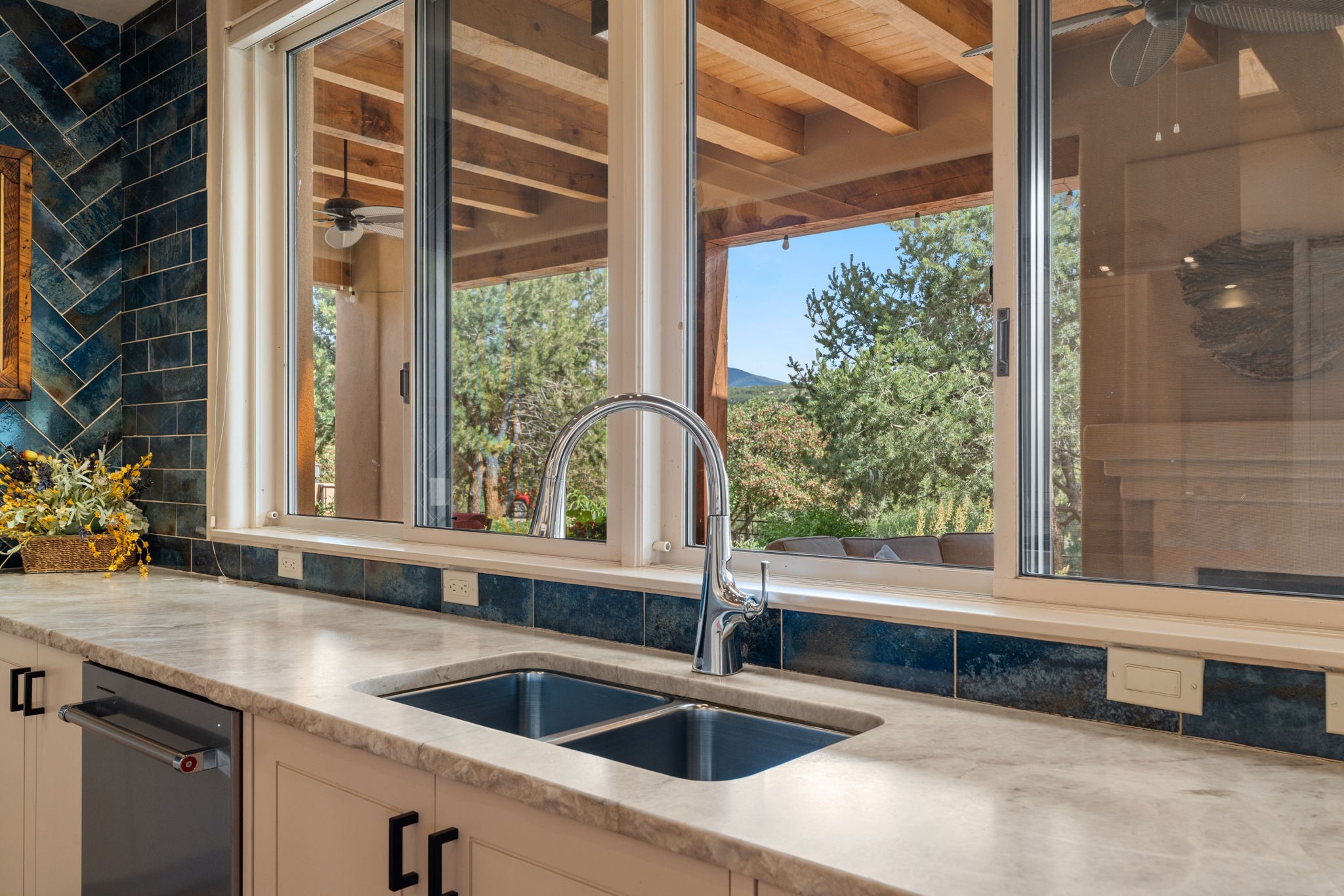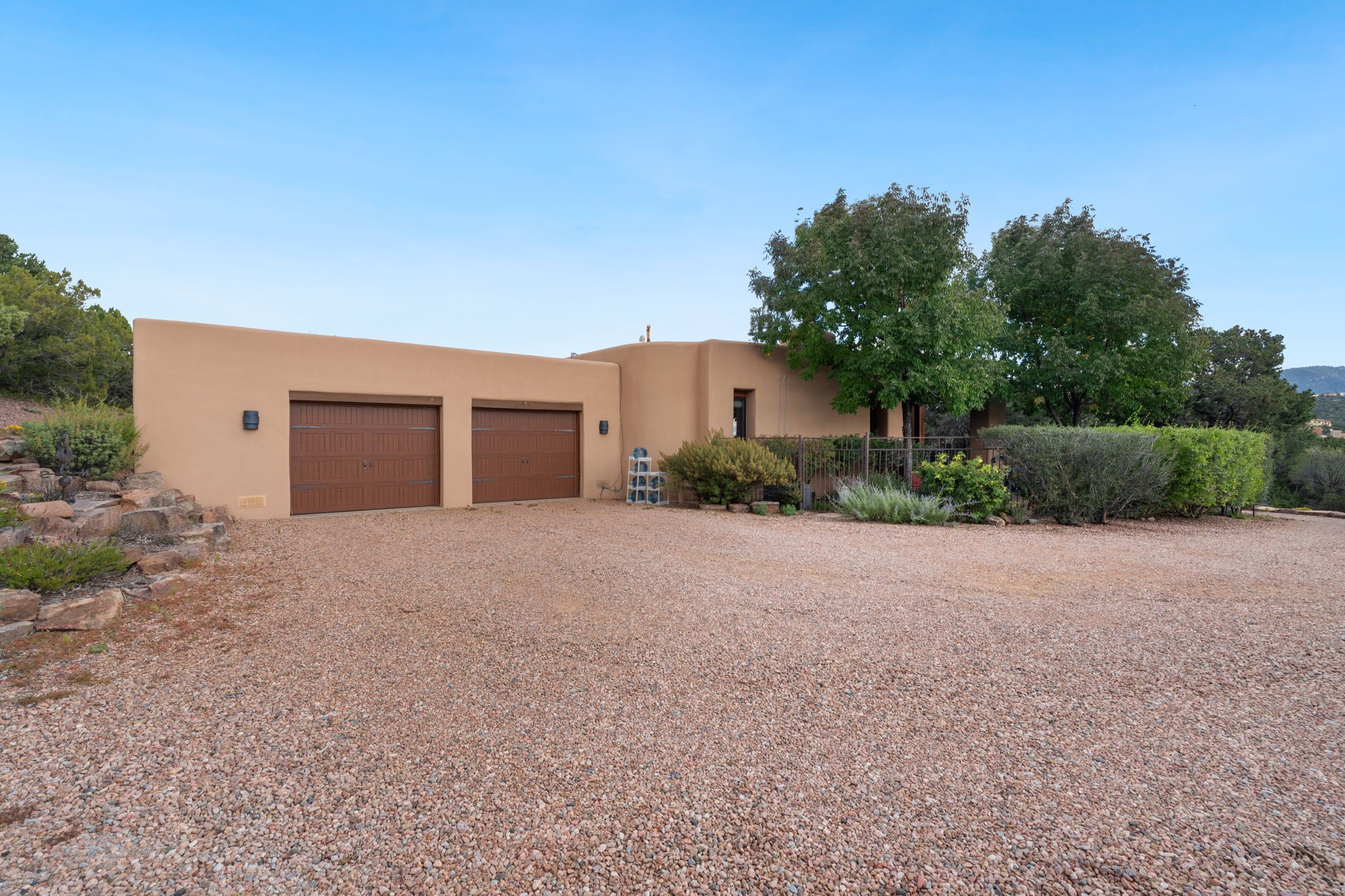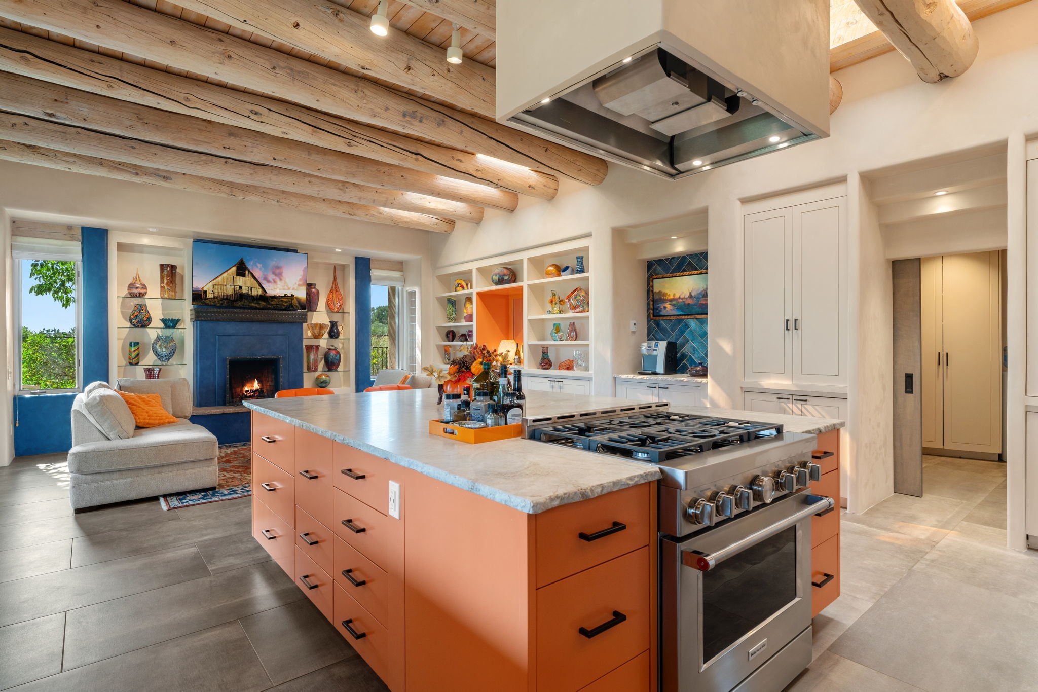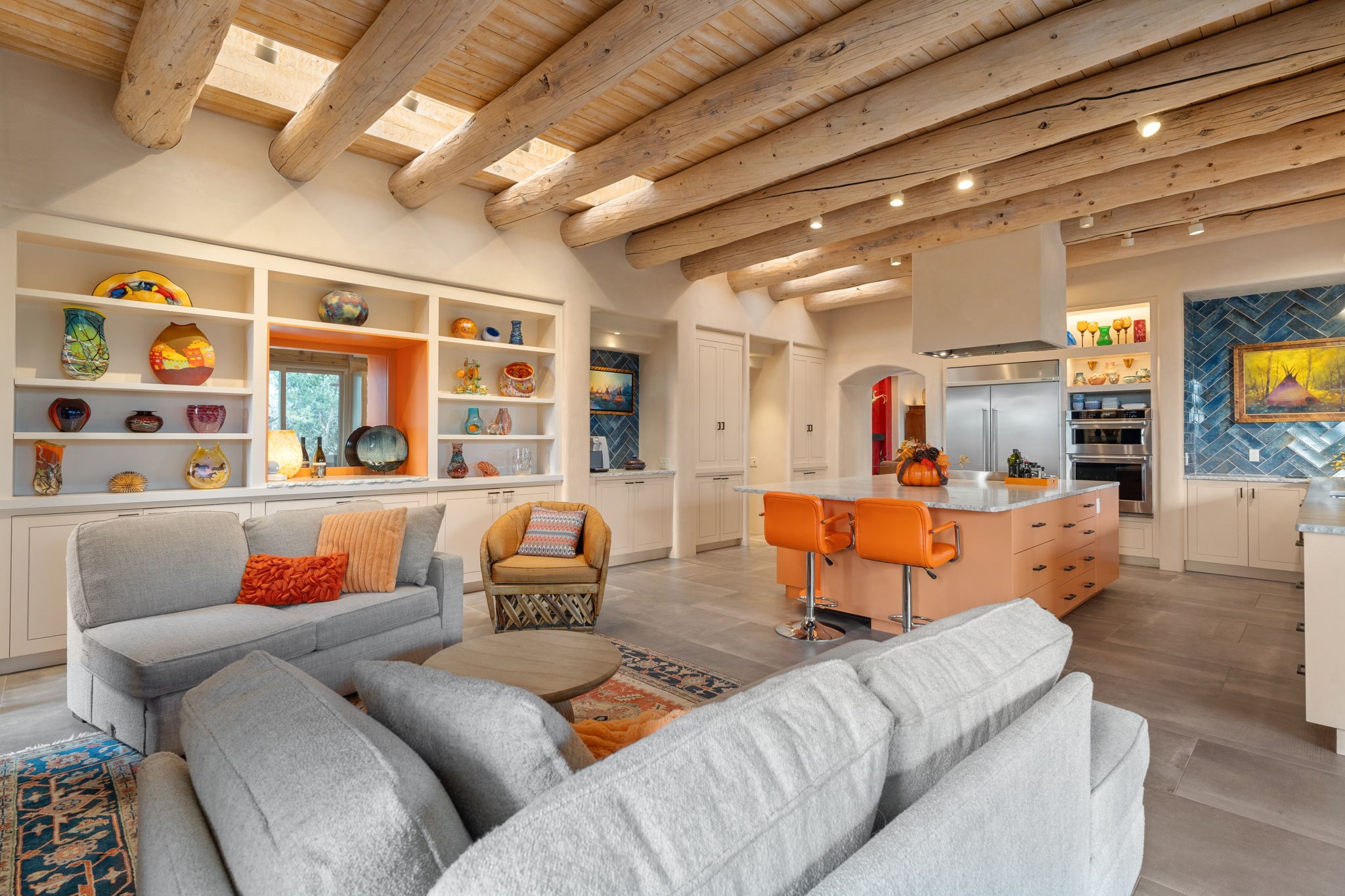 Tucked just a mile from the historic Santa Fe Plaza, this exceptional adobe estate blends classic Northern New Mexico architecture with modern sophistication. Set on a wooded, private property, it features a 3,263 sq. ft. main house and a 1,340 sq. ft. detached casita--ideal for guests or extended family.Handcrafted details abound: viga beams, tile and hardwood floors, and softly curved adobe walls that invite natural light. The great room offers tall ceilings, a grand fireplace, and picture windows framing mountain views. Double doors open to a covered portal with outdoor fireplace and seating for year-round entertaining.Remodeled in 2024, the chef's kitchen includes a six-burner range, convection oven, oversized island, premium appliances, built-in bar, and coffee station--perfect for gatherings large or small.The primary suite is a serene retreat with fireplace, private portal, and spa-style bath with dual closets, double vanities, soaking tub, and glass-enclosed shower. A guest suite, radiant heating, skylights, and seven mini-splits enhance comfort throughout.The detached casita echoes the main home's charm, offering two bedrooms, two baths, a kiva fireplace, wet bar, breakfast nook, and office area--an ideal guest or studio space.Outdoors, multiple patios and sitting areas blend seamlessly with the landscape. A 3,000-gallon cistern supports irrigation, and an EV-ready outlet adds modern convenience.With timeless adobe design, curated upgrades, and proximity to downtown Santa Fe, 1085 Camino Maana captures the essence of refined Southwestern living.