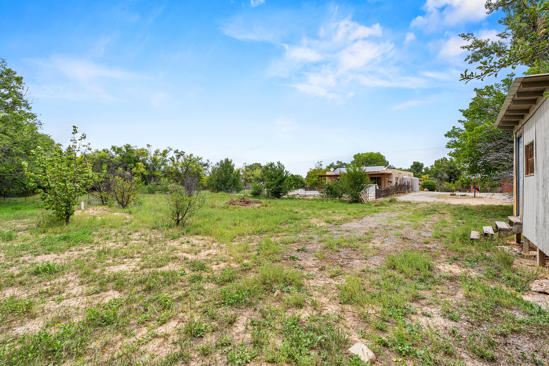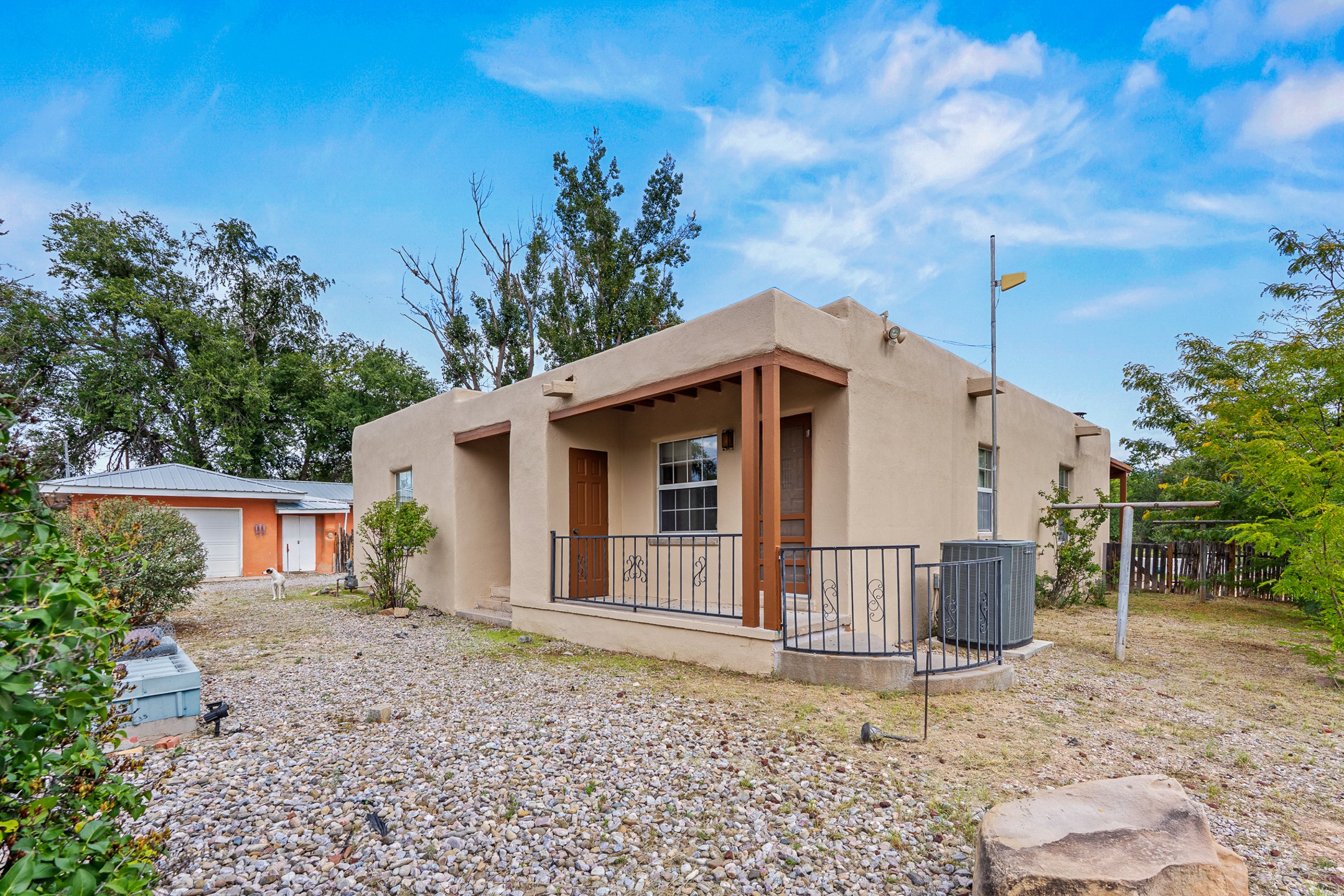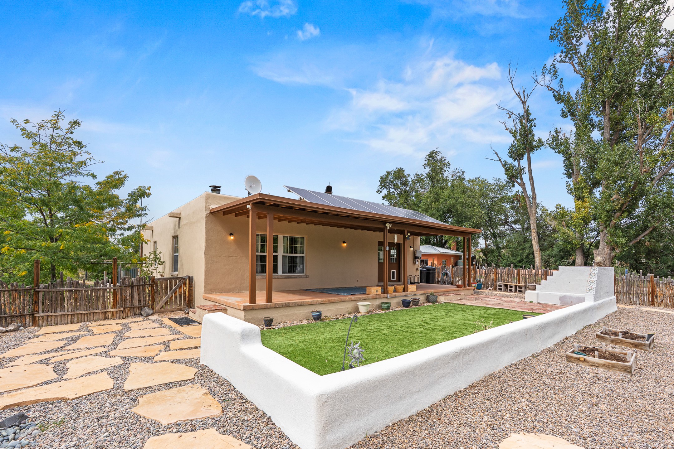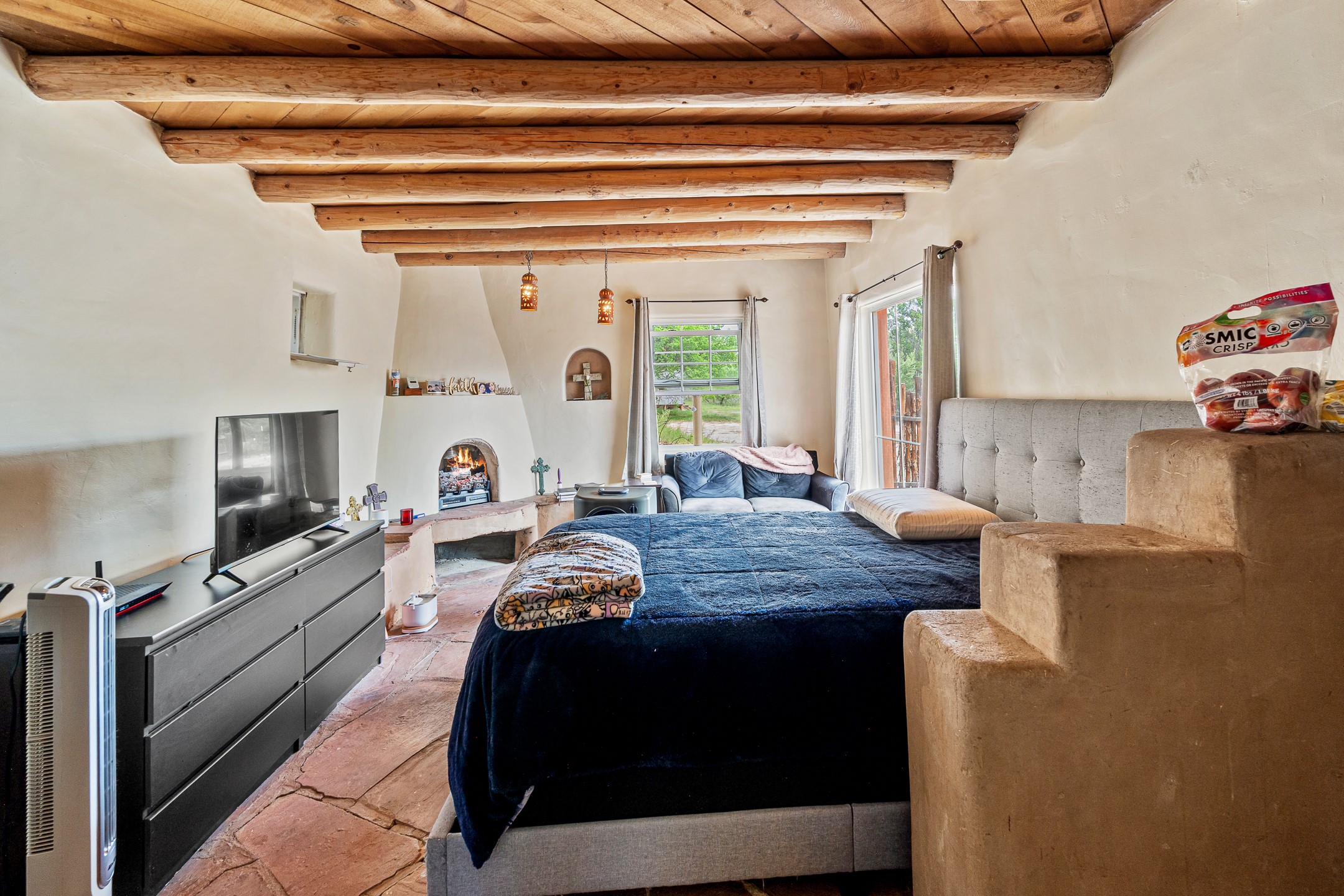 Unique Namb property featuring a 3-bed, 1 full & bath main home plus a private guest house. Owned solar conveys with sale, along with forced-air heating and central A/C for year-round comfort. Main house offers a cozy wood-burning stove and spacious layout. Guest house includes a room, kitchenette, full bath, and traditional kiva fireplace--perfect for guests, rental income, or multigenerational living. Enjoy Southwestern charm with modern efficiency in a serene setting.