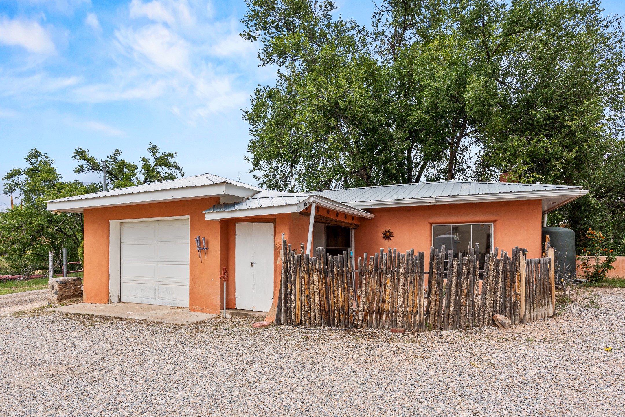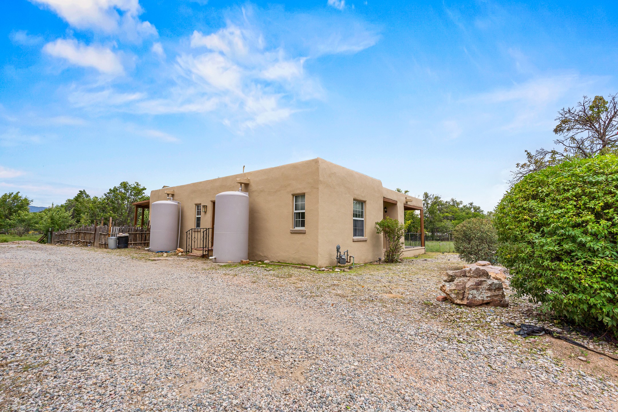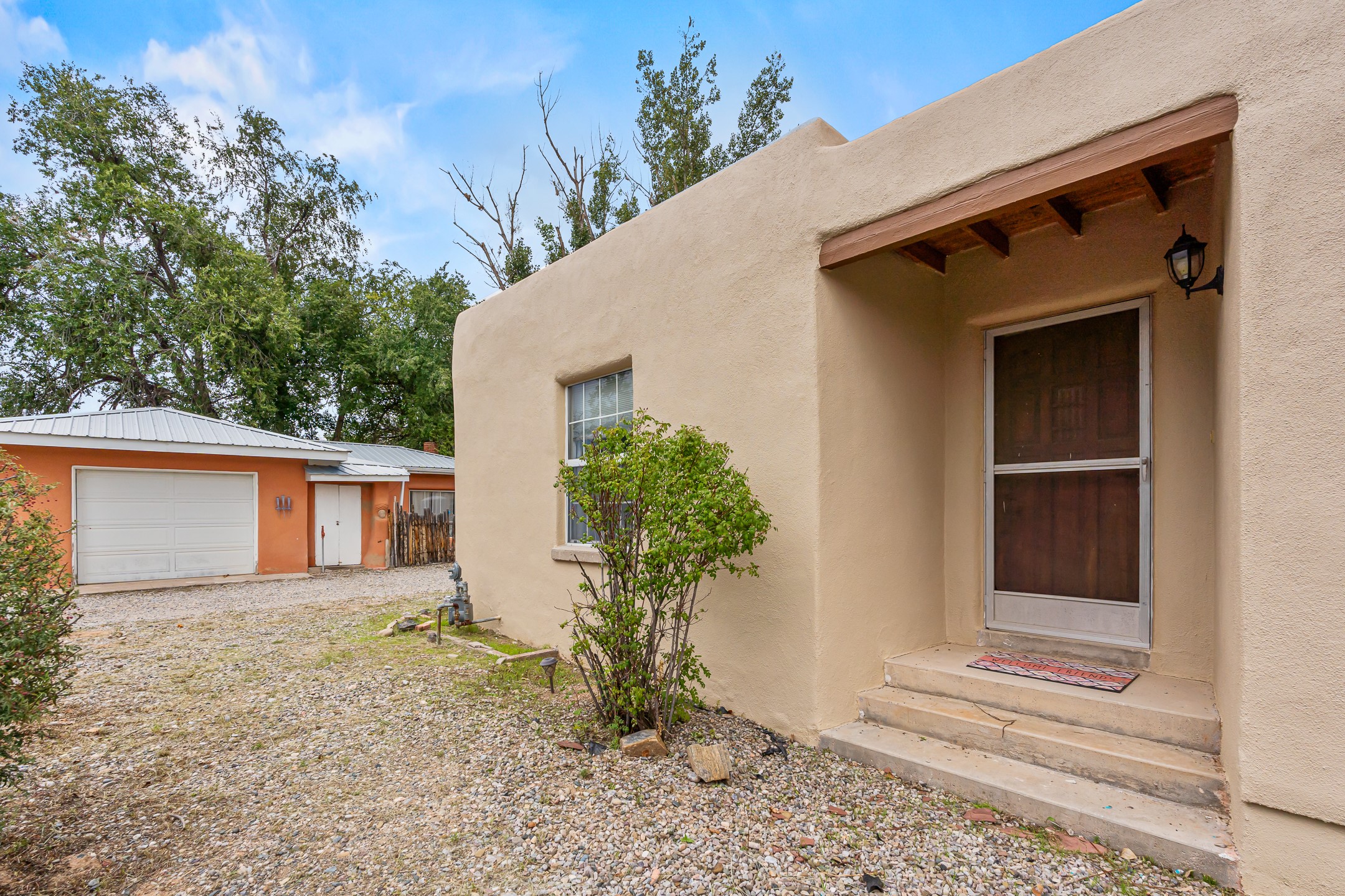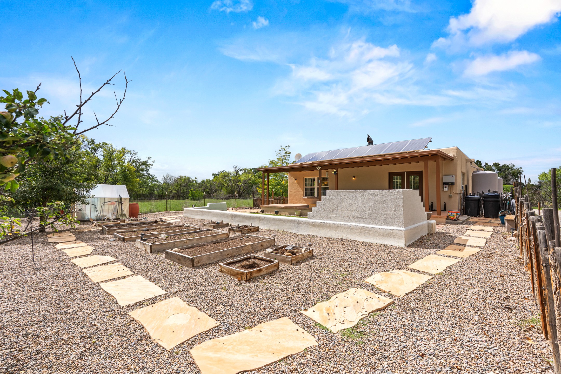 Unique Namb property featuring a 3-bed, 1 full & bath main home plus a private guest house. Owned solar conveys with sale, along with forced-air heating and central A/C for year-round comfort. Main house offers a cozy wood-burning stove and spacious layout. Guest house includes a room, kitchenette, full bath, and traditional kiva fireplace--perfect for guests, rental income, or multigenerational living. Enjoy Southwestern charm with modern efficiency in a serene setting.