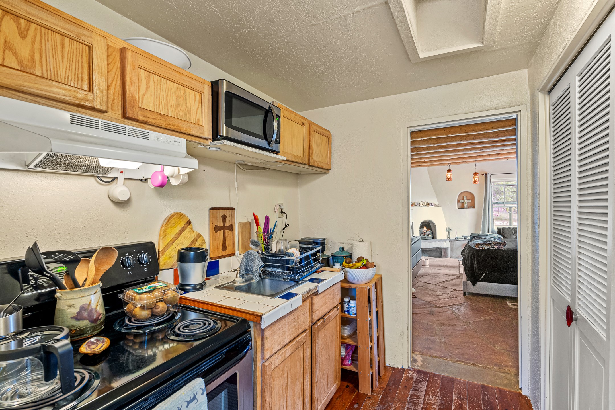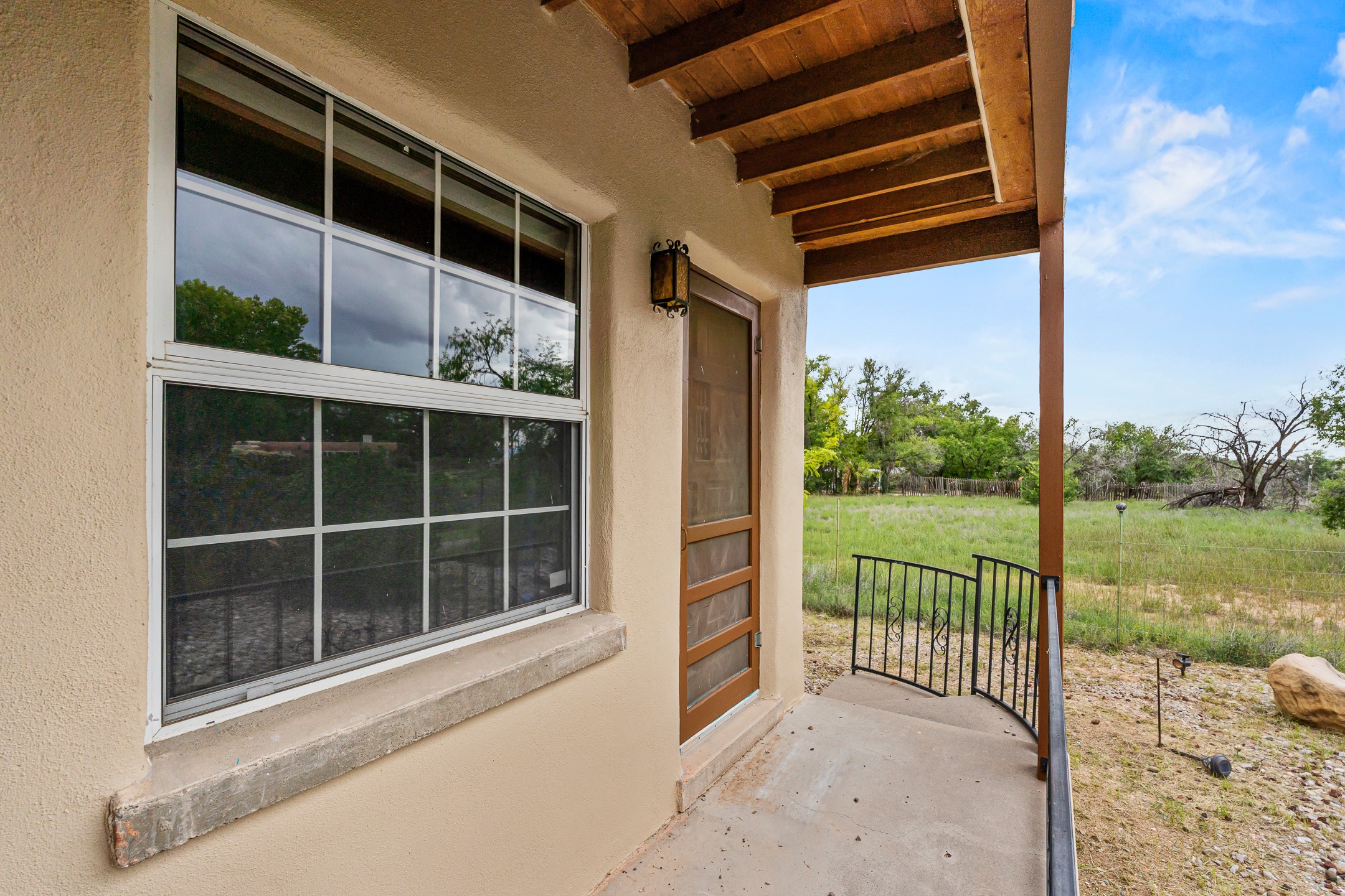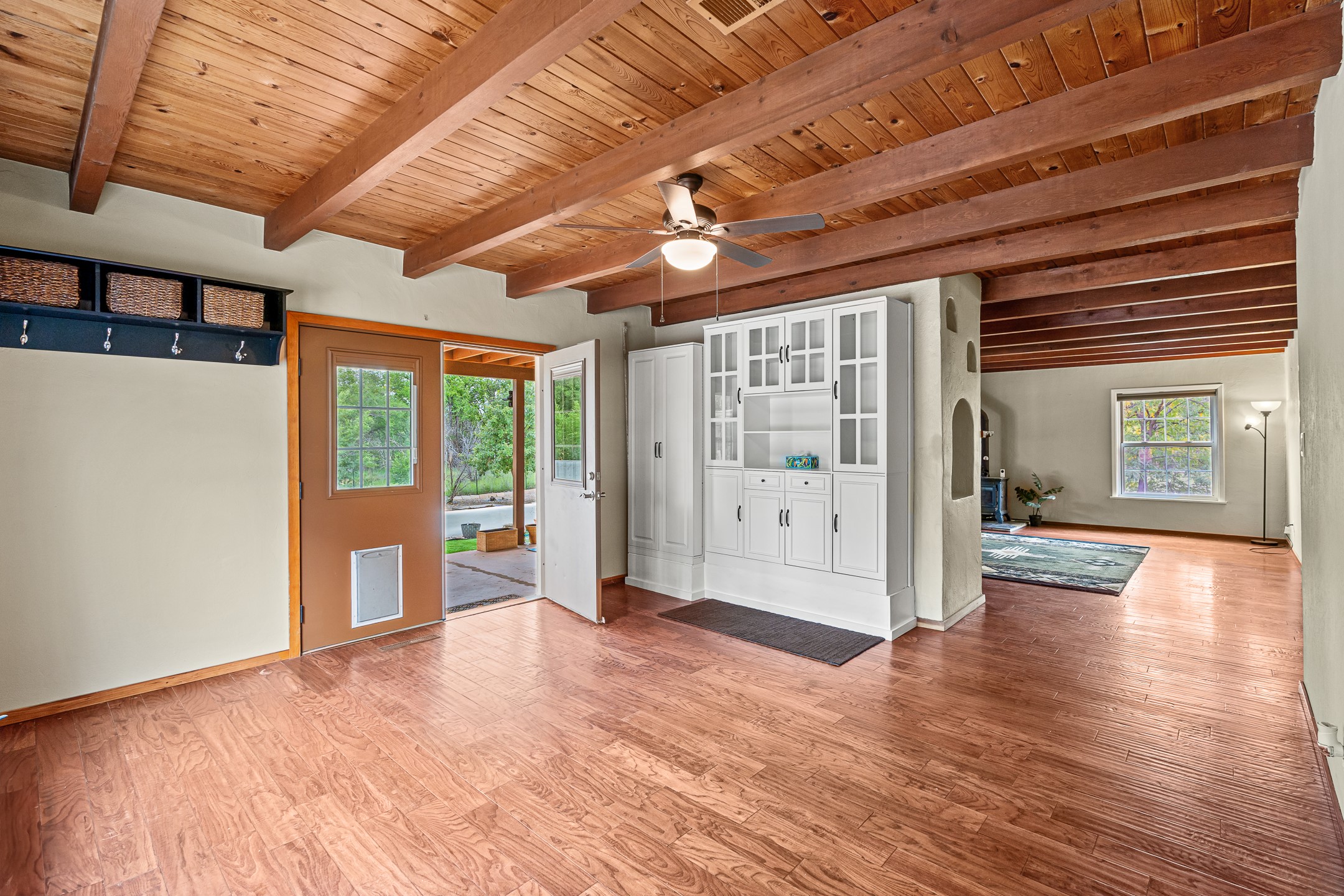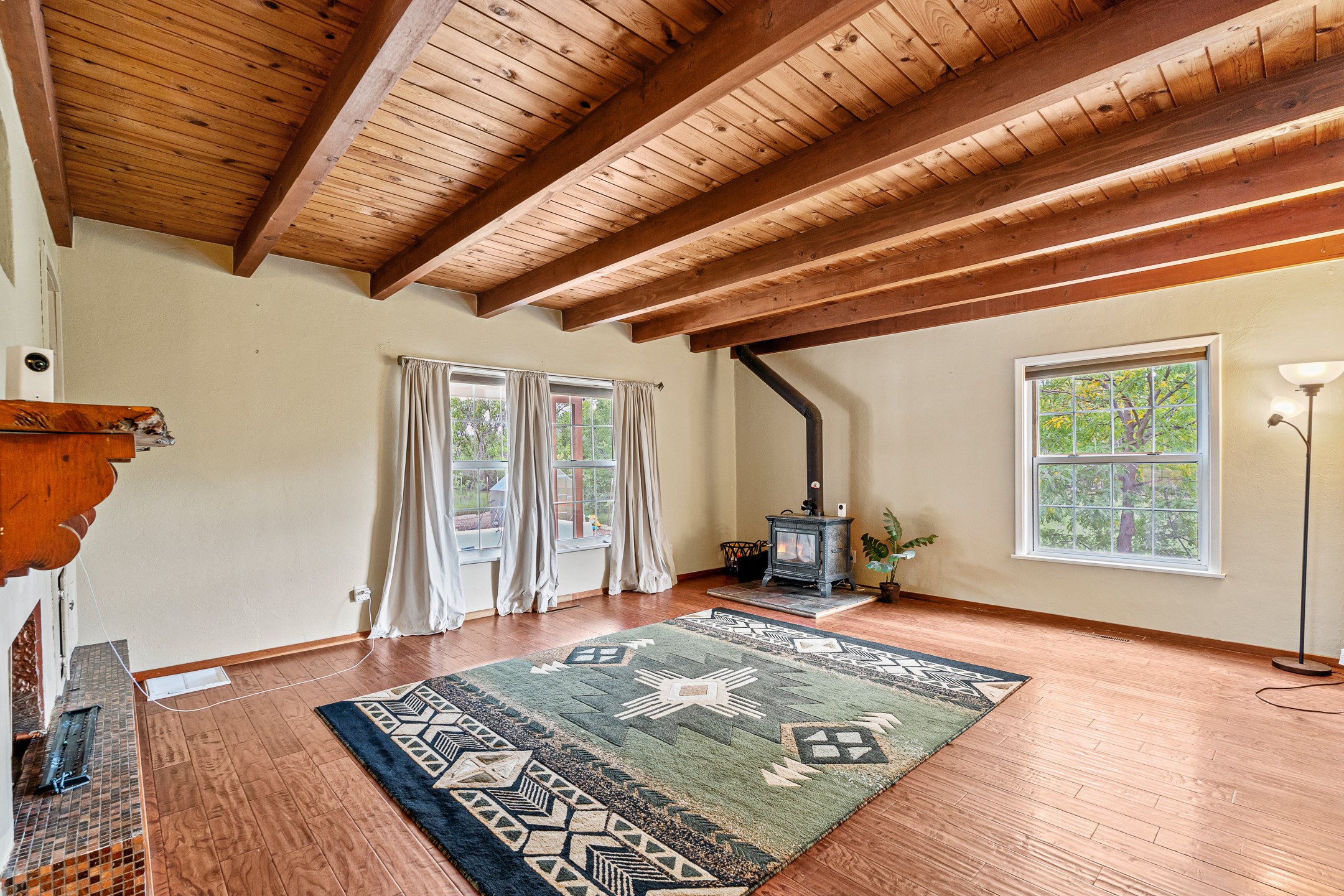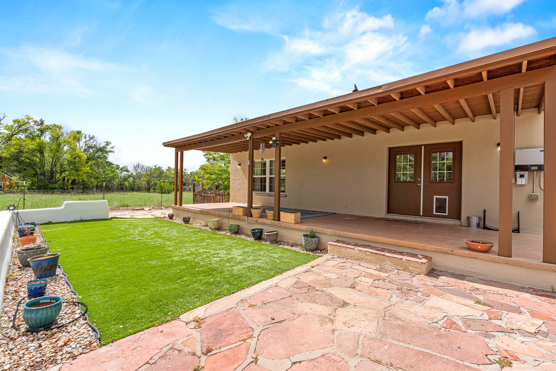Unique Namb property featuring a 3-bed, 1 full & bath main home plus a private guest house. Owned solar conveys with sale, along with forced-air heating and central A/C for year-round comfort. Main house offers a cozy wood-burning stove and spacious layout. Guest house includes a room, kitchenette, full bath, and traditional kiva fireplace--perfect for guests, rental income, or multigenerational living. Enjoy Southwestern charm with modern efficiency in a serene setting.