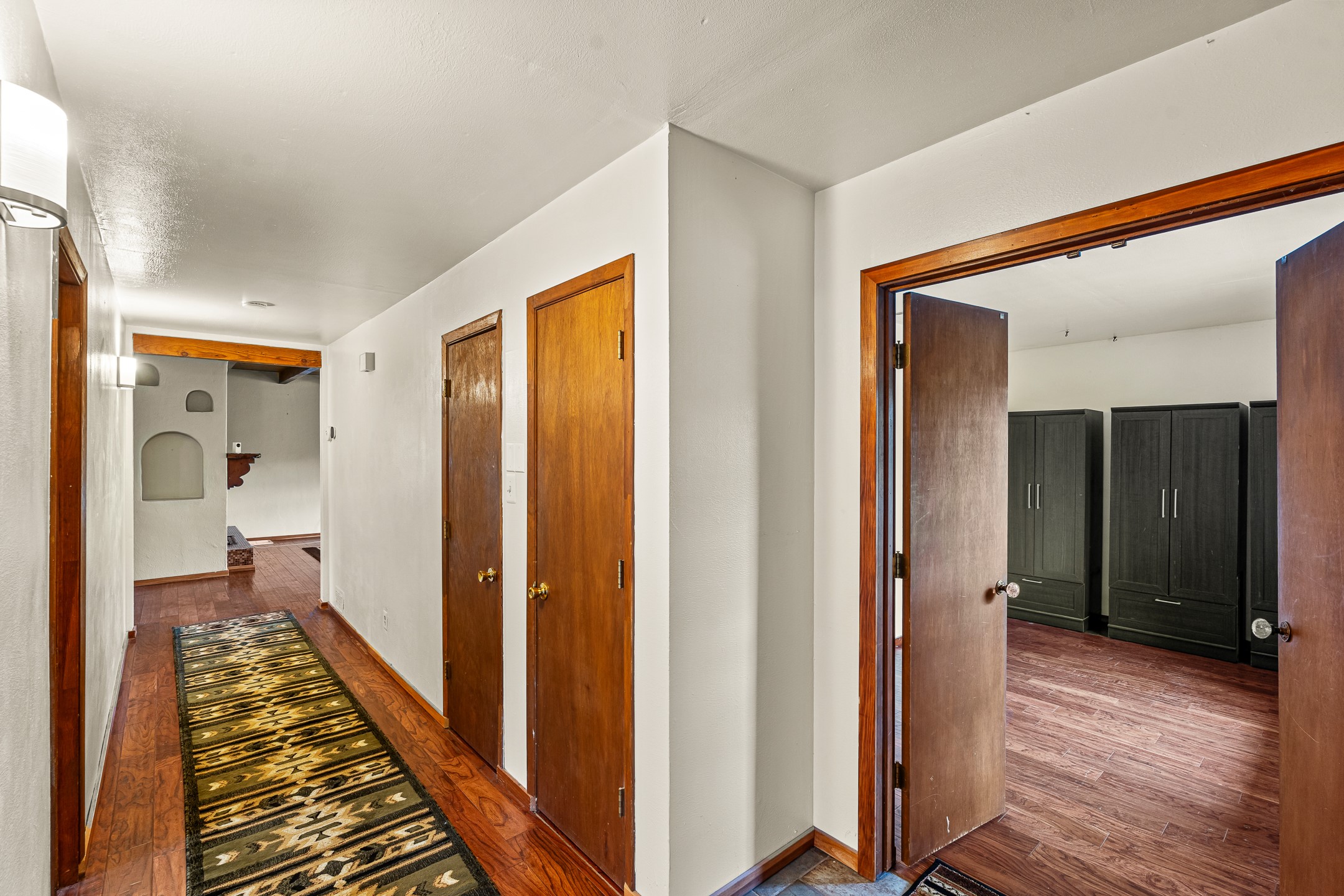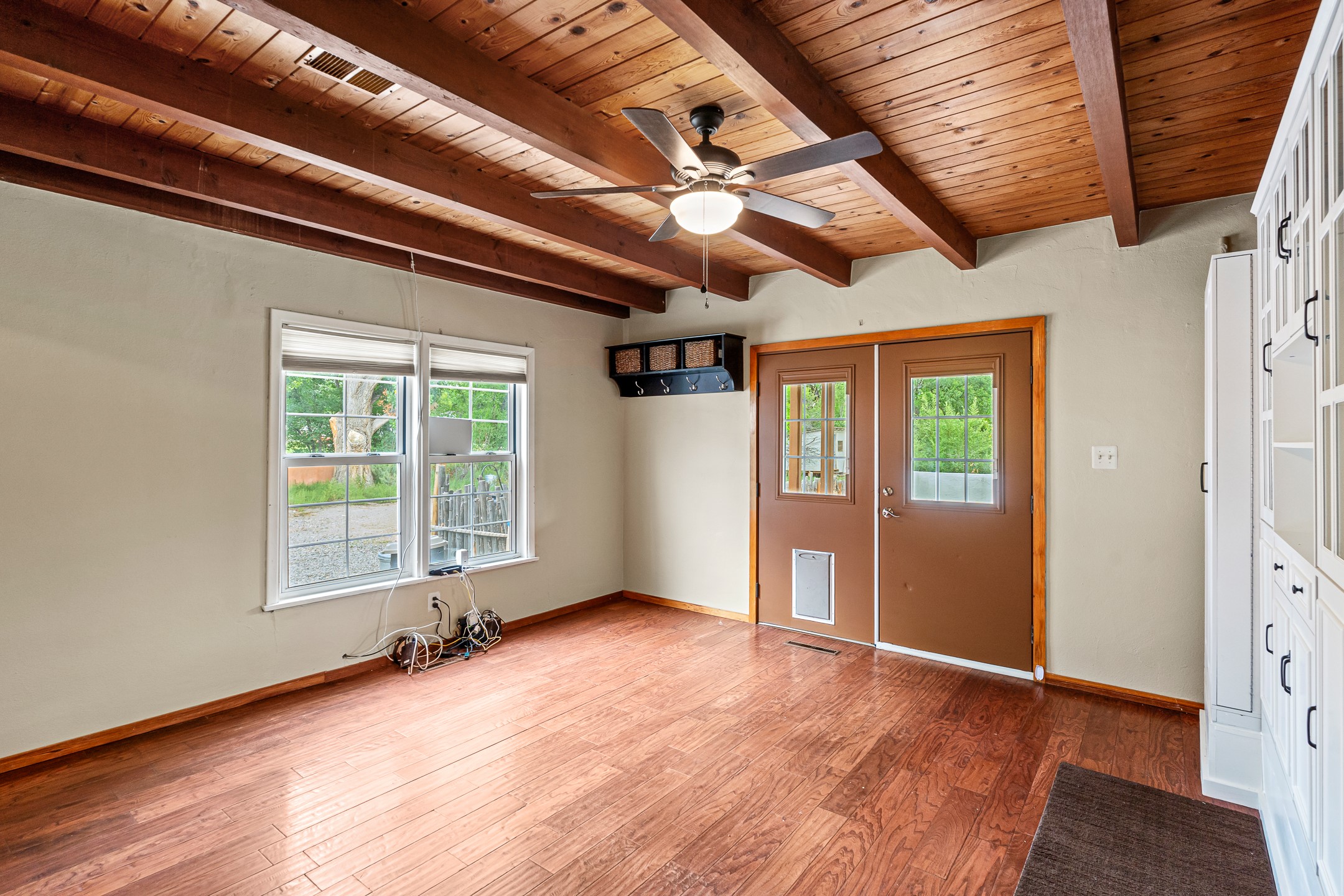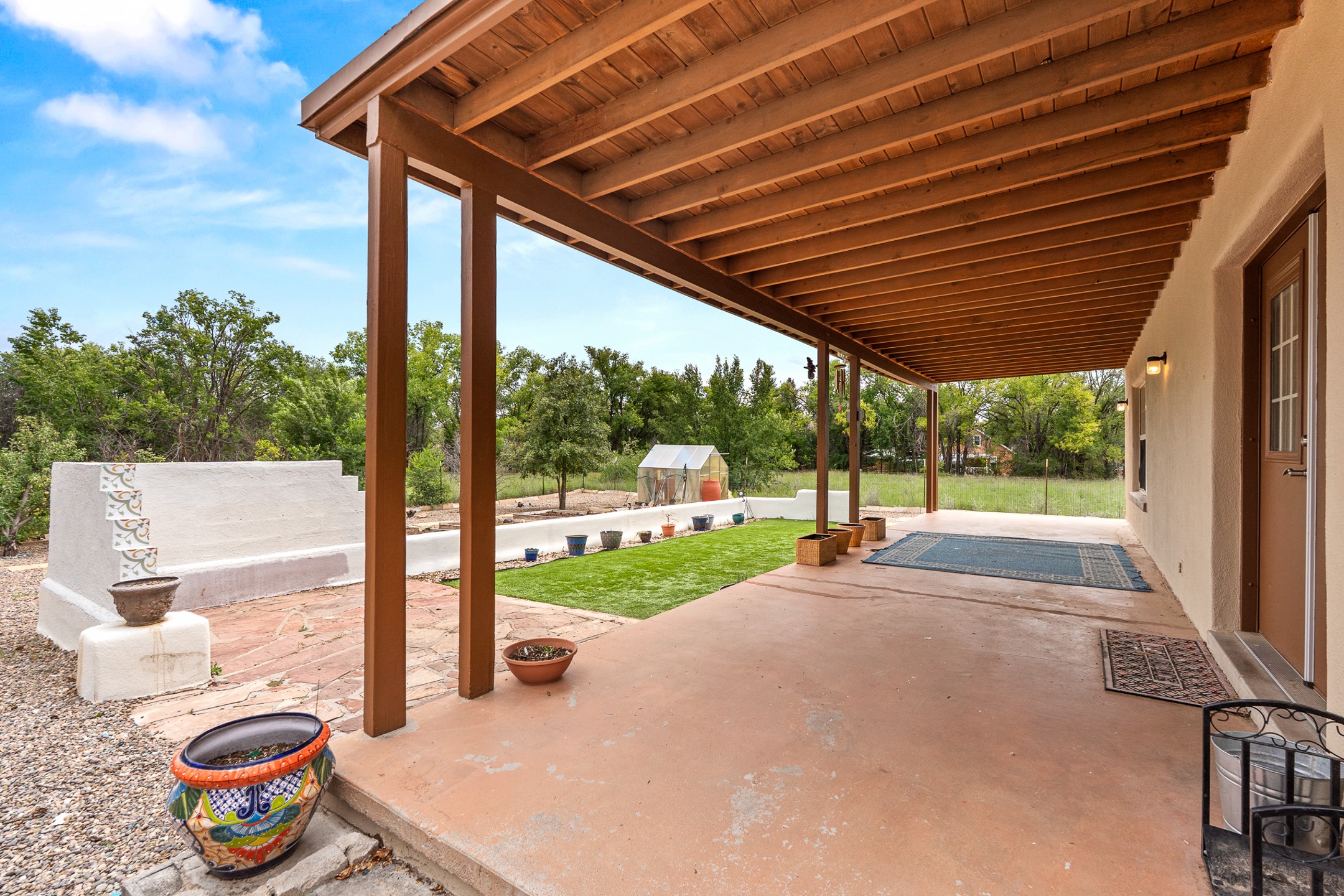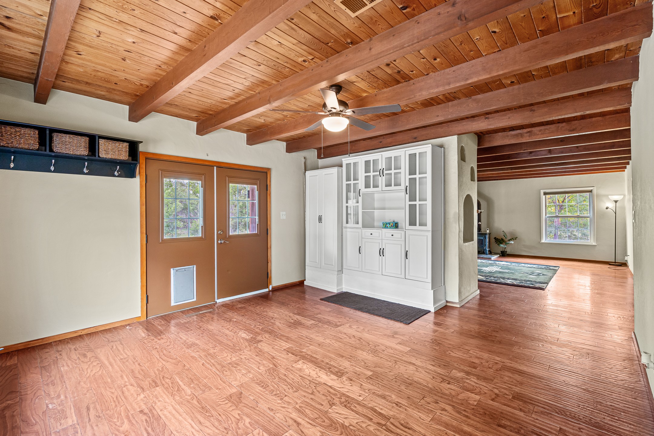 Unique Namb property featuring a 3-bed, 1 full & bath main home plus a private guest house. Owned solar conveys with sale, along with forced-air heating and central A/C for year-round comfort. Main house offers a cozy wood-burning stove and spacious layout. Guest house includes a room, kitchenette, full bath, and traditional kiva fireplace--perfect for guests, rental income, or multigenerational living. Enjoy Southwestern charm with modern efficiency in a serene setting.