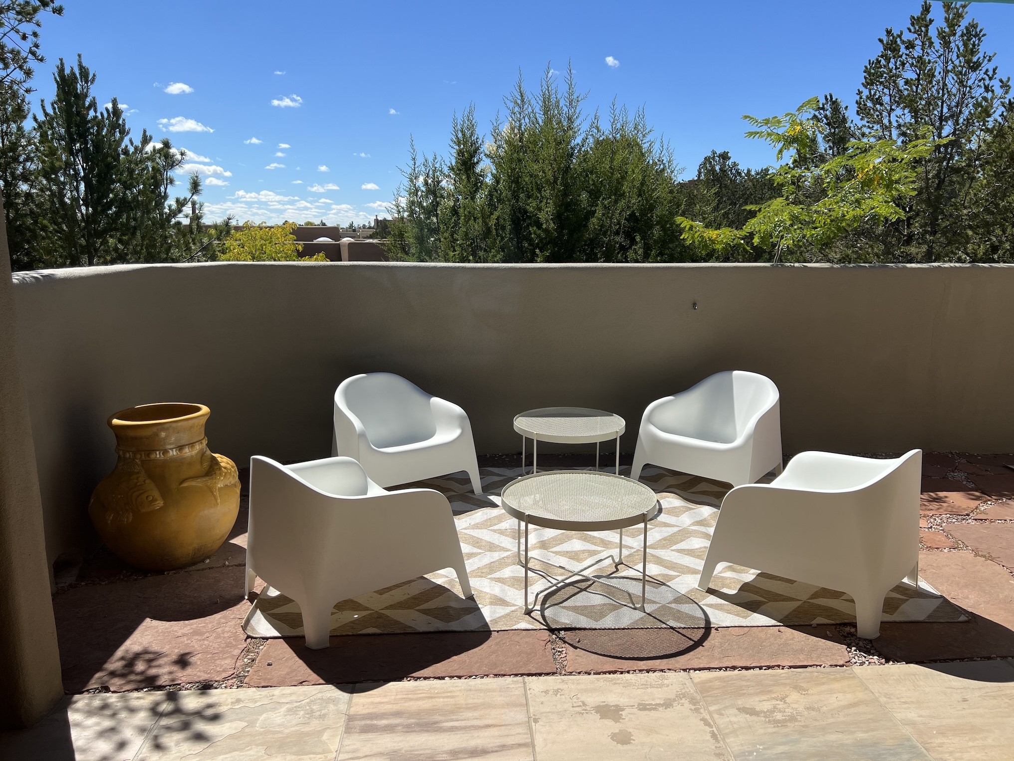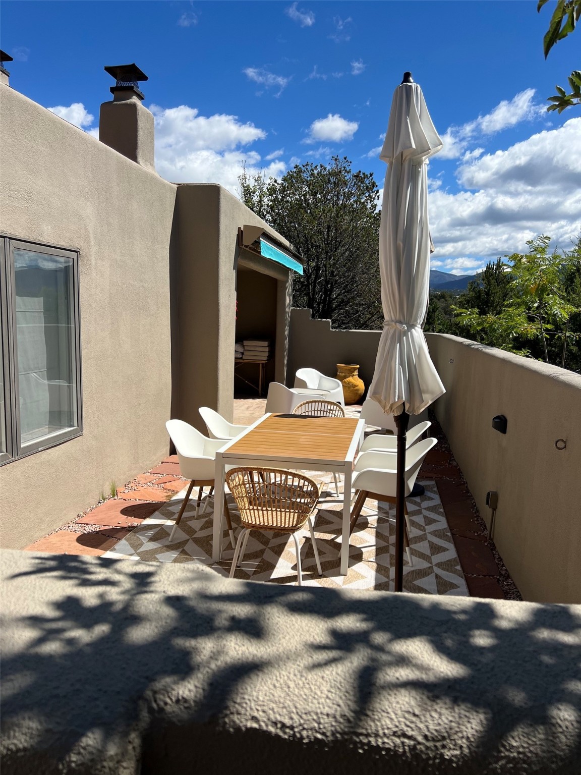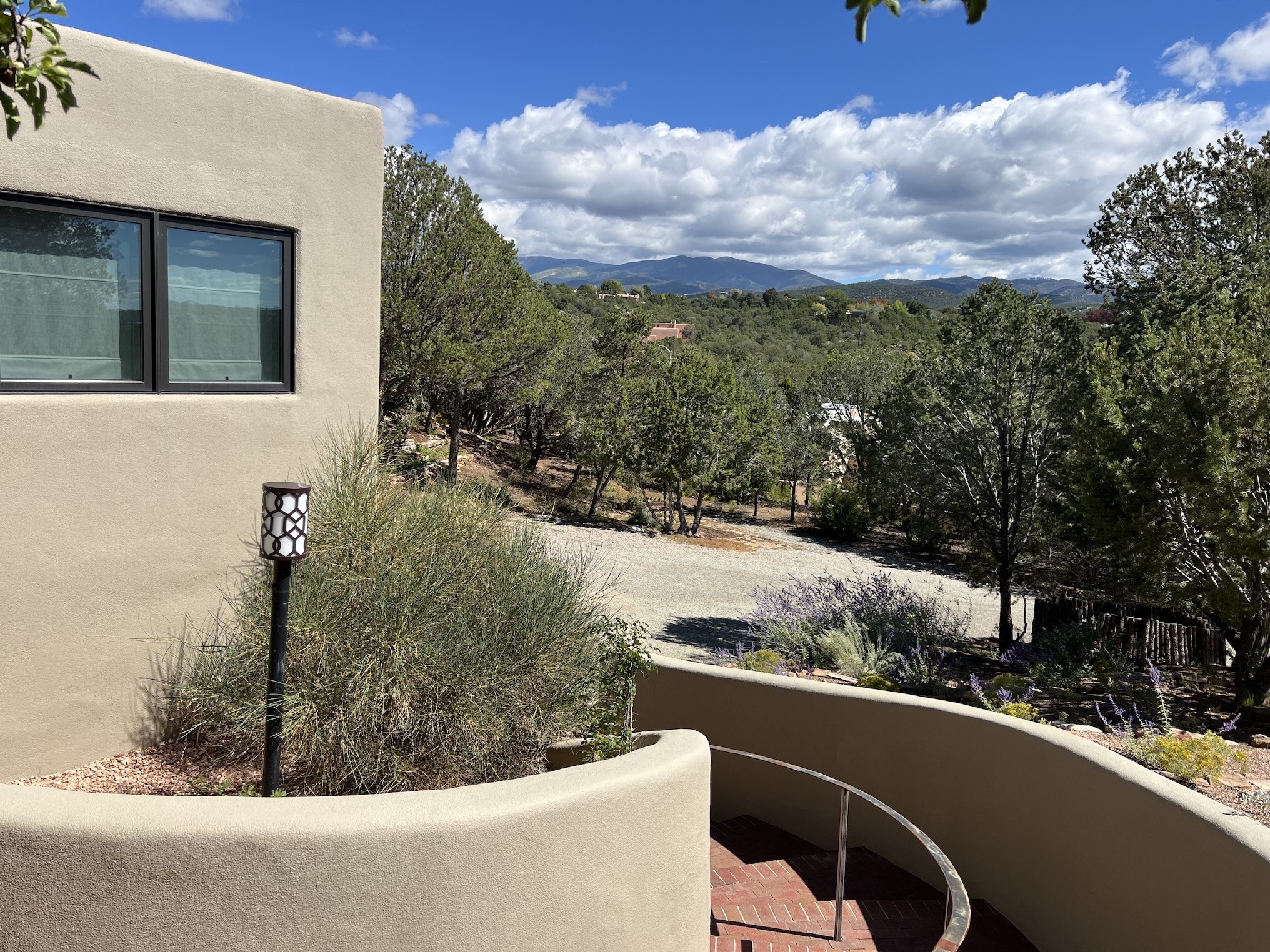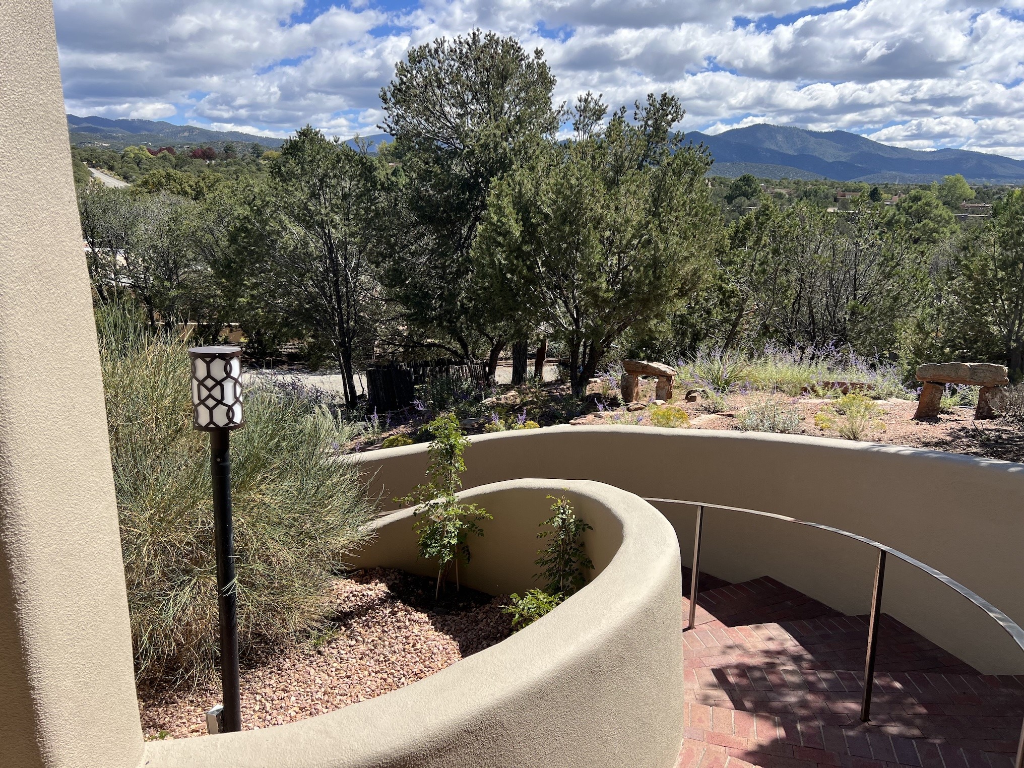 NORTHSIDE VIEW HOME! Gorgeous Sangre De Cristo Mountain views, walking distance to The Plaza and pristine condition! To enter, go up a grand staircase to the spacious single-level home, once inside, this 2,174 square foot townhome has been completely restored, inside and out in 2018 and 2022. Improvements include a gourmet kitchen, beautifully updated bathrooms, new tile floors throughout, fresh paint, lighting, duct work, new roof in 2018 (McPartlon with 12-year warranty), canales, boiler and water heater. On the exterior there is hardscaping with beautiful stone and gabion retaining walls that are planted with lovely lace vines, a retractable awning on one patio. The flow in the home enjoys a spacious kitchen with a casual living area, formal dining room, large living room with kiva fireplace, two or three bedrooms (a den study otherwise) and two baths. The principal suite also has a kiva fireplace with en-suite bath and closet. Other systems in the home are forced air heat with refrigerated air conditioning for year-round comfort and a security system. The two-car garage on the lower level has a large storage room and direct entry into the home. This property is being sold in "as is" condition. Don't miss this magnificent home, in "turn-key" condition, please call today for a private showing.