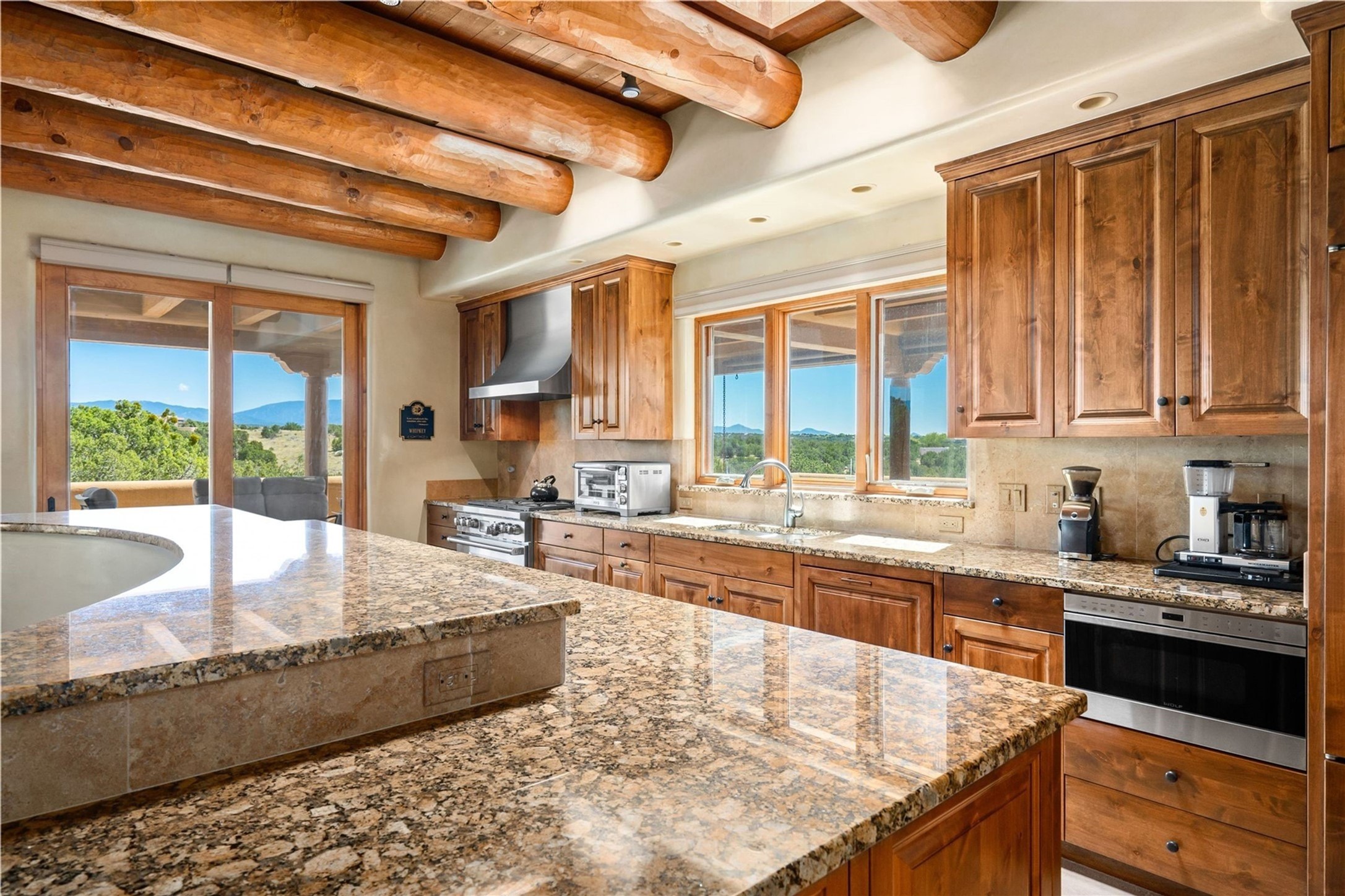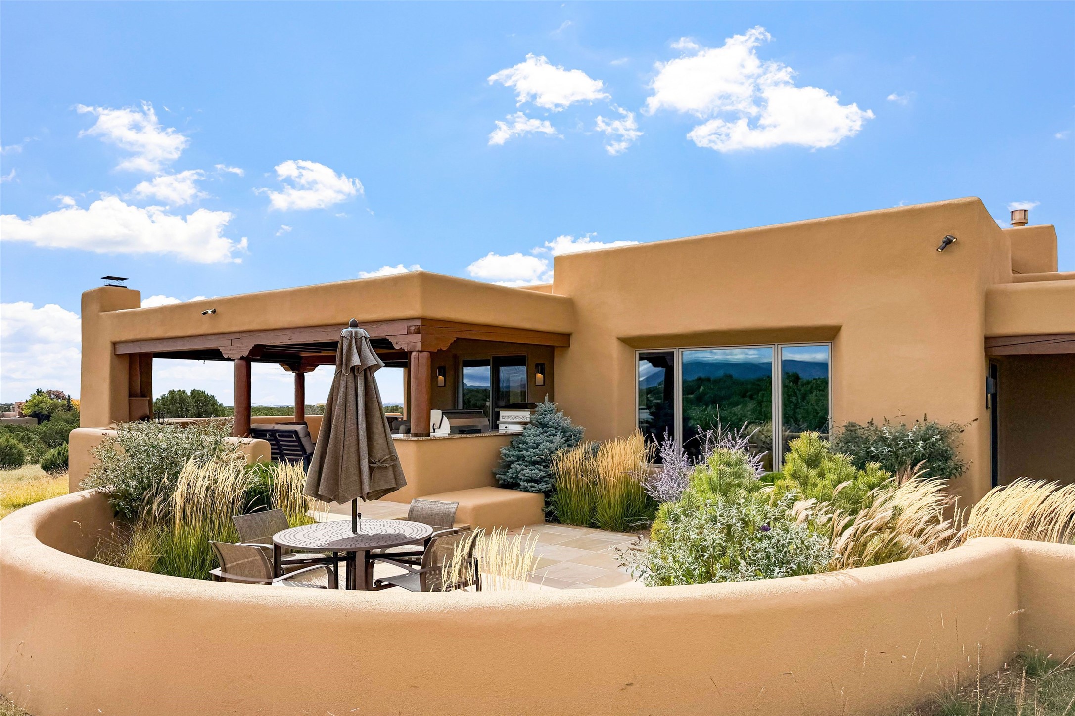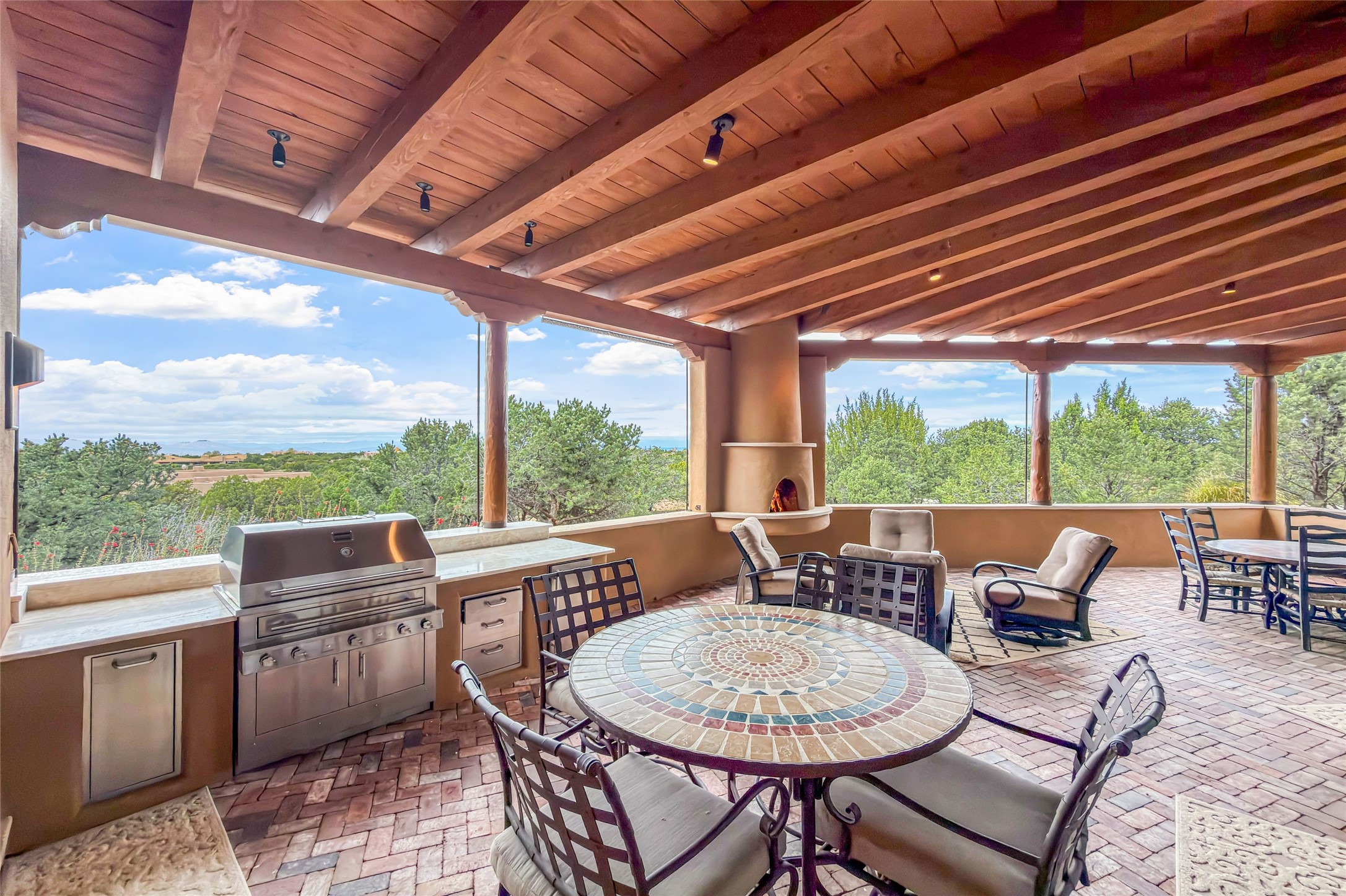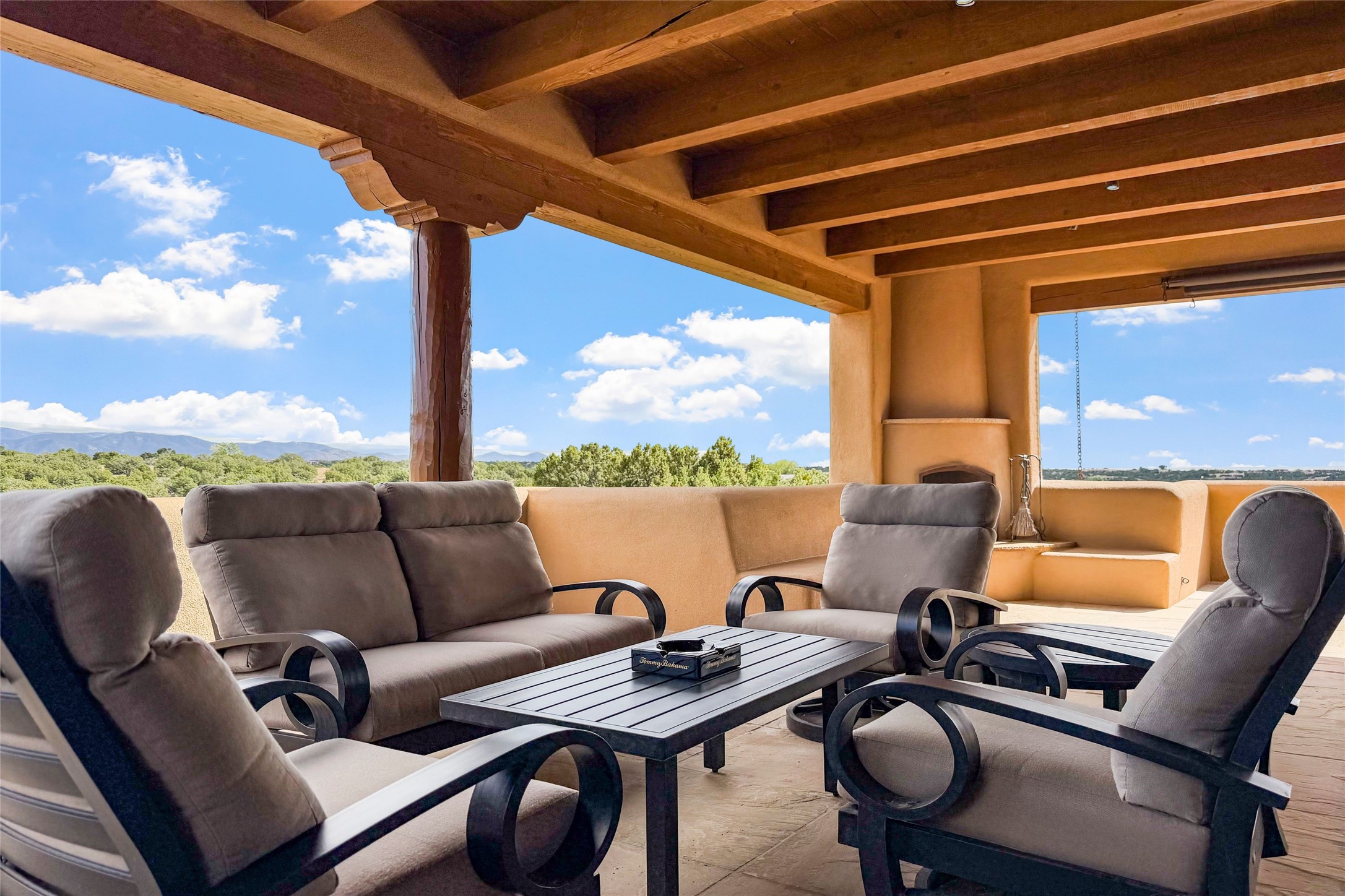 Set high on a private hilltop, and enjoying sunset mountain views, this custom Pueblo Revival compound embodies craftsmanship, substance, and timeless Santa Fe style. Built with quality at every turn and refreshed with a new roof and stucco, the property is introduced by a grand, gated courtyard with center fountain, full poured concrete drive, and a spacious garage for 4 cars. The 3-bedroom main residence, remodeled by Kim Dressel in 2012, reveals artisan details from the moment you step into the dramatic Zaguan entry. Finishes include slate floors, carved woodwork by master craftsman David Naylor, thick plaster walls, and a freestanding bar that anchors the open living and dining spaces. The chef's island kitchen features Wolf, Sub-Zero, and wine refrigeration, ideal for both daily living and entertaining. The split-bedroom layout offers privacy, while the primary suite is a sanctuary with dual closets, built-ins with fridge, kiva fireplace, and a dedicated exercise room. Outdoor living extends to multiple portals, a rooftop deck with 360 mountain views, a full kitchen, fireplace, and an elegant in-ground cocktail pool. The 3,050 sq. ft. second residence, newly built by Kim Dressel in 2013, echoes the same solid construction and fine finishes. With 2 bedrooms, 2 living rooms, a full kitchen and dining space, carved details by David Naylor, and far-reaching Sangre de Cristo and Jemez views, it offers luxurious comfort. Special features include a built-in bar, 90-inch screen with 9-speaker theater, and an expansive portal with pizza oven, grill, and fireplace. Additional amenities--a workshop, generator, and 15,000 gallon irrigation cistern--enhance function and reliability. Only 15 minutes from The Plaza and Santa Fe Airport, this compound is ideal for multi-generational living or hosting guests in a one-of-a-kind setting where custom design, quality finishes, and Pueblo Revival authenticity define the experience. A contiguous 1.7-acre lot on Black Mesa may be available separately. Membership to the Club at Las Campanas is available for purchase and upon approval.