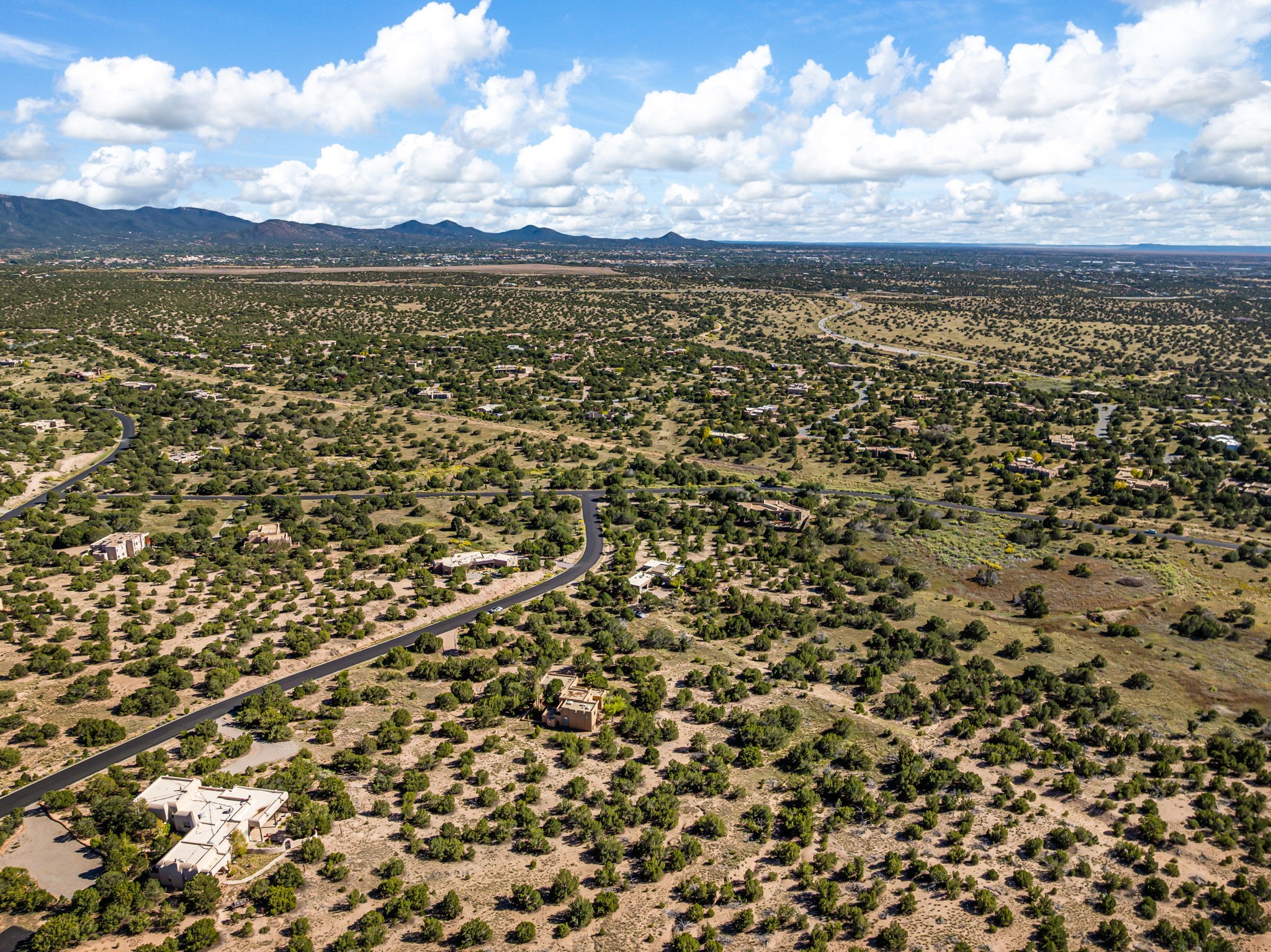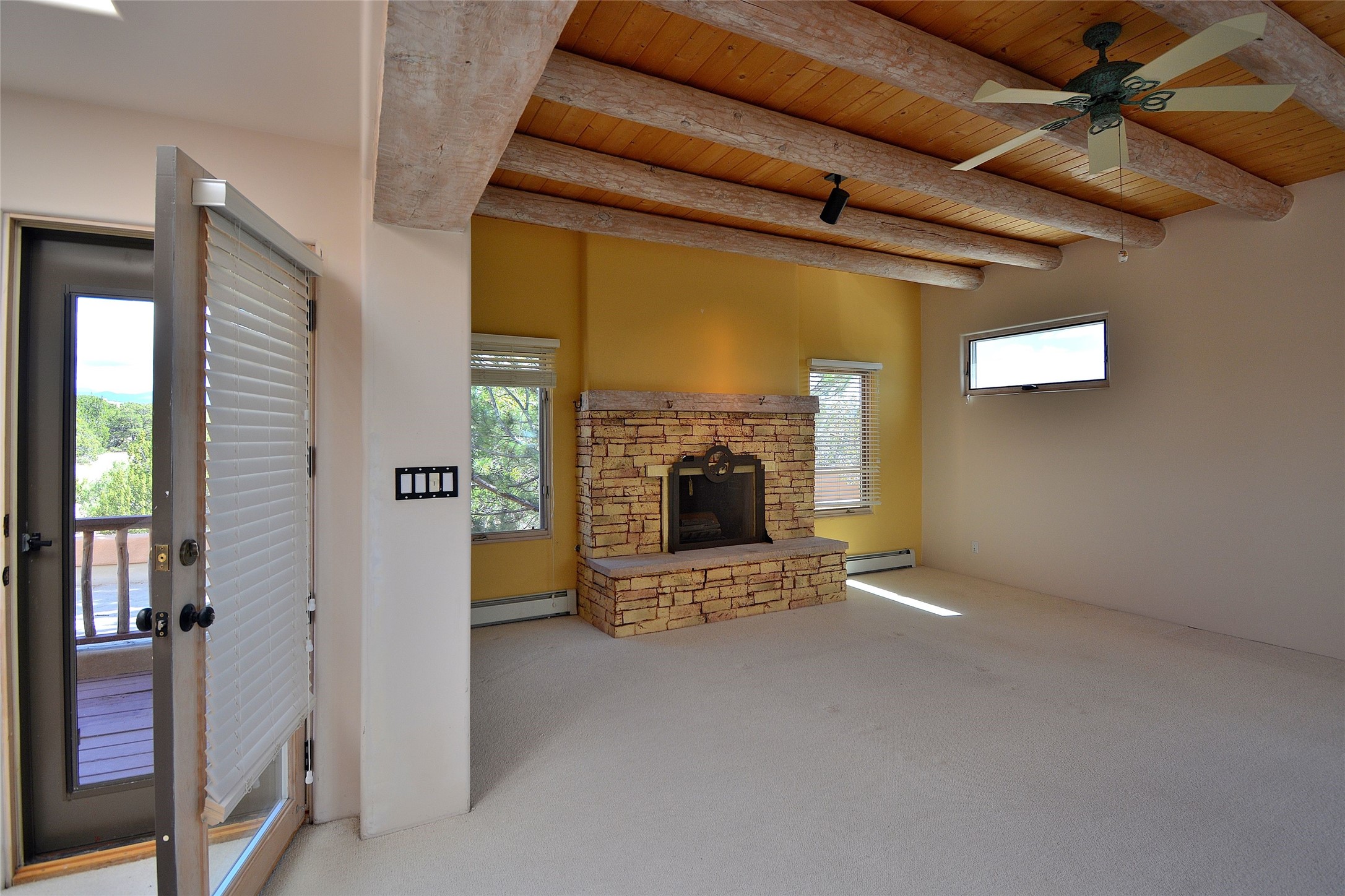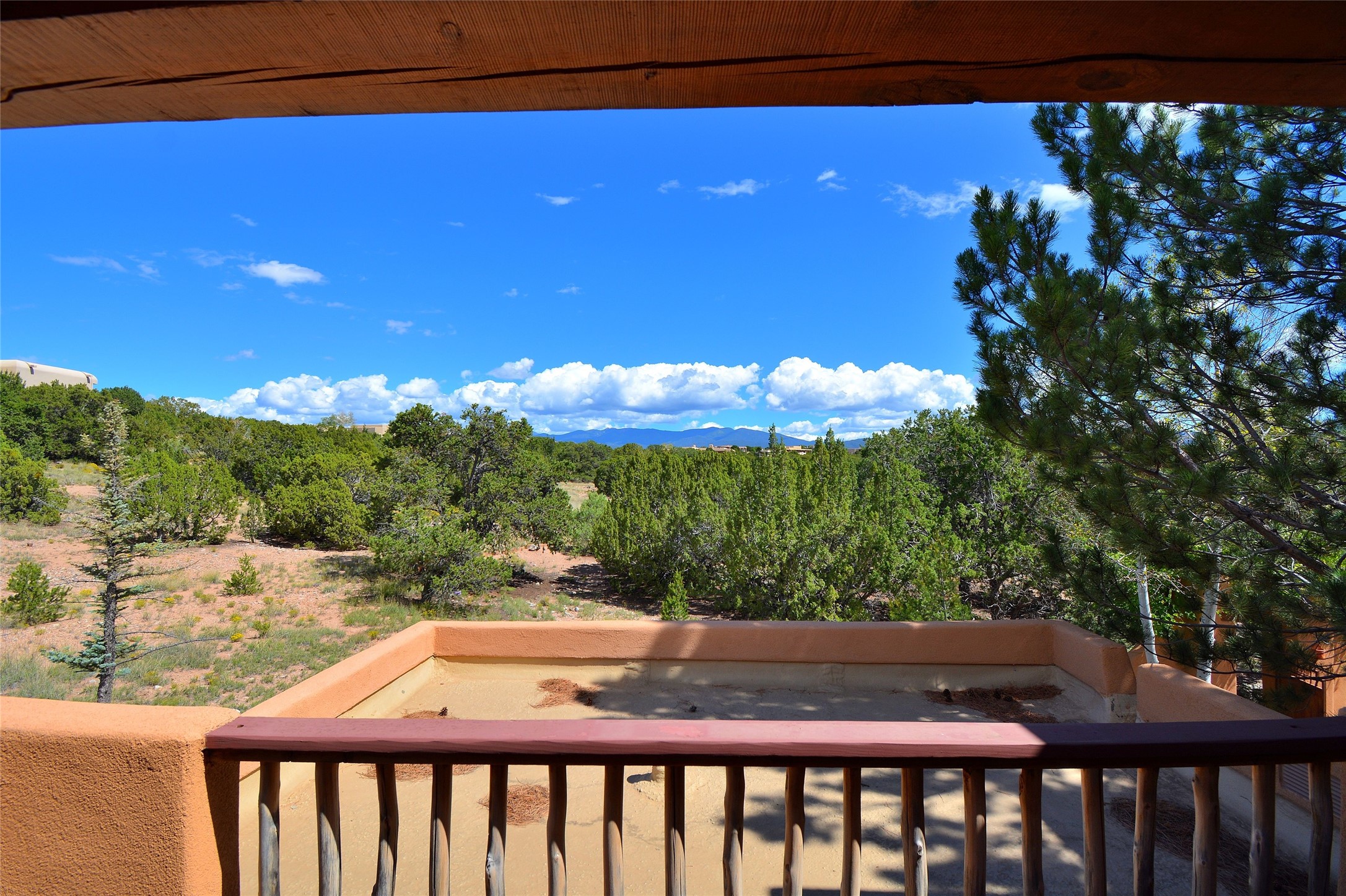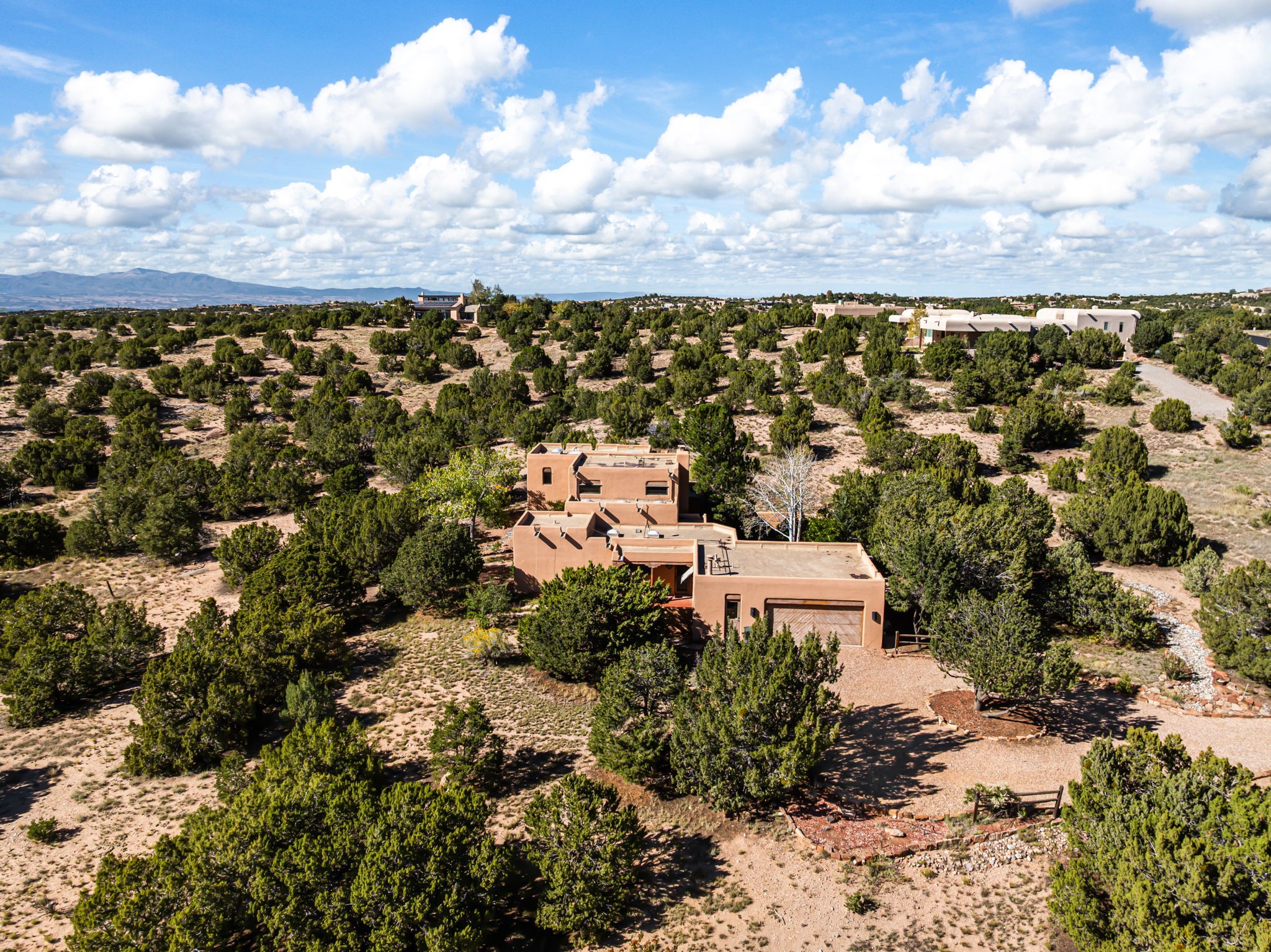 Nestled on two acres dotted with pion and juniper, this inviting Santa Fe-style home blends traditional charm with modern comforts. A gravel driveway leads to a graceful walkway, which in turn leads to a beautifully landscaped, enclosed front yard, The house features plastered walls, and the ground-level floors are adorned with traditional Saltillo tiles, except for the guest bedroom, which has carpet and an en-suite bathroom. The living and dining rooms feature soaring ceilings with vigas. A gas fireplace in the living room adds ambiance during cold winter nights.The kitchen, featuring skylights, granite countertops, and a gas cooktop, microwave, oven, and fridge/freezer, opens to a breakfast nook on one side, complete with its own private patio. Continuing from the breakfast nook, you enter the laundry and then the garage. On the other side of the kitchen is the dining room. The main level also features a second guest room or den with a nearby half-bath. The downstairs has in-floor radiant heat.Upstairs, the spacious main bedroom offers vigas, a second gas fireplace, radiant baseboard heat, and mountain views on one side and a deck on the other. The adjoining bath offers dual sinks, a Jacuzzi-style tub, a shower with seating, and a walk-in cedar closet.With an alarm system and thoughtful storage throughout, this home offers a blend of traditional Santa Fe style and practicality in a serene setting, just a couple of minutes drive to 599 and access to Santa Fe (approx.10 minutes) or to Los Alamos, the Santa Fe airport, and Albuquerque.Adjacent to the subdivision is the La Tierra open space of almost 1500 acres, offering 25 miles of walking trails.
