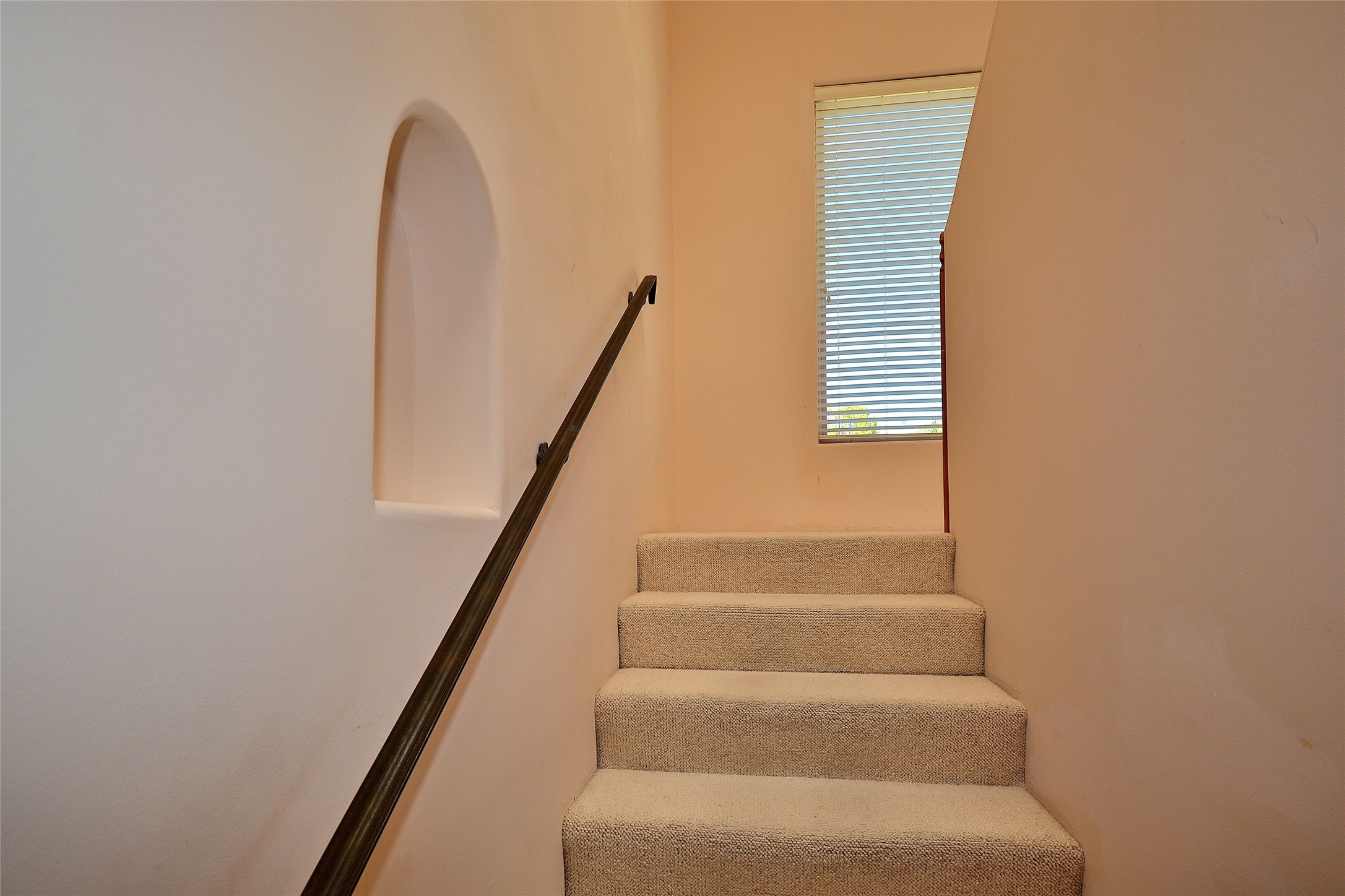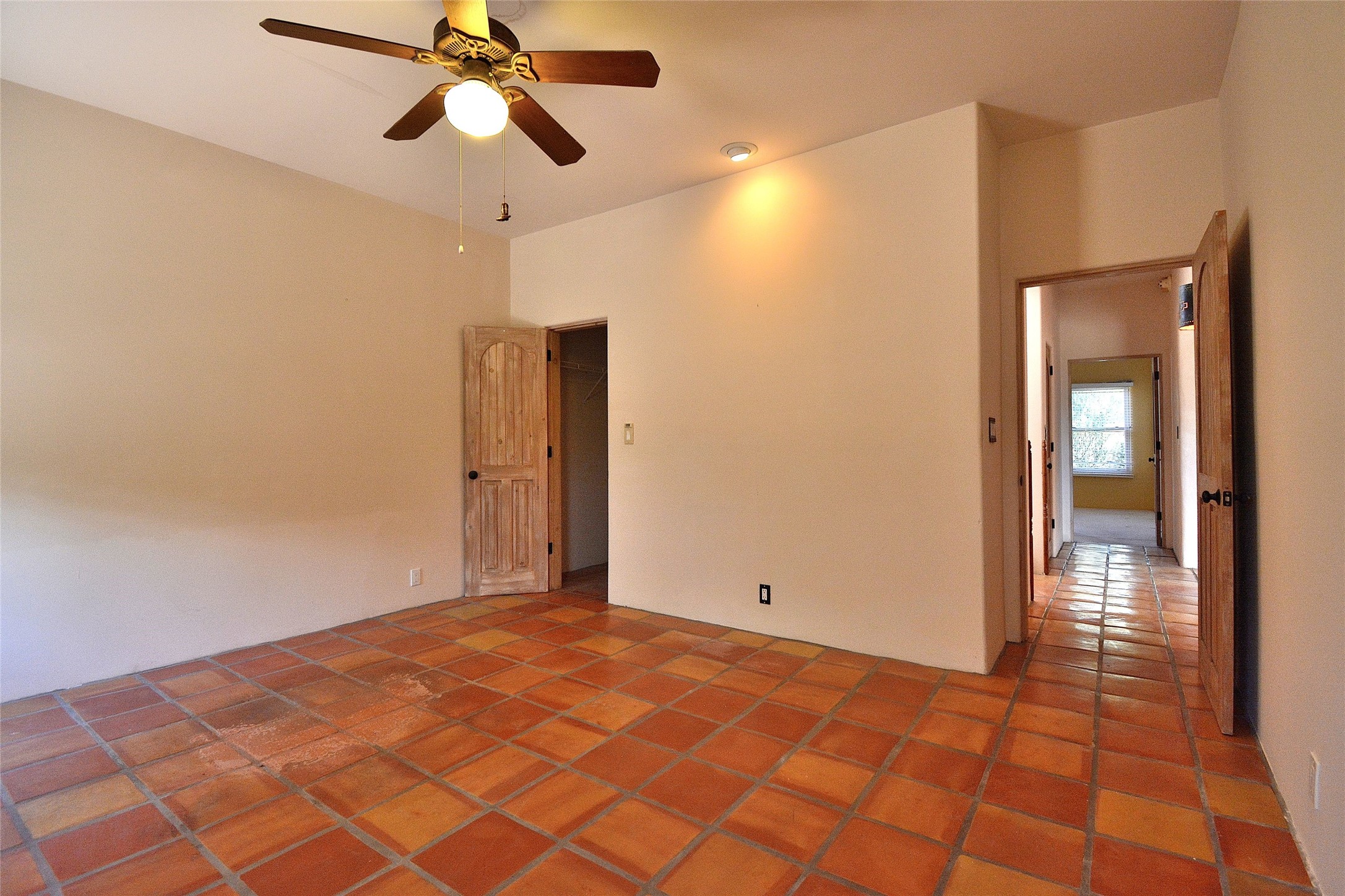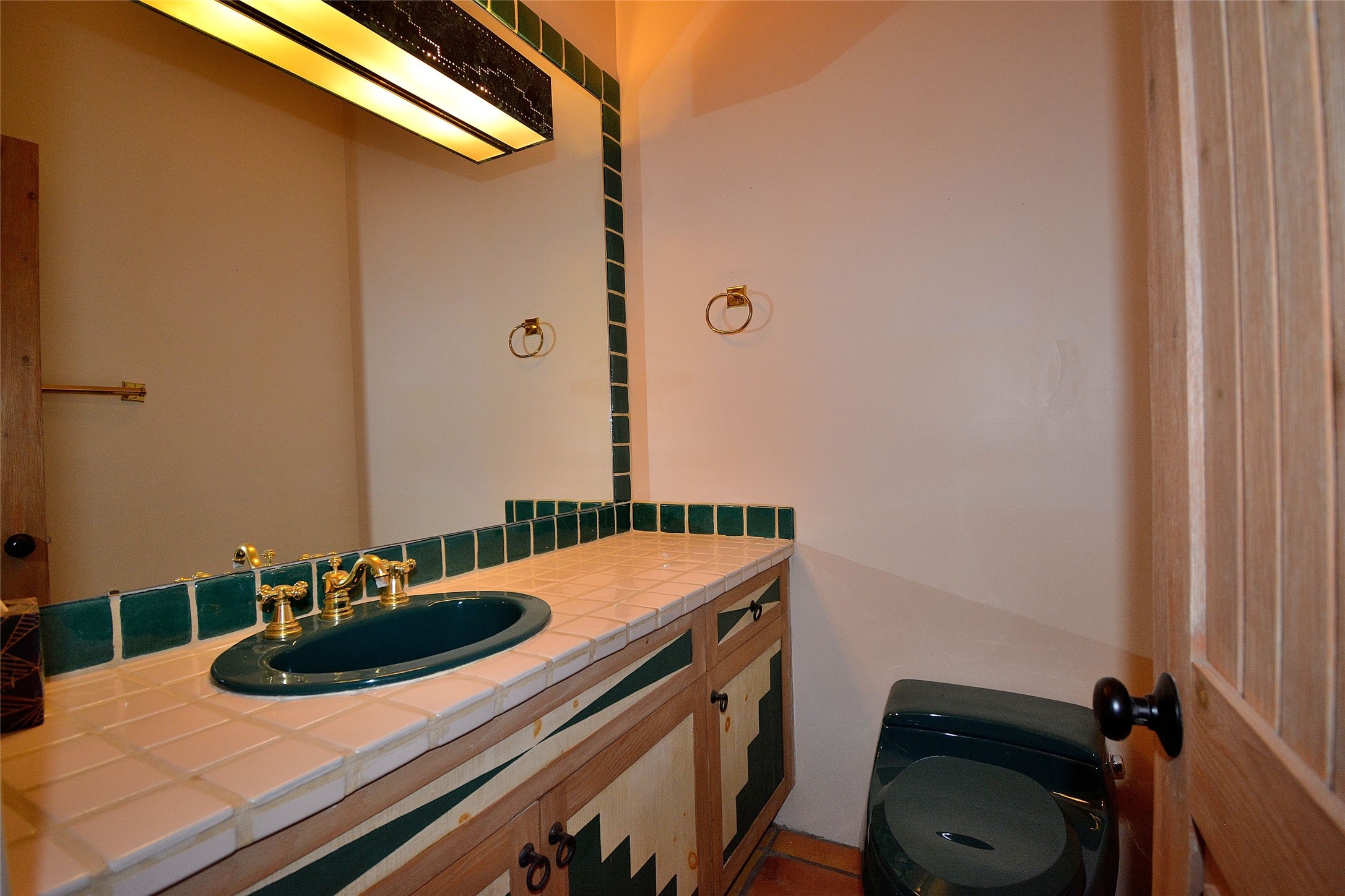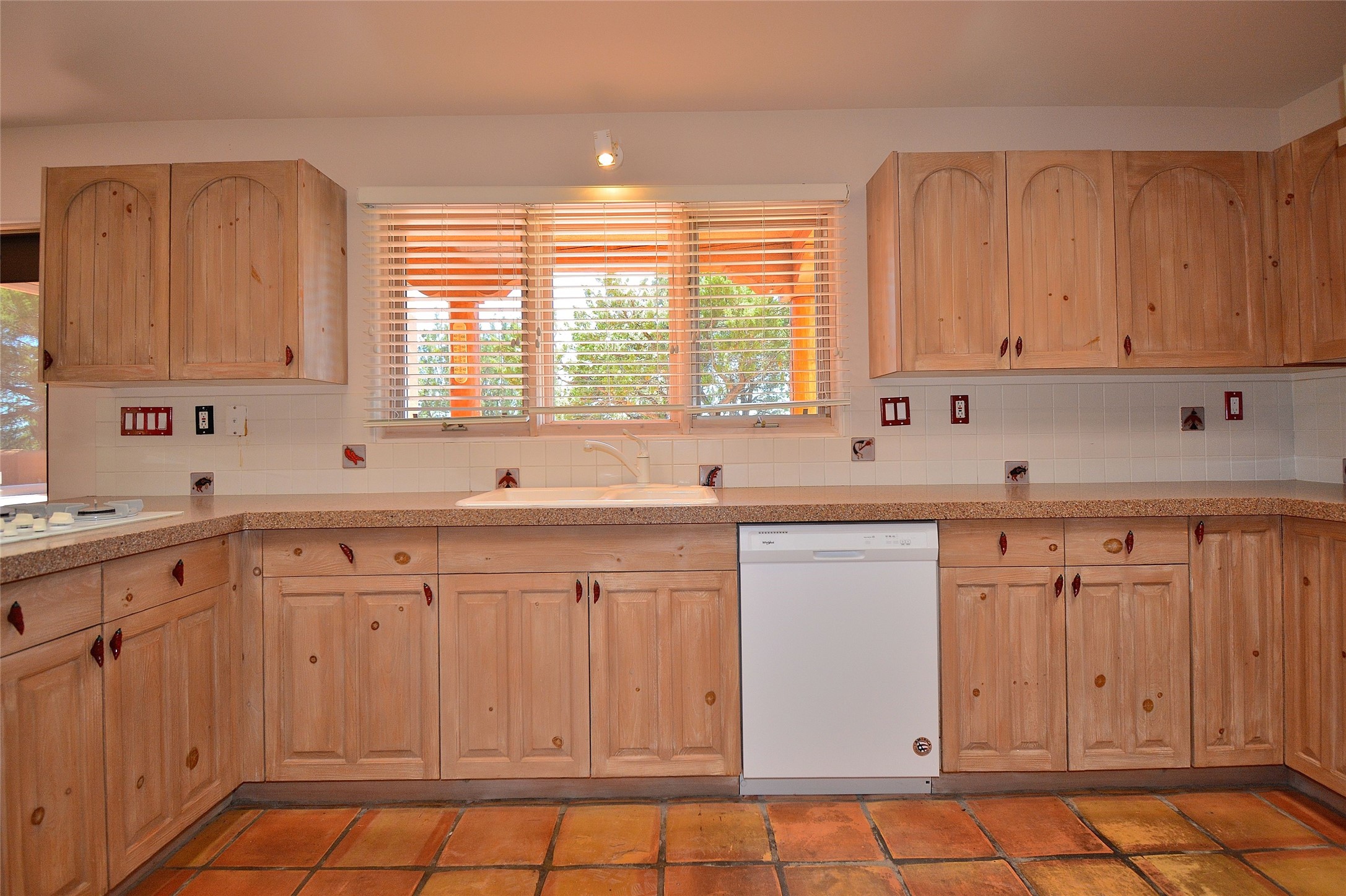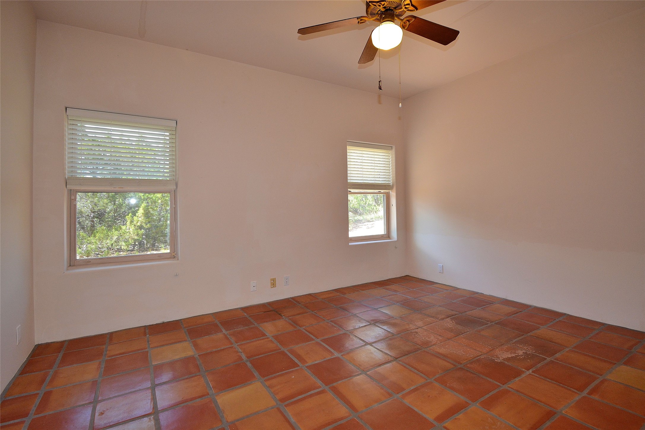 Nestled on two acres dotted with pion and juniper, this inviting Santa Fe-style home blends traditional charm with modern comforts. A gravel driveway leads to a graceful walkway, which in turn leads to a beautifully landscaped, enclosed front yard, The house features plastered walls, and the ground-level floors are adorned with traditional Saltillo tiles, except for the guest bedroom, which has carpet and an en-suite bathroom. The living and dining rooms feature soaring ceilings with vigas. A gas fireplace in the living room adds ambiance during cold winter nights.The kitchen, featuring skylights, granite countertops, and a gas cooktop, microwave, oven, and fridge/freezer, opens to a breakfast nook on one side, complete with its own private patio. Continuing from the breakfast nook, you enter the laundry and then the garage. On the other side of the kitchen is the dining room. The main level also features a second guest room or den with a nearby half-bath. The downstairs has in-floor radiant heat.Upstairs, the spacious main bedroom offers vigas, a second gas fireplace, radiant baseboard heat, and mountain views on one side and a deck on the other. The adjoining bath offers dual sinks, a Jacuzzi-style tub, a shower with seating, and a walk-in cedar closet.With an alarm system and thoughtful storage throughout, this home offers a blend of traditional Santa Fe style and practicality in a serene setting, just a couple of minutes drive to 599 and access to Santa Fe (approx.10 minutes) or to Los Alamos, the Santa Fe airport, and Albuquerque.Adjacent to the subdivision is the La Tierra open space of almost 1500 acres, offering 25 miles of walking trails.