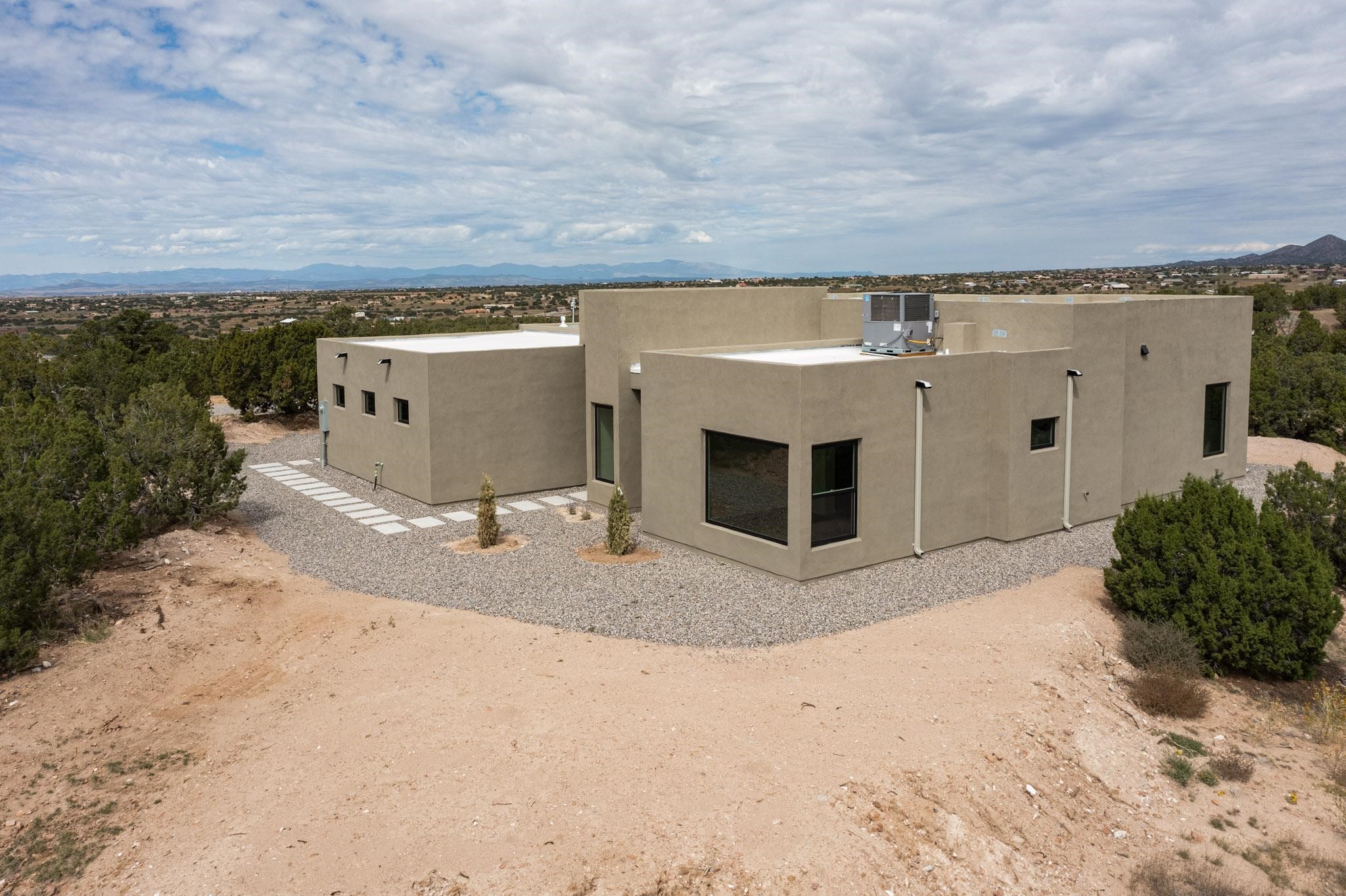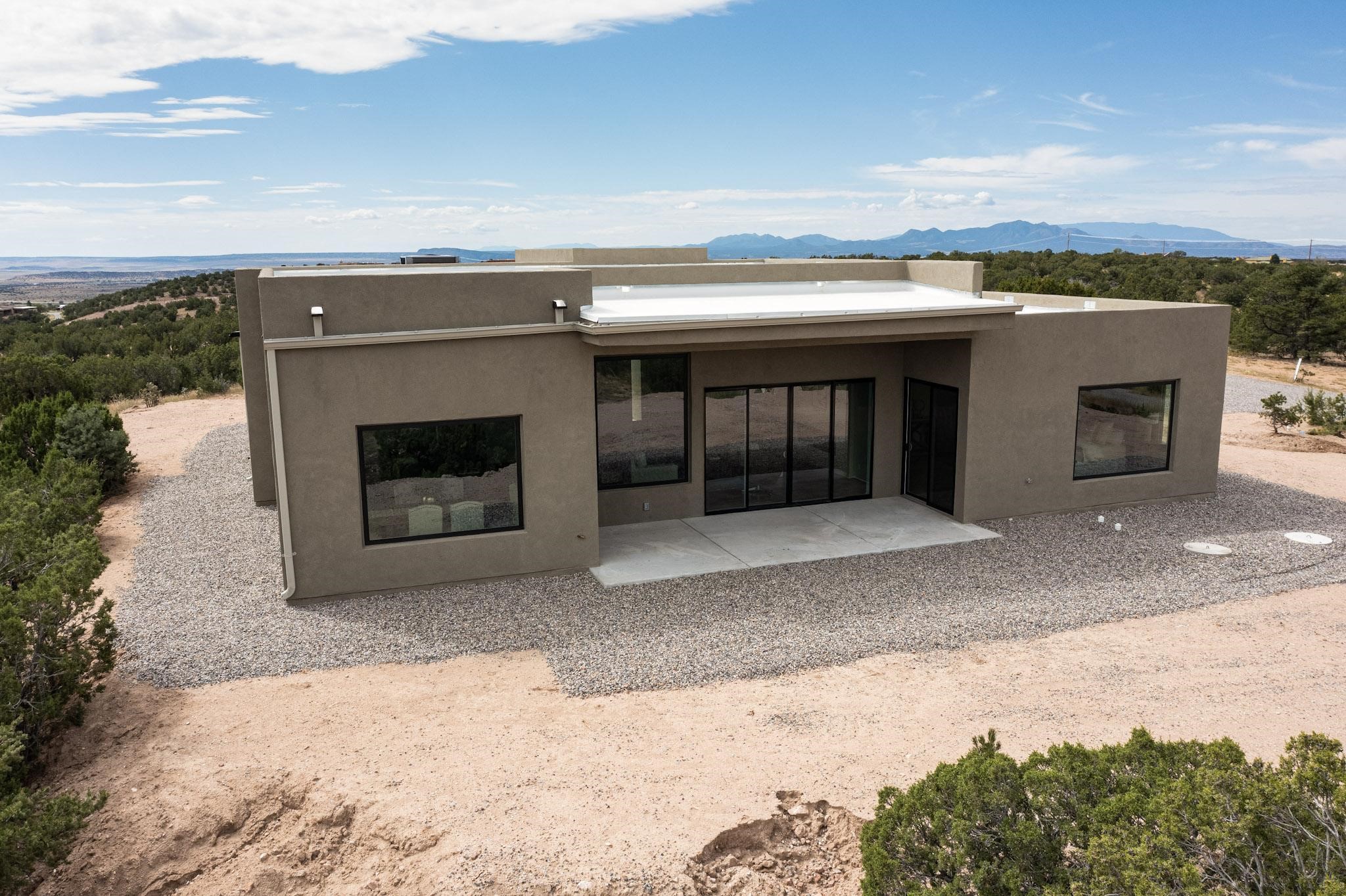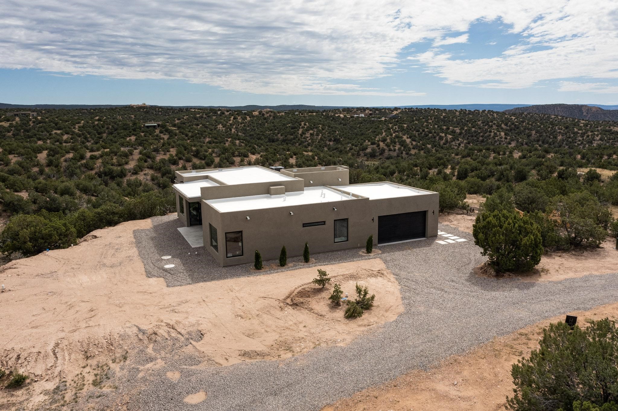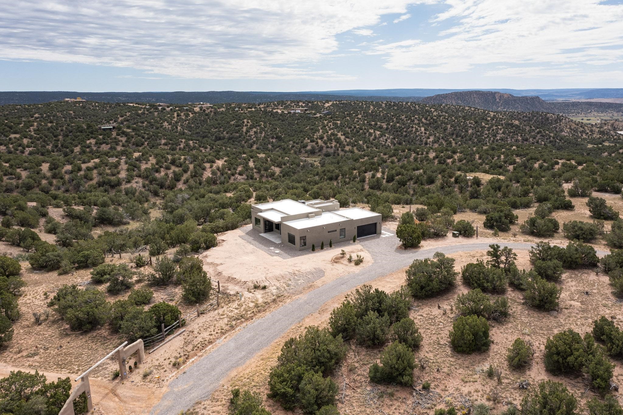 Just completed and ready for occupancy! Mountain views from every window in this new custom built contemporary pueblo style home with open floor plan situated on a huge 10.0 +/- ac. private lot in Lamy. Convenient access to US-285, the Agora shopping center, bank and restaurants. Perfect for indoor and outdoor entertaining. Open kitchen/family/dining room has floor to ceiling windows and double sliding glass doors to take in the fabulous views and access to the portal. The contemporary kitchen has a huge island bar and large walk in pantry. Every room has large picture windows with fabulous mountain views. Owner's bath has double sinks, soaking tub and large walk in shower room with double shower heads and rain showers and a large walk in closet. Home features contemporary style vigas in living areas. Three bedrooms with good separation and 2 baths. A guest house and equestrian structures are allowed, as well as 10 horses or cattle. (1 large animal per acre.) No HOA, recreational vehicles are allowed if parked inconspicuously. Connected to the Eldorado community water system. Located only 20 minutes from Downtown Santa Fe this home offers gorgeous views, rural living and easy access to everything Santa Fe has to offer. This home has it all; new home, fabulous views, great outdoor spaces, contemporary open floor plan, large private lot. Buyer to verify all information and Covenants. Seller gives $4000 credit to the buyer at closing for Range, dishwasher and microwave. Open House Sunday, Nov 23. 1:00 - 4:00 PM.