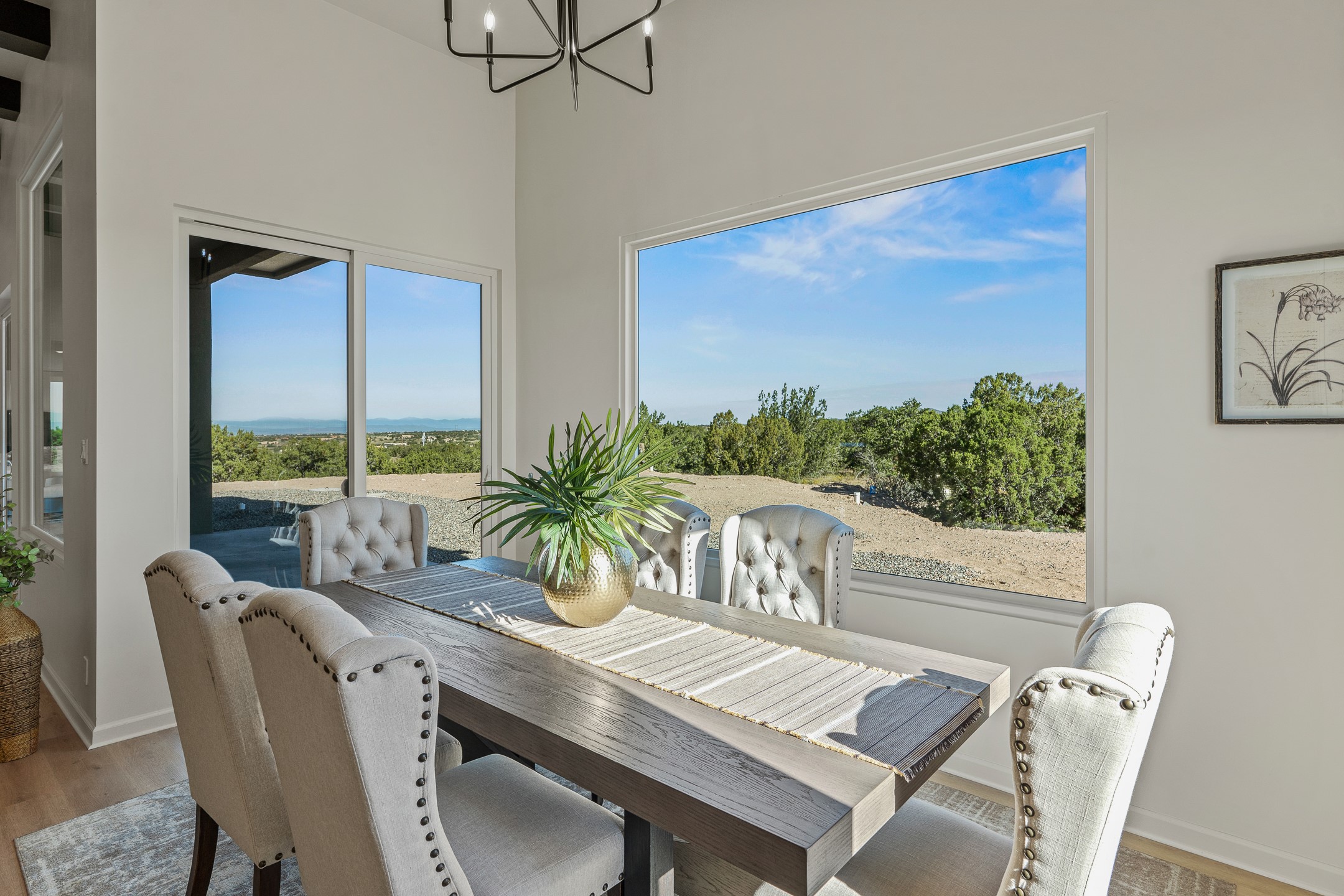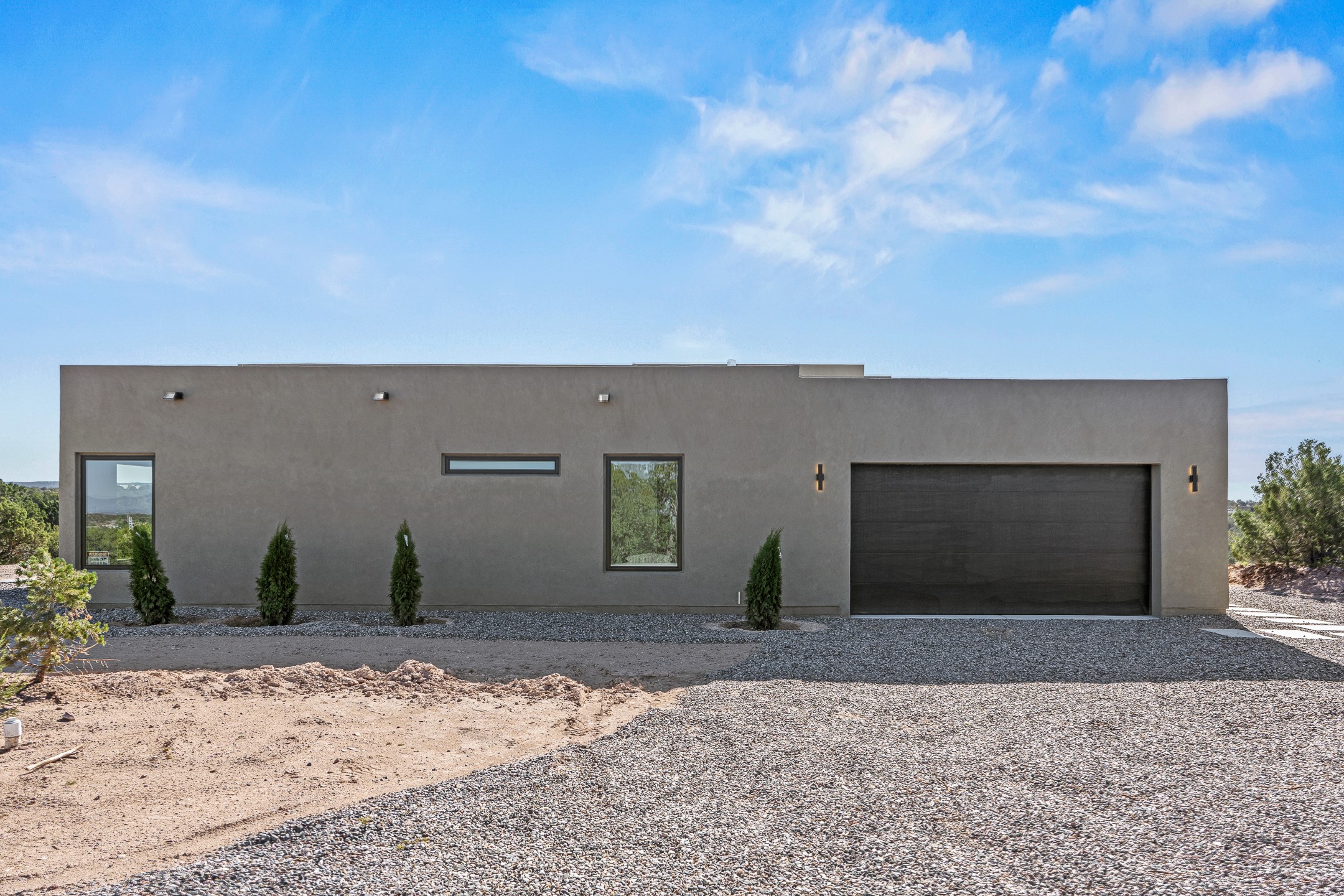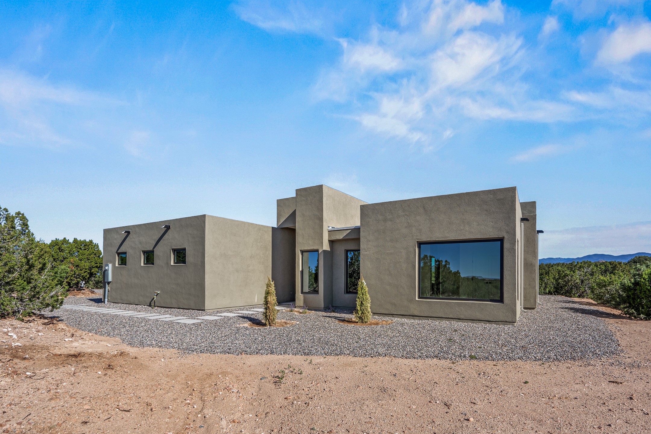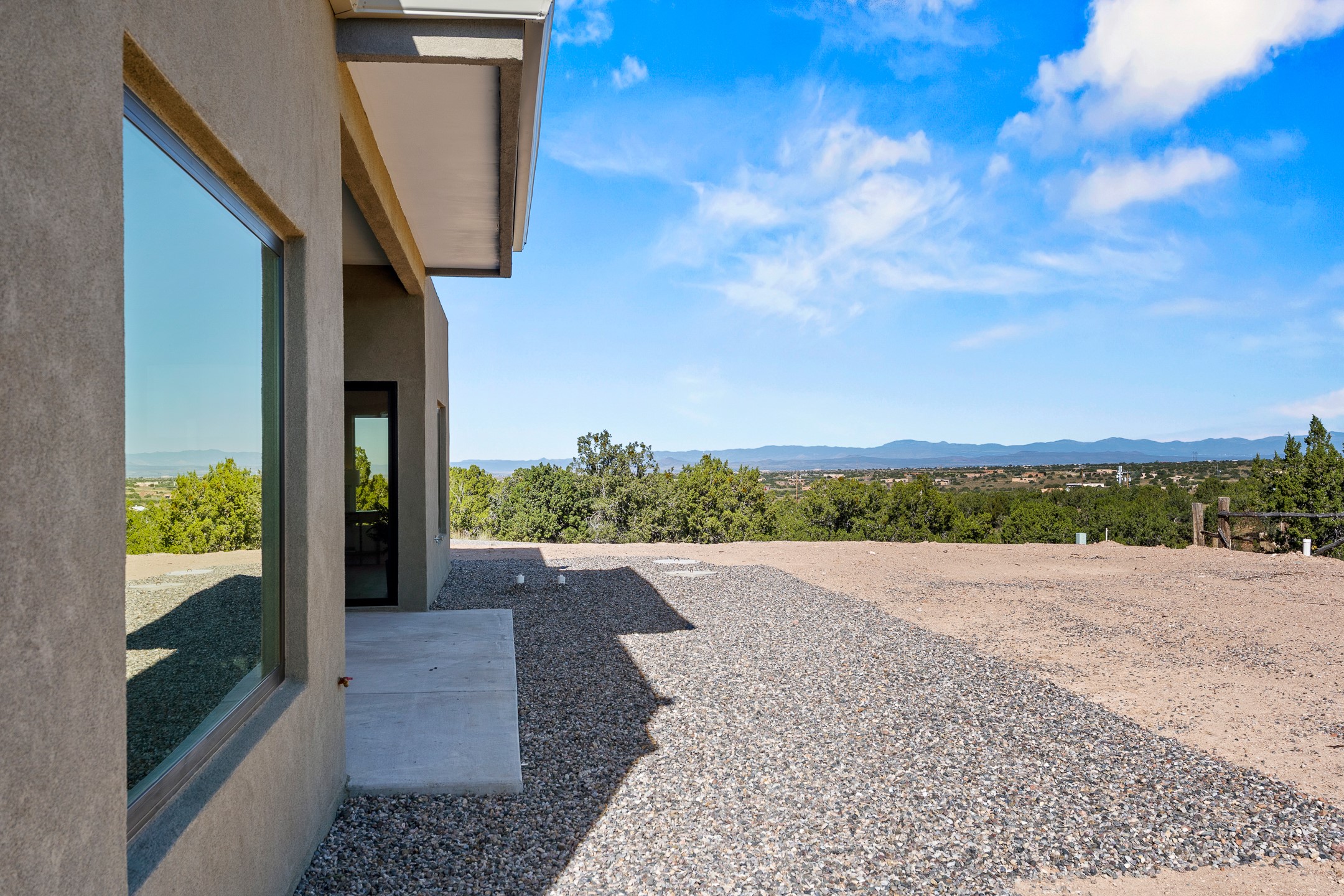 Just completed and ready for occupancy! Mountain views from every window in this new custom built contemporary pueblo style home with open floor plan situated on a huge 10.0 +/- ac. private lot in Lamy. Convenient access to US-285, the Agora shopping center, bank and restaurants. Perfect for indoor and outdoor entertaining. Open kitchen/family/dining room has floor to ceiling windows and double sliding glass doors to take in the fabulous views and access to the portal. The contemporary kitchen has a huge island bar and large walk in pantry. Every room has large picture windows with fabulous mountain views. Owner's bath has double sinks, soaking tub and large walk in shower room with double shower heads and rain showers and a large walk in closet. Home features contemporary style vigas in living areas. Three bedrooms with good separation and 2 baths. A guest house and equestrian structures are allowed, as well as 10 horses or cattle. (1 large animal per acre.) No HOA, recreational vehicles are allowed if parked inconspicuously. Connected to the Eldorado community water system. Located only 20 minutes from Downtown Santa Fe this home offers gorgeous views, rural living and easy access to everything Santa Fe has to offer. This home has it all; new home, fabulous views, great outdoor spaces, contemporary open floor plan, large private lot. Buyer to verify all information and Covenants. Seller gives $4000 credit to the buyer at closing for Range, dishwasher and microwave. Open House Sunday, Nov 23. 1:00 - 4:00 PM.