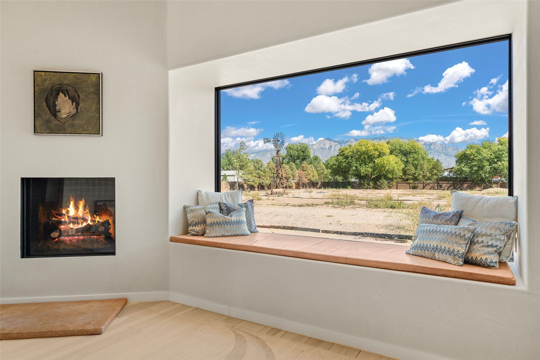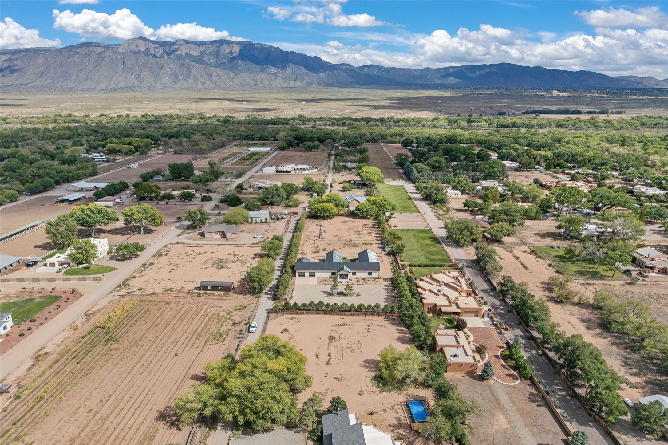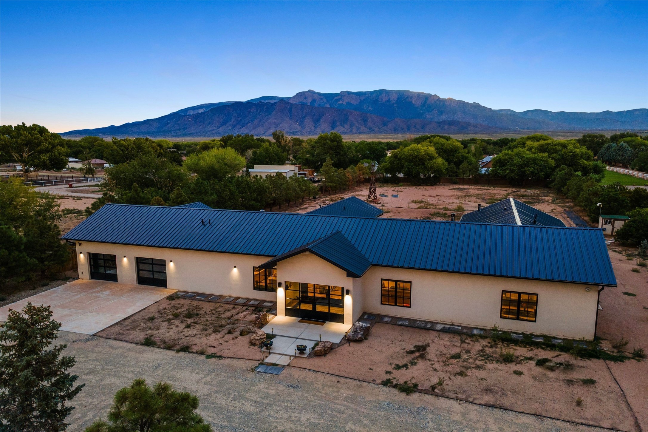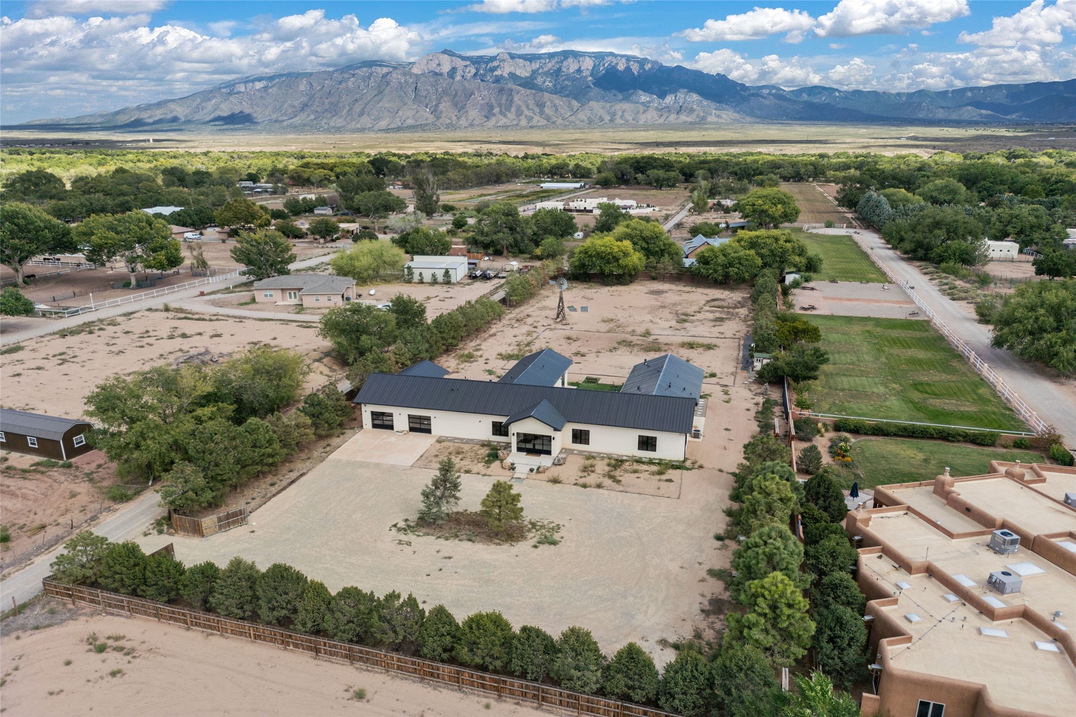 Desirable East Corrales 4-bedroom 3-bath residence on 2 acres with breathtaking Sandia Mountain views. Built in 2023, this home offers a blend of contemporary design and thoughtfully curated finishes with high ceilings, hickory wood and polished concrete floors perfect for artists and art collectors alike. Single level; no interior steps. As you enter, you are greeted by a spacious foyer that flows into an expansive living area with a fireplace and slider doors that bring the outdoors inside and create an expanded space for hosting gatherings or enjoying peaceful evenings under the stars. The gourmet kitchen is appointed with an oversized island, high-end appliances and a generous butler pantry, with wine fridge. Additional practical features include a laundry room with dog wash area, and separate mudroom. Retreat to the private primary suite, with stunning mountain views, a whimsical en-suite bath and expansive walk-in closet. Across the central courtyard, is a second primary bedroom with en-suite and walk-in closet. The third bedroom or bunkhouse offers a charming space for family and friends. The fourth bedroom provides versatile light-filled spot for a studio or office. Drive-through 3-car garage and picturesque backyard watermill, which could be adapted for power generation. Surrounded by mature Colorado ponderosa pines, this tranquil setting is a blank canvas, ready for your imagination to take flight--build your dream garden, luxurious outdoor living space, or bring your horses, as they are welcome here! Located just minutes from historic Corrales Main Street and with easy access to the Corrales Bosque Preserve's miles of trails.