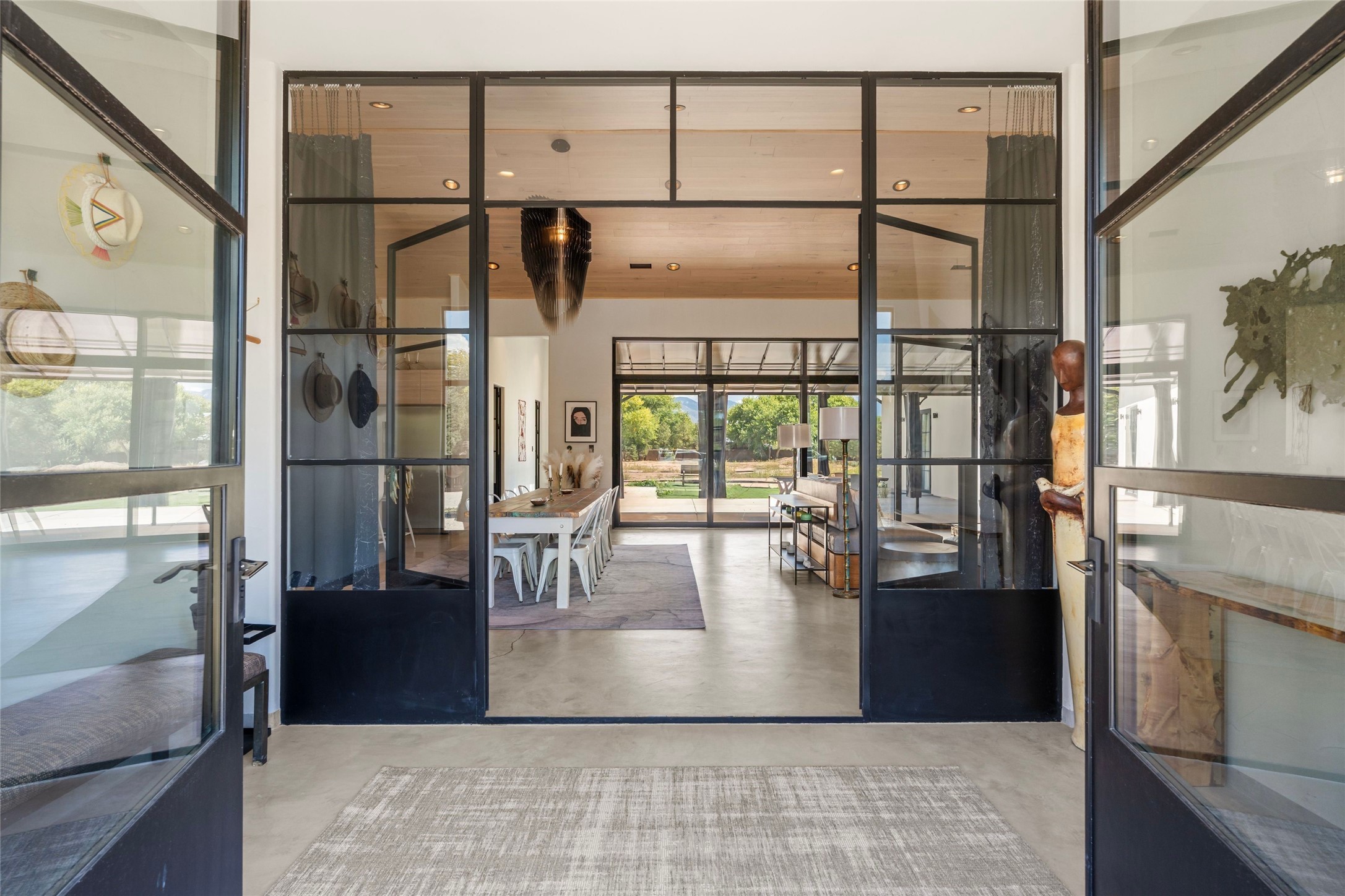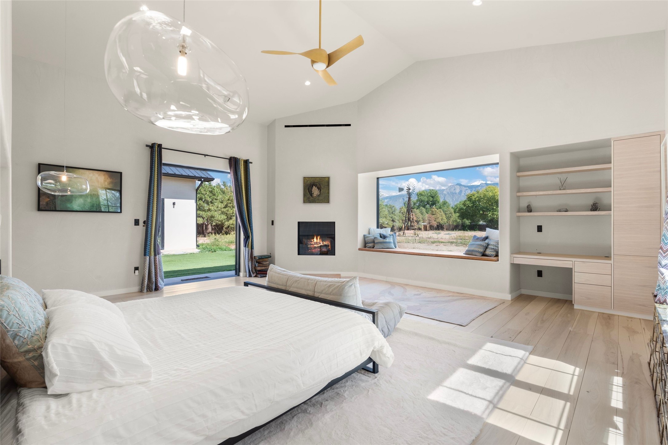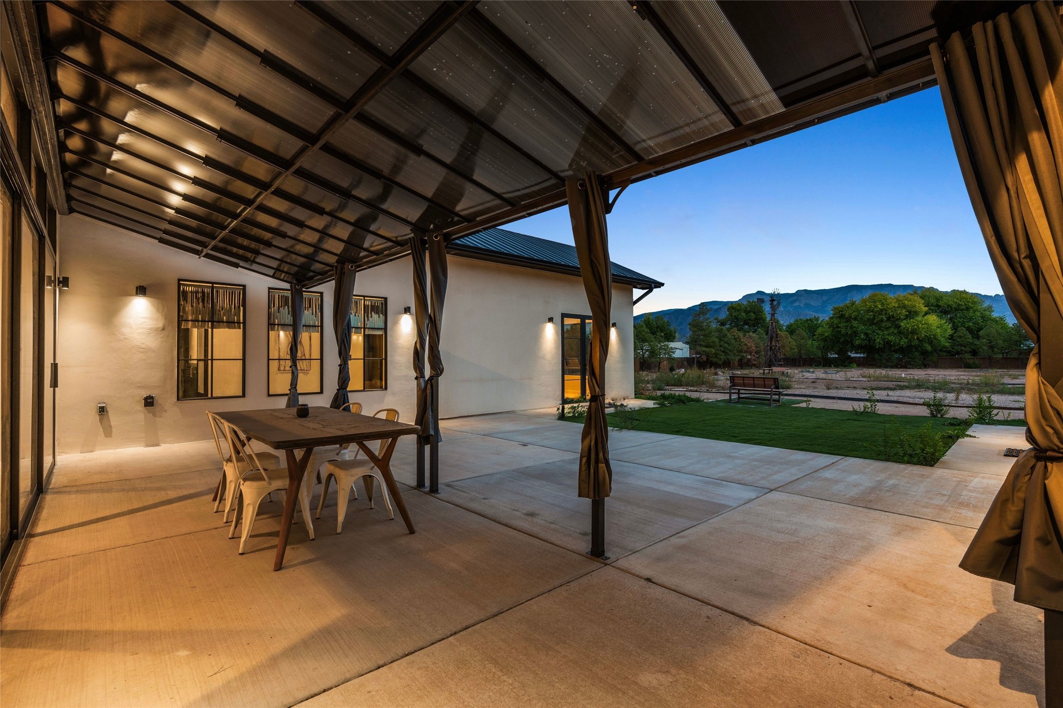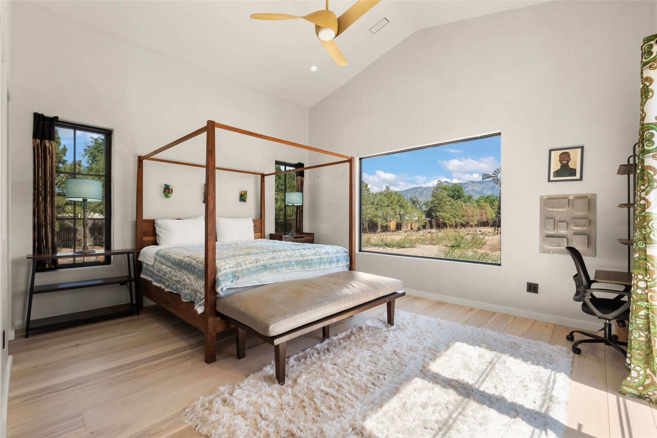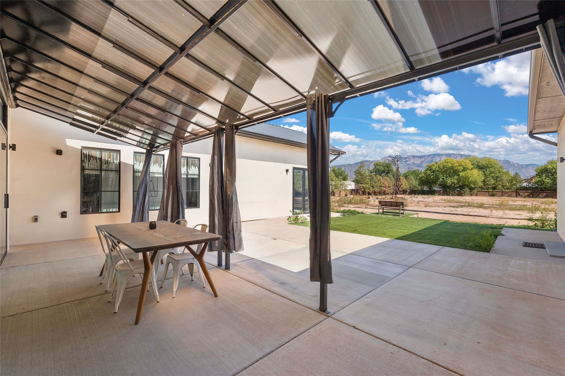 Desirable East Corrales 4-bedroom 3-bath residence on 2 acres with breathtaking Sandia Mountain views. Built in 2023, this home offers a blend of contemporary design and thoughtfully curated finishes with high ceilings, hickory wood and polished concrete floors perfect for artists and art collectors alike. Single level; no interior steps. As you enter, you are greeted by a spacious foyer that flows into an expansive living area with a fireplace and slider doors that bring the outdoors inside and create an expanded space for hosting gatherings or enjoying peaceful evenings under the stars. The gourmet kitchen is appointed with an oversized island, high-end appliances and a generous butler pantry, with wine fridge. Additional practical features include a laundry room with dog wash area, and separate mudroom. Retreat to the private primary suite, with stunning mountain views, a whimsical en-suite bath and expansive walk-in closet. Across the central courtyard, is a second primary bedroom with en-suite and walk-in closet. The third bedroom or bunkhouse offers a charming space for family and friends. The fourth bedroom provides versatile light-filled spot for a studio or office. Drive-through 3-car garage and picturesque backyard watermill, which could be adapted for power generation. Surrounded by mature Colorado ponderosa pines, this tranquil setting is a blank canvas, ready for your imagination to take flight--build your dream garden, luxurious outdoor living space, or bring your horses, as they are welcome here! Located just minutes from historic Corrales Main Street and with easy access to the Corrales Bosque Preserve's miles of trails.