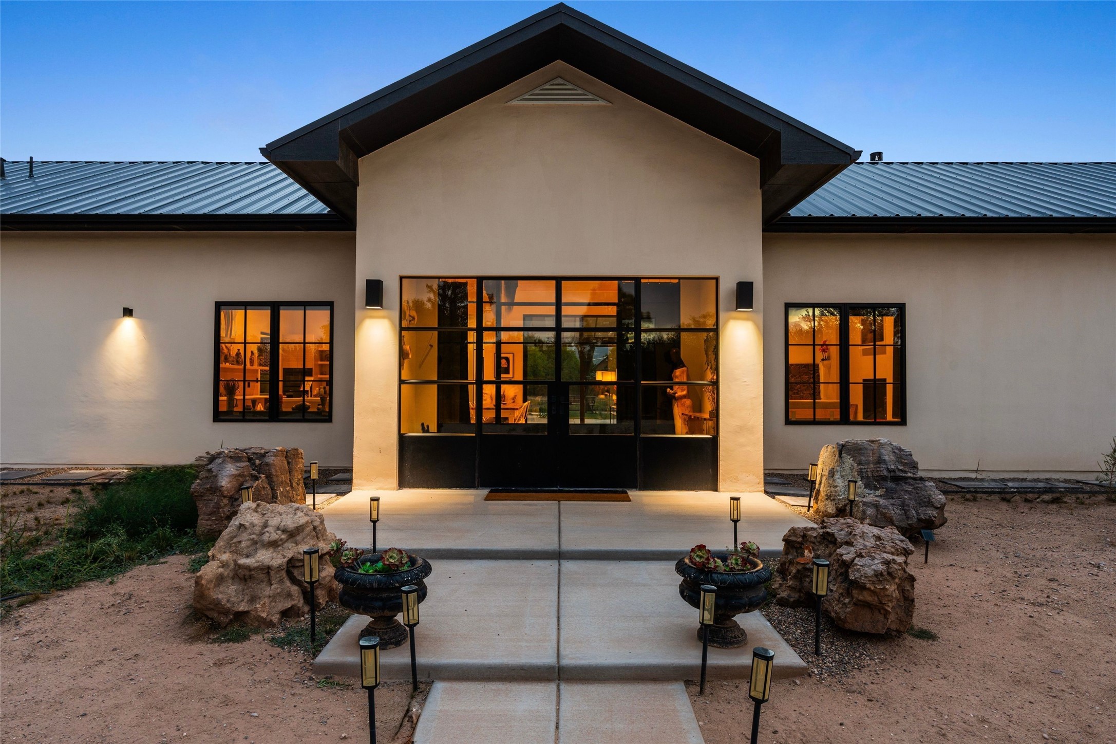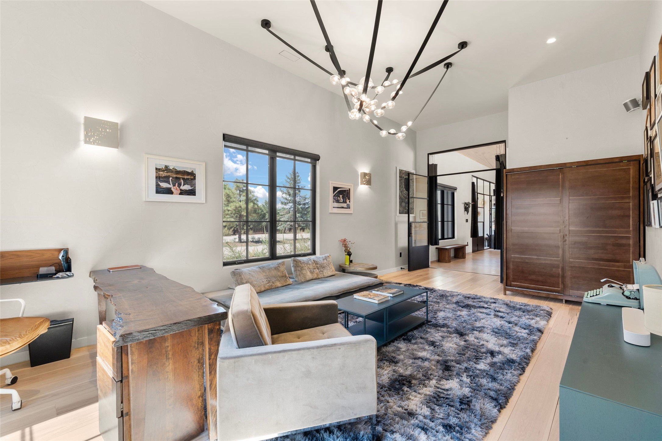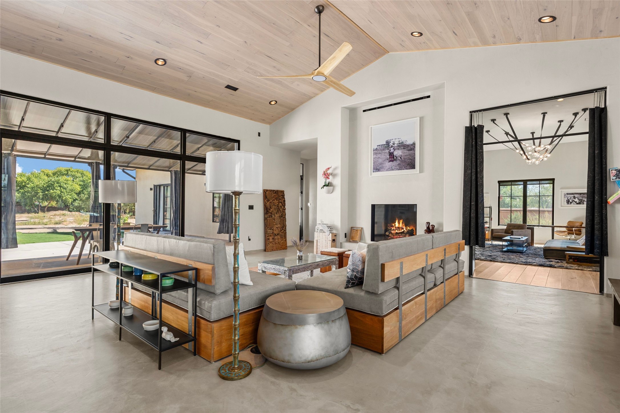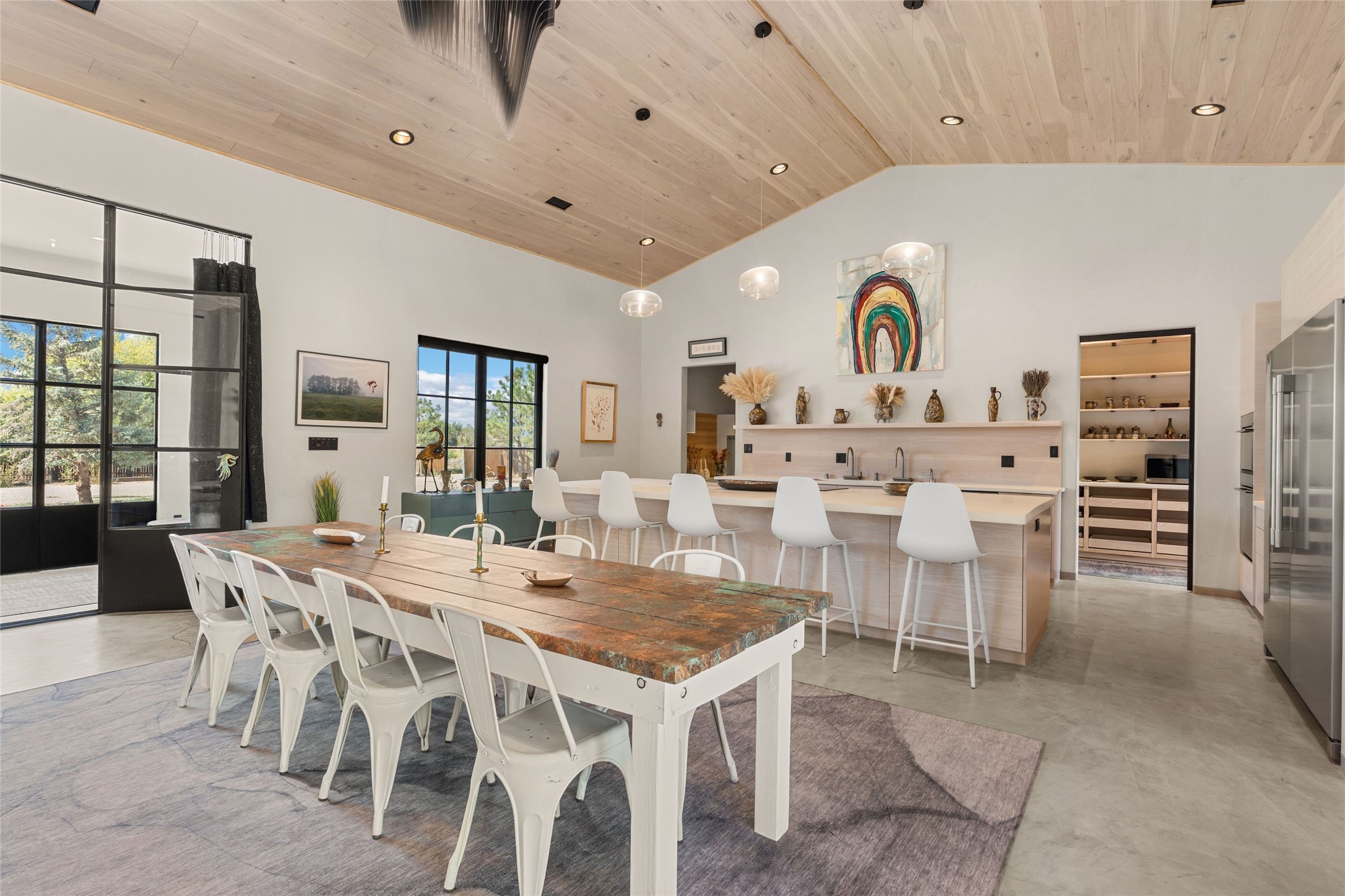 Desirable East Corrales 4-bedroom 3-bath residence on 2 acres with breathtaking Sandia Mountain views. Built in 2023, this home offers a blend of contemporary design and thoughtfully curated finishes with high ceilings, hickory wood and polished concrete floors perfect for artists and art collectors alike. Single level; no interior steps. As you enter, you are greeted by a spacious foyer that flows into an expansive living area with a fireplace and slider doors that bring the outdoors inside and create an expanded space for hosting gatherings or enjoying peaceful evenings under the stars. The gourmet kitchen is appointed with an oversized island, high-end appliances and a generous butler pantry, with wine fridge. Additional practical features include a laundry room with dog wash area, and separate mudroom. Retreat to the private primary suite, with stunning mountain views, a whimsical en-suite bath and expansive walk-in closet. Across the central courtyard, is a second primary bedroom with en-suite and walk-in closet. The third bedroom or bunkhouse offers a charming space for family and friends. The fourth bedroom provides versatile light-filled spot for a studio or office. Drive-through 3-car garage and picturesque backyard watermill, which could be adapted for power generation. Surrounded by mature Colorado ponderosa pines, this tranquil setting is a blank canvas, ready for your imagination to take flight--build your dream garden, luxurious outdoor living space, or bring your horses, as they are welcome here! Located just minutes from historic Corrales Main Street and with easy access to the Corrales Bosque Preserve's miles of trails.
