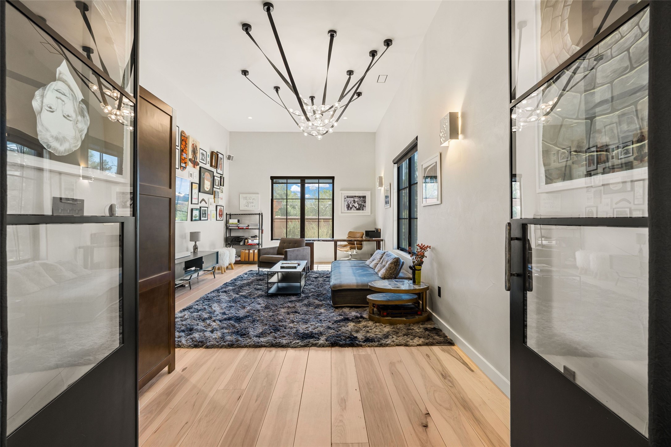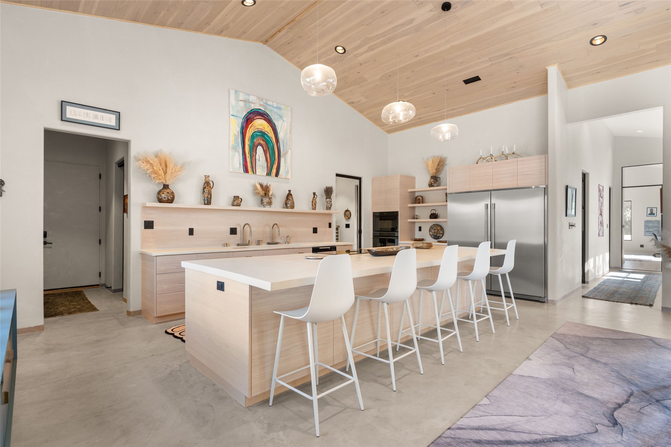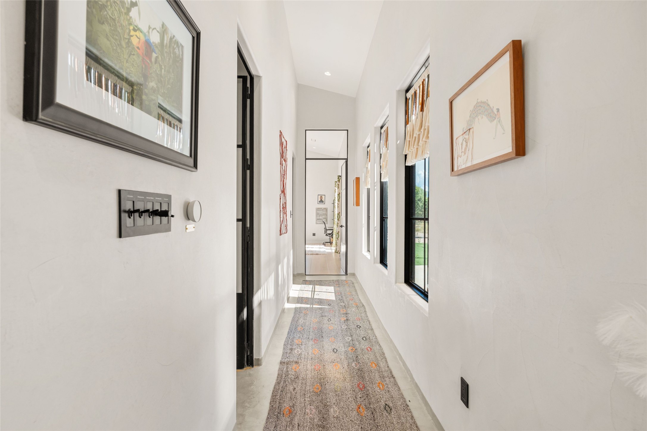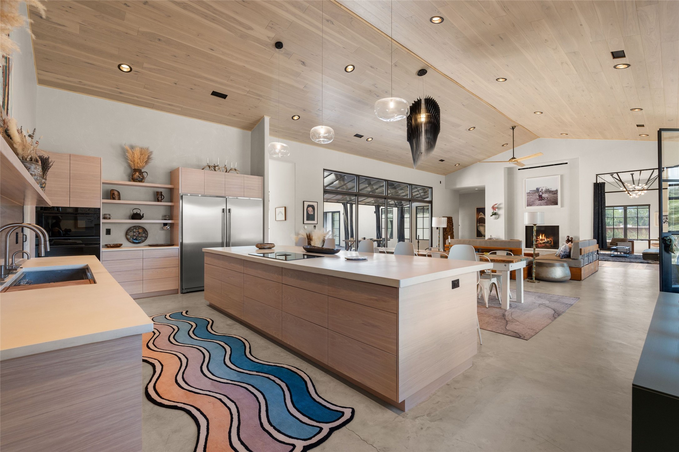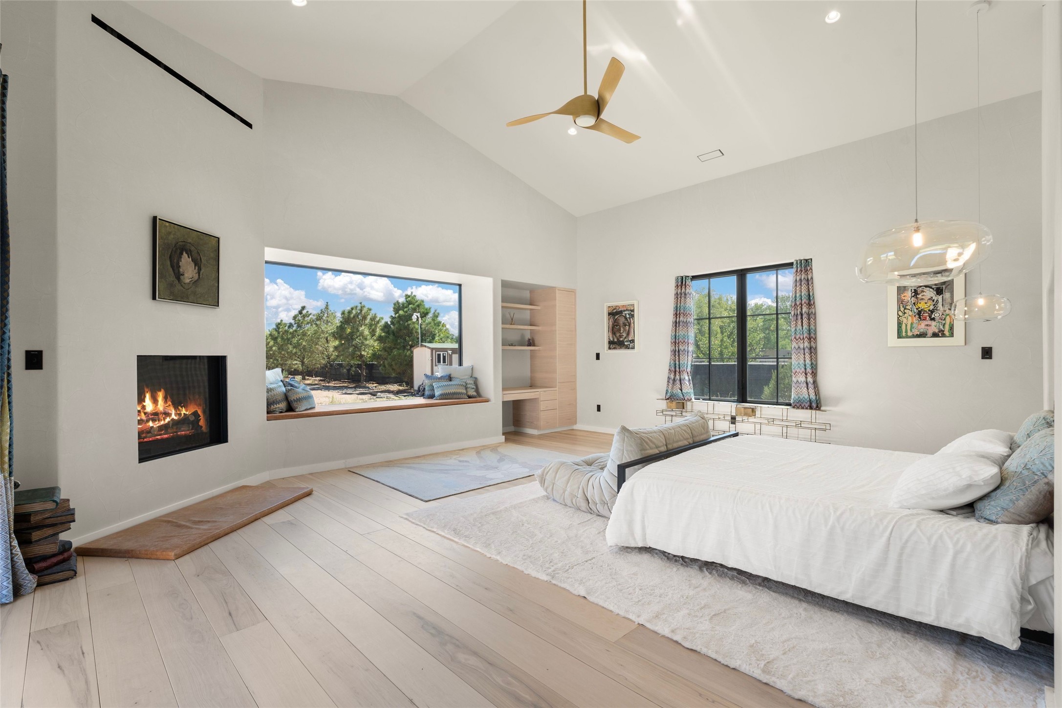 Desirable East Corrales 4-bedroom 3-bath residence on 2 acres with breathtaking Sandia Mountain views. Built in 2023, this home offers a blend of contemporary design and thoughtfully curated finishes with high ceilings, hickory wood and polished concrete floors perfect for artists and art collectors alike. Single level; no interior steps. As you enter, you are greeted by a spacious foyer that flows into an expansive living area with a fireplace and slider doors that bring the outdoors inside and create an expanded space for hosting gatherings or enjoying peaceful evenings under the stars. The gourmet kitchen is appointed with an oversized island, high-end appliances and a generous butler pantry, with wine fridge. Additional practical features include a laundry room with dog wash area, and separate mudroom. Retreat to the private primary suite, with stunning mountain views, a whimsical en-suite bath and expansive walk-in closet. Across the central courtyard, is a second primary bedroom with en-suite and walk-in closet. The third bedroom or bunkhouse offers a charming space for family and friends. The fourth bedroom provides versatile light-filled spot for a studio or office. Drive-through 3-car garage and picturesque backyard watermill, which could be adapted for power generation. Surrounded by mature Colorado ponderosa pines, this tranquil setting is a blank canvas, ready for your imagination to take flight--build your dream garden, luxurious outdoor living space, or bring your horses, as they are welcome here! Located just minutes from historic Corrales Main Street and with easy access to the Corrales Bosque Preserve's miles of trails.