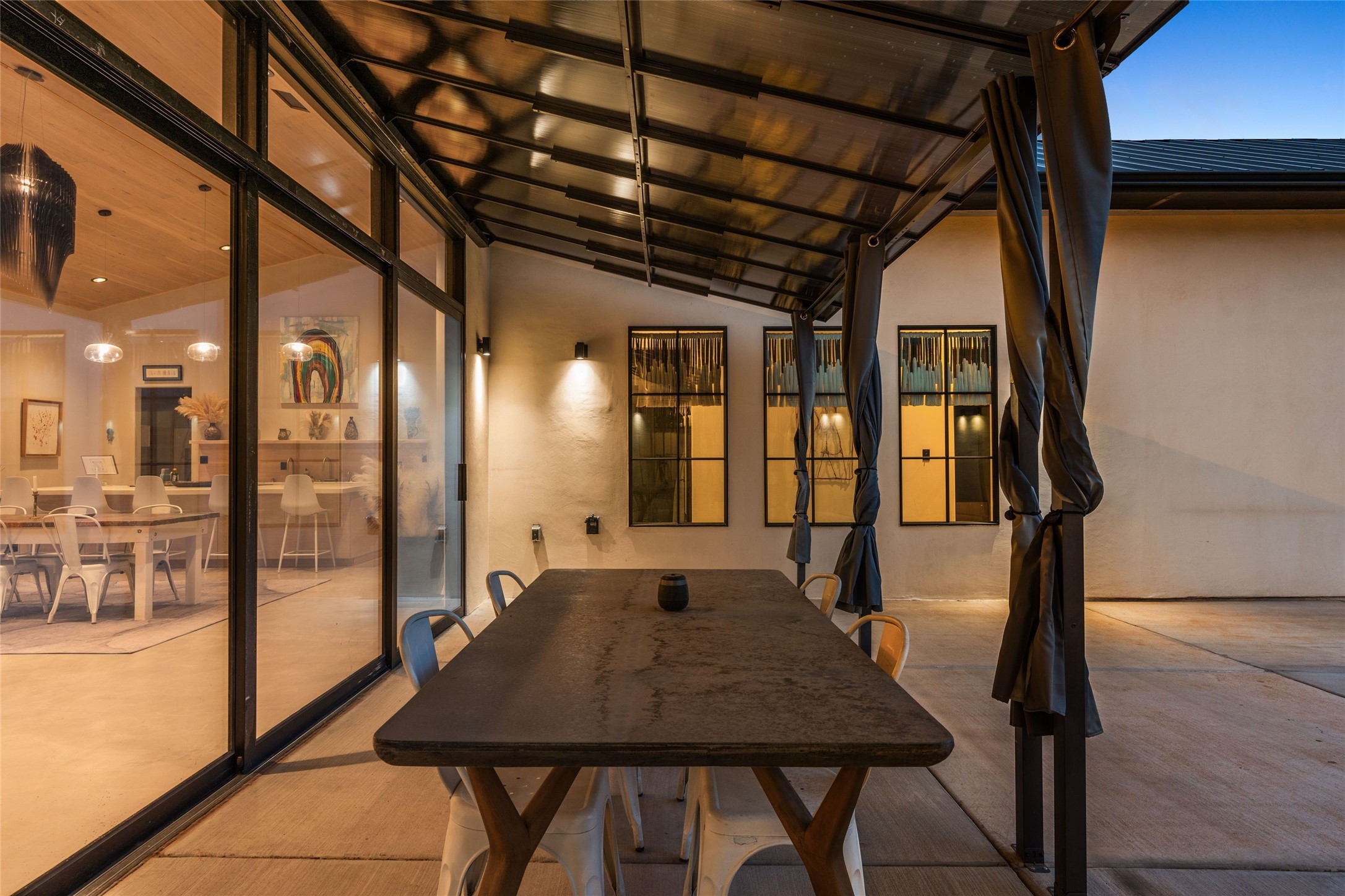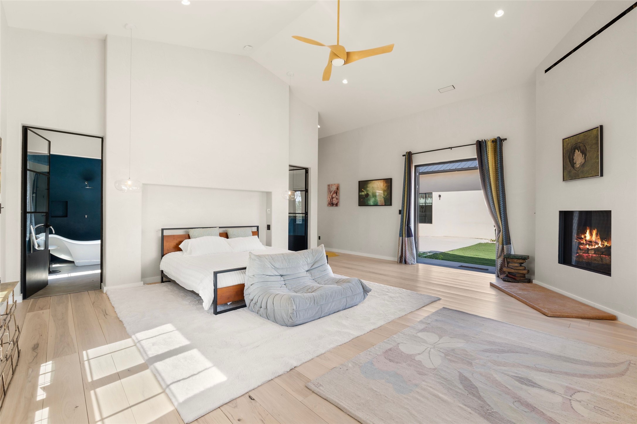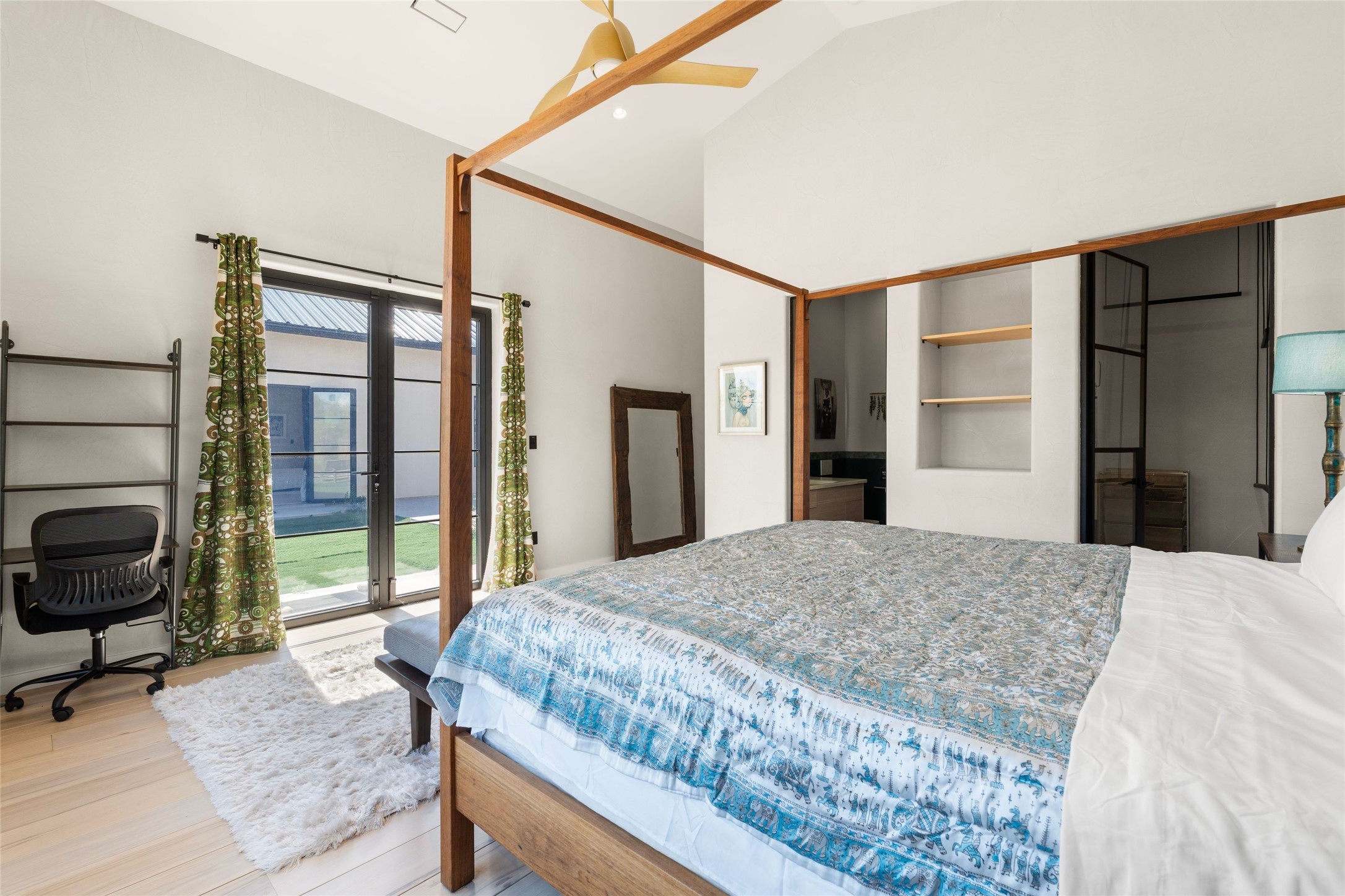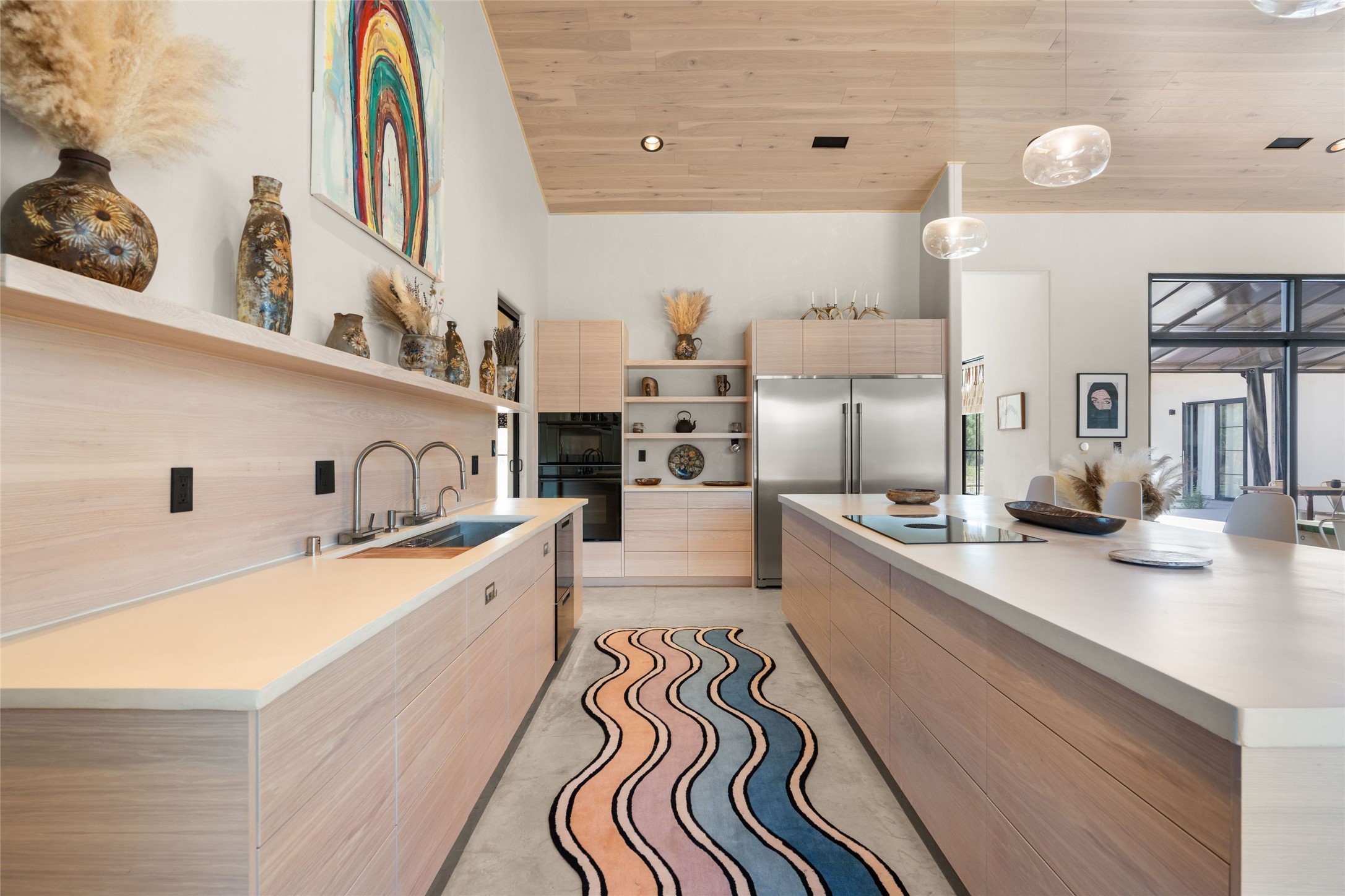 Desirable East Corrales 4-bedroom 3-bath residence on 2 acres with breathtaking Sandia Mountain views. Built in 2023, this home offers a blend of contemporary design and thoughtfully curated finishes with high ceilings, hickory wood and polished concrete floors perfect for artists and art collectors alike. Single level; no interior steps. As you enter, you are greeted by a spacious foyer that flows into an expansive living area with a fireplace and slider doors that bring the outdoors inside and create an expanded space for hosting gatherings or enjoying peaceful evenings under the stars. The gourmet kitchen is appointed with an oversized island, high-end appliances and a generous butler pantry, with wine fridge. Additional practical features include a laundry room with dog wash area, and separate mudroom. Retreat to the private primary suite, with stunning mountain views, a whimsical en-suite bath and expansive walk-in closet. Across the central courtyard, is a second primary bedroom with en-suite and walk-in closet. The third bedroom or bunkhouse offers a charming space for family and friends. The fourth bedroom provides versatile light-filled spot for a studio or office. Drive-through 3-car garage and picturesque backyard watermill, which could be adapted for power generation. Surrounded by mature Colorado ponderosa pines, this tranquil setting is a blank canvas, ready for your imagination to take flight--build your dream garden, luxurious outdoor living space, or bring your horses, as they are welcome here! Located just minutes from historic Corrales Main Street and with easy access to the Corrales Bosque Preserve's miles of trails.