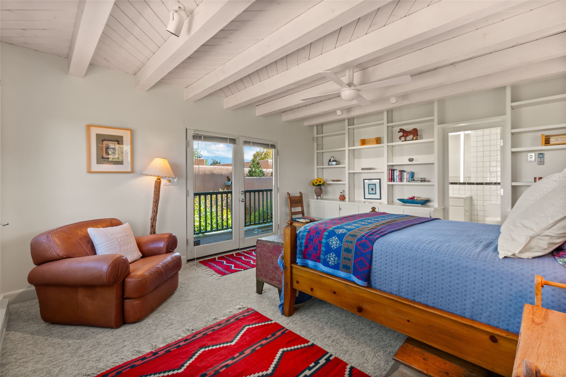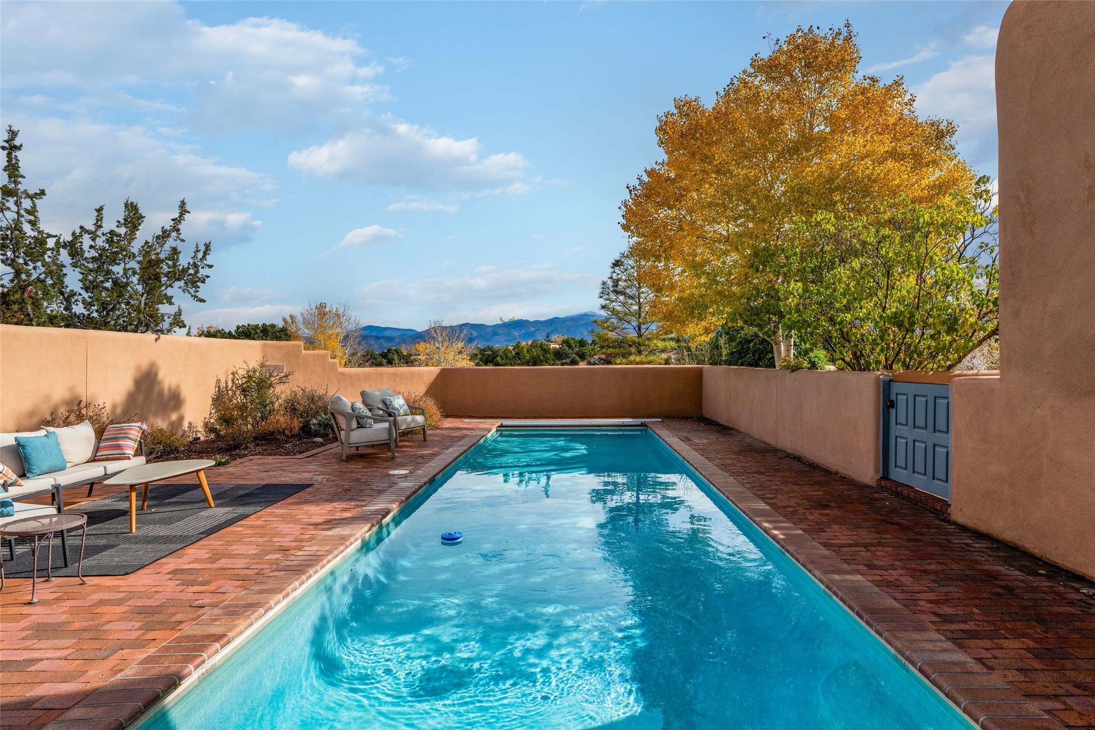 The story goes that when John Crosby (the original developer and founder of the Santa Fe Opera) chose a lot for their model, he chose this interior Casas de San Juan lot due to it's seclusion, privacy, and spectacular views. The main house, separate guest house, and heated swimming pool are singular in the condominium configuration in the subdivision. The living room features a high ceiling and glass window wall the inspire "Wow" when one walks in the home...it also features a wet bar, corner kiva fireplace, and a wall for media. The newly installed/renovated kitchen (by renowned kitchen designer Jeanne') features stone counter tops, Sub-Zero and Kitchen Aid appliances with a range/oven and a 2nd oven for big togethers. The kitchen space features high ceilings and lots of light. The over-sized Primary suite again features the views, a corner kiva fireplace, and a beautifully renovated full bath with separate tub and shower. The second large bedroom suite is on the other end of the home for privacy, and the home is rounded out by a 3rd bedroom and hallway full bath. The separate guest house sits atop the garage and is a welcome retreat from the main house with lots of space, privacy and comfort. To the east of the main part of the home is a large courtyard/garden area that provides plenty of options for outdoor living. And the large lap pool (41 x 12) sits to the north and is fenced in with a cabana, kiva fireplace and a barbecue area. The home has forced air heat and refrigerated air conditioning, w/ supplemental heat & AC via mini-split in the north bedroom suite and in the guest house. The home has a wired sound system, and utilizes a shared well and septic via the HOA. Casas de San Juan is a gated subdivision accessed by the Main Entrance front gate staffed during the day for added Security.