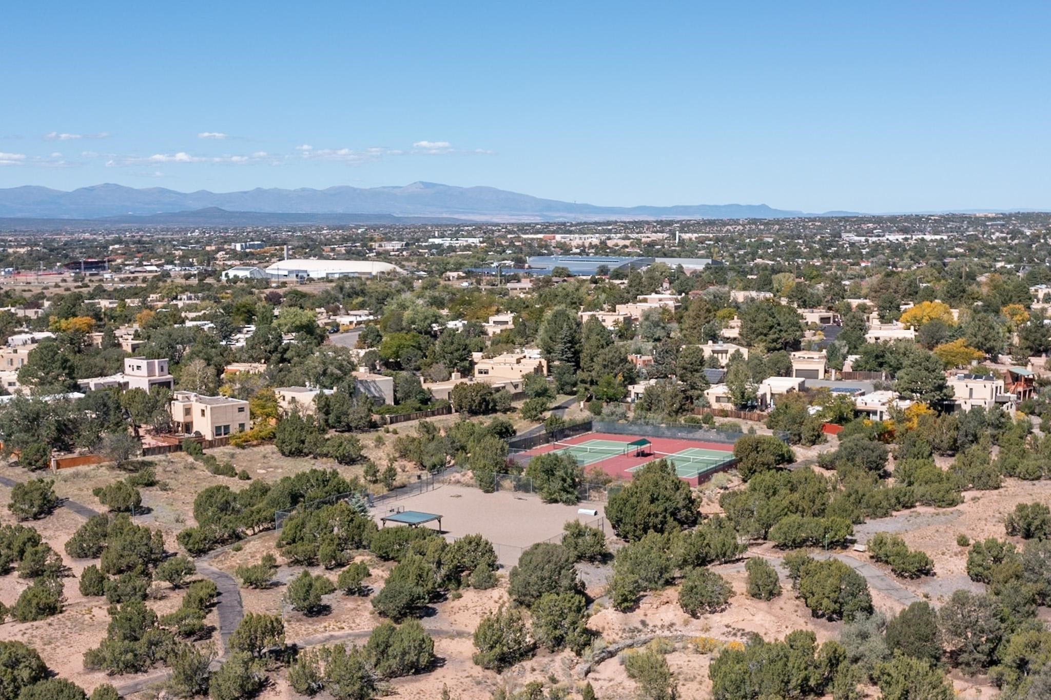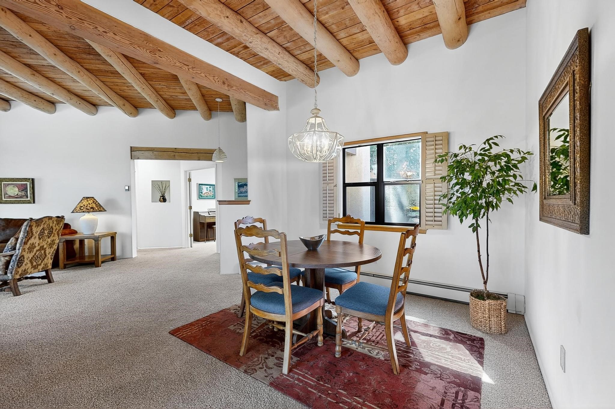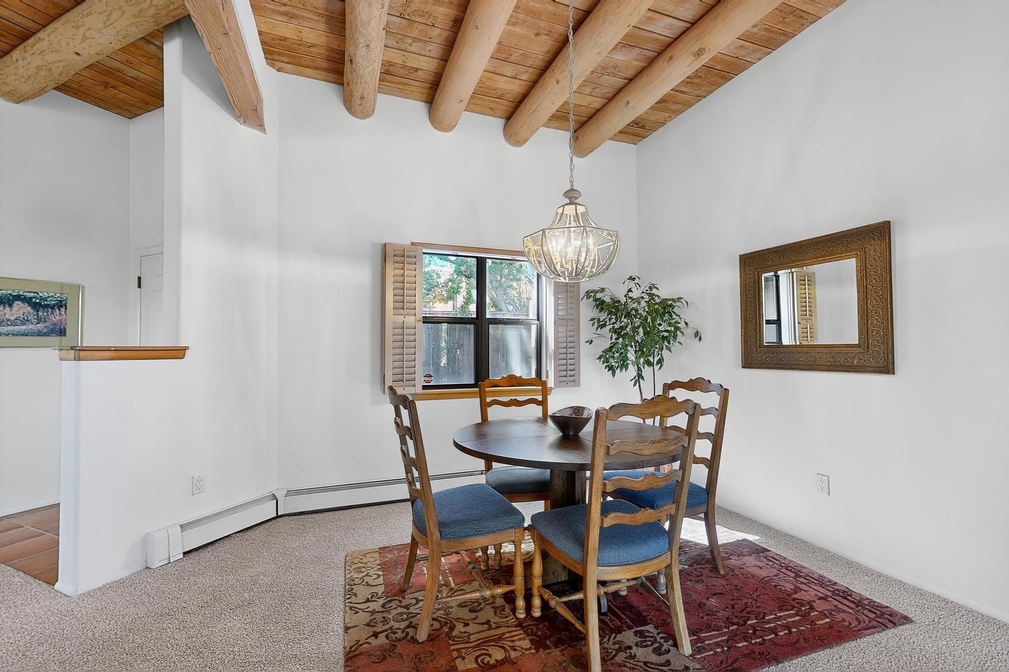 Welcome to this warm and inviting home in the coveted Estates at Park Plaza. Featuring impressive viga beamed ceilings, Saltillo tile, Kiva fireplace and lovely courtyard entry, this home exudes warmth and comfort. The backyard deck shaded by trees, offers a perfect space for outdoor gatherings or quiet evenings. Residents can enjoy fantastic amenities, including a community garden, tennis and pickleball courts, a dog park and 8 miles of scenic walking paths. Located close to shops, restaurants, and just a short drive to the historic Plaza, this home provides both convenience and a sense of community. With recent updates including a boiler, kitchen water heater, refrigerator, dishwasher and stove in 2025, this home is move-in ready.