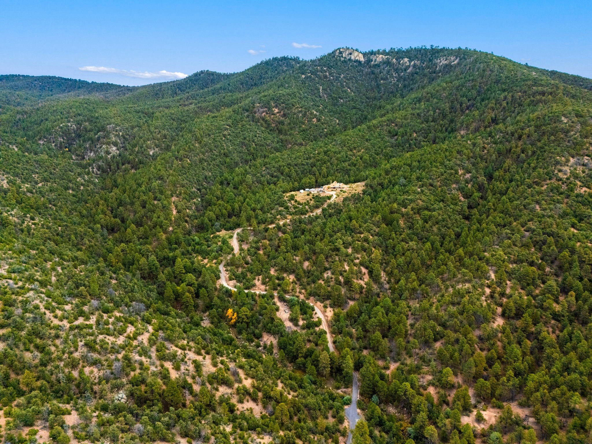 Nestled on 78 pristine private acres spread across four deeded lots, this extraordinary estate offers a blend of seclusion, artistry and timeless Southwestern charm just 25 minutes from downtown Santa Fe.The 4,400 square foot adobe home is a masterpiece of craftsmanship and comfort. Solid adobe construction provides natural insulation that keeps interiors warm in winter and cool in summer. Inside, four ensuite bedrooms and 4.5 baths offer comfort and privacy while 30 hand carved doors and accents from Seret and Sons lend a one of a kind artistic touch throughout the home.The great room is the heart of this residence anchored by a dramatic stone fireplace, high viga ceilings and a custom antler chandelier that adds rustic elegance. French doors open to a spacious front portal framing sweeping views of the Sangre de Cristo Mountains.A graceful circular staircase leads to the upper level where two ensuite bedrooms and a balcony overlooking the great room create an inviting sense of openness and connection. The kitchen is both functional and charming with granite counters, abundant cabinetry and a cozy breakfast nook warmed by its own fireplace. Saltillo tile floors flow throughout the main level while hardwood floors add warmth upstairs.The primary suite is a private retreat with panoramic mountain views and a luxurious bath with a jetted tub, tiled shower and granite counters.Step outside to a fenced backyard and patio perfect for watching the weather in the distance, peaceful wildlife and star filled nights. Additional features include solar hot water, four fireplaces, a two car garage, two sheds and a chicken coop with eight hens that provide fresh eggs daily.This property is more than a home. It is a work of art set deep in nature offering tranquility, authenticity and soul. Experience a place where art, architecture and landscape come together in harmony.