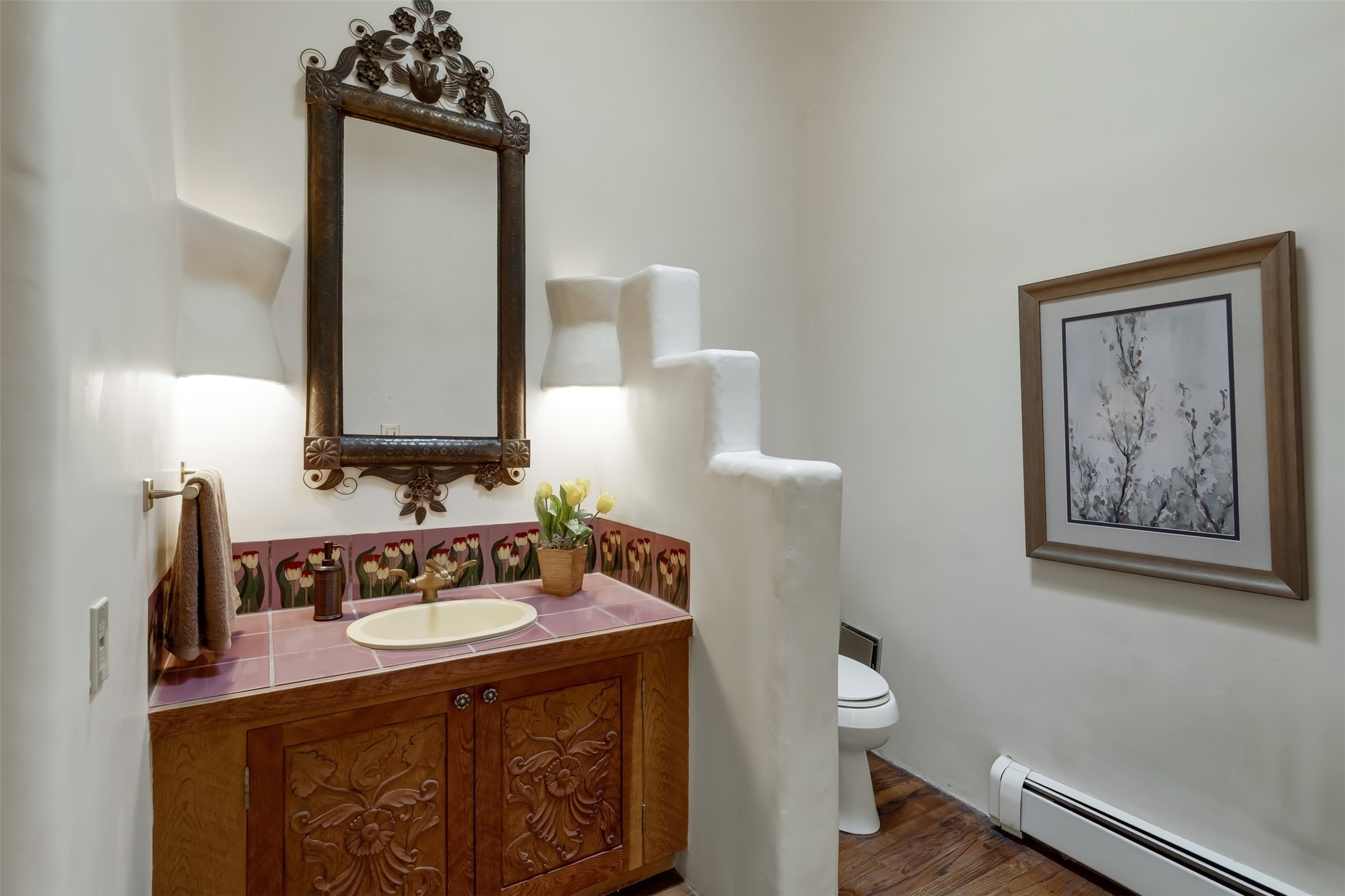 In the quaint village of Galisteo lies this gracious and majestic home with adjoining 5 acre lot, for a total of 10 acres, known as 'Hacienda del Sol." One hundred years ago was the site of the Old Galisteo School House. The original 1886 bell and corner stone 1938 were placed within the walls of this present day home. Built atop of a gentle hill with stunning views of the Galisteo Basin, Sangre de Cristos and Jemez Mountains along with huge white puffy cloud formations in a brilliant blue sky greet you everyday. Large rooms with cathedral ceilings flooded with light, sculptured fireplaces, oak and pine floors with 10 foot elegantly carved doors delight the eye upon entering. Screened in, is a lovely outdoor patio with vast, distant views. A gallery hallway runs the length of the house craving art, paintings, photographs, memorabilia. A chef's kitchen with a six burner stove, center islands, prep sinks has everything one would want. An elegant dining room with arched walls, subtle lighting, and carved cabinets allow for many guests or small intimate settings. Three Bedroom suites each with fireplaces and luscious bathrooms are perfectly placed for privacy. An attached "casita" with kitchen and bath is off one of the wings of the home. Outside, there is a circular, walled patio area for summer gatherings and moon lit nights. Included in this fabulous property is a blue gate opening up to an adjoining 5 acre parcel of vacant land accessed off of Camino San Cristobal used for pleasure or as additional acreage for another home, studio, horses, and imagination. Dream on...