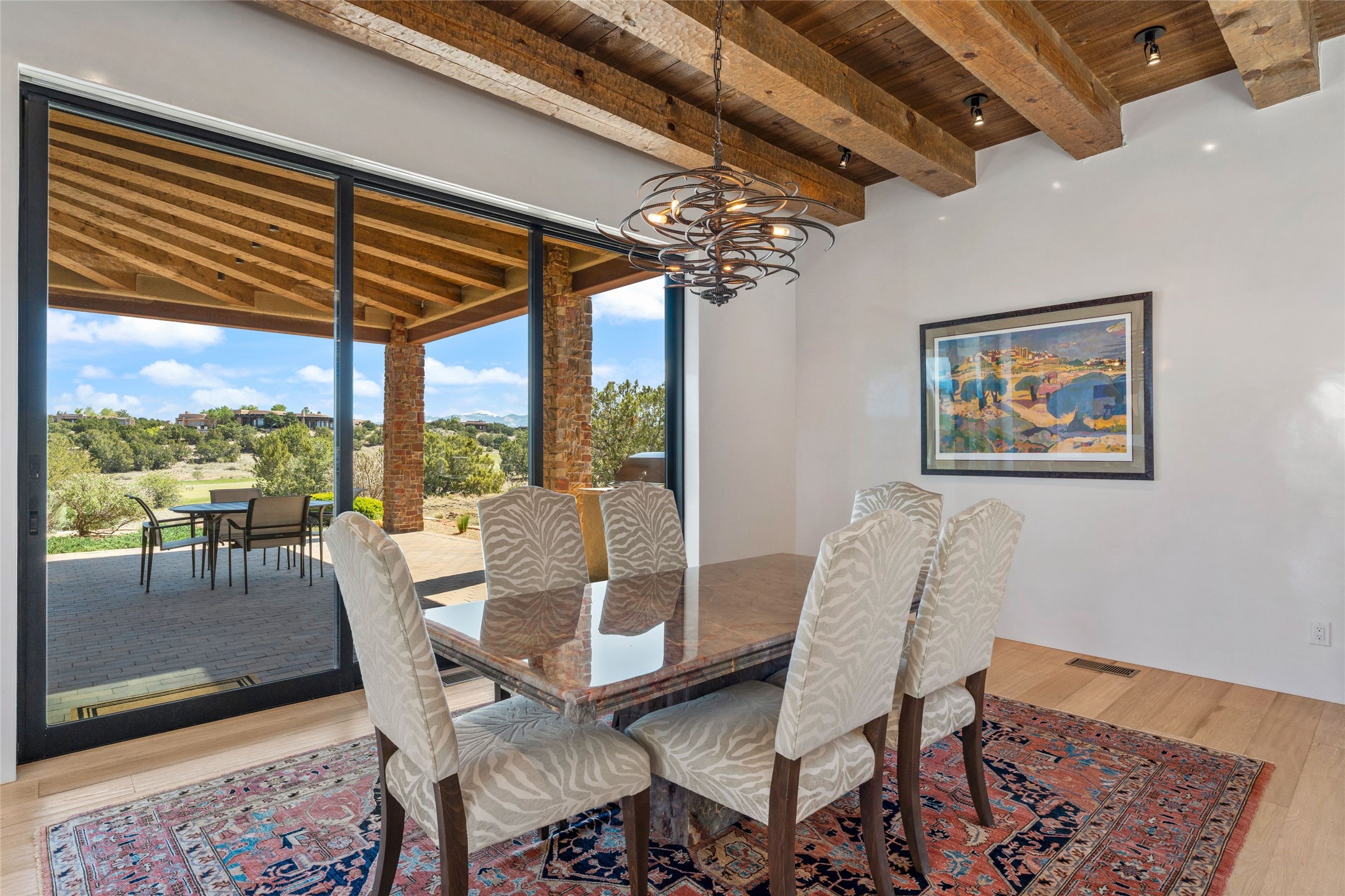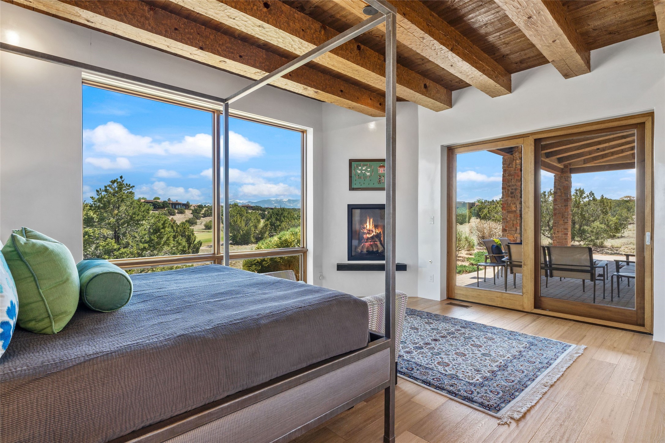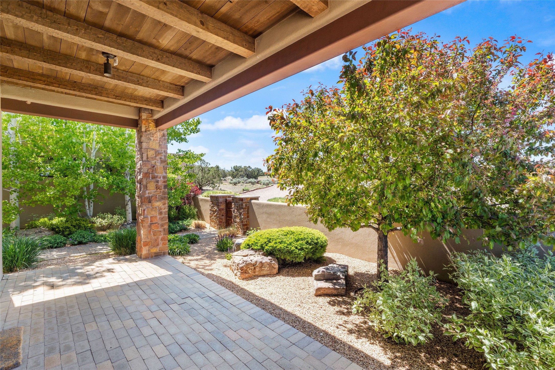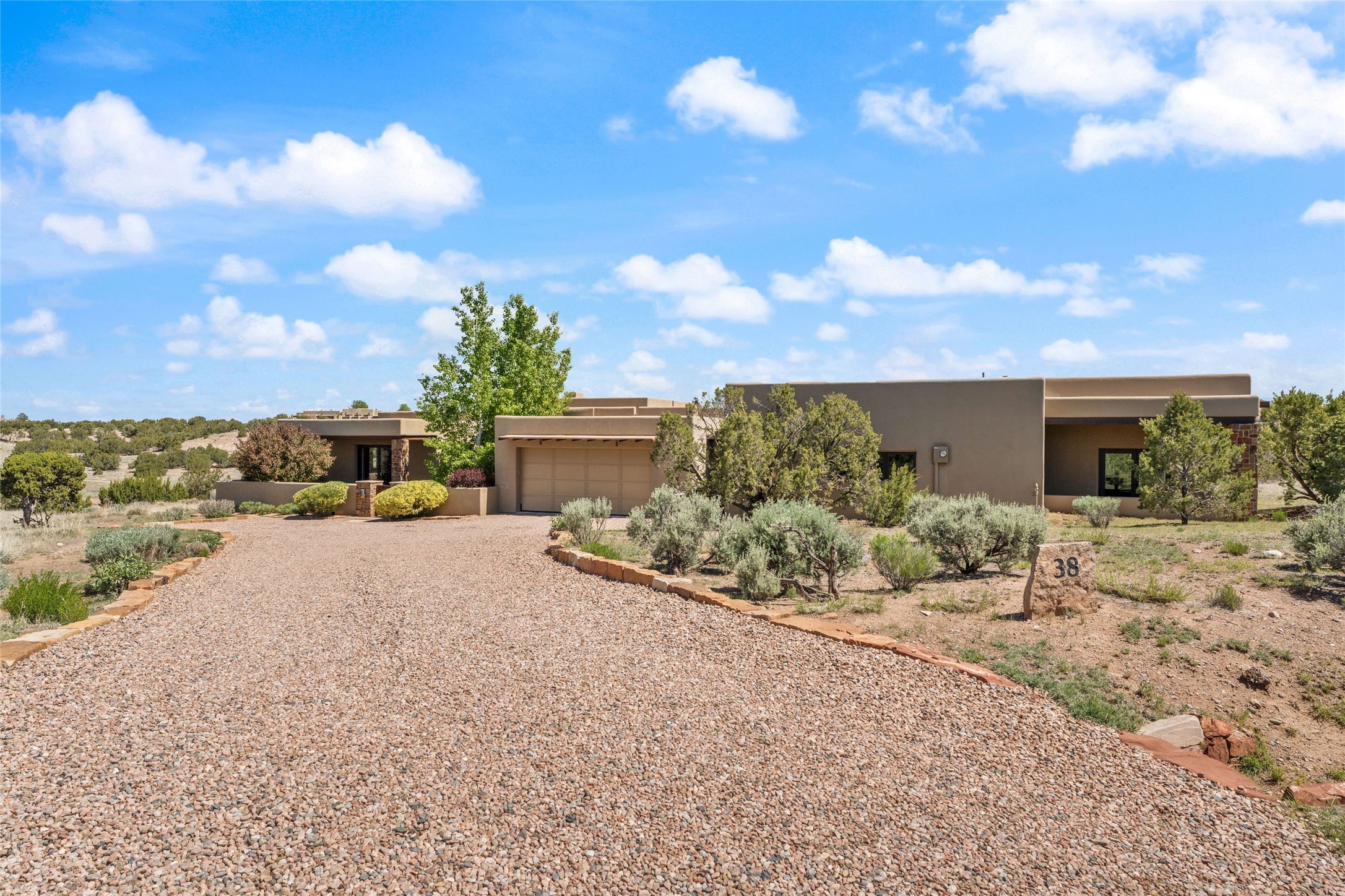 Exquisite 3-bedroom, 3.5-bath home with a detached guest house, situated on 1.45 acres overlooking the Sunrise Golf Course. This Las Campanas Estates III. property with its breathtaking distant mountain views, offering a connection to the natural beauty of the Southwest. This single-level residence, built by Tierra Concepts in 2015, features no interior steps. The light-filled living room seamlessly flows into a separate dining room and gourmet kitchen appointed with quartered walnut cabinets, a BlueStar range, Bosch dishwasher, Subzero refrigerator, and a spacious center island with a prep sink. Retreat to the primary bedroom, equipped with a gas fireplace for added warmth during cooler months and two expansive walk-in closets that provide ample storage. The guest bedroom includes a private bath and direct access to an outdoor courtyard. Additionally, an office/studio space caters to all your productivity and creative needs. The 1,186 sq. ft. guest house, added in 2020 enhances this property's appeal. It features a welcoming living room complete with a sink and mini-fridge. With one bedroom, a bath, and a one-car garage; this space is both functional and versatile. Las Campanas embodies the ultimate expression of Santa Fe living. With a separate membership to the Club at Las Campanas, available upon approval, you can enjoy exclusive access to top-tier amenities, including two Jack Nicklaus Signature Golf Courses.
