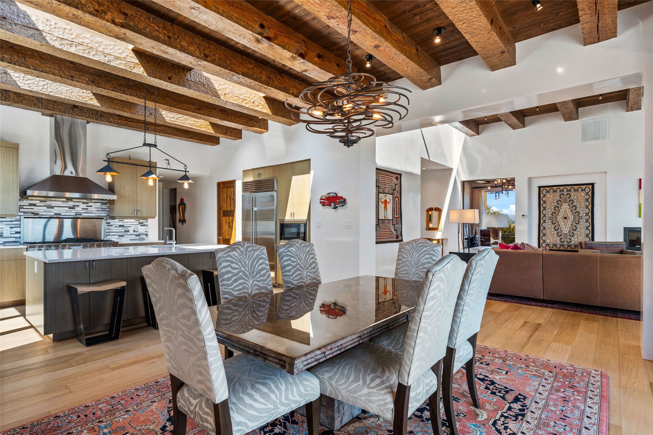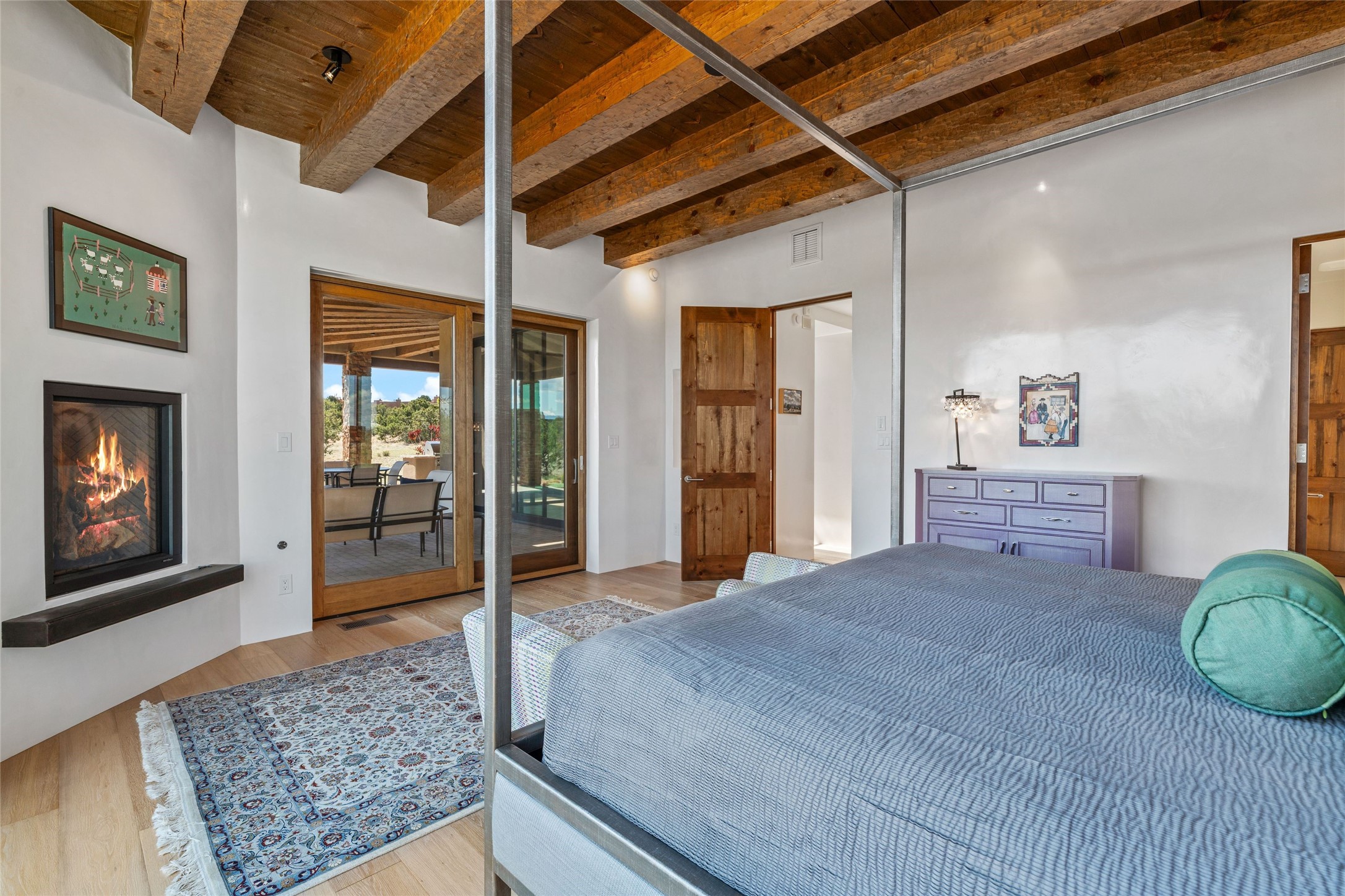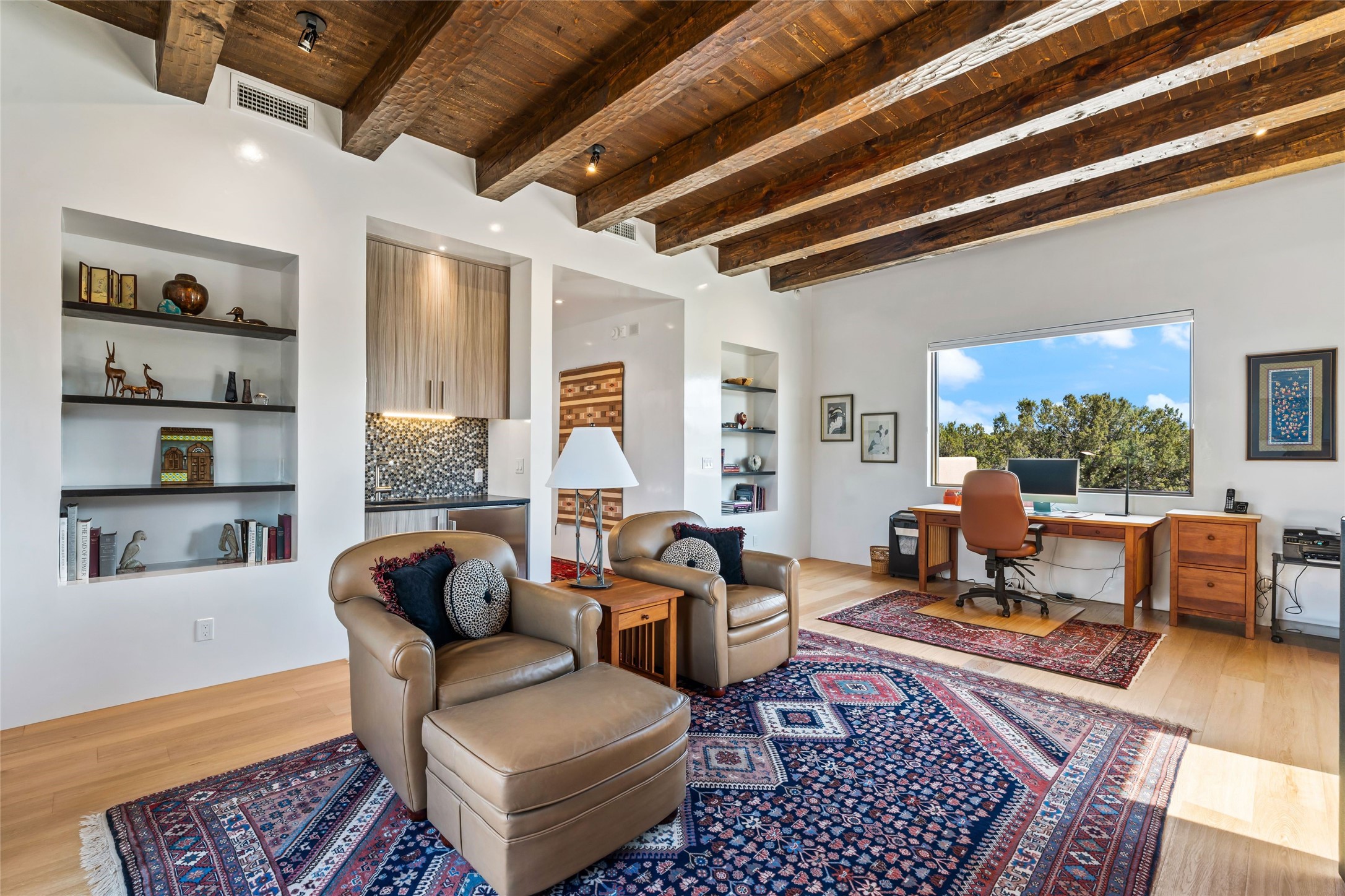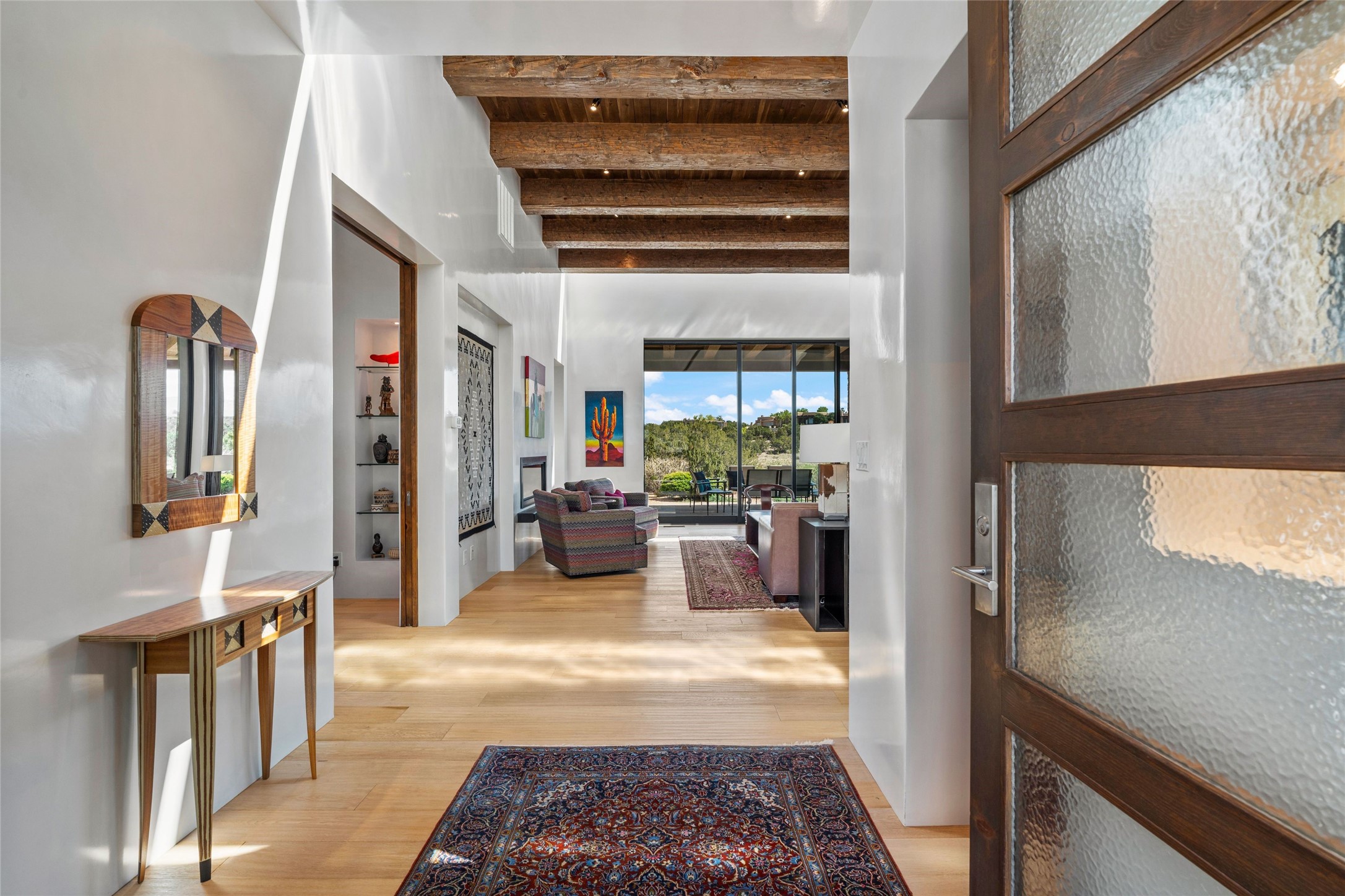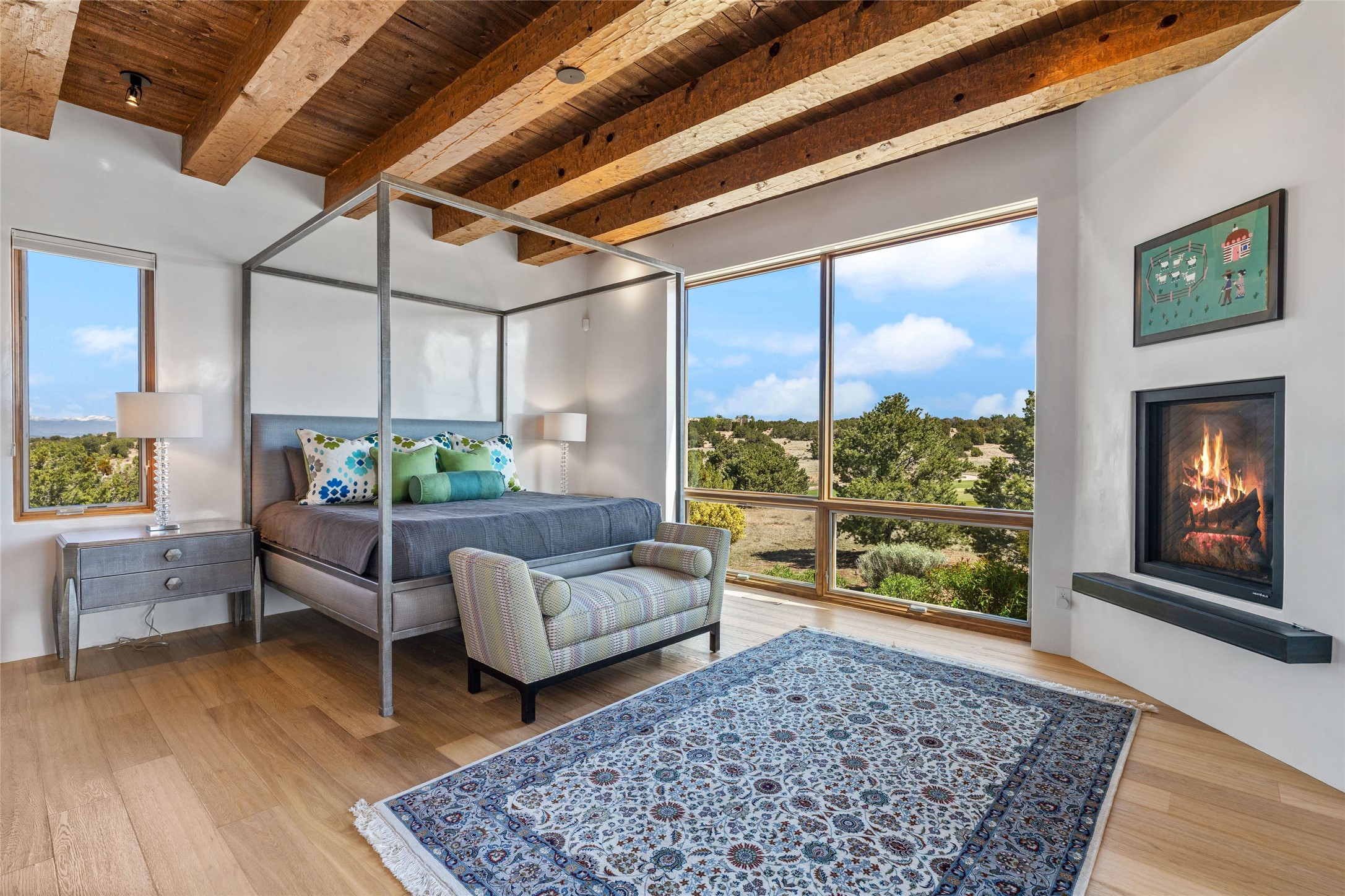 Exquisite 3-bedroom, 3.5-bath home with a detached guest house, situated on 1.45 acres overlooking the Sunrise Golf Course. This Las Campanas Estates III. property with its breathtaking distant mountain views, offering a connection to the natural beauty of the Southwest. This single-level residence, built by Tierra Concepts in 2015, features no interior steps. The light-filled living room seamlessly flows into a separate dining room and gourmet kitchen appointed with quartered walnut cabinets, a BlueStar range, Bosch dishwasher, Subzero refrigerator, and a spacious center island with a prep sink. Retreat to the primary bedroom, equipped with a gas fireplace for added warmth during cooler months and two expansive walk-in closets that provide ample storage. The guest bedroom includes a private bath and direct access to an outdoor courtyard. Additionally, an office/studio space caters to all your productivity and creative needs. The 1,186 sq. ft. guest house, added in 2020 enhances this property's appeal. It features a welcoming living room complete with a sink and mini-fridge. With one bedroom, a bath, and a one-car garage; this space is both functional and versatile. Las Campanas embodies the ultimate expression of Santa Fe living. With a separate membership to the Club at Las Campanas, available upon approval, you can enjoy exclusive access to top-tier amenities, including two Jack Nicklaus Signature Golf Courses.