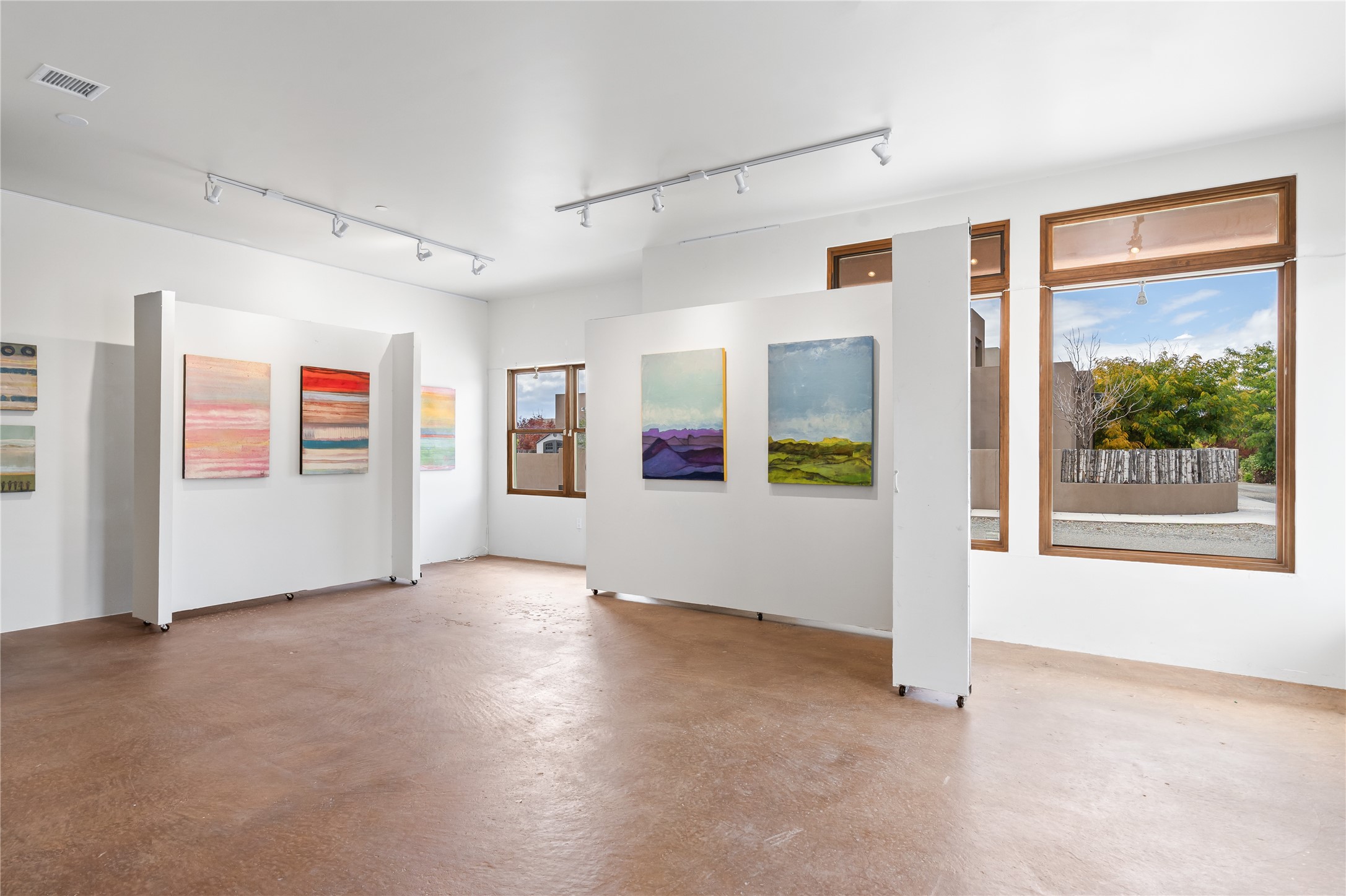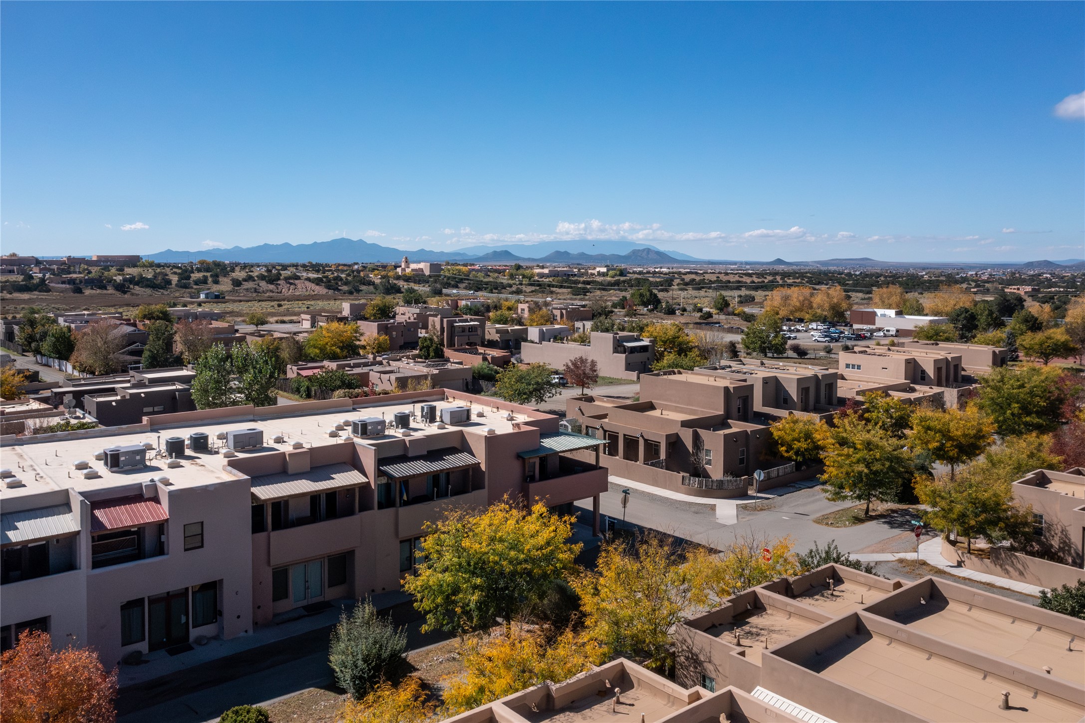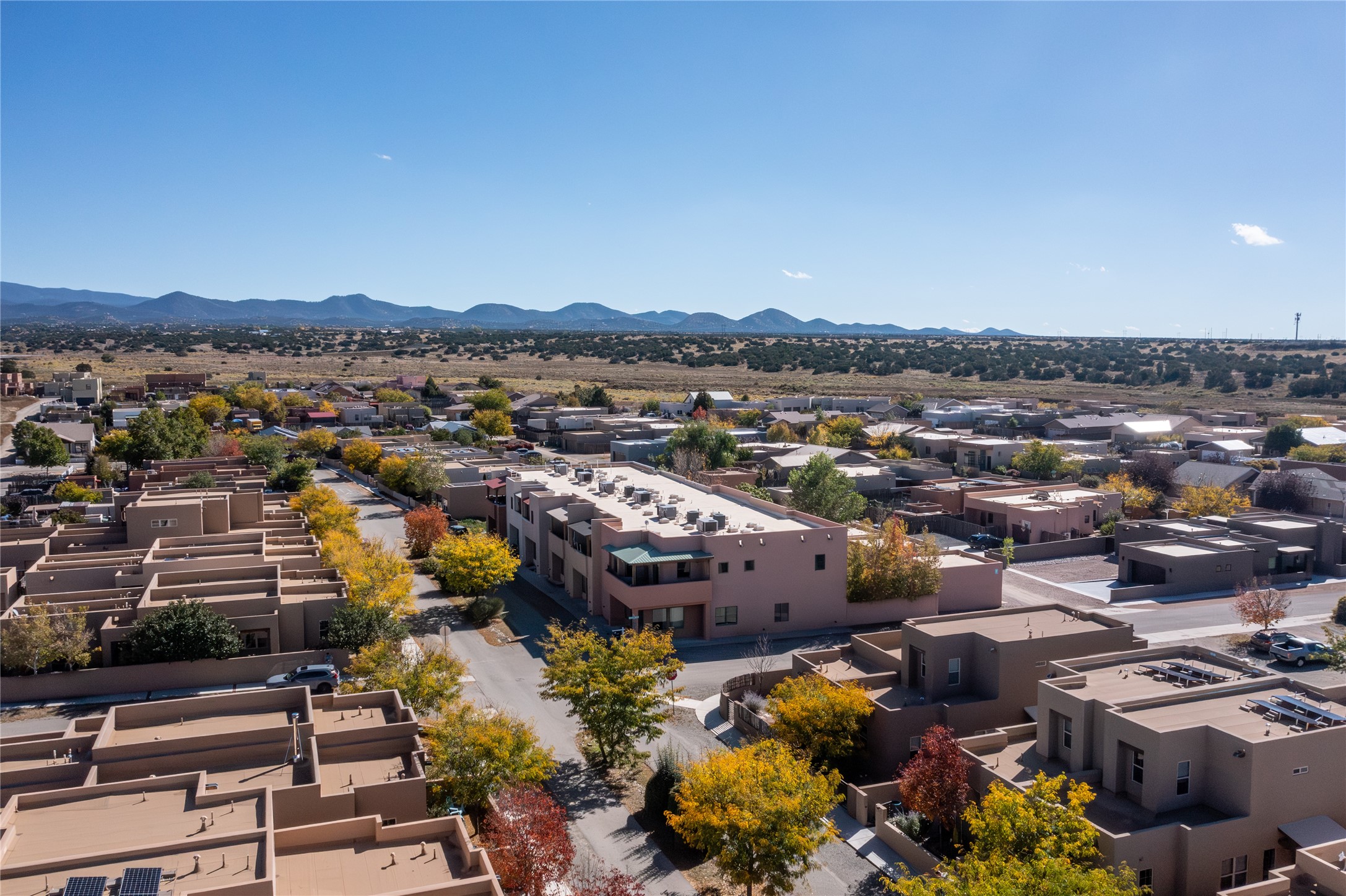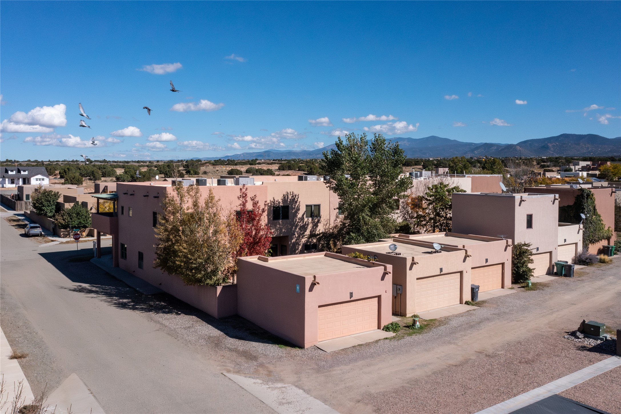 This modern corner-lot property in desirable Oshara Village offers the perfect blend of work and lifestyle flexibility. The ground floor features a spacious gallery/workshop--ideal for an artist, creative professional, or small business--divided into two rooms with expansive windows that flood the space with natural light. Additional highlights include a half-bath, workspace with a sink, durable concrete floors, and a lovely walled courtyard with flagstone, artificial grass, a pergola entertaining area, fountain, and mature landscaping, with direct access to a two-car garage.Upstairs, the light-filled two-bedroom, two-bath residence impresses with soaring ceilings, large windows, and an open floor plan. The chef's kitchen includes abundant workspace, a barstool-friendly island, sleek tile backsplash, and a GE Monogram six-burner cooktop/oven. The living area extends to a delightful outdoor deck, perfect for entertaining or enjoying mountain views. Luxury vinyl plank floors run throughout, creating a warm, modern feel.The spacious primary suite boasts a California Closets walk-in with built-ins, plus a spa-like bathroom with dual sinks, soaking tub, and separate shower. A second upstairs entrance from the back courtyard offers added flexibility--allowing the option to rent one level while living in the other.This unique property is a rare opportunity to combine work and home life in one stylish, functional space--or two separate spaces. Many other adjacent homes have also repurposed the downstairs as living space to provide the ultimate in comfort with multiple living areas. The popular Pantry Dos restaurant is within walking distance, along with an inviting community park and sculpture garden. The Santa Fe Community College with gym and swimming pool is nearby, and Richards and Rabbit Road offer easy access to Cerrillos/Zafarano shopping and the St. Francis Drive shopping area. The Plaza is an easy 15-minute drive.
