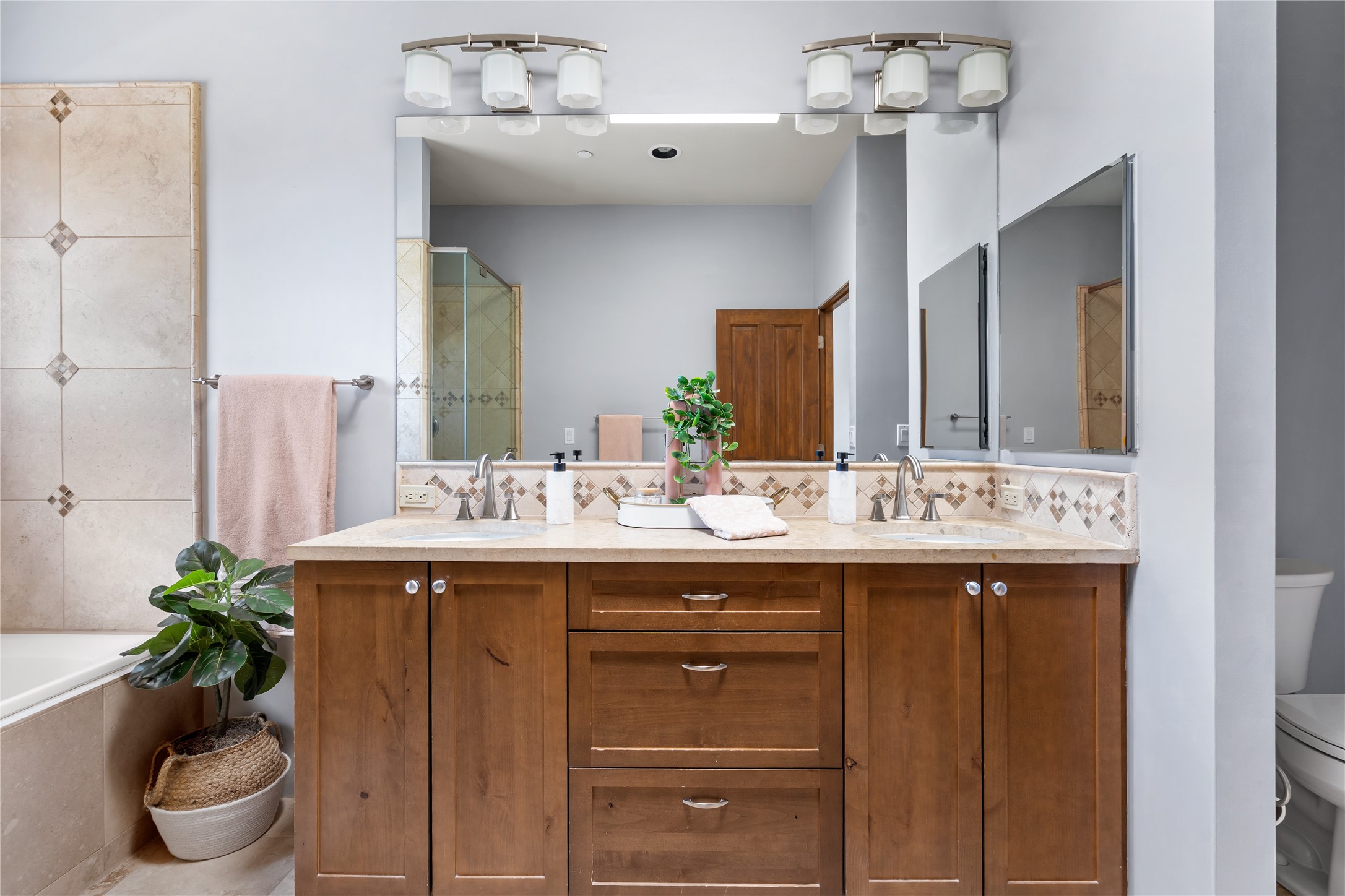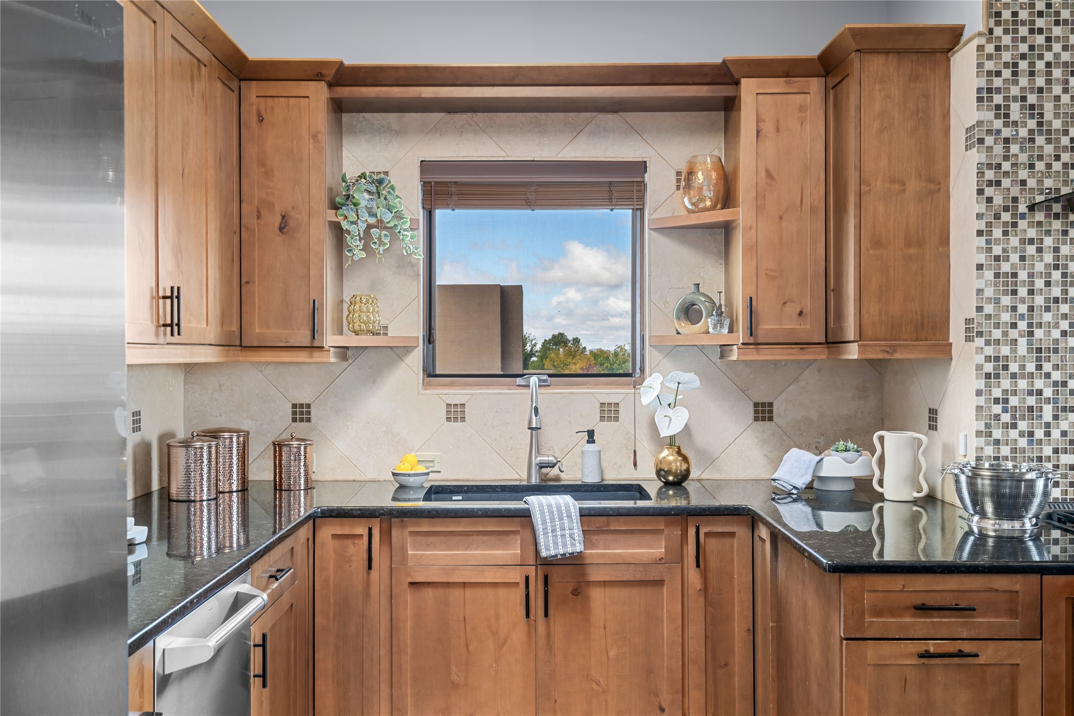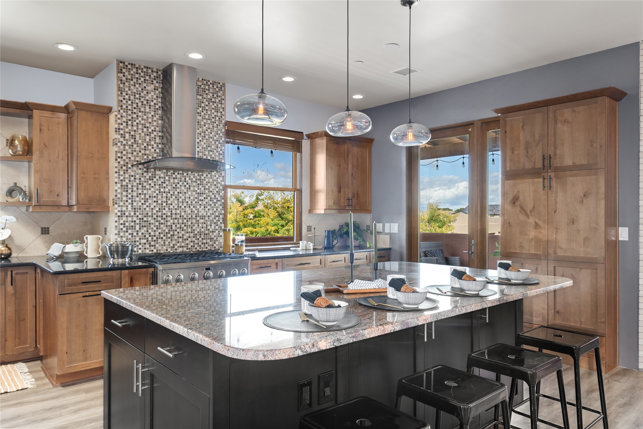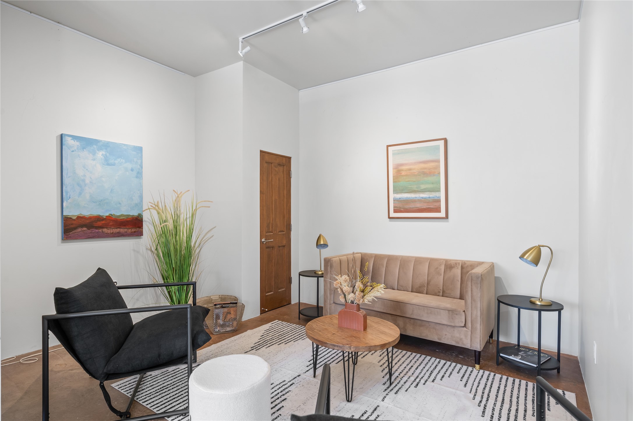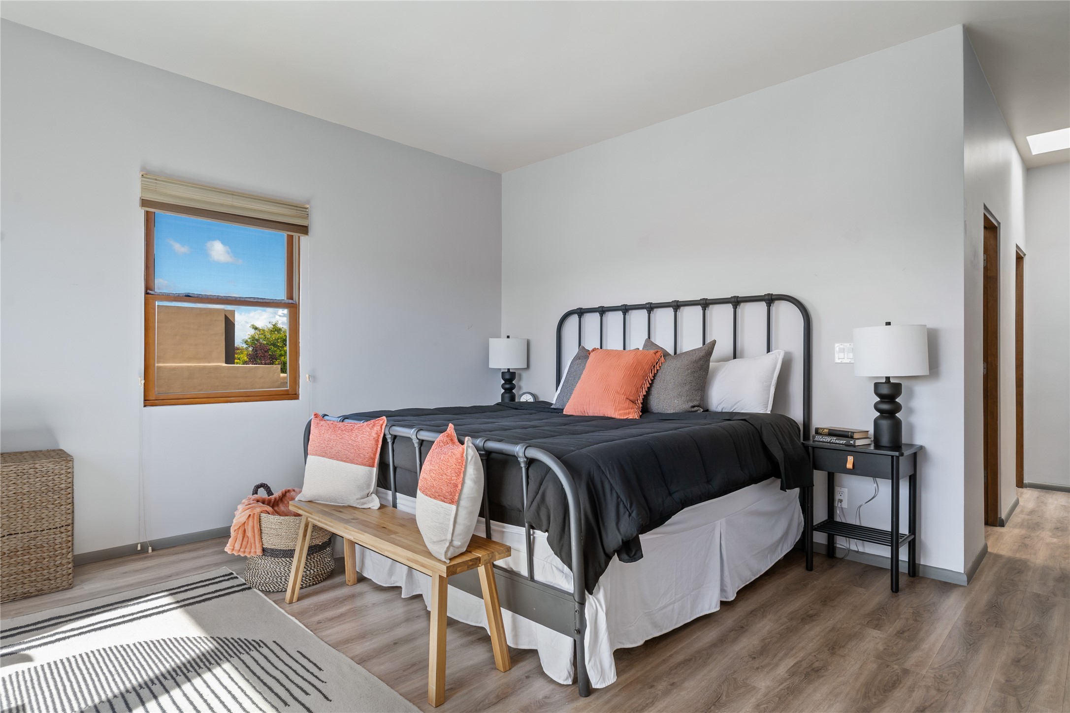 This modern corner-lot property in desirable Oshara Village offers the perfect blend of work and lifestyle flexibility. The ground floor features a spacious gallery/workshop--ideal for an artist, creative professional, or small business--divided into two rooms with expansive windows that flood the space with natural light. Additional highlights include a half-bath, workspace with a sink, durable concrete floors, and a lovely walled courtyard with flagstone, artificial grass, a pergola entertaining area, fountain, and mature landscaping, with direct access to a two-car garage.Upstairs, the light-filled two-bedroom, two-bath residence impresses with soaring ceilings, large windows, and an open floor plan. The chef's kitchen includes abundant workspace, a barstool-friendly island, sleek tile backsplash, and a GE Monogram six-burner cooktop/oven. The living area extends to a delightful outdoor deck, perfect for entertaining or enjoying mountain views. Luxury vinyl plank floors run throughout, creating a warm, modern feel.The spacious primary suite boasts a California Closets walk-in with built-ins, plus a spa-like bathroom with dual sinks, soaking tub, and separate shower. A second upstairs entrance from the back courtyard offers added flexibility--allowing the option to rent one level while living in the other.This unique property is a rare opportunity to combine work and home life in one stylish, functional space--or two separate spaces. Many other adjacent homes have also repurposed the downstairs as living space to provide the ultimate in comfort with multiple living areas. The popular Pantry Dos restaurant is within walking distance, along with an inviting community park and sculpture garden. The Santa Fe Community College with gym and swimming pool is nearby, and Richards and Rabbit Road offer easy access to Cerrillos/Zafarano shopping and the St. Francis Drive shopping area. The Plaza is an easy 15-minute drive.