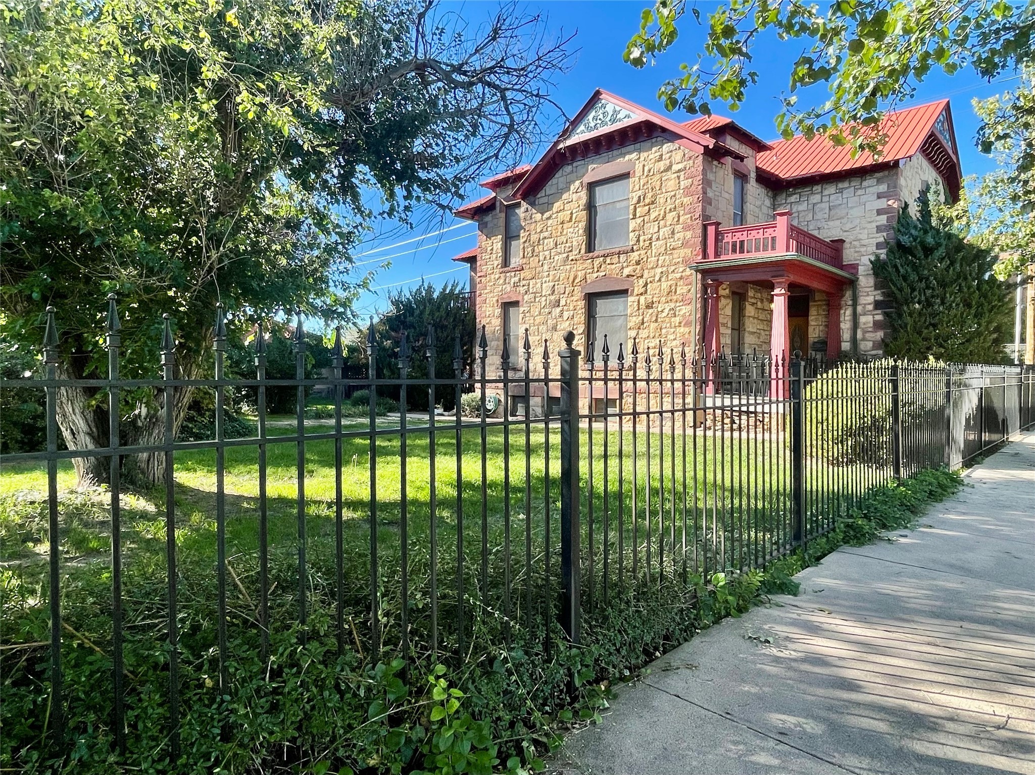 Stunning 1898 stone Queen Anne style home has a history of being the residence and office of the first female doctor in New Mexico, Dr. Alice Rice. The main part of the house has 3 bedrooms and one and a half bathrooms, with hard wood floors, built in display cabinets, transom windows, large pocket doors, a spacious living room and eat-in kitchen, as well as a little dining room/office. The downstairs bedroom has a laundry area in the closet. The attached home has a living room, large kitchen, office/den, two bedrooms, one and a half bathrooms, and was formerly the office space for Dr. Alice Rice, but was converted to an accessory dwelling unit in the 1990s when the home was completely updated, including double paned windows, new wiring, new plumbing, new insulation, and drywall. The ADU is currently rented on a month to month basis and comes complete with separate electric meter, separate water heater, and laundry in the half bathroom, Charm abounds with a truly park like yard with numerous covered porches and balconies, antique style metal fencing, covered grape trellis, many perennials, pathways, and stone patio. The basement is easily accessible and spacious. And with a Propanel roof, 3 car garage, and large alley access what more could you ask for?