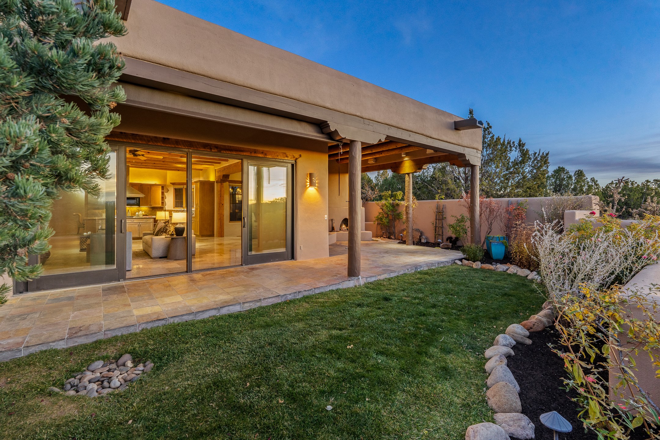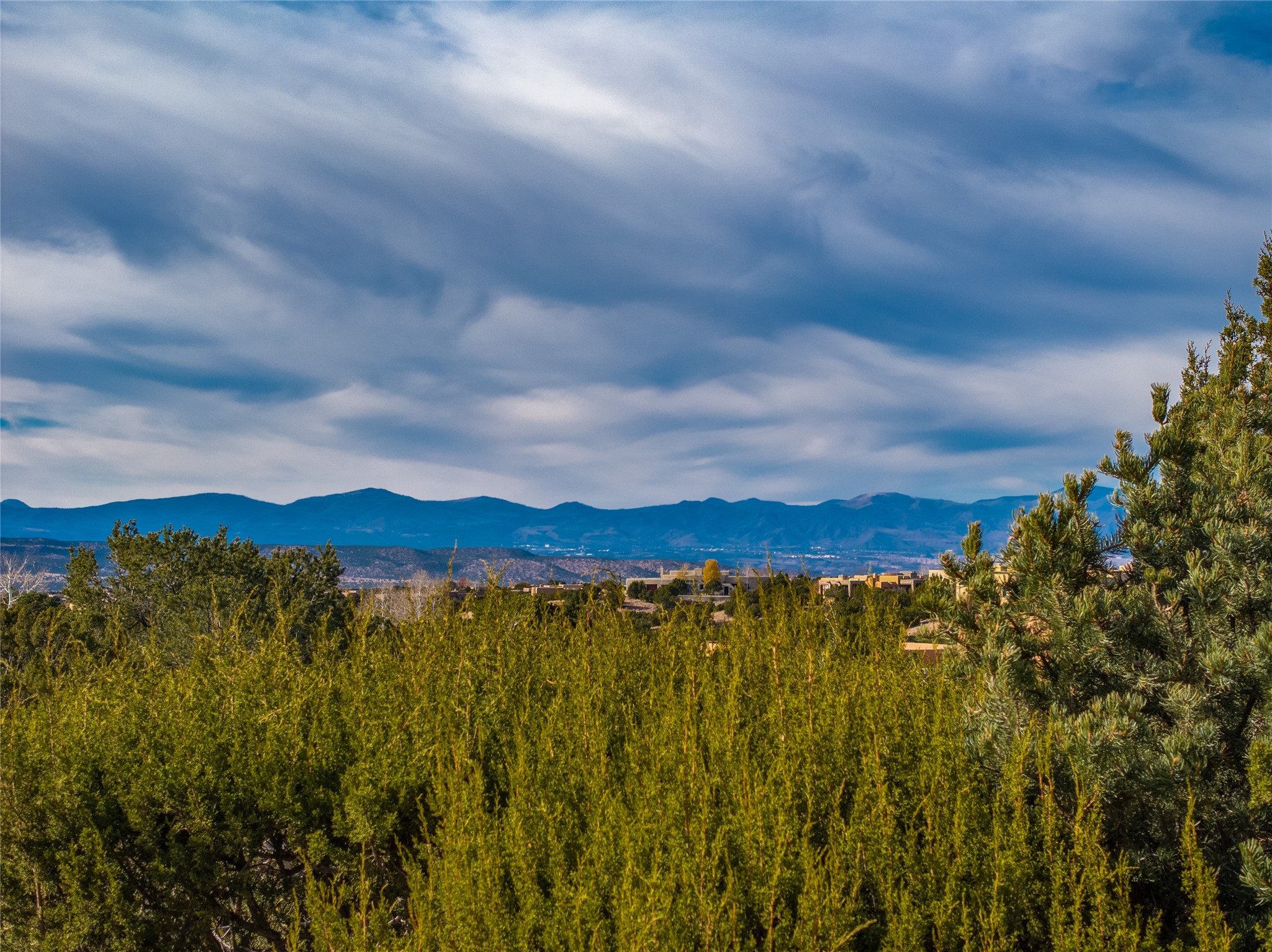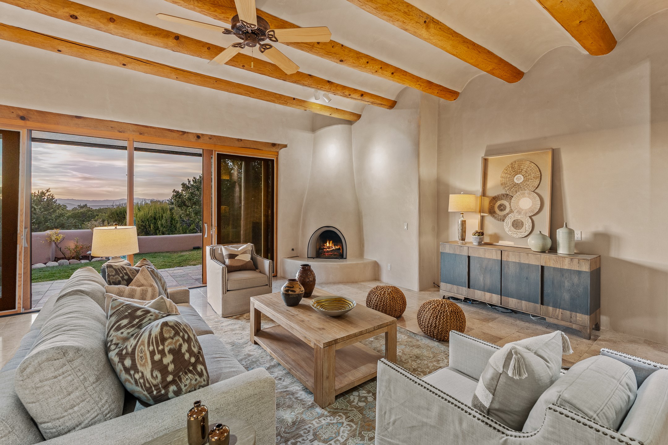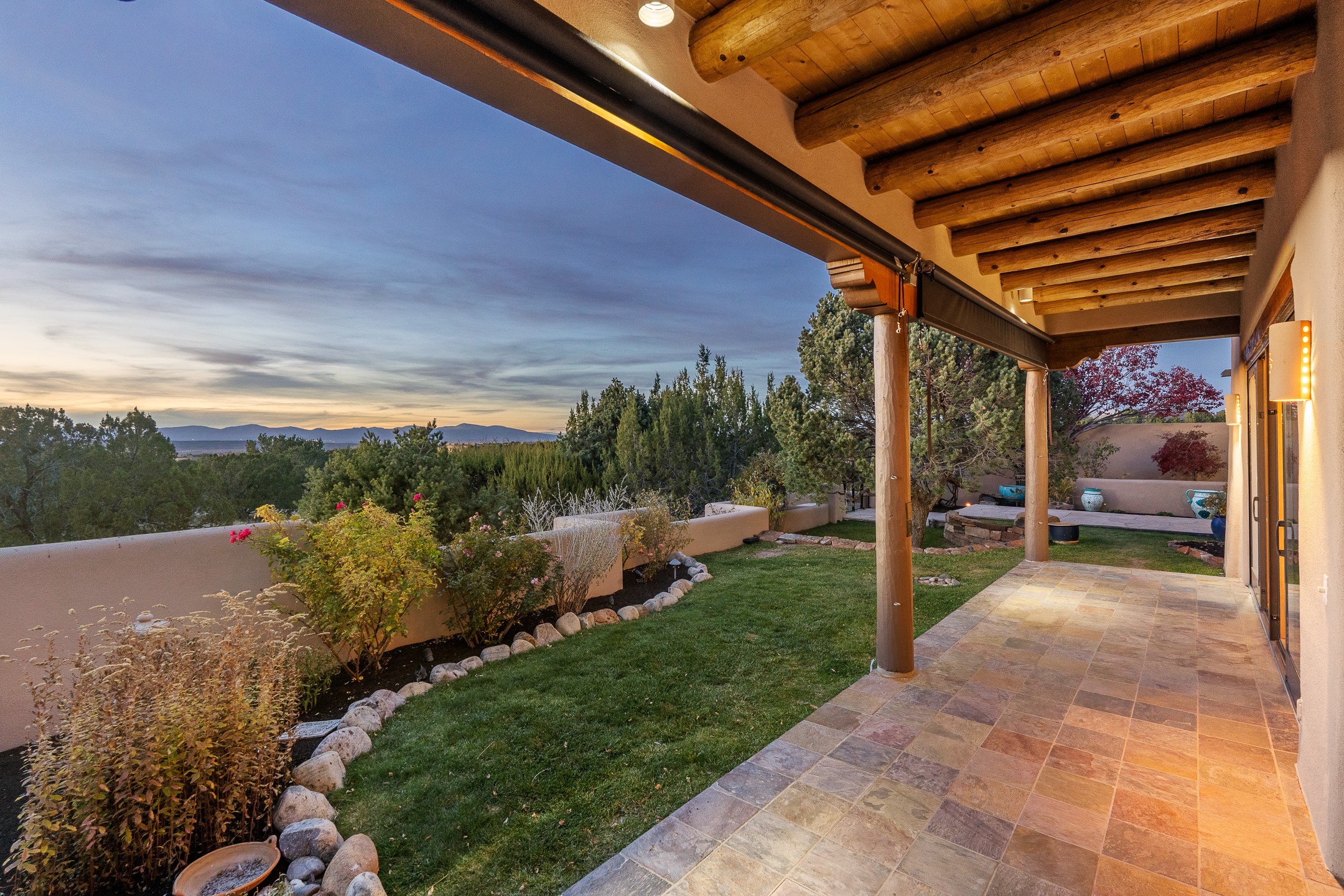Remarkable and spacious Pueblo Style Home perfectly situated on a premium 3.51 acre +/- lot at the end of a cul-de-sac showcasing panoramic massive Sangre de Cristo and Jemez Mountain views and enclosed gardens! This bright, sun-lit home has an outstanding floor plan with a separated guest wing, large family room off the kitchen, lovely covered outdoor portals with fireplaces, an oversized massive primary suite, and an impressive entry foyer that flows into an expansive great room, perfect for entertaining, and three guest rooms with ensuite bathrooms. The home features a finished garage with A/C/heating split and new garage doors, new outdoor automatic sunshades, new Subzero refrigerator/freezer and Bosch dishwasher, pull out shelving, new designer closets in primary suite, new LED room and closet lighting throughout the home, and newly replaced exterior woodwork.