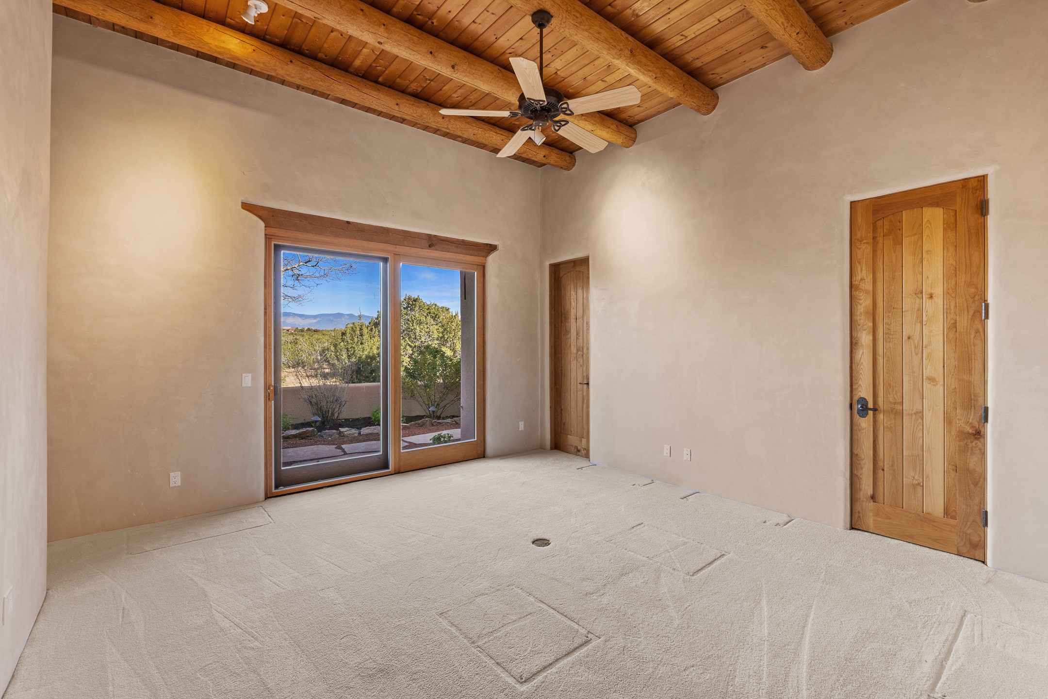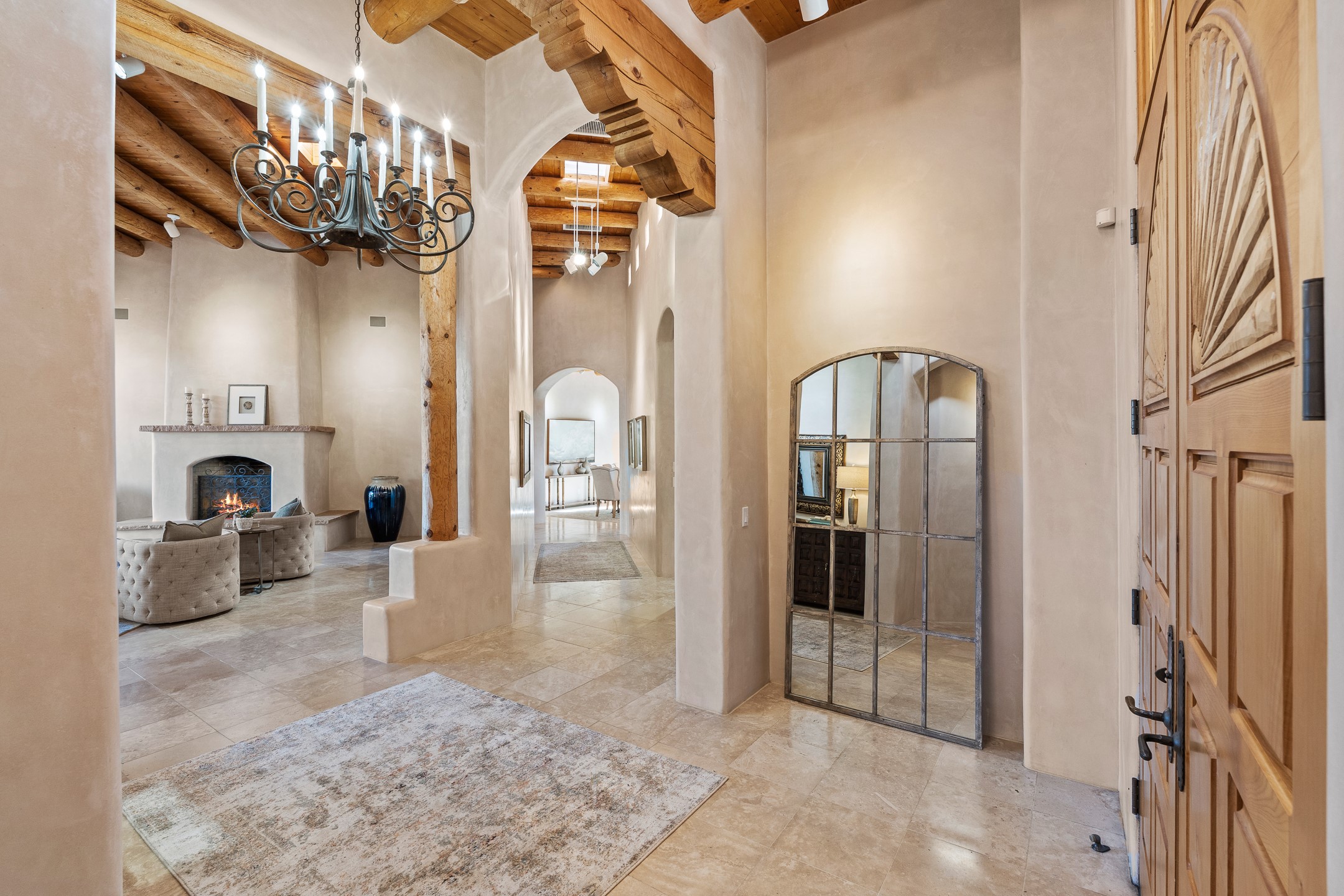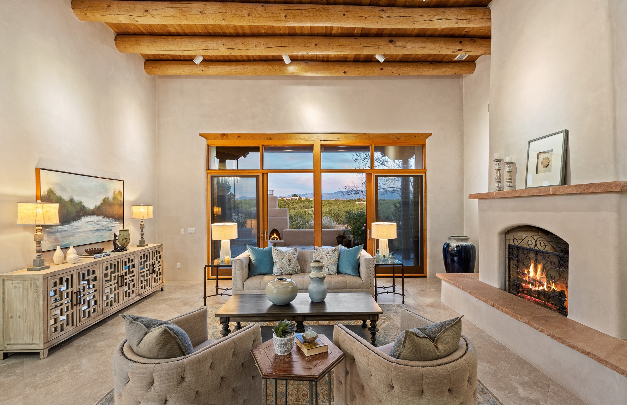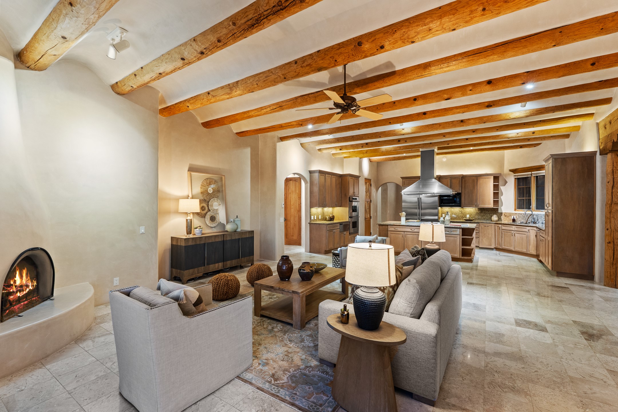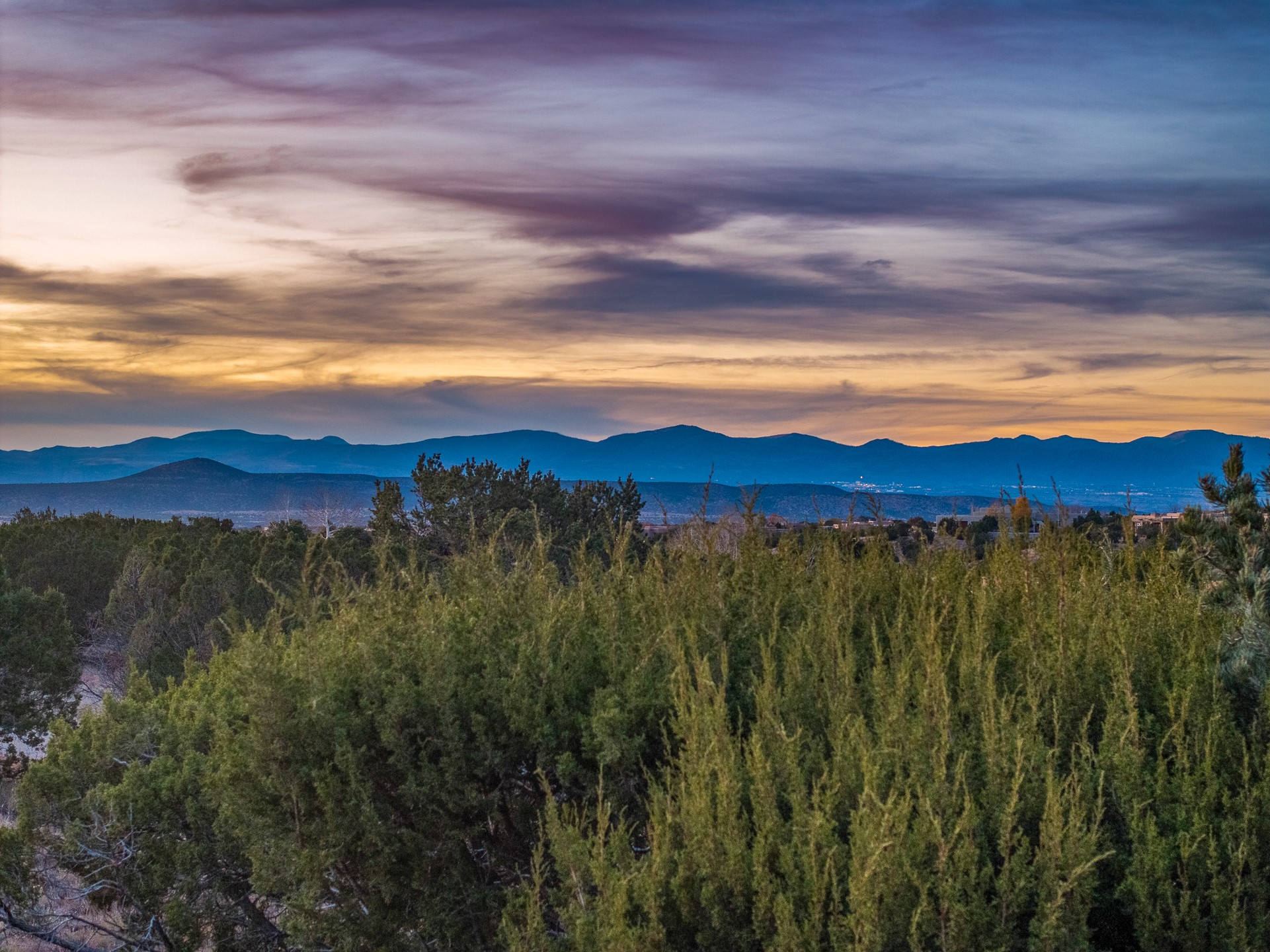 Remarkable and spacious Pueblo Style Home perfectly situated on a premium 3.51 acre +/- lot at the end of a cul-de-sac showcasing panoramic massive Sangre de Cristo and Jemez Mountain views and enclosed gardens! This bright, sun-lit home has an outstanding floor plan with a separated guest wing, large family room off the kitchen, lovely covered outdoor portals with fireplaces, an oversized massive primary suite, and an impressive entry foyer that flows into an expansive great room, perfect for entertaining, and three guest rooms with ensuite bathrooms. The home features a finished garage with A/C/heating split and new garage doors, new outdoor automatic sunshades, new Subzero refrigerator/freezer and Bosch dishwasher, pull out shelving, new designer closets in primary suite, new LED room and closet lighting throughout the home, and newly replaced exterior woodwork.