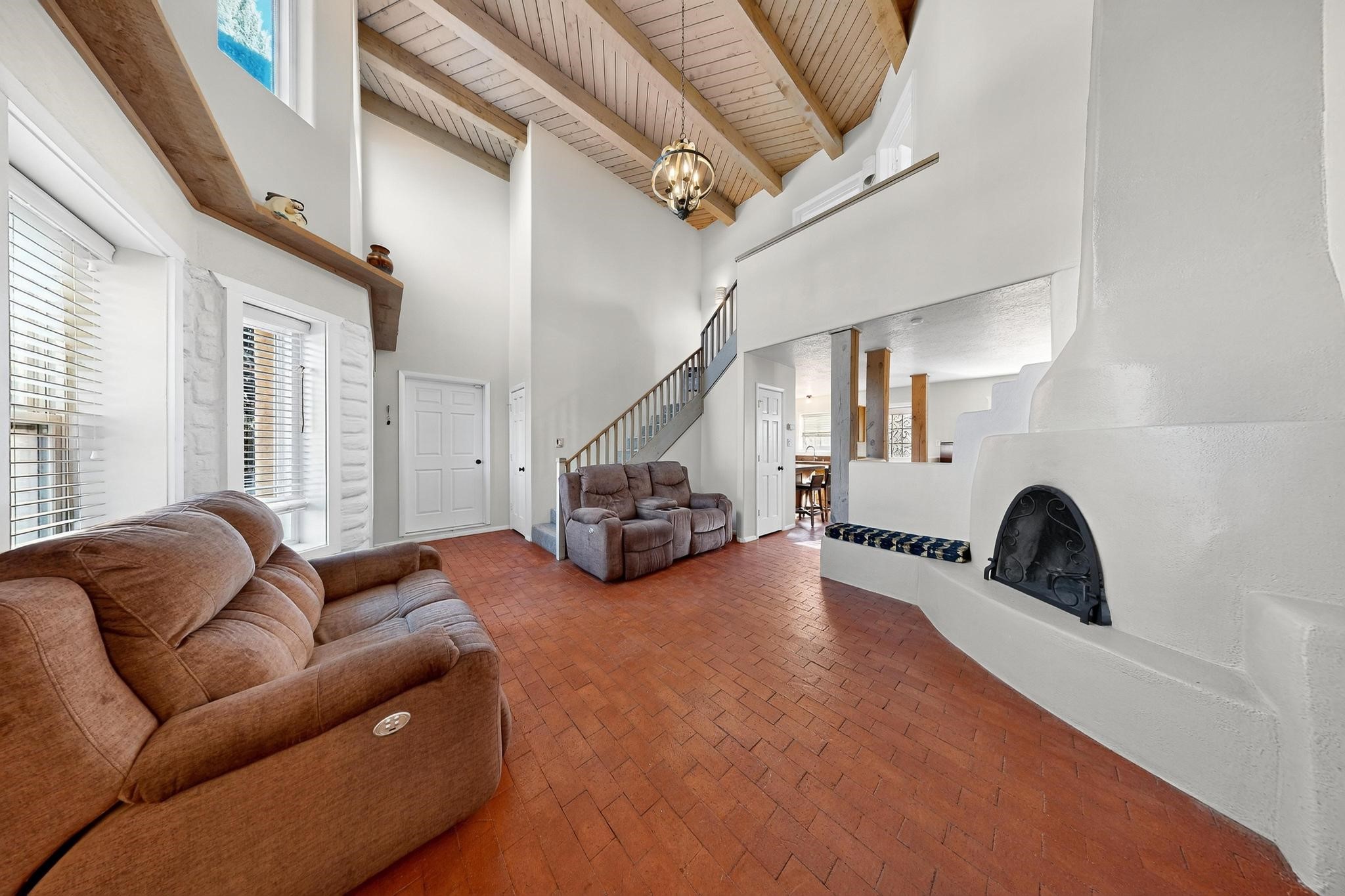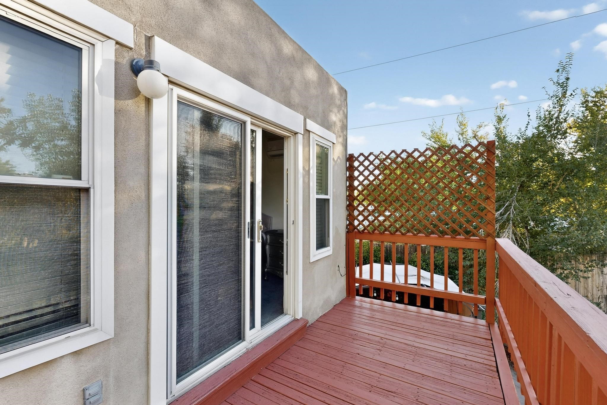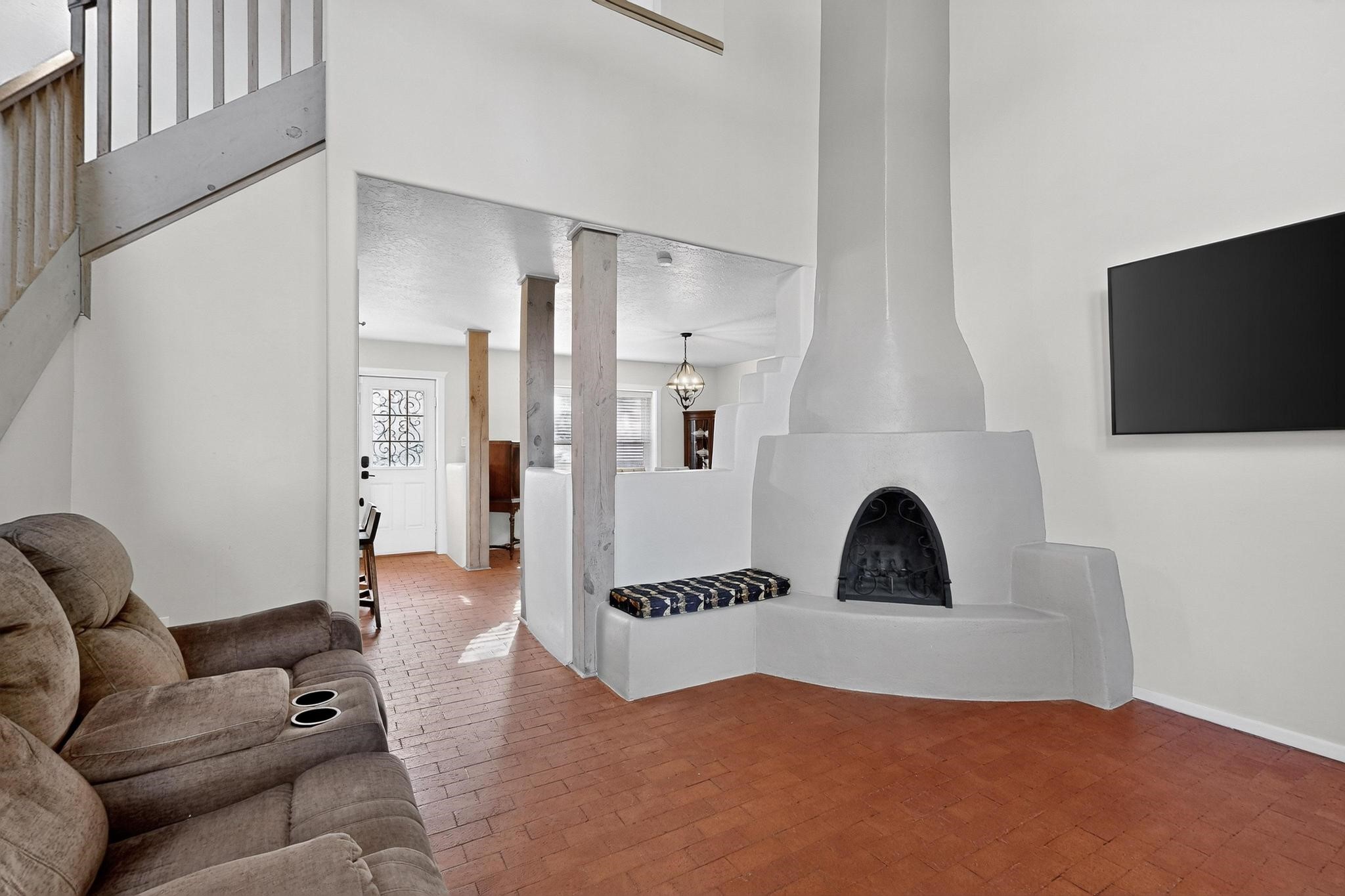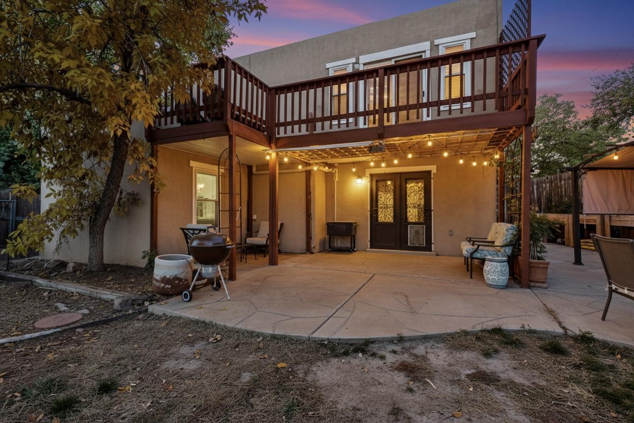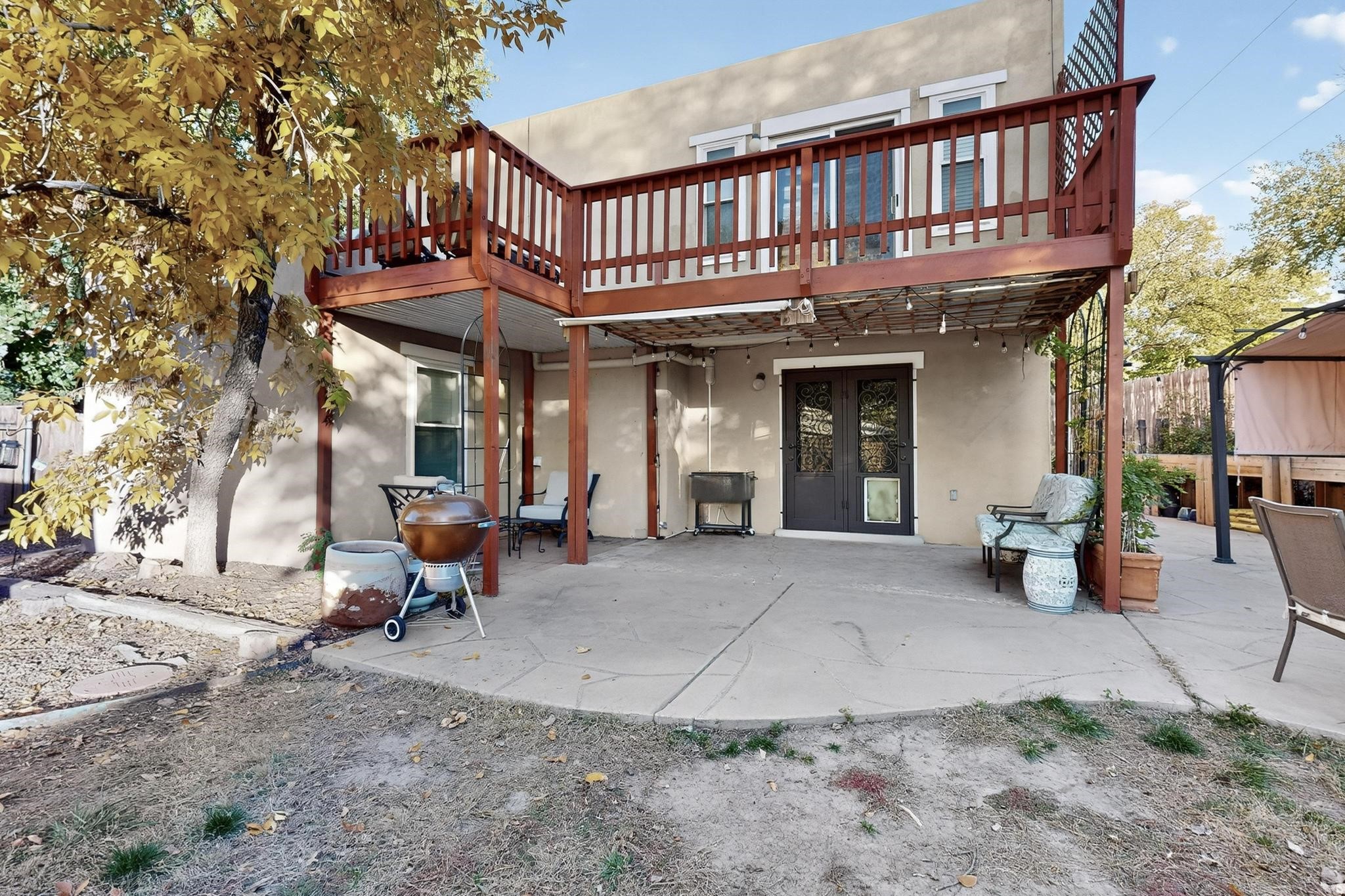 Excellent location with easy access to Old Town, the Bosque Trail, and other Rio Grande/Downtown attractions. No HOA! Charming Southwestern-style adobe & frame home w/ high wood-beam ceilings, clerestory windows, refrigerated air and kiva fireplace. Two bedrooms on the main level plus a large owner's suite with balcony and office/possible 4th bedroom upstairs. Brick floors w/ radiant heat, granite countertops and stainless appliances. Carpet to be replaced after move out, or credit to be used toward other flooring of buyer's choice. Whole house water treatment system. Sunny kitchen opens to dining and patio. Finished, heated/cooled garage. Large fenced -acre yard--minutes to dining, shopping, El Vado, and the Bio Park / Botanical Gardens. Fantastic Short Term Rental possibility!
