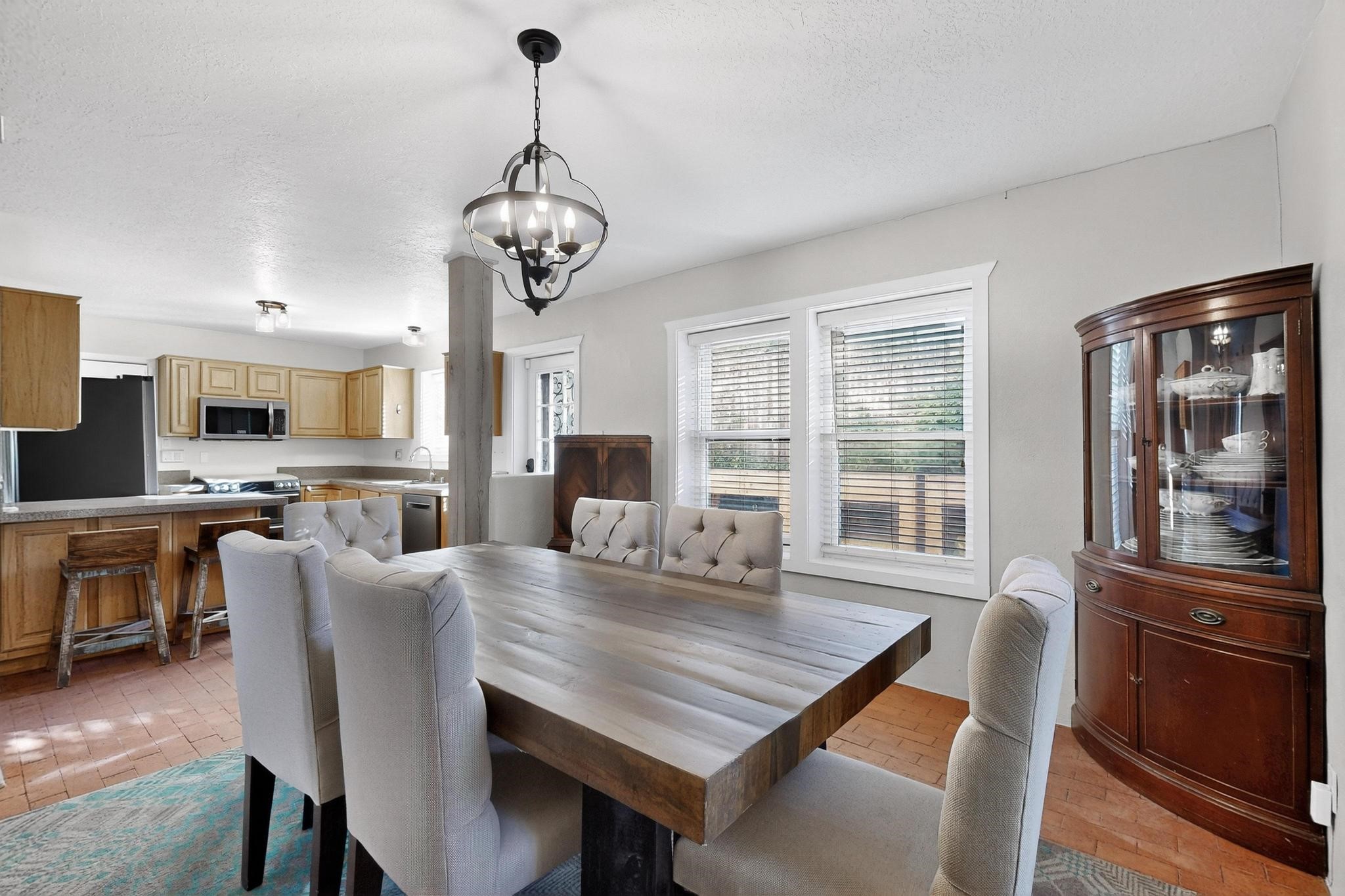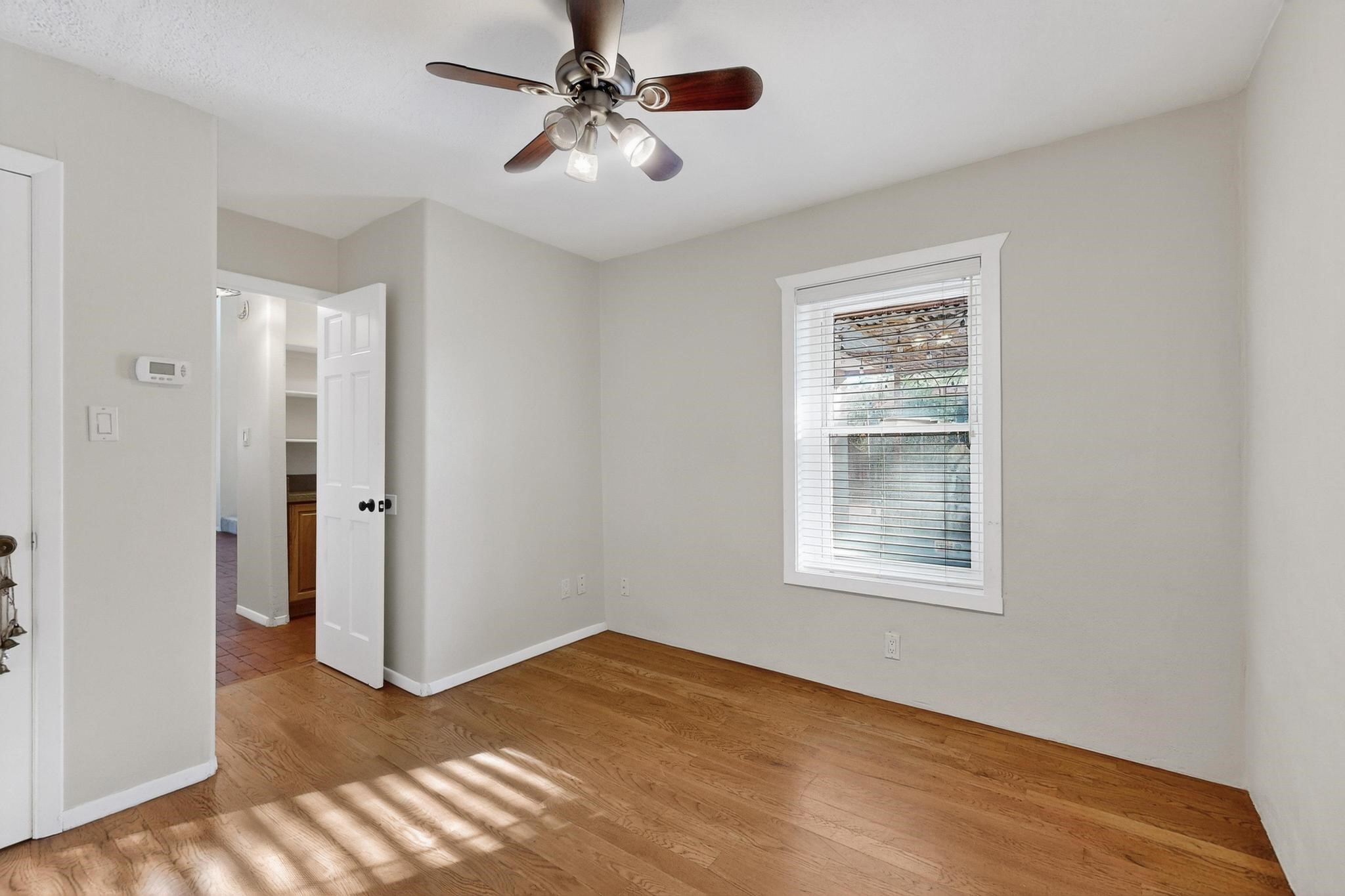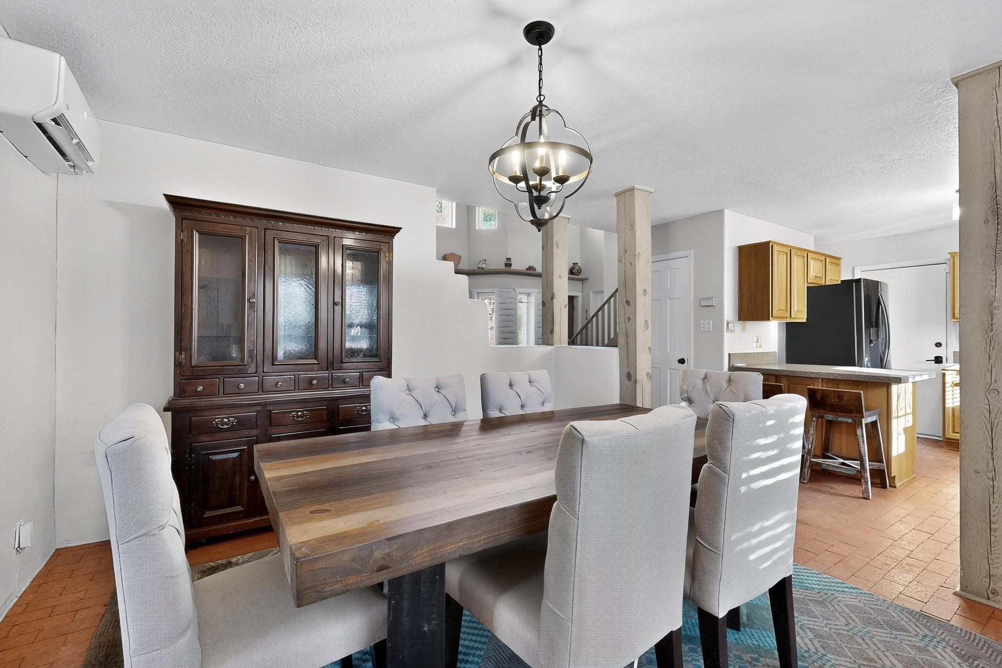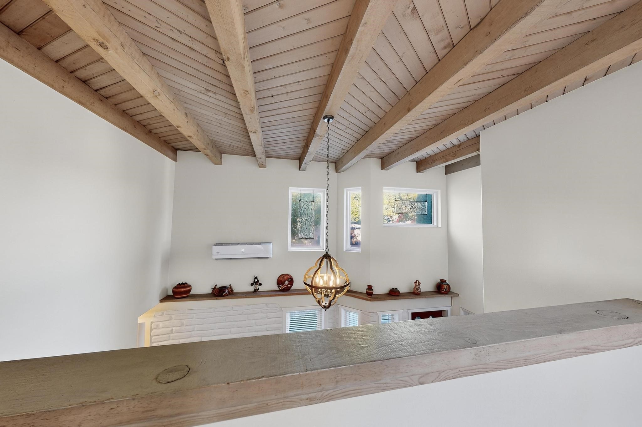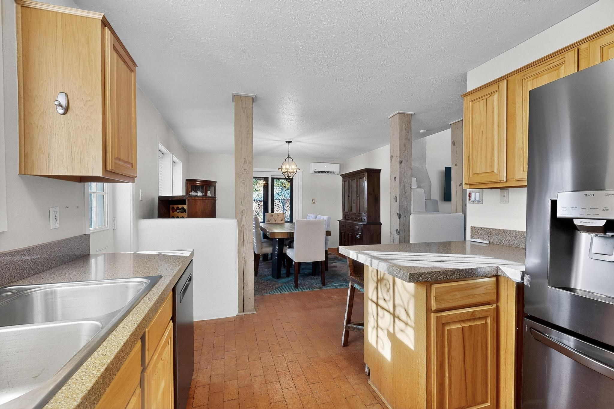 Excellent location with easy access to Old Town, the Bosque Trail, and other Rio Grande/Downtown attractions. No HOA! Charming Southwestern-style adobe & frame home w/ high wood-beam ceilings, clerestory windows, refrigerated air and kiva fireplace. Two bedrooms on the main level plus a large owner's suite with balcony and office/possible 4th bedroom upstairs. Brick floors w/ radiant heat, granite countertops and stainless appliances. Carpet to be replaced after move out, or credit to be used toward other flooring of buyer's choice. Whole house water treatment system. Sunny kitchen opens to dining and patio. Finished, heated/cooled garage. Large fenced -acre yard--minutes to dining, shopping, El Vado, and the Bio Park / Botanical Gardens. Fantastic Short Term Rental possibility!