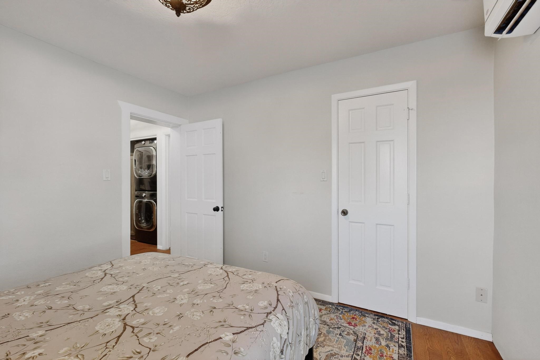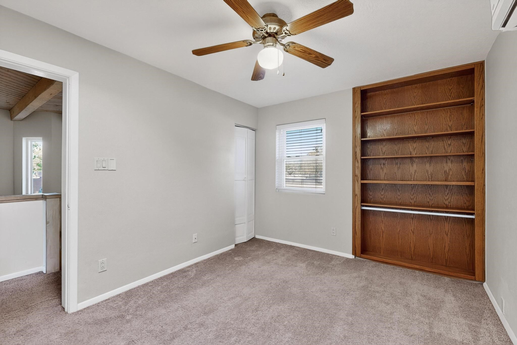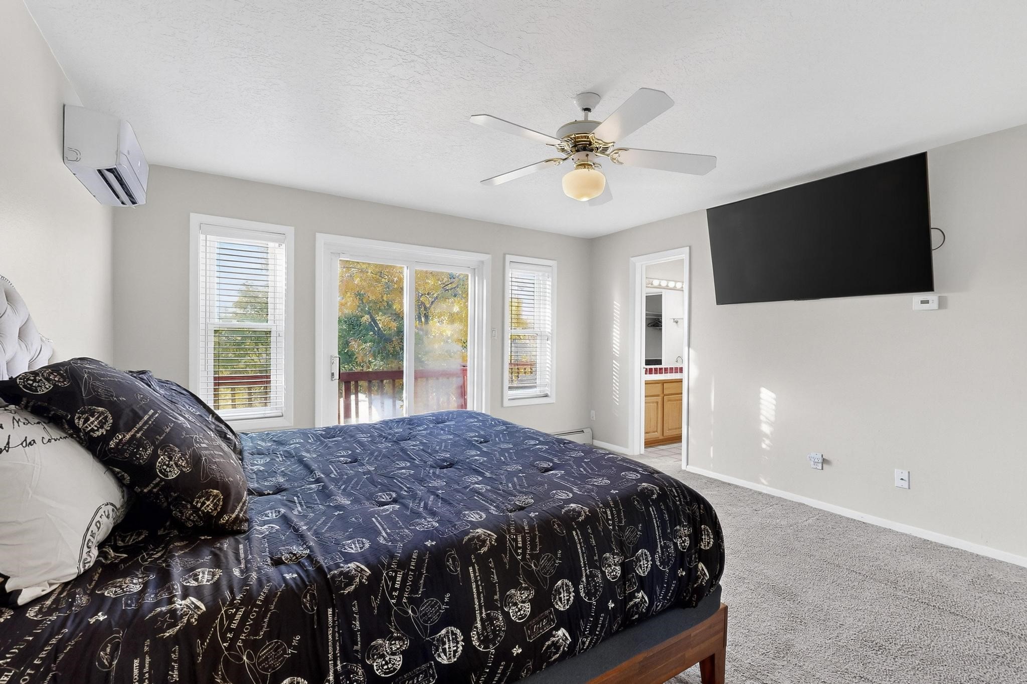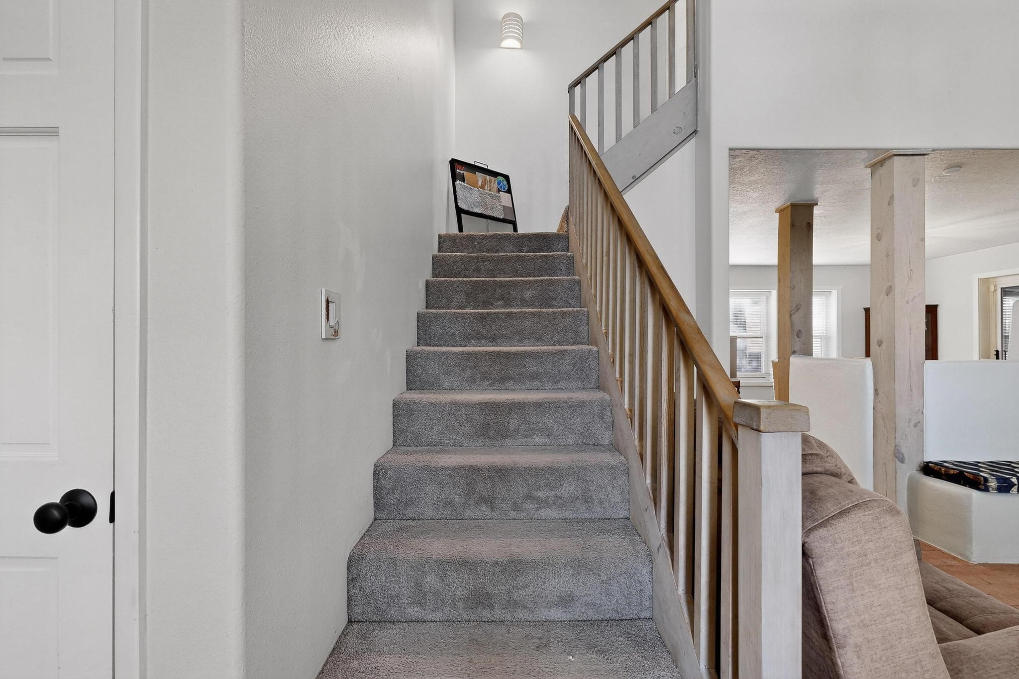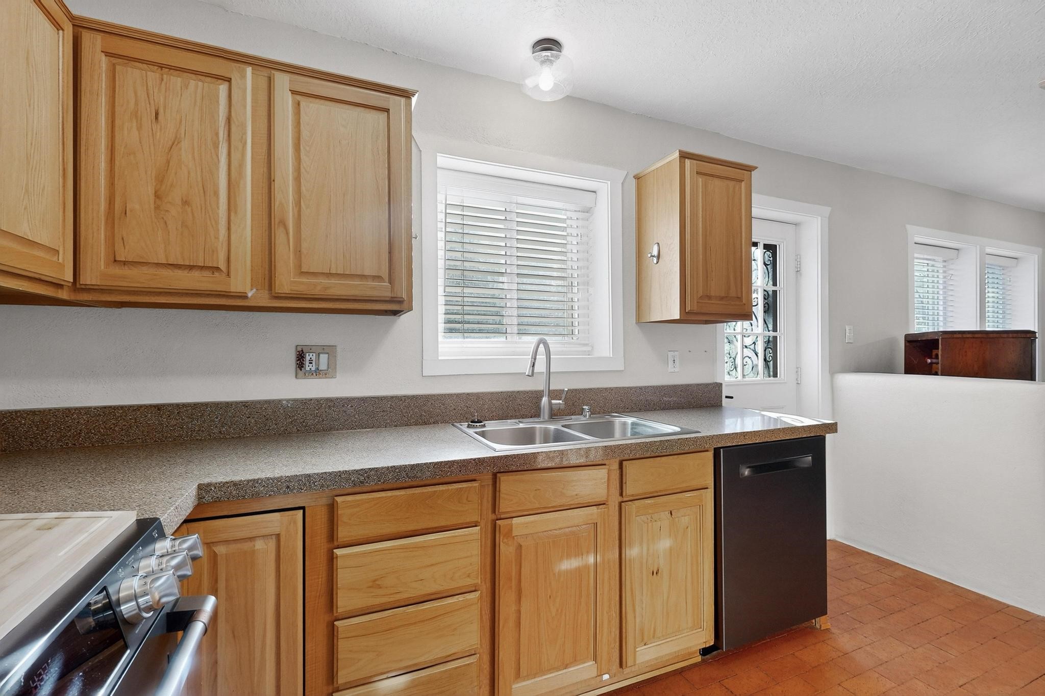 Excellent location with easy access to Old Town, the Bosque Trail, and other Rio Grande/Downtown attractions. No HOA! Charming Southwestern-style adobe & frame home w/ high wood-beam ceilings, clerestory windows, refrigerated air and kiva fireplace. Two bedrooms on the main level plus a large owner's suite with balcony and office/possible 4th bedroom upstairs. Brick floors w/ radiant heat, granite countertops and stainless appliances. Carpet to be replaced after move out, or credit to be used toward other flooring of buyer's choice. Whole house water treatment system. Sunny kitchen opens to dining and patio. Finished, heated/cooled garage. Large fenced -acre yard--minutes to dining, shopping, El Vado, and the Bio Park / Botanical Gardens. Fantastic Short Term Rental possibility!