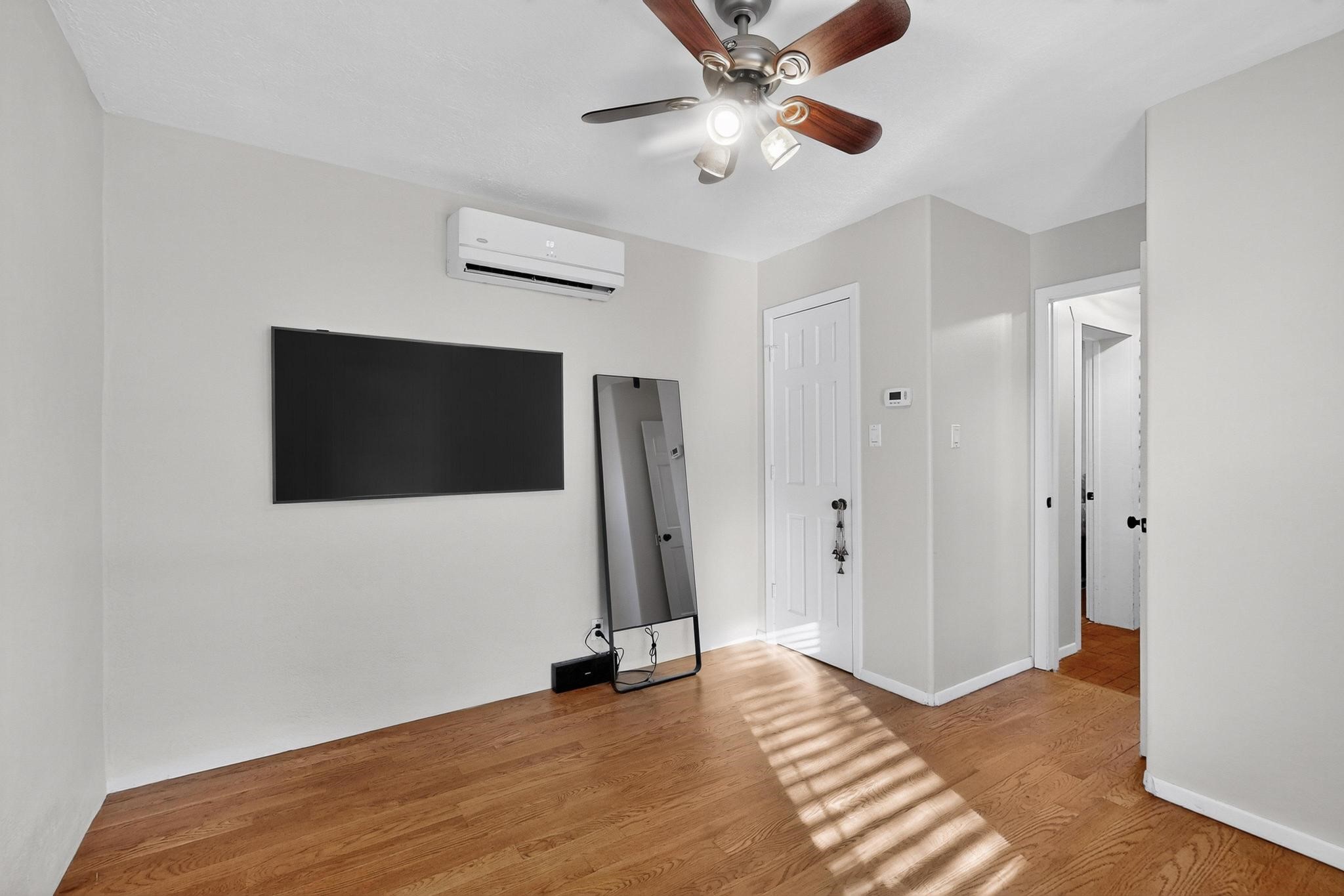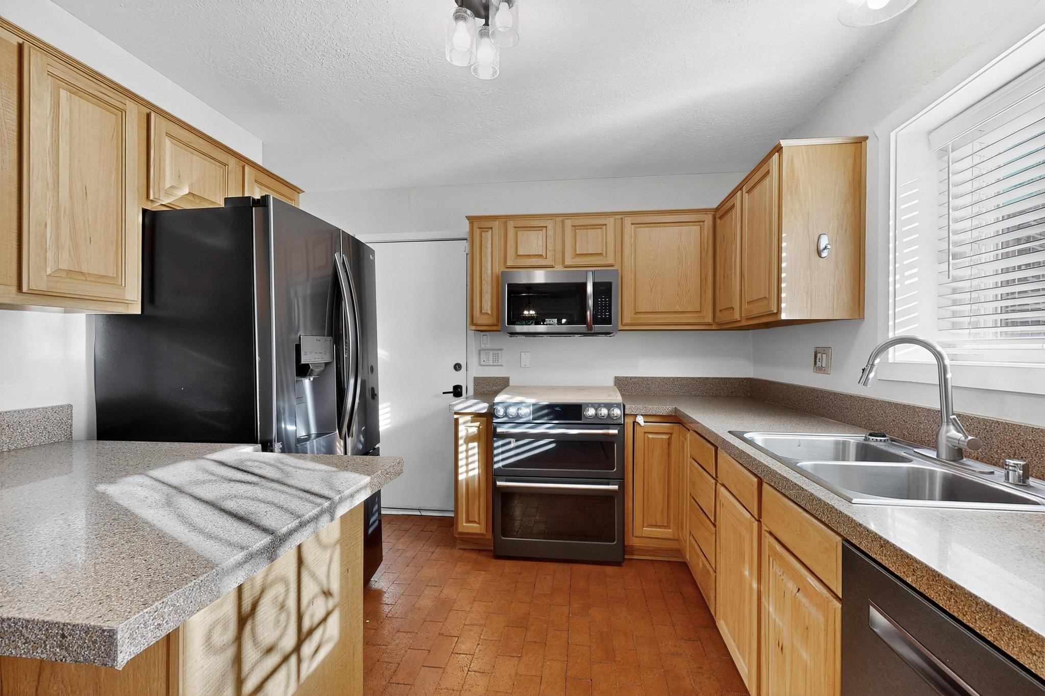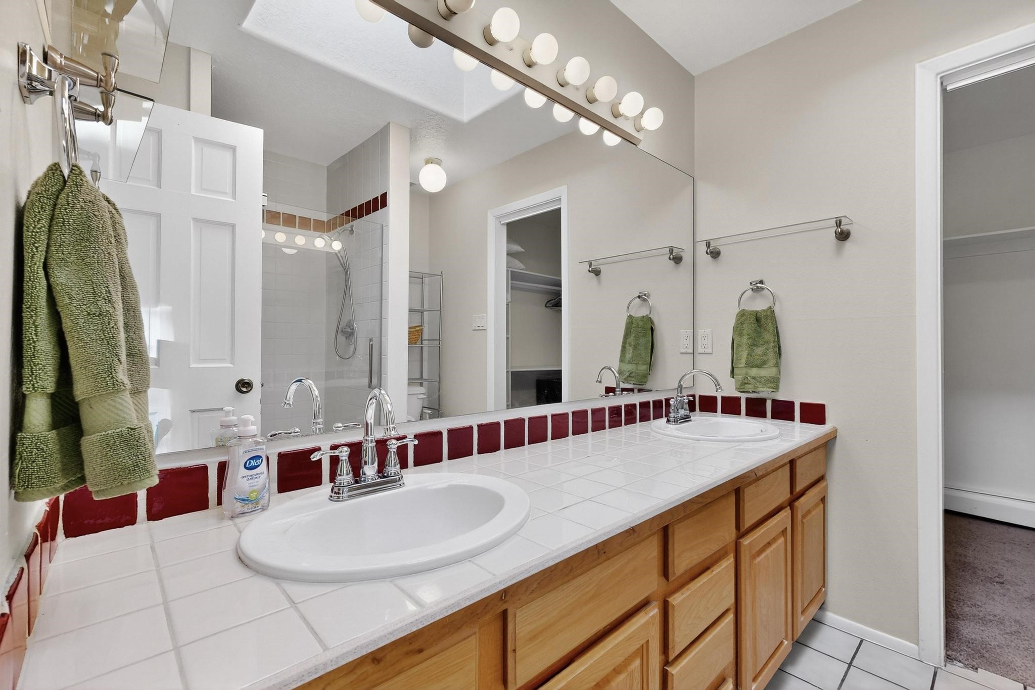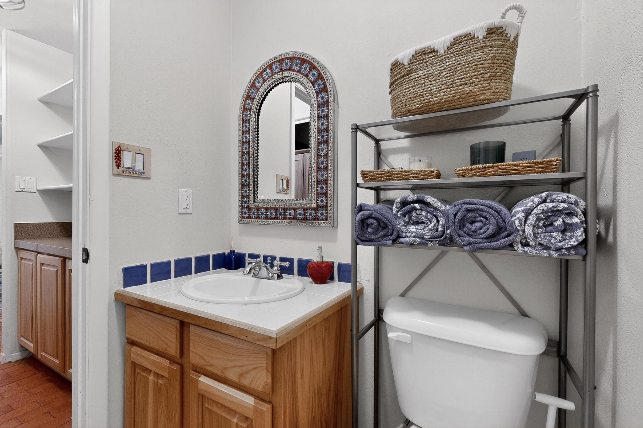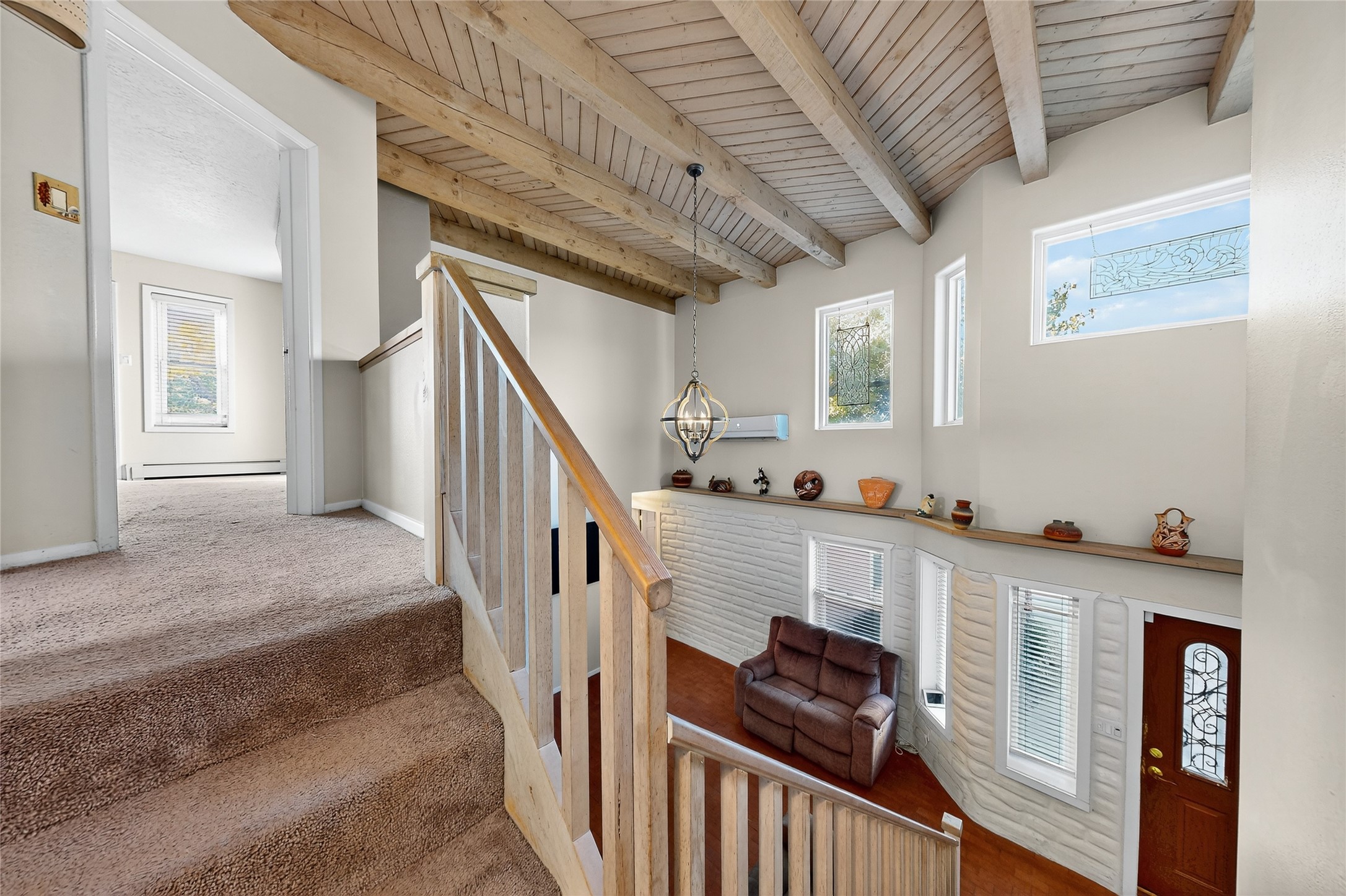 Excellent location with easy access to Old Town, the Bosque Trail, and other Rio Grande/Downtown attractions. No HOA! Charming Southwestern-style adobe & frame home w/ high wood-beam ceilings, clerestory windows, refrigerated air and kiva fireplace. Two bedrooms on the main level plus a large owner's suite with balcony and office/possible 4th bedroom upstairs. Brick floors w/ radiant heat, granite countertops and stainless appliances. Carpet to be replaced after move out, or credit to be used toward other flooring of buyer's choice. Whole house water treatment system. Sunny kitchen opens to dining and patio. Finished, heated/cooled garage. Large fenced -acre yard--minutes to dining, shopping, El Vado, and the Bio Park / Botanical Gardens. Fantastic Short Term Rental possibility!
