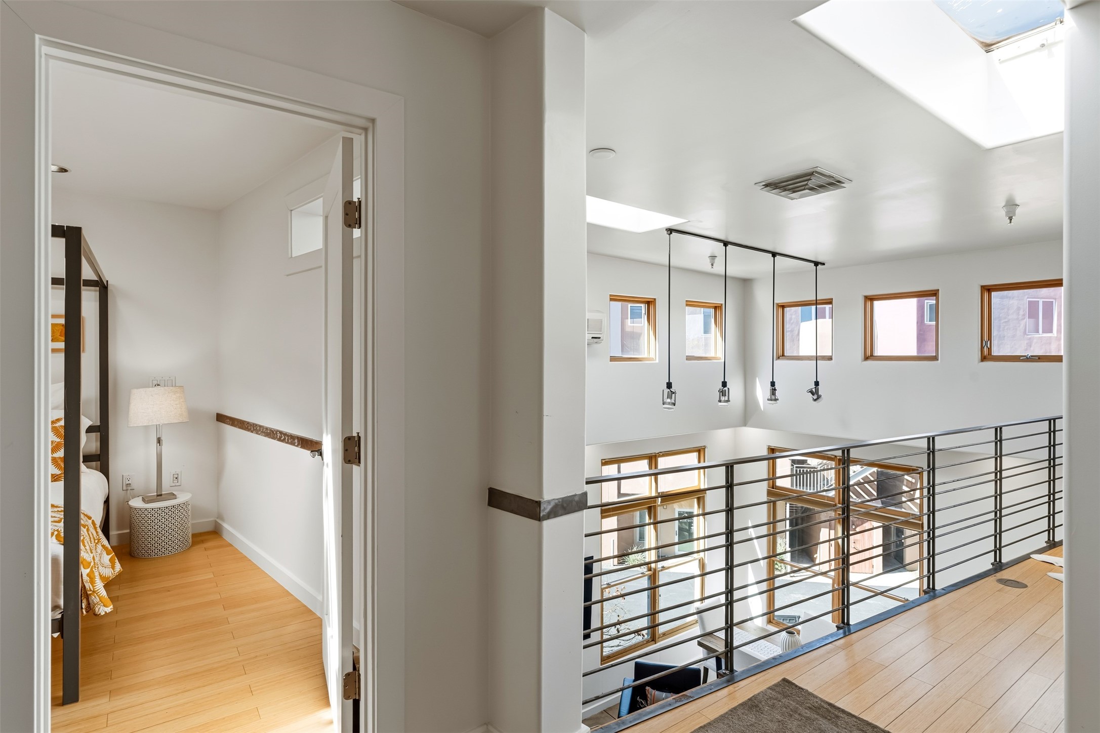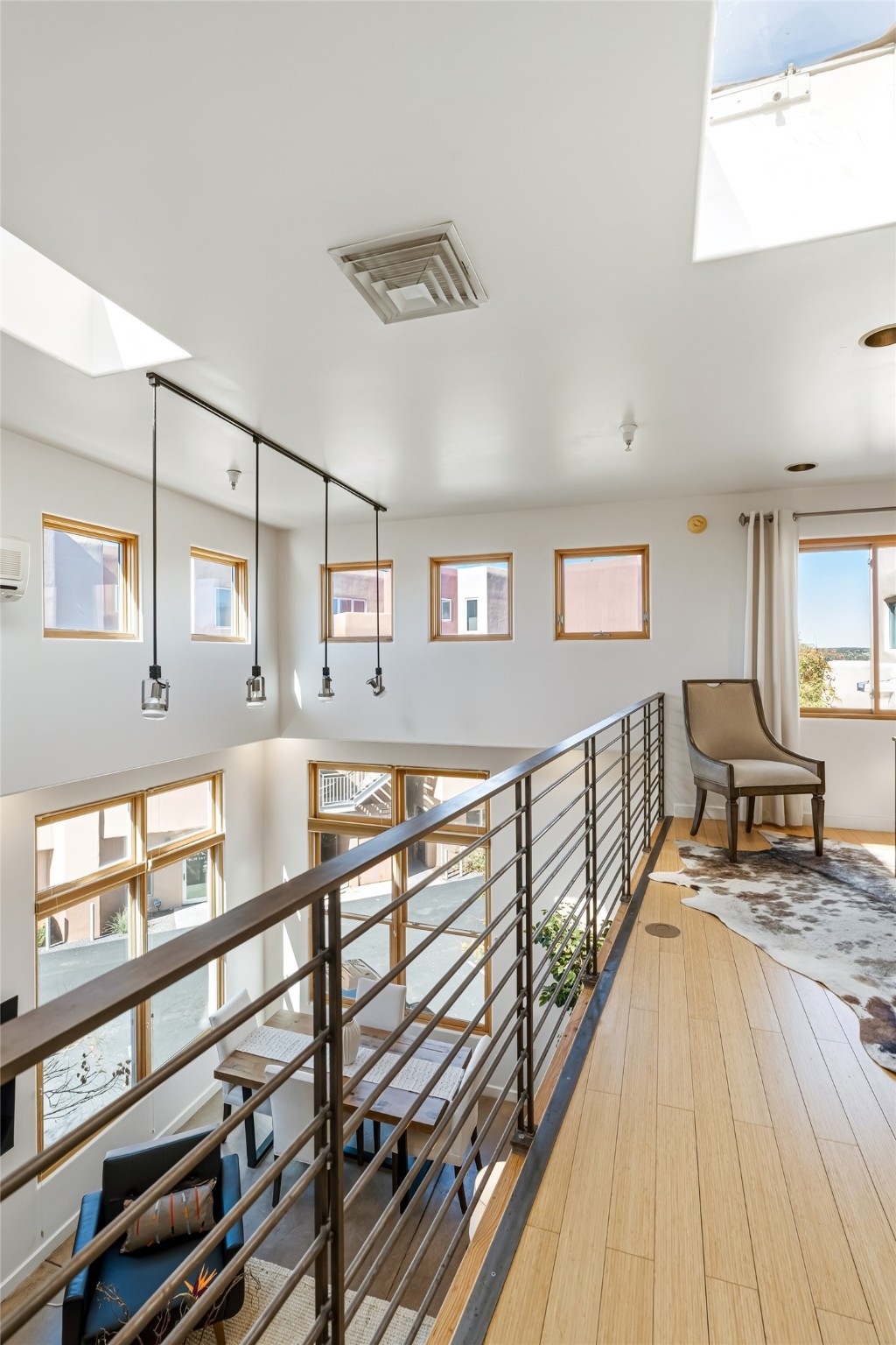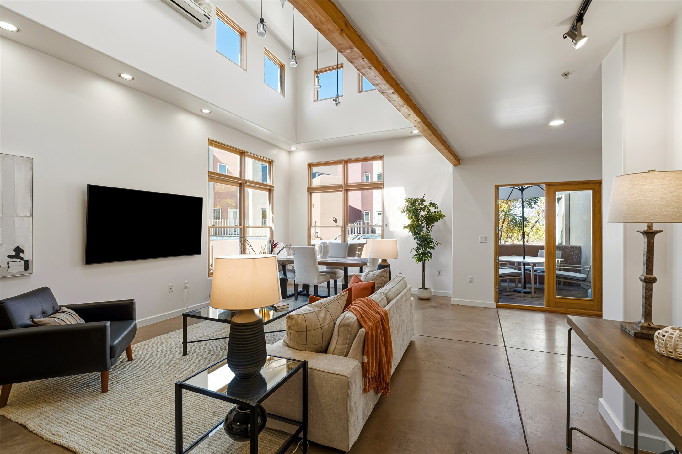 CONTEMPORARY LOFT - Modern live/work 1,400 sq. ft in Marquez Place1 BR -enclosed + 1 work space loft -open with high ceilings, great natural light. Features include Maple cabinets, Stainless kitchen appliances with marble counters and a 7' island, concrete and bamboo floors. 2nd Floor balcony with southwest views. Radiant heat (new furnace), Mini-split A/C, skylights, and efficient windows. HOA covers exterior and roof; landscaped grounds include a dog park. Prime central location near Plaza, shops, galleries and restaurants.