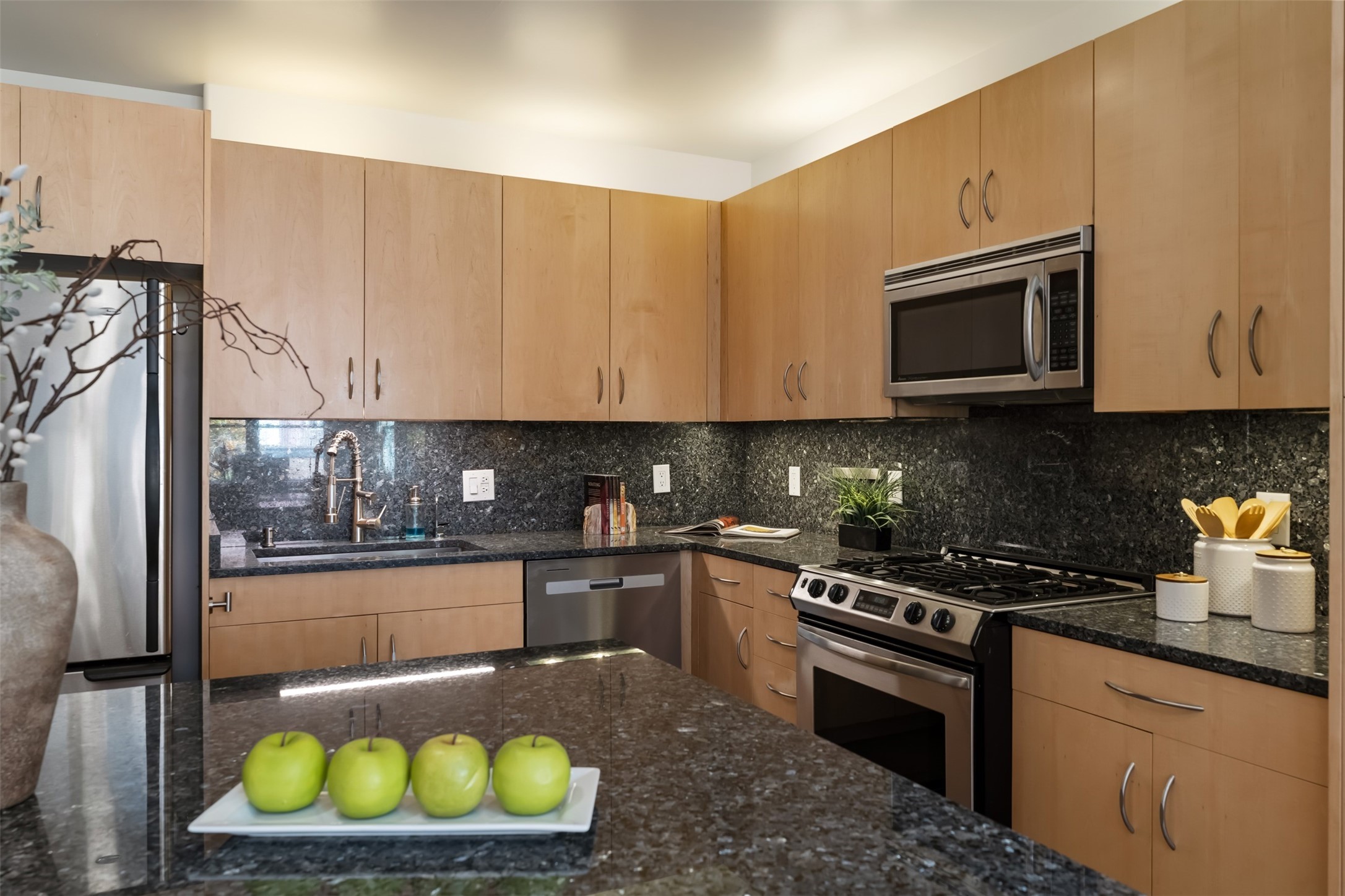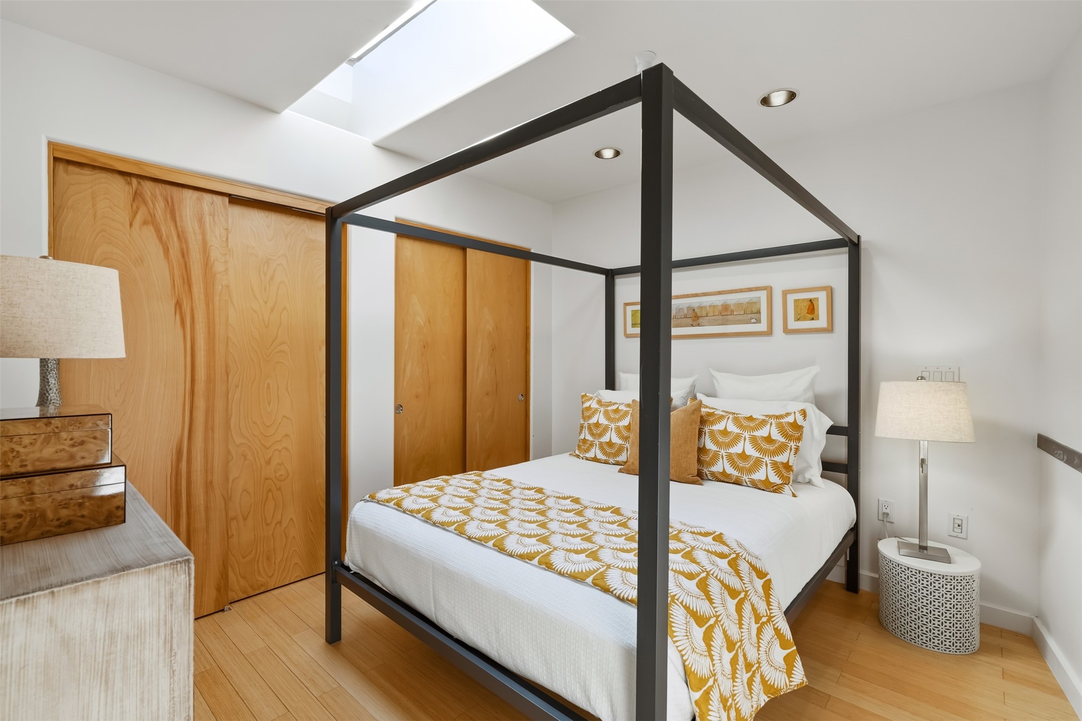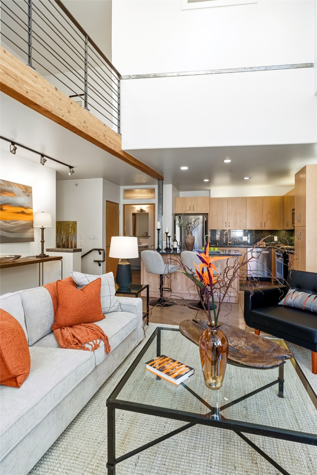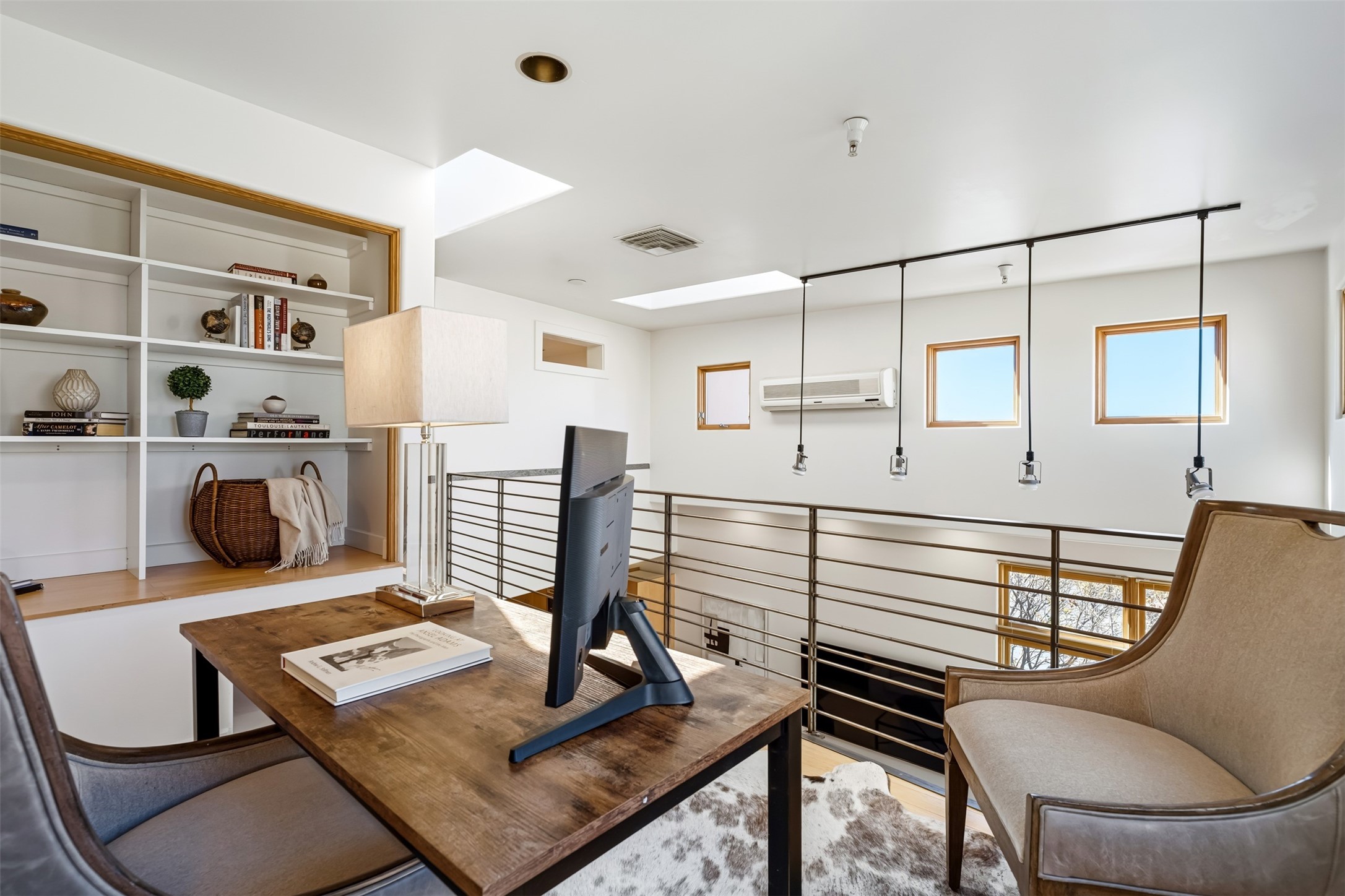CONTEMPORARY LOFT - Modern live/work 1,400 sq. ft in Marquez Place1 BR -enclosed + 1 work space loft -open with high ceilings, great natural light. Features include Maple cabinets, Stainless kitchen appliances with marble counters and a 7' island, concrete and bamboo floors. 2nd Floor balcony with southwest views. Radiant heat (new furnace), Mini-split A/C, skylights, and efficient windows. HOA covers exterior and roof; landscaped grounds include a dog park. Prime central location near Plaza, shops, galleries and restaurants.