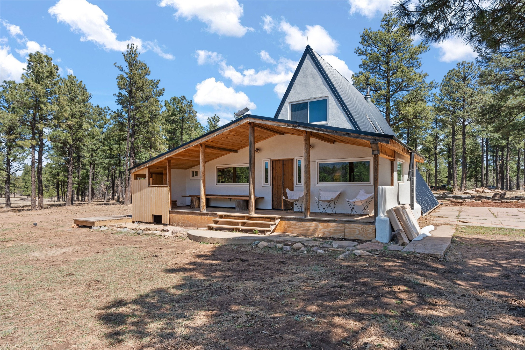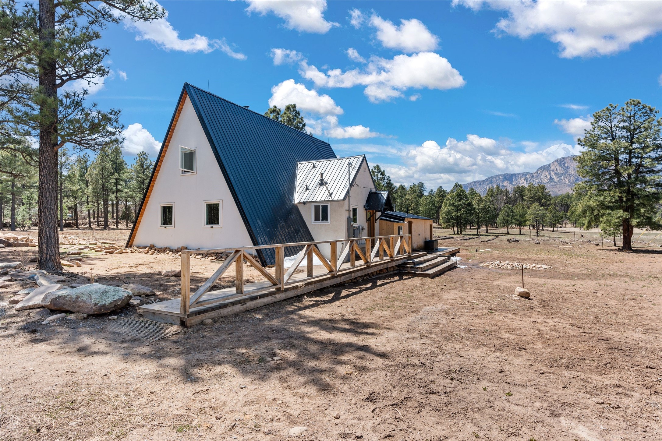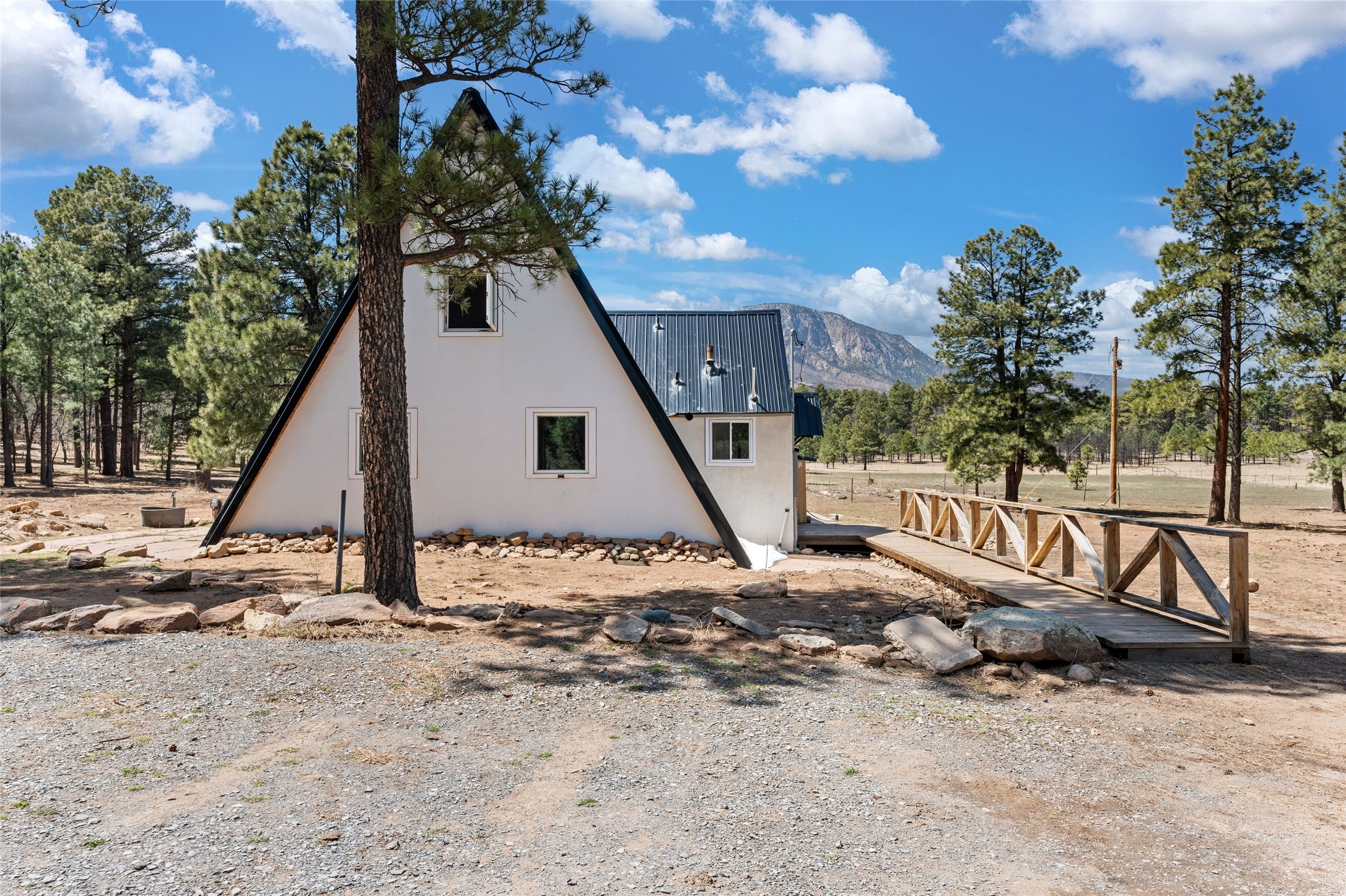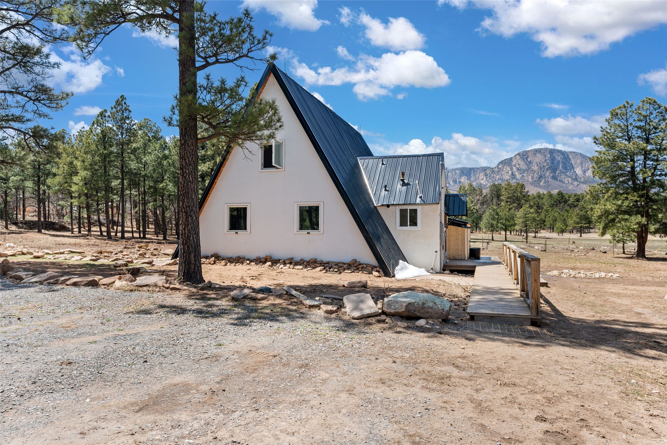 Secluded Mountain Retreat with Modern Upgrades.Behind a gated entrance, this 11.86-acre mountain retreat near Las Vegas, NM, and Storrie Lake offers privacy, sustainability, and stunning views of Hermits Peak. Originally a faminly hunting compound, the beautifully remodeled A-fram home features 3 bedrooms, 1.5 baths, an open-concept living area with a pellet stove, and a kitchen with movable workbench-style counters and an induction cooktop.Upgrades include lifetime warranty windows, a battery-ready 19-panel solar system, new laminte flooring, and enhanced insulation. The fully fenced property is ideal for homesteading or horses, with a hay barn, electric solar horse paddock, and trailer turnarounds. Enjoy two ponds, two wells, a 1/2 acre garden, and compost bins. Outdoor spaces shine with a wrap-around deck, hot shower, and cold plunge pool.Additional features: 500-gallon propane tank, RV hookups, three freezers, two refrigerators, and major fire mitigation. Don't miss this rare blend of mountain seclusion and modern comfort!
