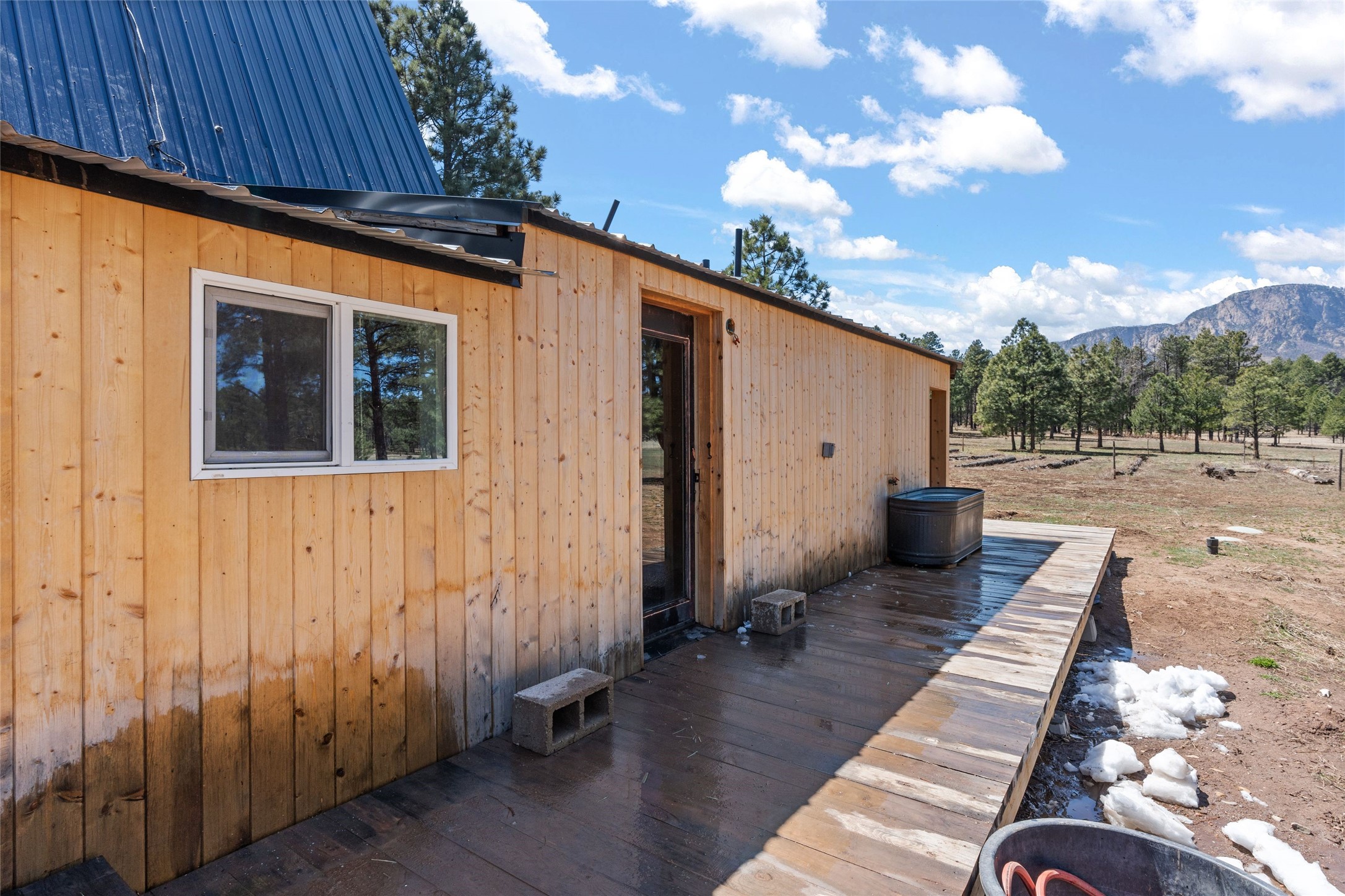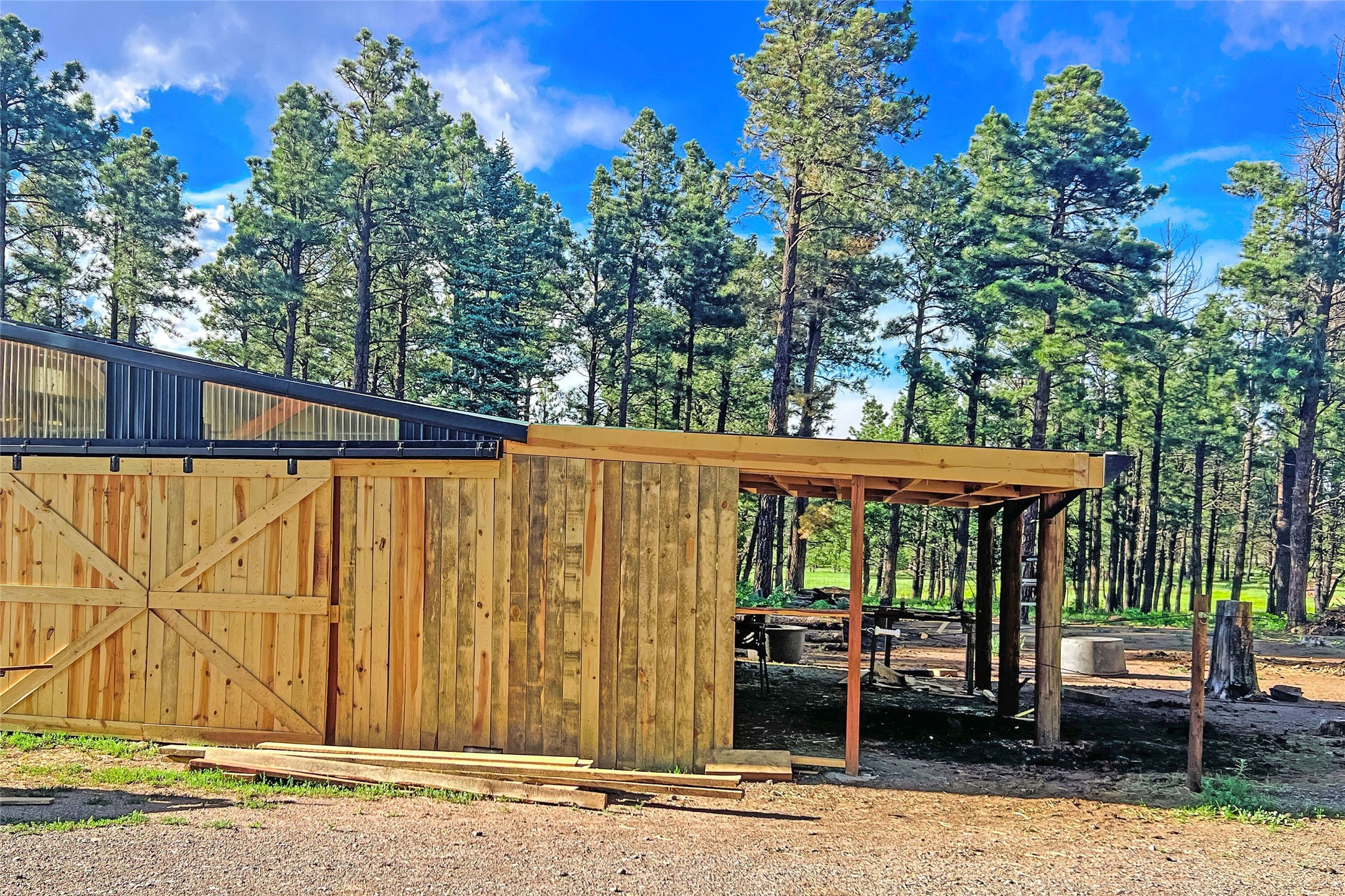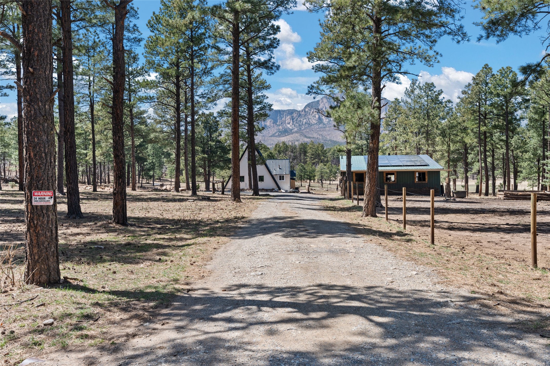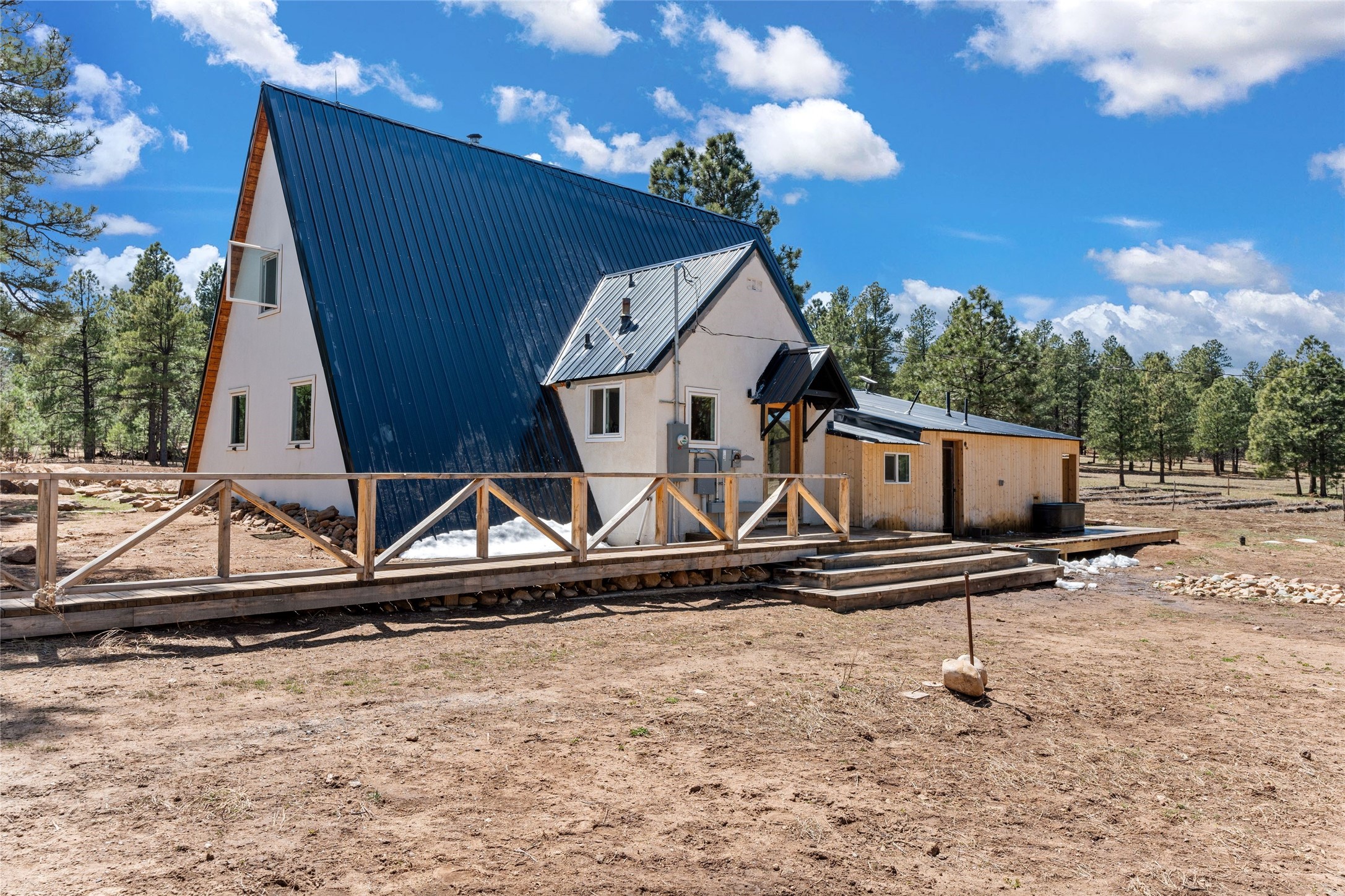 Secluded Mountain Retreat with Modern Upgrades.Behind a gated entrance, this 11.86-acre mountain retreat near Las Vegas, NM, and Storrie Lake offers privacy, sustainability, and stunning views of Hermits Peak. Originally a faminly hunting compound, the beautifully remodeled A-fram home features 3 bedrooms, 1.5 baths, an open-concept living area with a pellet stove, and a kitchen with movable workbench-style counters and an induction cooktop.Upgrades include lifetime warranty windows, a battery-ready 19-panel solar system, new laminte flooring, and enhanced insulation. The fully fenced property is ideal for homesteading or horses, with a hay barn, electric solar horse paddock, and trailer turnarounds. Enjoy two ponds, two wells, a 1/2 acre garden, and compost bins. Outdoor spaces shine with a wrap-around deck, hot shower, and cold plunge pool.Additional features: 500-gallon propane tank, RV hookups, three freezers, two refrigerators, and major fire mitigation. Don't miss this rare blend of mountain seclusion and modern comfort!
