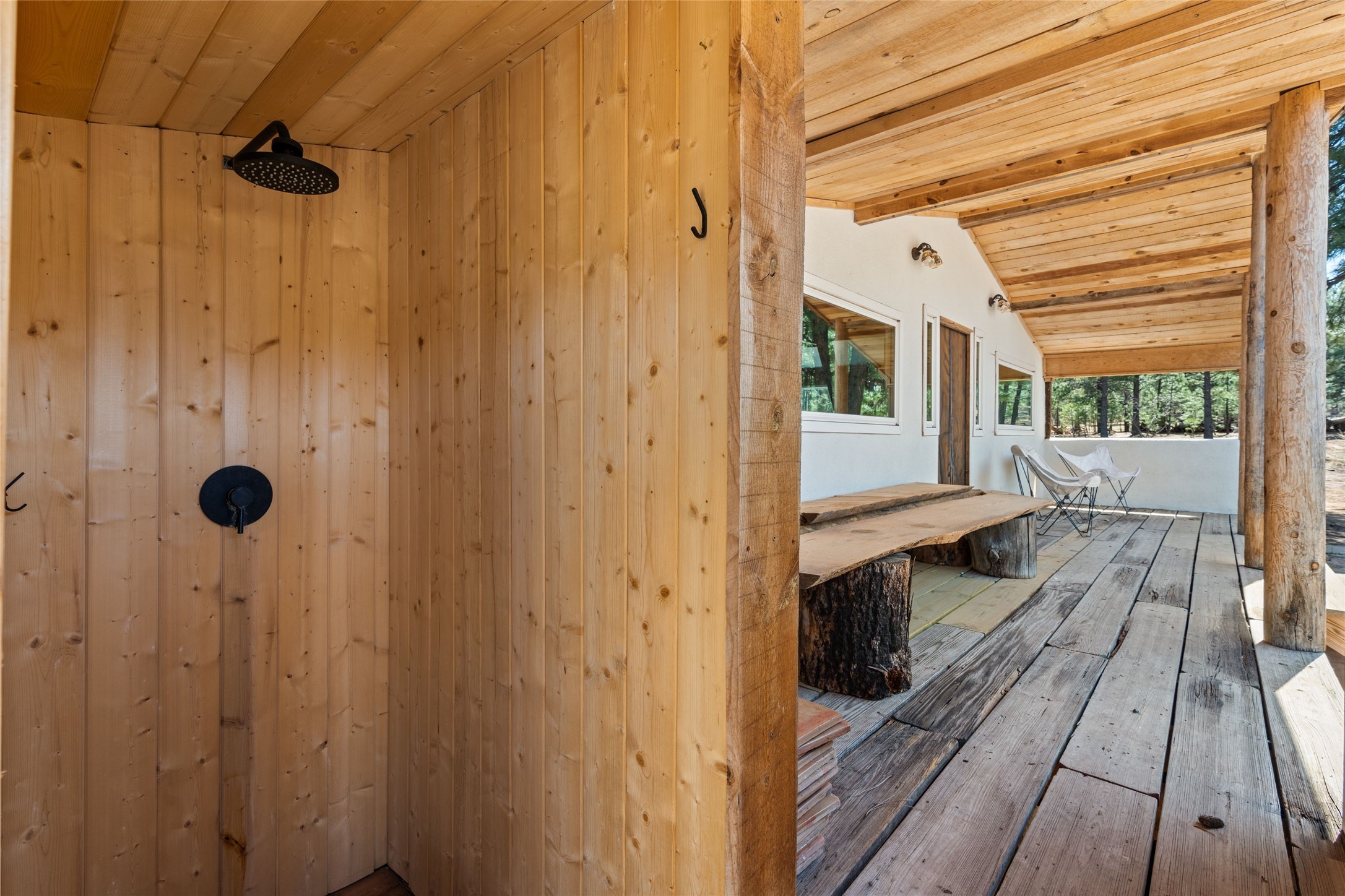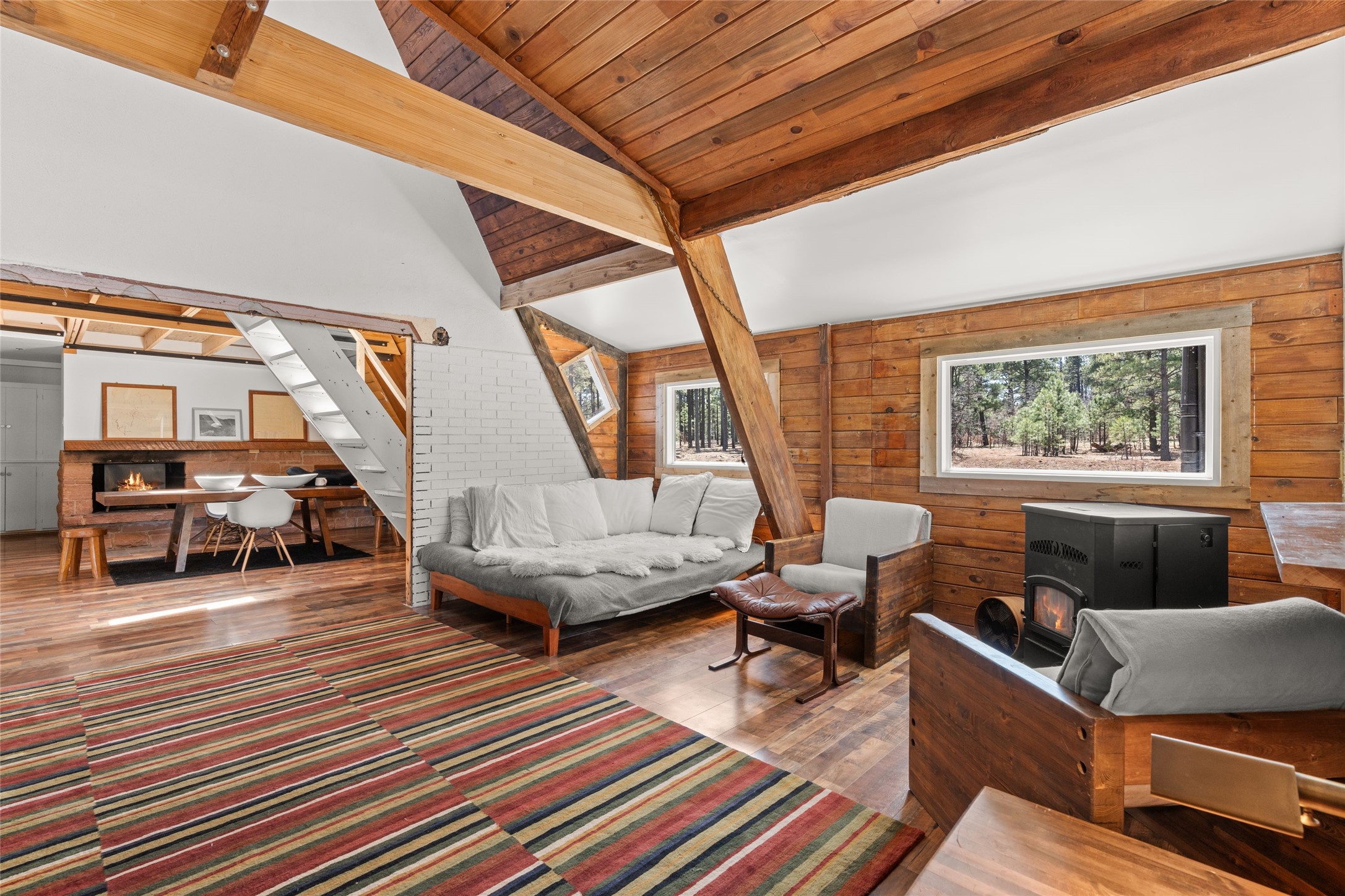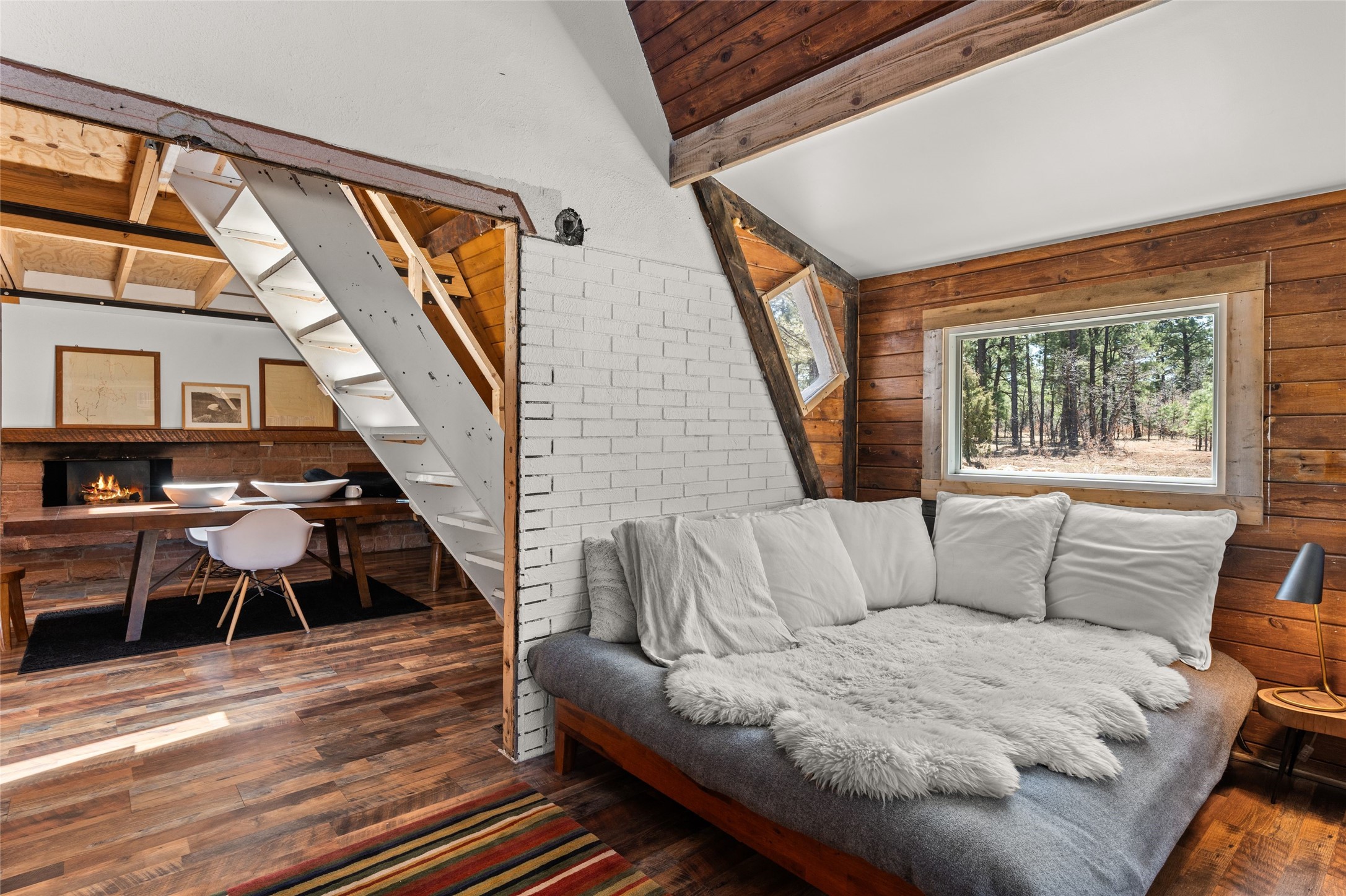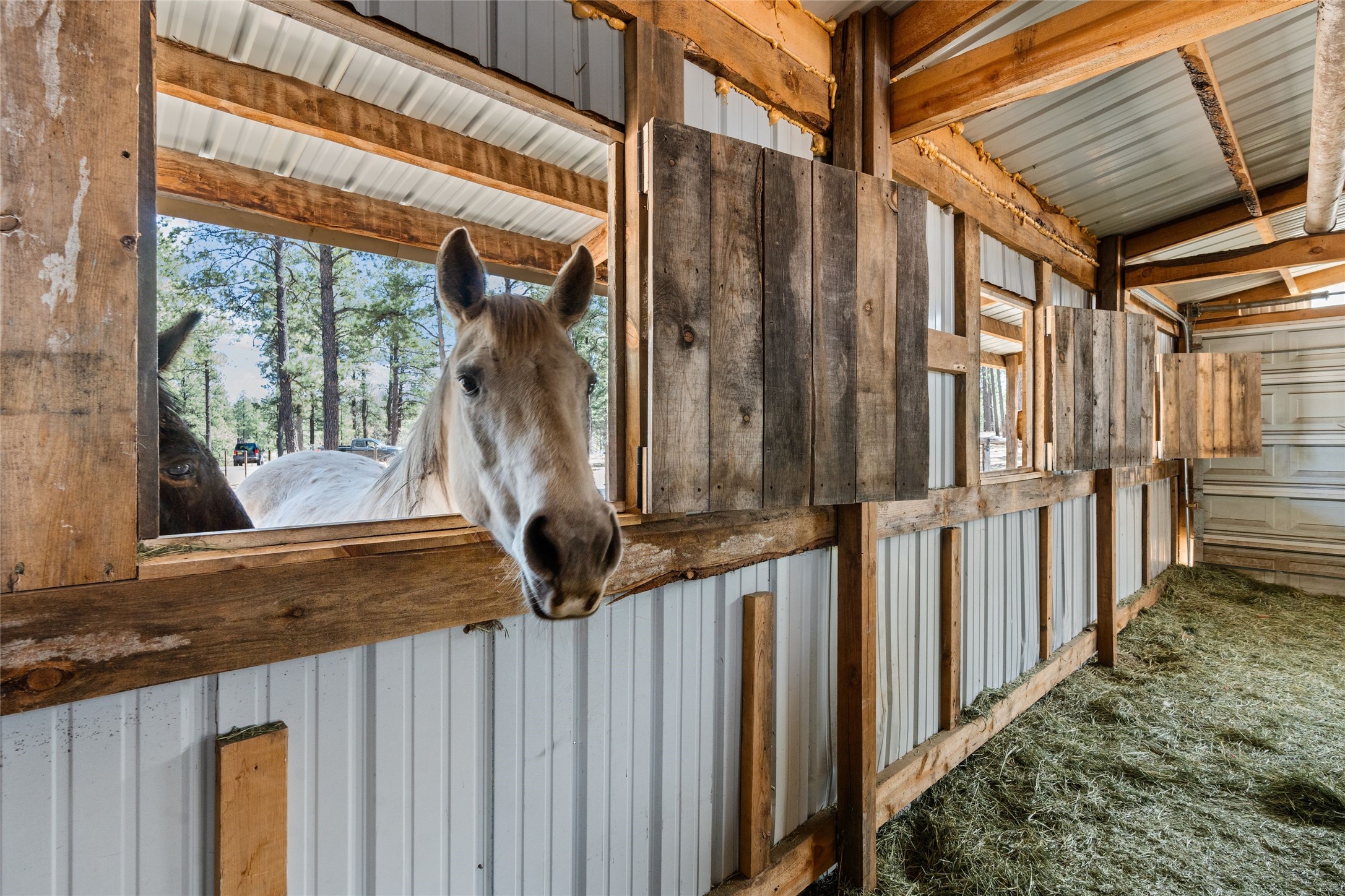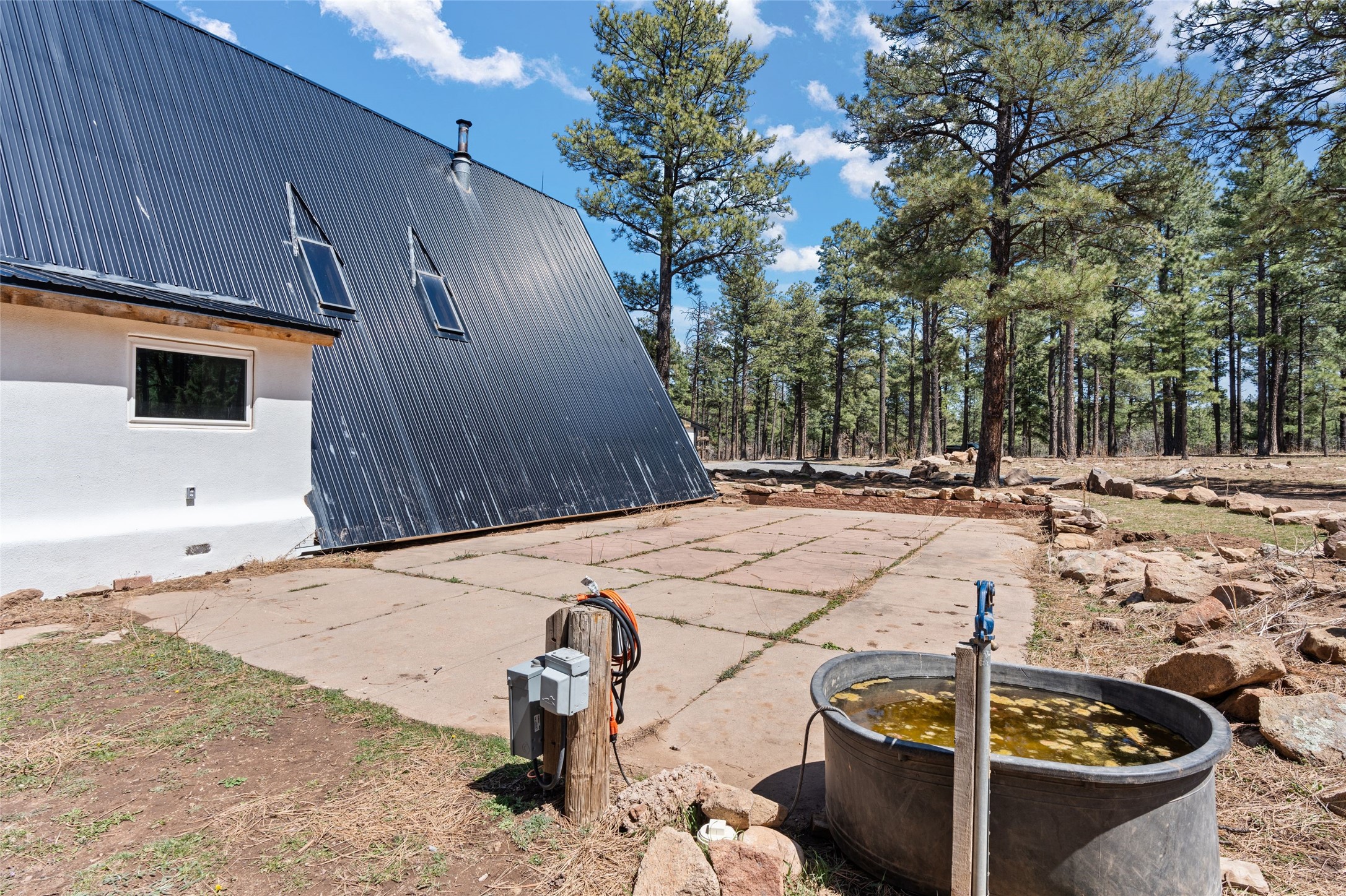 Secluded Mountain Retreat with Modern Upgrades.Behind a gated entrance, this 11.86-acre mountain retreat near Las Vegas, NM, and Storrie Lake offers privacy, sustainability, and stunning views of Hermits Peak. Originally a faminly hunting compound, the beautifully remodeled A-fram home features 3 bedrooms, 1.5 baths, an open-concept living area with a pellet stove, and a kitchen with movable workbench-style counters and an induction cooktop.Upgrades include lifetime warranty windows, a battery-ready 19-panel solar system, new laminte flooring, and enhanced insulation. The fully fenced property is ideal for homesteading or horses, with a hay barn, electric solar horse paddock, and trailer turnarounds. Enjoy two ponds, two wells, a 1/2 acre garden, and compost bins. Outdoor spaces shine with a wrap-around deck, hot shower, and cold plunge pool.Additional features: 500-gallon propane tank, RV hookups, three freezers, two refrigerators, and major fire mitigation. Don't miss this rare blend of mountain seclusion and modern comfort!