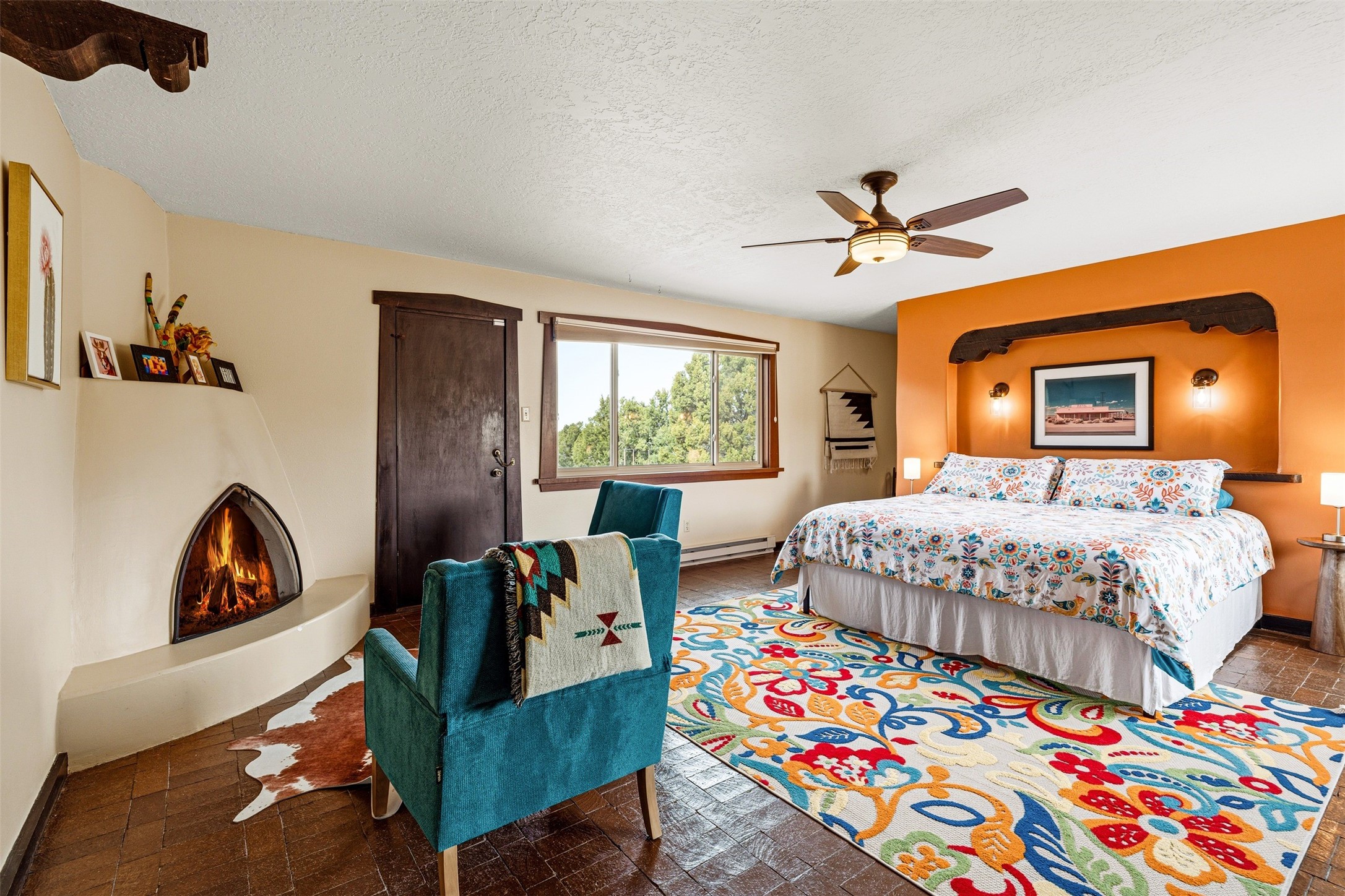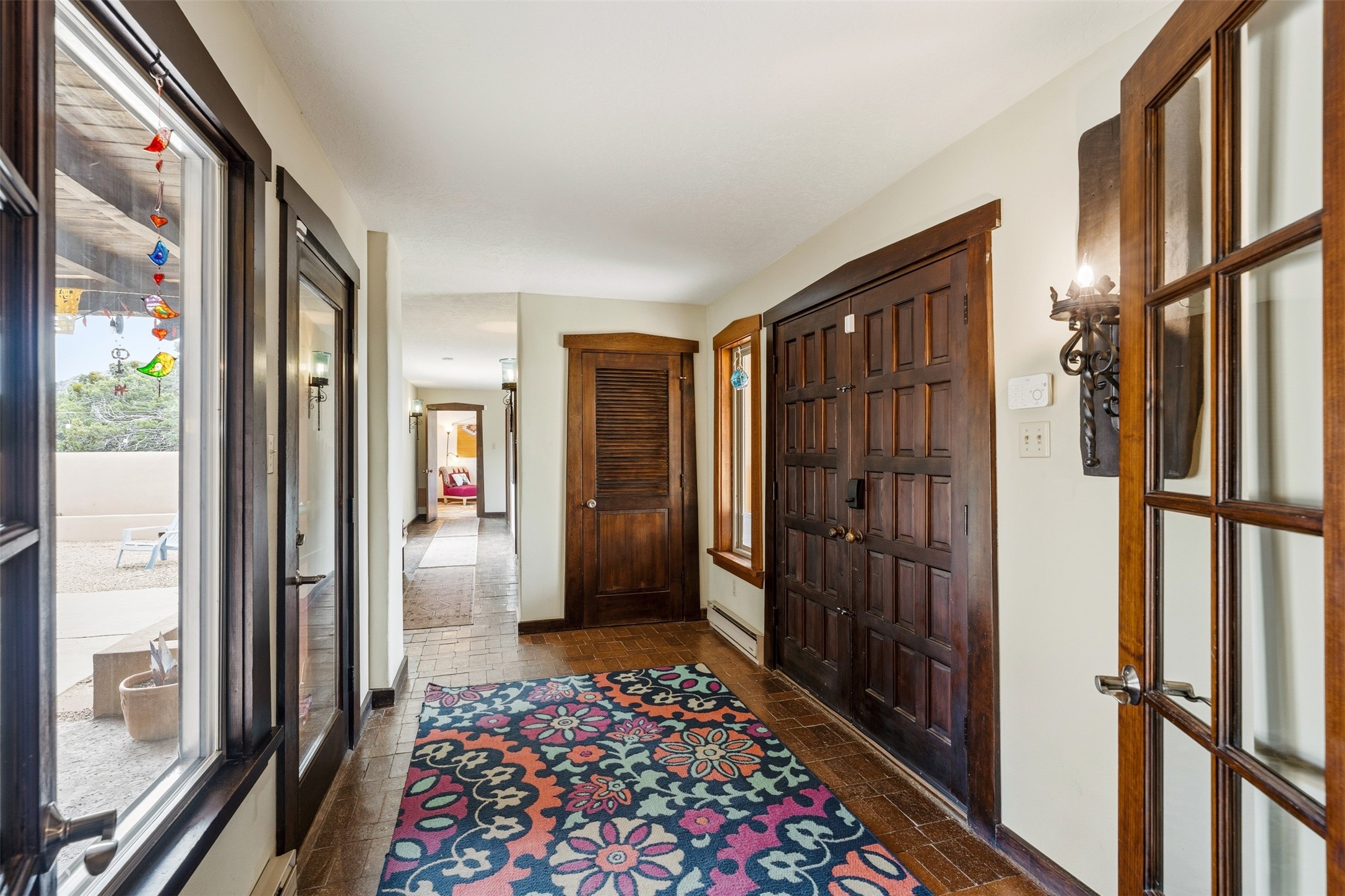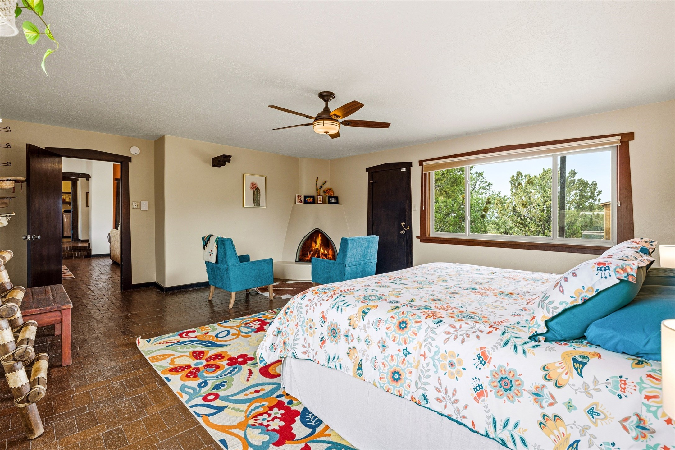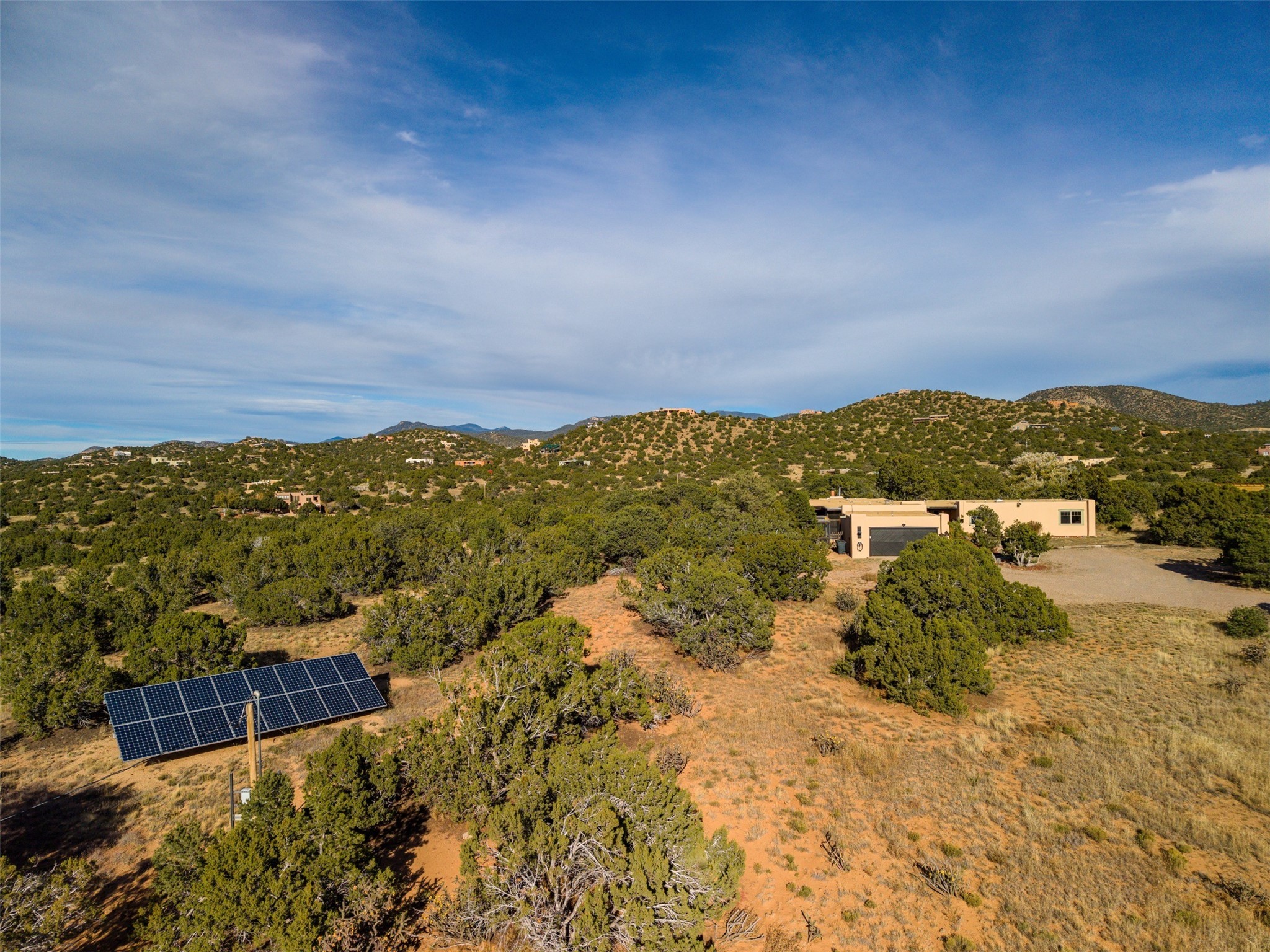 Discover this thoughtfully designed 3-bedroom, 2-bath home on five acres in Sunlit Hills, offering the perfect blend of rural tranquility and everyday convenience. Enjoy views of the Jemez Mountains and nearby foothills, just 10 minutes from town.The home's L-shaped layout centers around a courtyard and two large covered patios, ideal for outdoor dining and relaxation. Inside, you'll find brick and tile floors, maple cabinetry, custom built-ins, and generous closet space throughout.The private primary suite features a fireplace and peaceful views, while a pellet stove in the living room adds warmth and charm. A bonus room offers flexibility for an office, studio, or extra storage.Perfect for homesteading, the property includes a large chicken coop, fully fenced and deer-proof garden area, a spacious storage shed, and ample space for horses. Eco-friendly amenities include a fully owned solar panel array and EV charging station.With its heated two-car garage, self-sufficient design, and proven short-term rental history, this home offers comfort, versatility, and stunning natural beauty--all within easy reach of town.