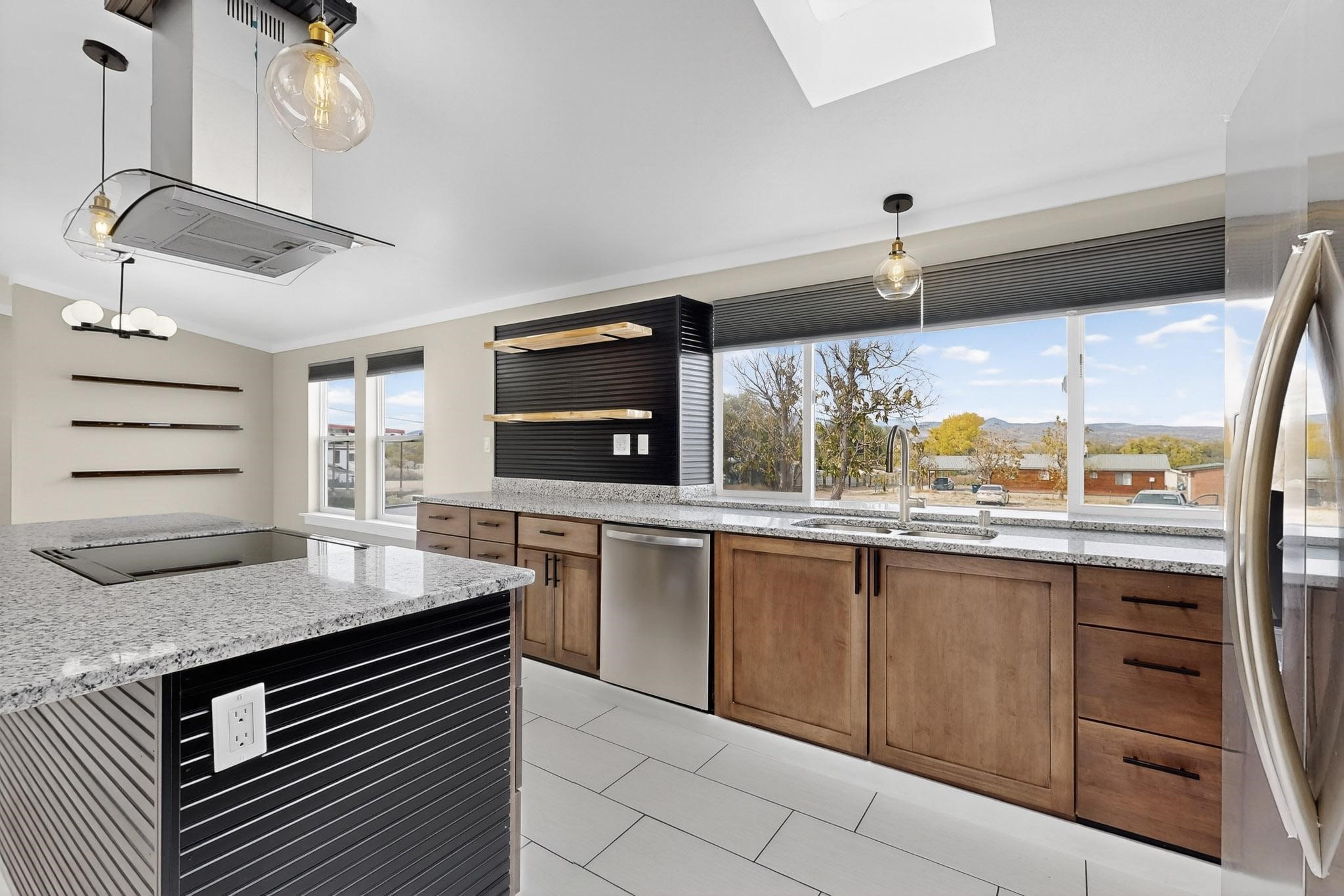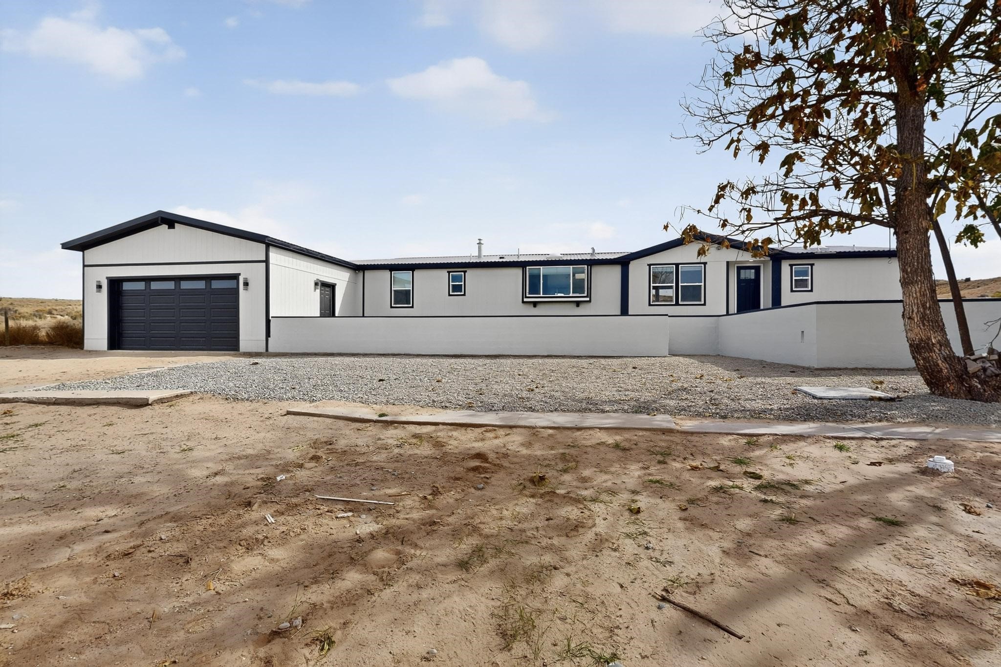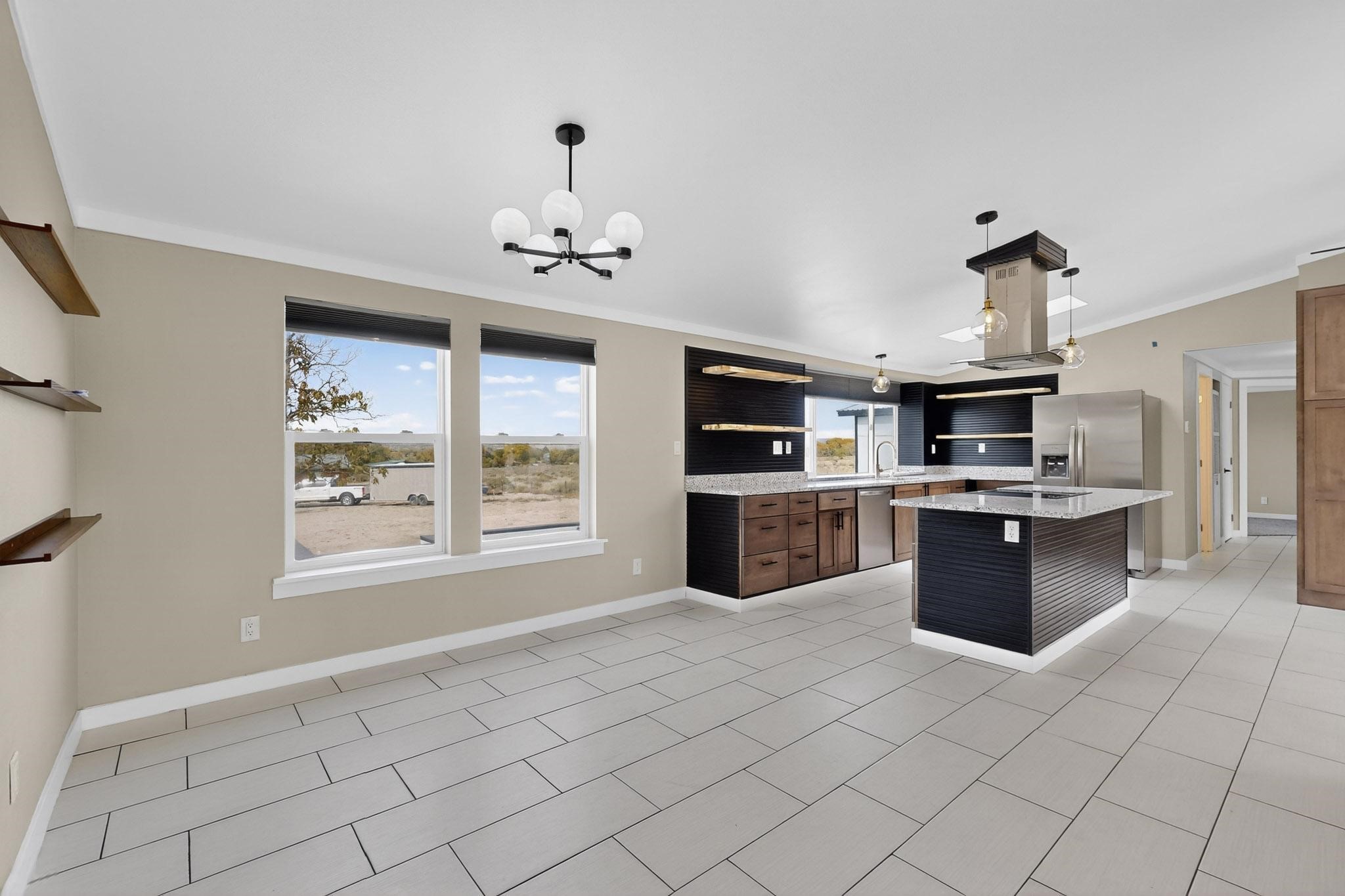 This beautifully remodeled 3-bedroom, 2 bath home offers modern comfort in a peaceful rural setting with spectacular views of the Jemez Mnts. Revel in the natural light that comes in through the 3 skylights. Enjoy a bonus room perfect for a home office or hobby space. Recent upgrades include new windows, new blinds, new roof, new tile flooring with plush carpet in the bedrooms, new lighting, and a new furnace and refrigerated air unit and new hot water heater. The kitchen has been thoughtfully redesigned with custom cabinetry, granite countertops and a new stainless appliance package.Home sits on a permanent foundation, with a new septic system and well improvements completed for peace of mind. Home also has an over sized 2-car garage. Property borders BLM land, providing privacy, open space and unmatched beauty right outside your door. Move-in ready and beautifully finished!!