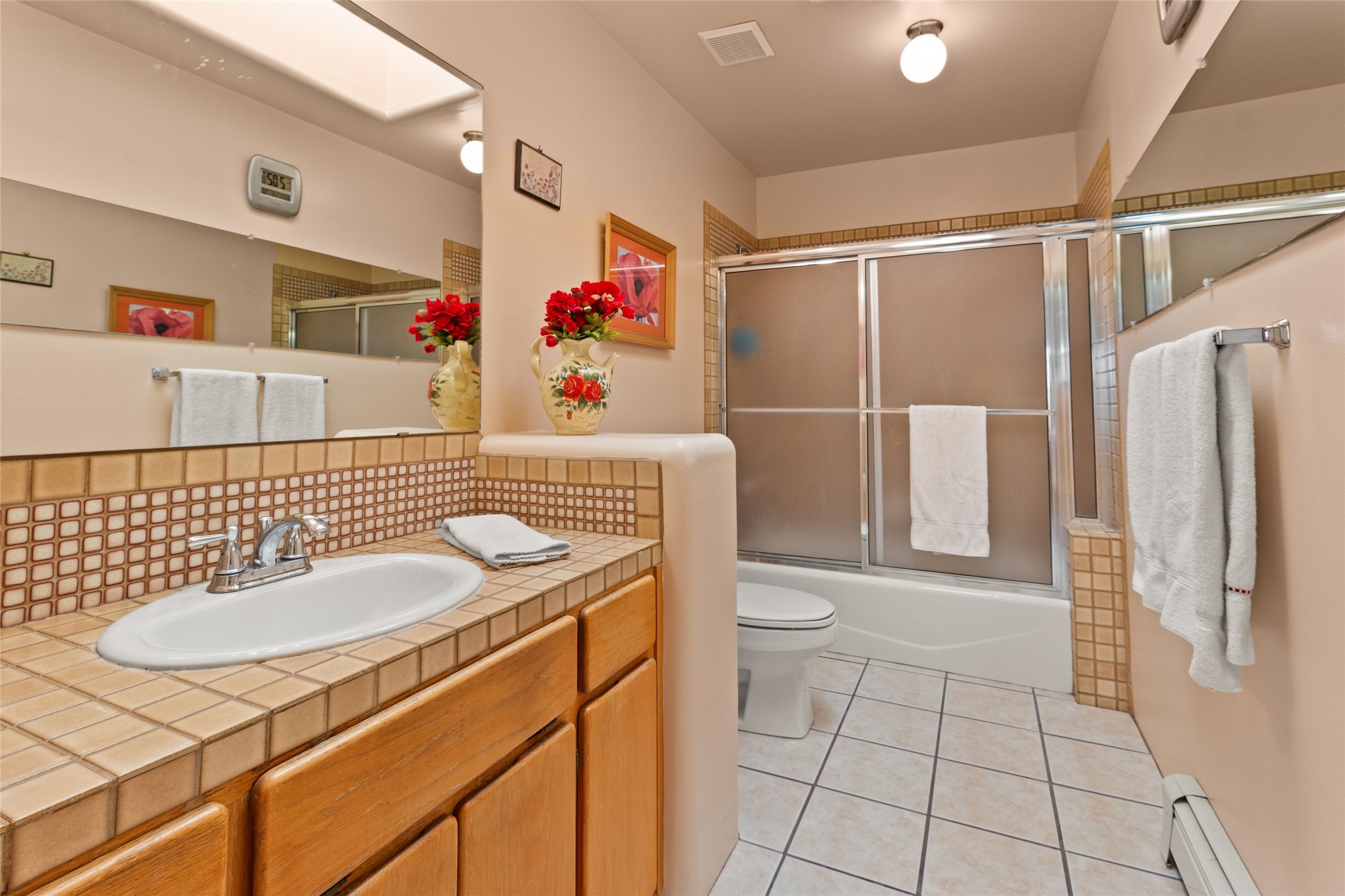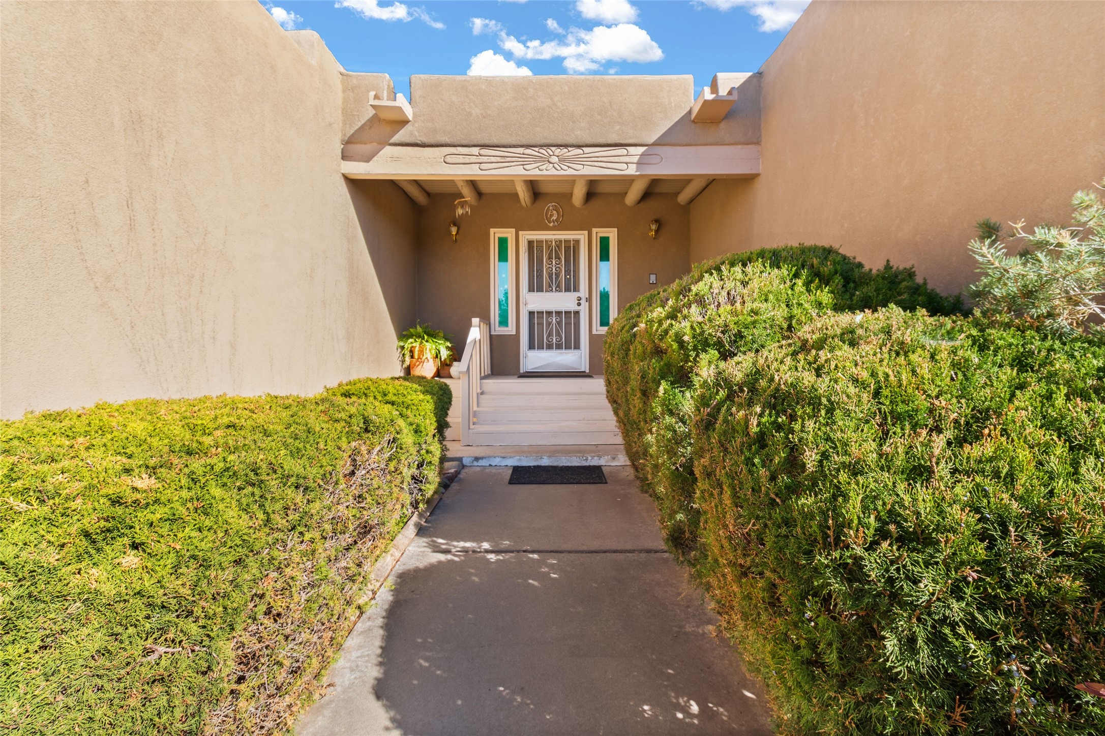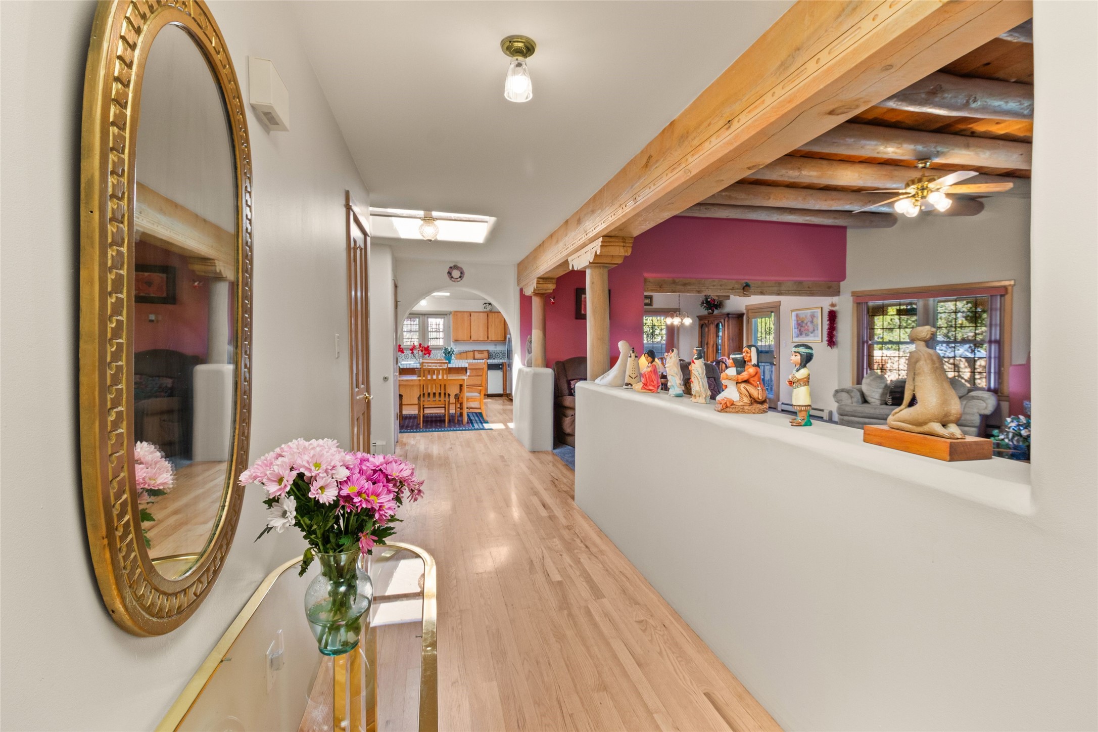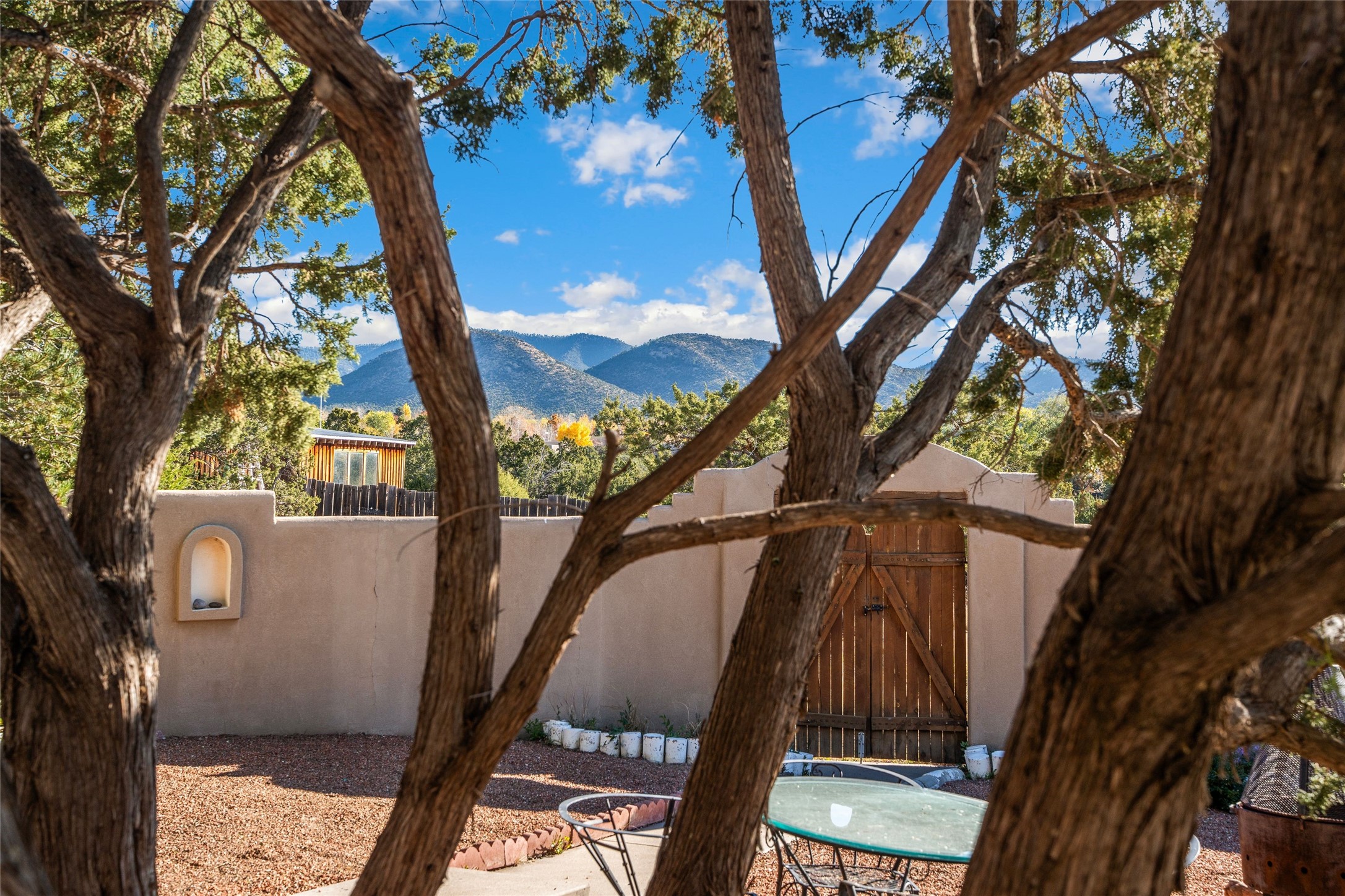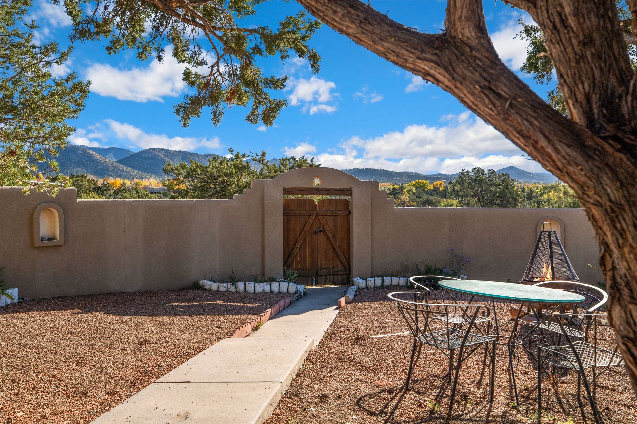Discover the unmatched beauty of this in-town Calle Tecolote residence, a 4-bedroom, 2-bath home conveniently located and showcasing breathtaking mountain and sunset views from the living room and master suite. Every angle of this property was designed to highlight the stunning natural surrounding scenery that defines luxury living in Santa Fe. The spacious living room features soaring vigas, carved corbels, and hand-hewn beams, creating an impressive yet inviting atmosphere. Large picture windows and abundant skylights flood the space with natural light and capture the ever-changing clouds and colors of the sky. The kiva fireplace adds timeless warmth and charm. The kitchen offers a central island with seating, formal dining area, and open layout ideal for entertaining. The master suite with en-suite full bathroom is a private retreat with commanding views and serene ambiance -- a perfect place to start and end your day. Step outside to a gracious and protected walled courtyard with covered entertaining portal, perfect for al fresco dining and quiet evenings surrounded by panoramic mountain views. Additional highlights include an attached two-car garage with storage, functional intercom/radio system, baseboard gas heating, wood and carpet flooring, and ideal central location. Located just minutes from St. Vincent's and Presbyterian Hospitals, I-25, and top dining and shopping, this property captures and provides privacy, convenience, and authentic Santa Fe style.