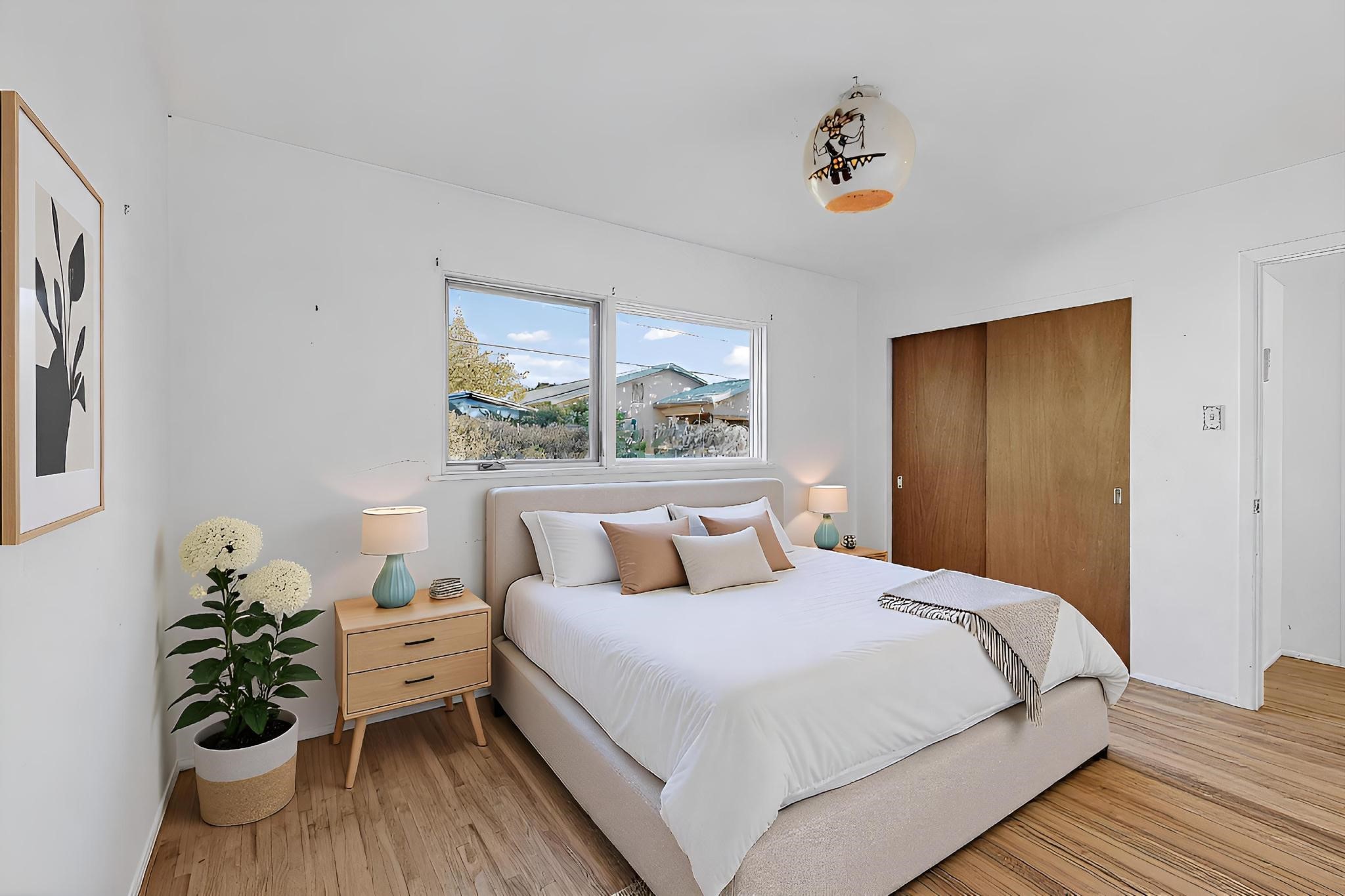 Ready for your remodel... this home is in a great location, has a big back garden, original hardwood floors- ready for your dreams! It has a large living room with the a big dining room next to the original kitchen. The back door leads to a patio and the large back garden. Two guest bedrooms and primary suite with its own bathroom. There's a small room off the laundry room that would make an ideal office or workout space. The two car garage is an added bonus. Photos have been digitally staged so you can see the potential.