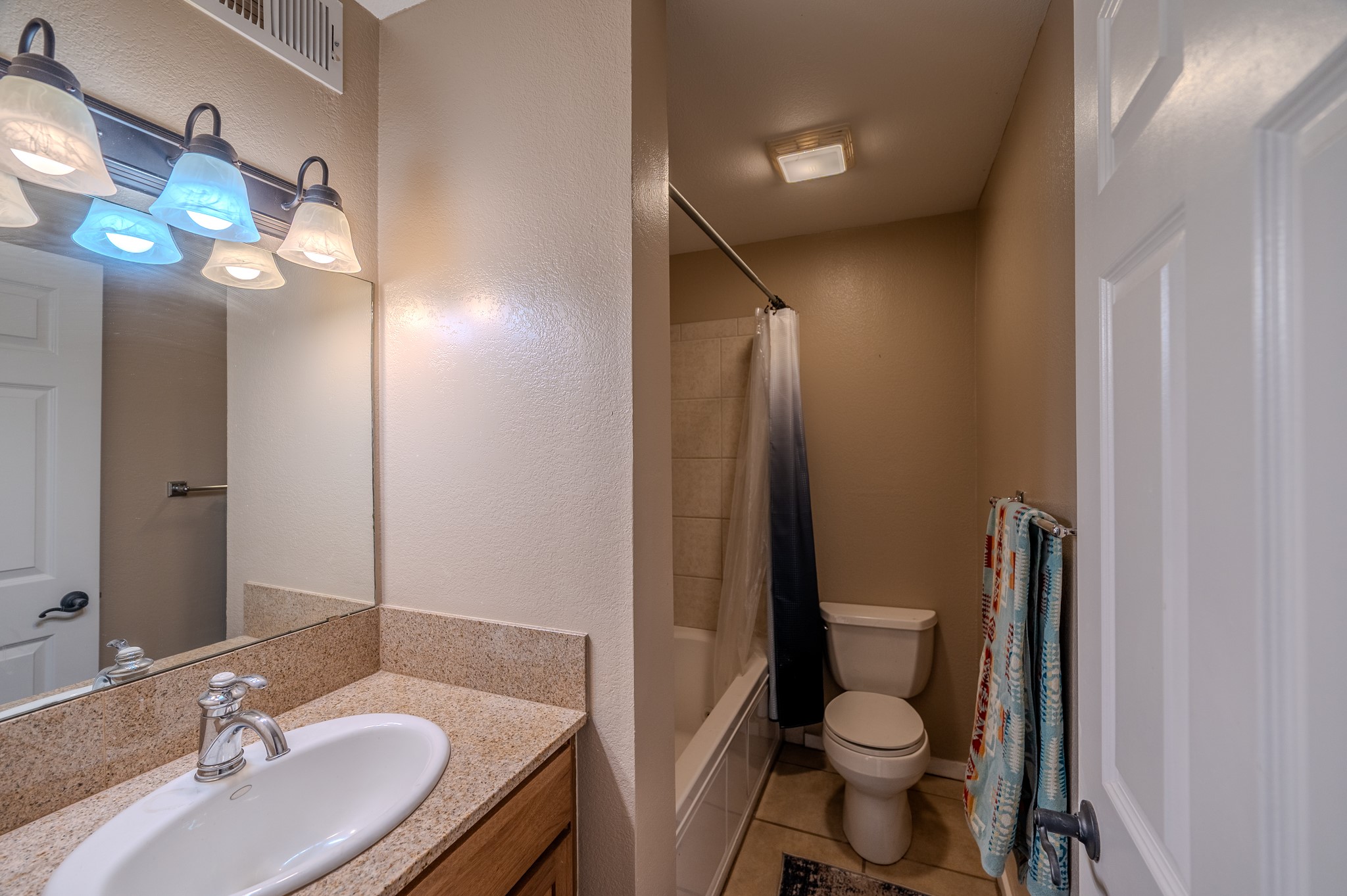 Checking every box. Ground Floor Condo on a lovely green belt offering 2 bedrooms and 2 full baths. The living room has a sliding door to a private court yard. This community is gated with well maintained grounds and a fenced outdoor swimming pool and common room. The location is central and walking distance to restaurants, shopping and entertainment venues. Easy to show. Have it all. Call today.