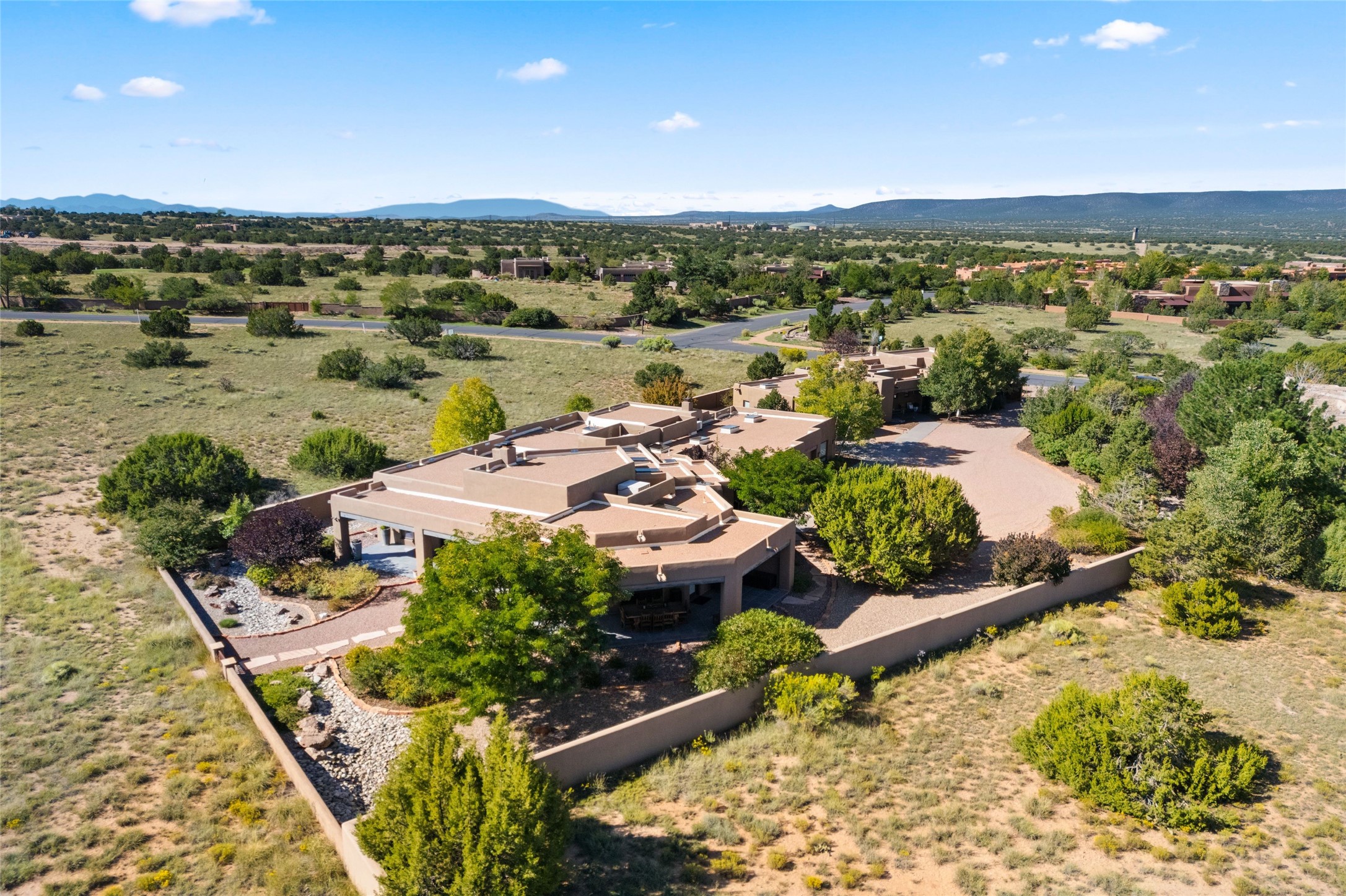 Prestigious Las Campanas 4-bedroom, 3.5-bath home, accompanied by a large guesthouse, overlooks the 9th fairway of the renowned Las Campanas Sunset Golf Course. With breathtaking views of the Sangre de Cristo and Jemez mountains, this single-level residence offers convenience with no interior steps. The home features high-end finishes, including plaster walls, porcelain and hardwood floors, and granite countertops complemented by stainless steel appliances. Open floor plan with a handsome great room, dining area, and well-appointed kitchen with a central island, perfect for entertaining family and friends. Step outside to the patio, where expanded living and entertaining options await against a backdrop of stunning vistas. The home features four cozy fireplaces, including one outdoors, providing warmth and ambiance year-round. Thoughtfully designed custom built-ins by renowned Santa Fe cabinetmaker Juan Carlos enhance the living room, primary bedroom, and library/media room, adding both style and functionality. The 1,218 sq. ft. guesthouse includes a full kitchen, a comfortable living and dining area, and two bedrooms with a 3/4 bath, offering privacy and convenience for guests. This exceptional property is ideally located with easy access to downtown Santa Fe and all its cultural, culinary and recreational amenities.