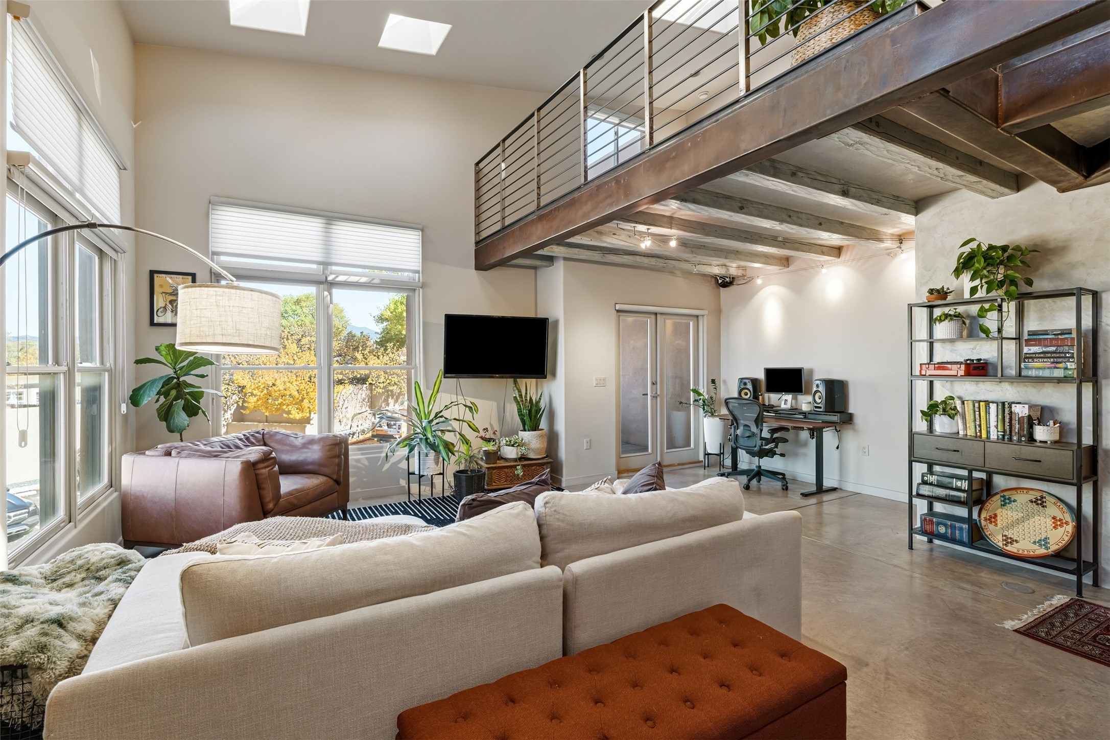 Contemporary live/work condo located in the highly sought-after South Capitol neighborhood--just a short walk to the Santa Fe Plaza and less than a mile from the Railyard District. Enjoy easy access to Whole Foods, Trader Joe's, Natural Grocers, popular restaurants, and a variety of local amenities. This two-level, second-floor residence offers 1 bedroom and 2 baths (1 full, 1 half) and is quietly tucked away at the back of the complex for added privacy. Expansive windows frame views of the Sangre de Cristo Mountains, while clerestory windows and soaring 17' ceilings fill the space with natural light. The open floor plan features a modern kitchen, sleek concrete floors with in-floor radiant heat, and a brand new evaporative cooler. Step out from the living area onto a spacious deck to enjoy outdoor living and mountain views. Upstairs, the lofted bedroom offers generous closet space, a bath with a steam shower, and stackable laundry. Don't miss this unique opportunity to own a stylish and light-filled home in one of Santa Fe's most desirable neighborhoods.