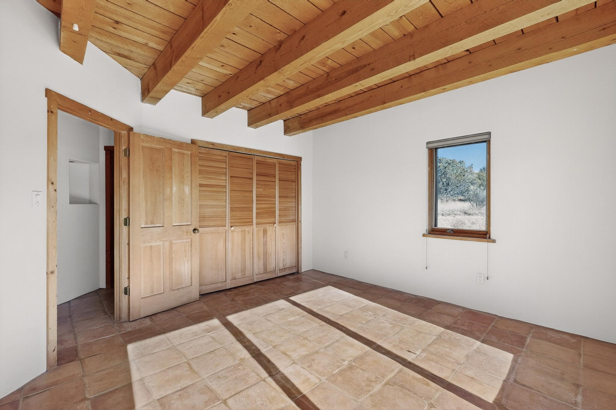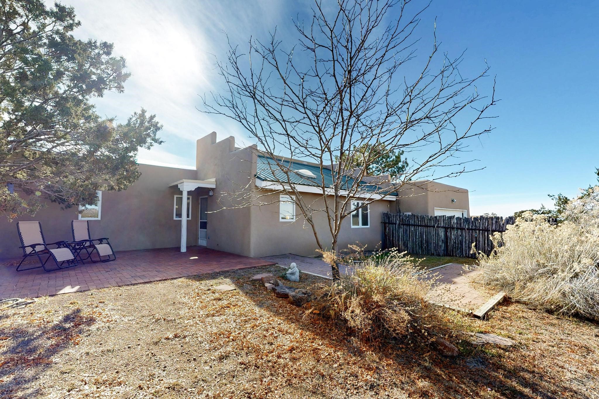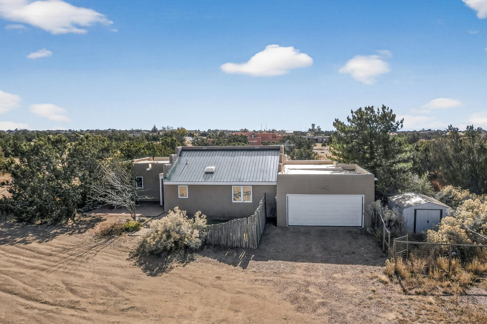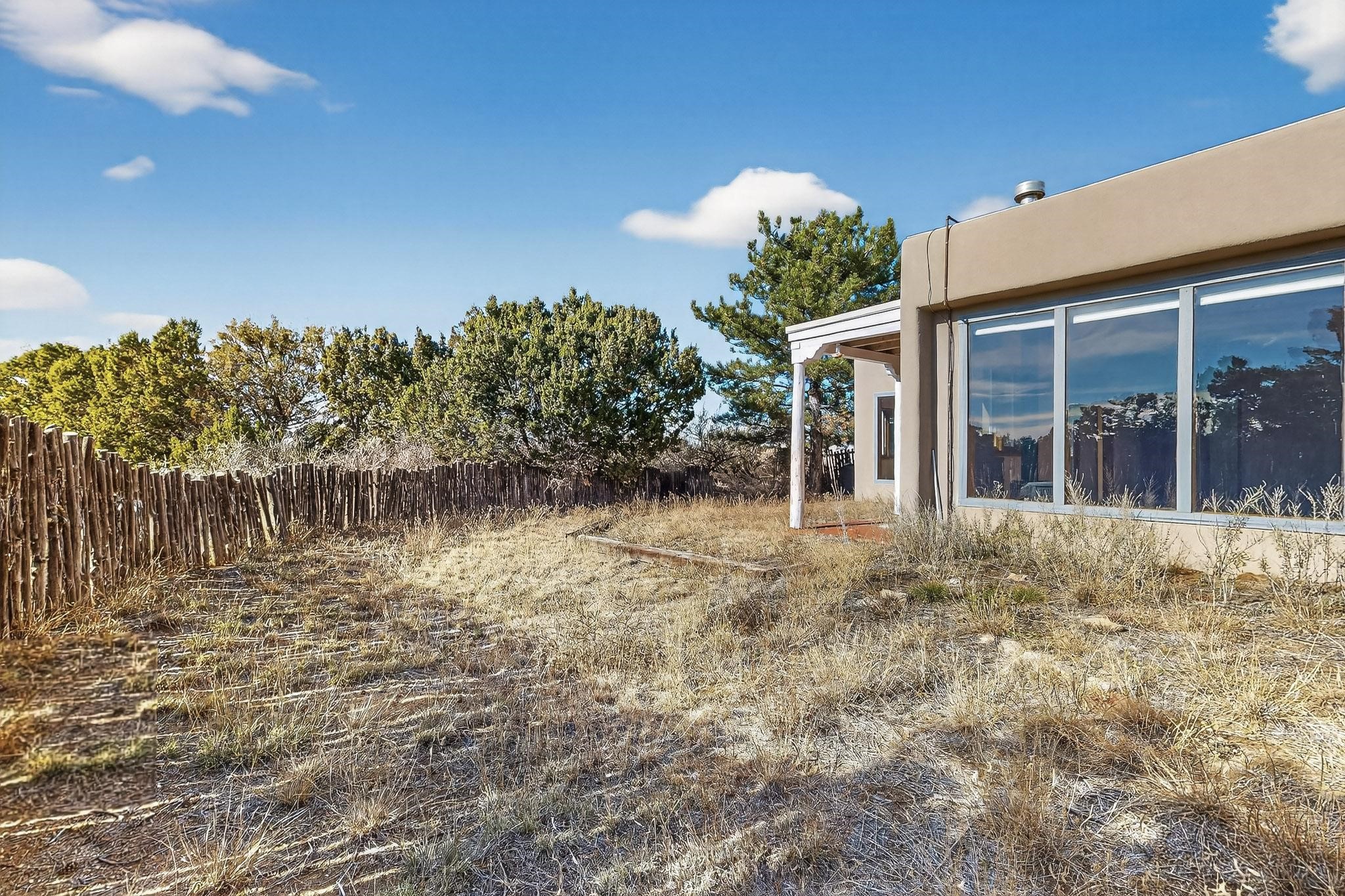 Located on an expansive Eldorado open space this is ideal for the night sky and naturalist enthusiast. Lovely traditional open plan, 1840sf passive solar design built by James Garton in 1990. The sunny split bedroom floorpan provides excellent separation for the main bedroom from the two guest bedrooms plus there is also a separate studio/den. Gleaming Santa Fe style saltillo tile and brick floors and beam ceilings throughout most rooms. Long south facing windows replaced in 2020, bring in the winter heat with overhangs adding shade in the summer.. A new TPO roof was installed in 2022. All appliances have been replaced in the last 5 years, and the hot water heater was replaced in 2020. There is a whole house filtering system, and a private front view brick patio added in 2021. here is an oversized 2 car garage plus plenty of guest parking. This home is accessed by paved roads and is within easy reach of Eldorado amenities, local shopping, schools, library and the senior center, only minutes into Santa Fe.