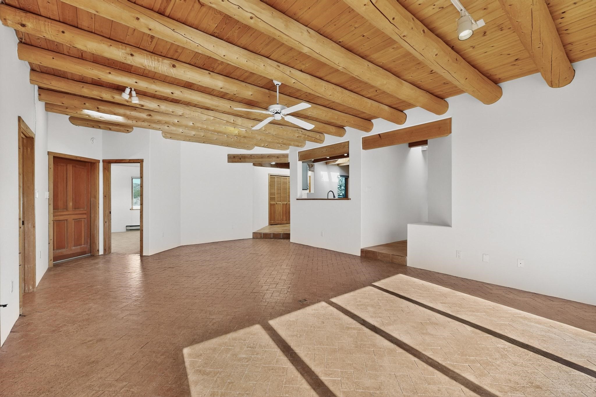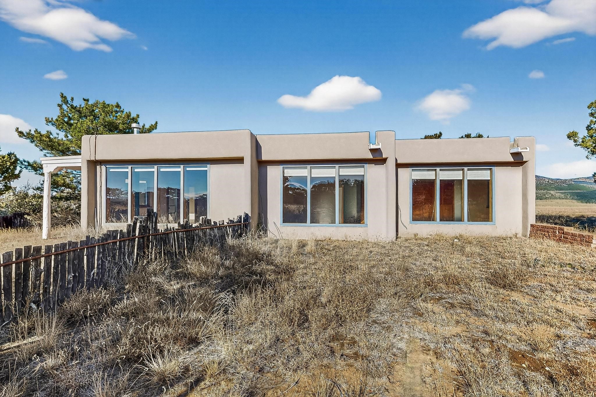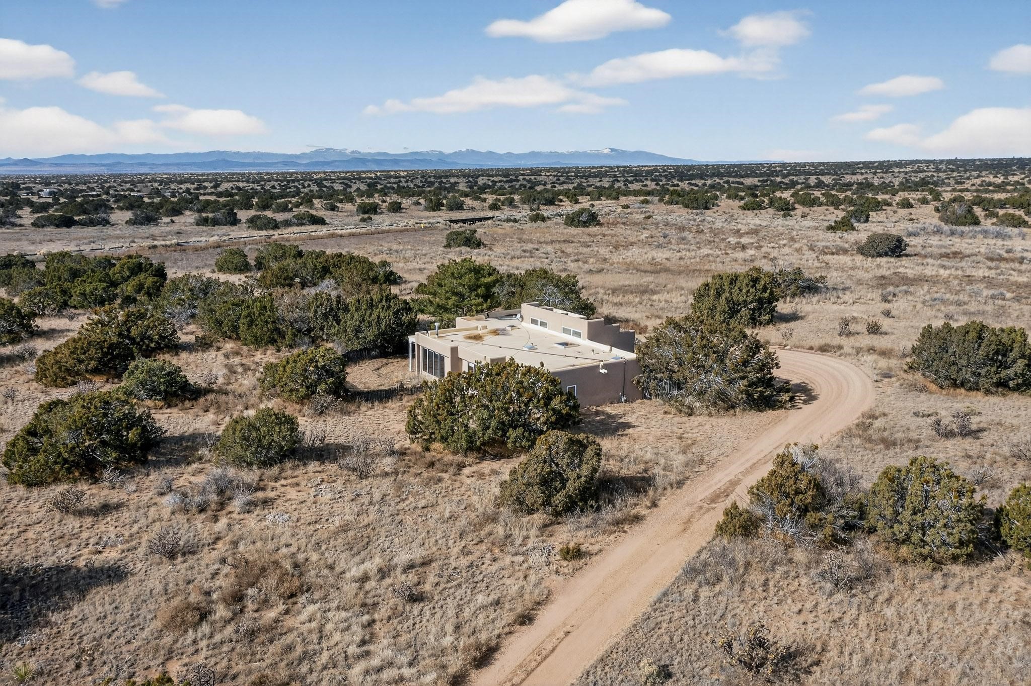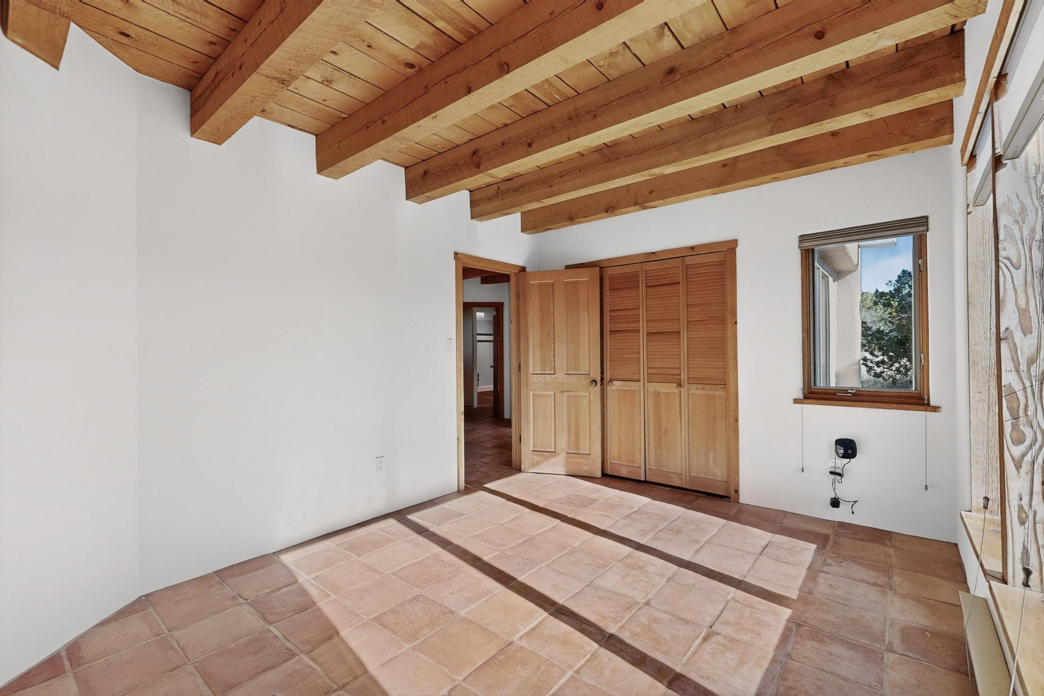 Located on an expansive Eldorado open space this is ideal for the night sky and naturalist enthusiast. Lovely traditional open plan, 1840sf passive solar design built by James Garton in 1990. The sunny split bedroom floorpan provides excellent separation for the main bedroom from the two guest bedrooms plus there is also a separate studio/den. Gleaming Santa Fe style saltillo tile and brick floors and beam ceilings throughout most rooms. Long south facing windows replaced in 2020, bring in the winter heat with overhangs adding shade in the summer.. A new TPO roof was installed in 2022. All appliances have been replaced in the last 5 years, and the hot water heater was replaced in 2020. There is a whole house filtering system, and a private front view brick patio added in 2021. here is an oversized 2 car garage plus plenty of guest parking. This home is accessed by paved roads and is within easy reach of Eldorado amenities, local shopping, schools, library and the senior center, only minutes into Santa Fe.