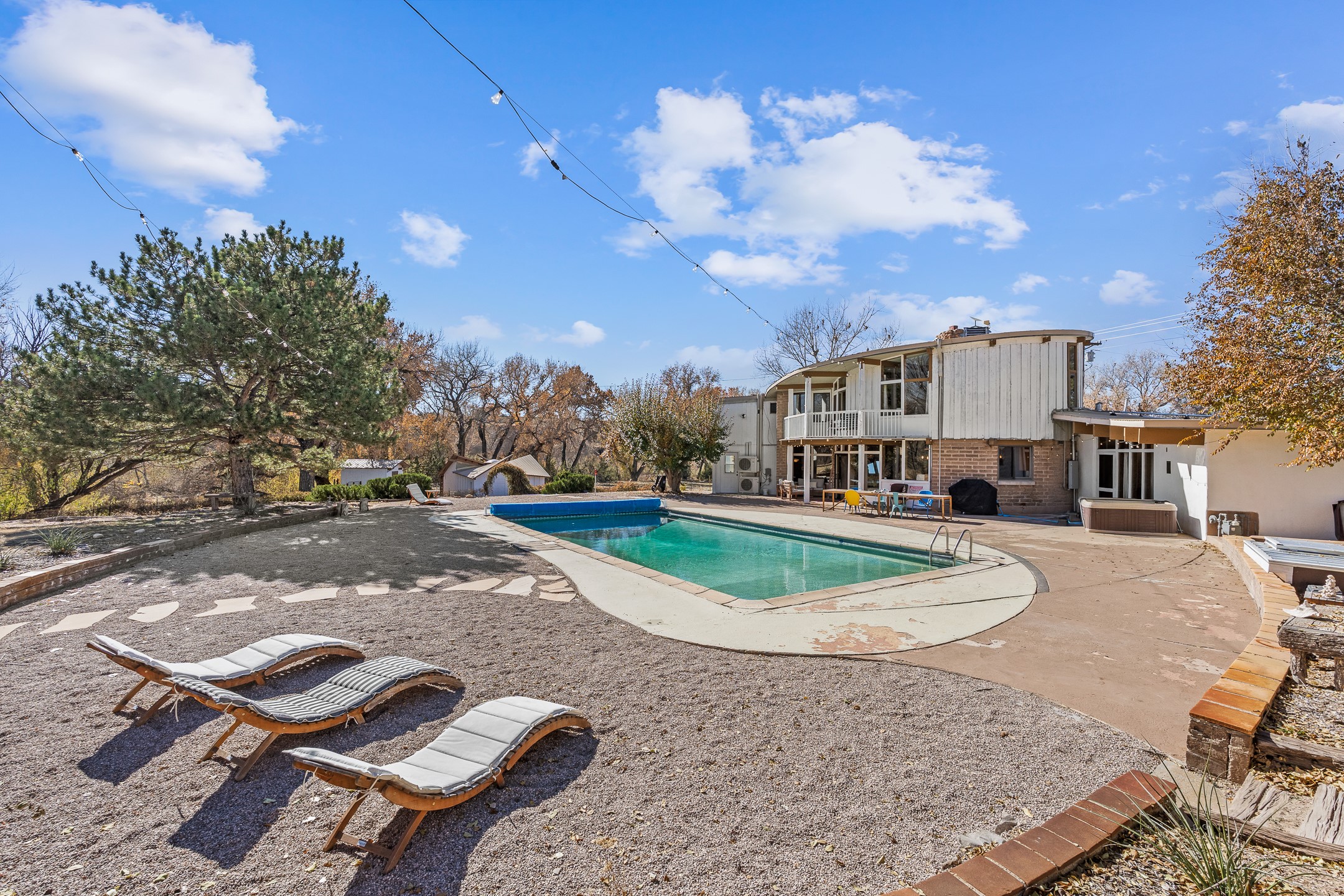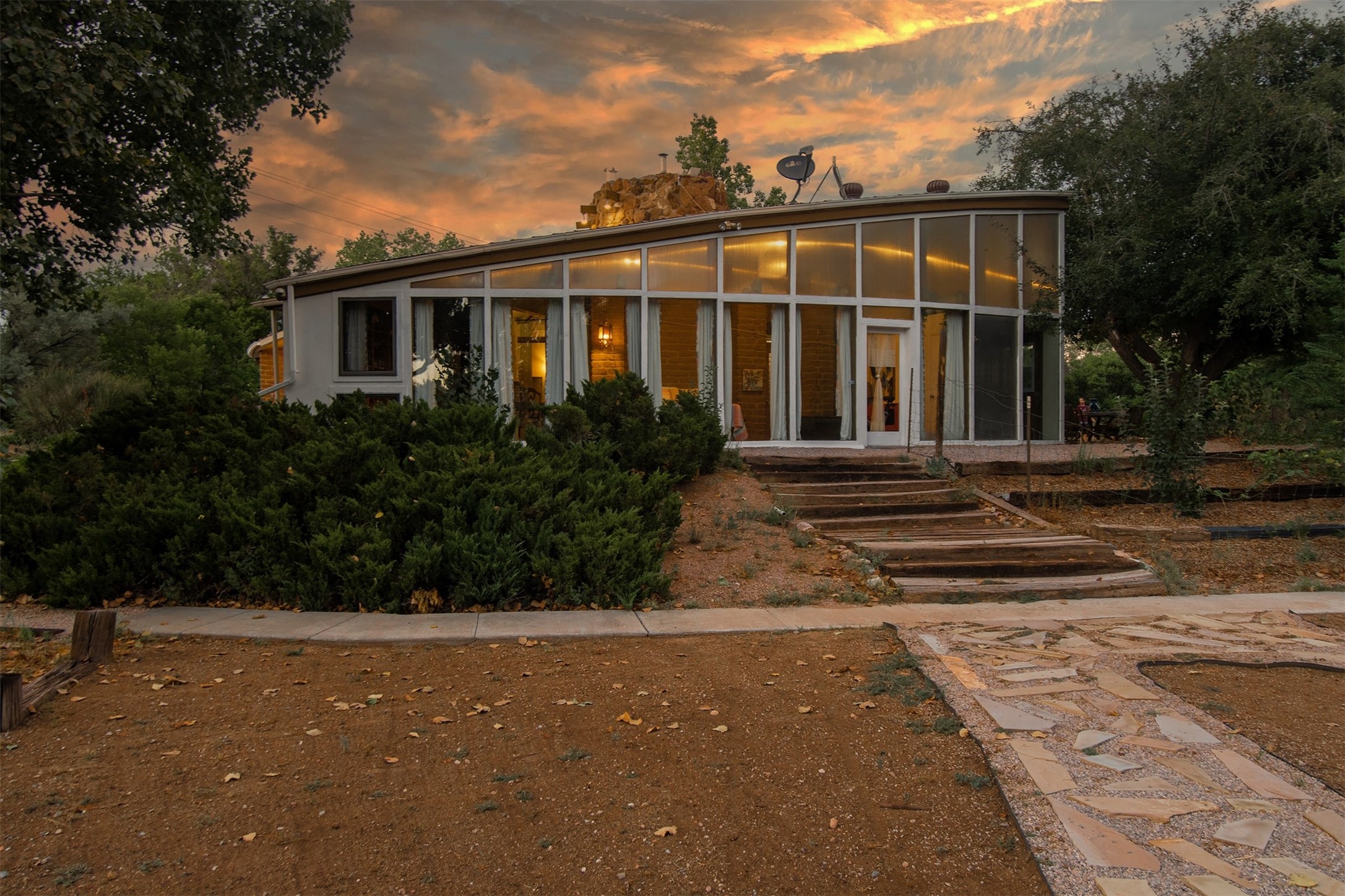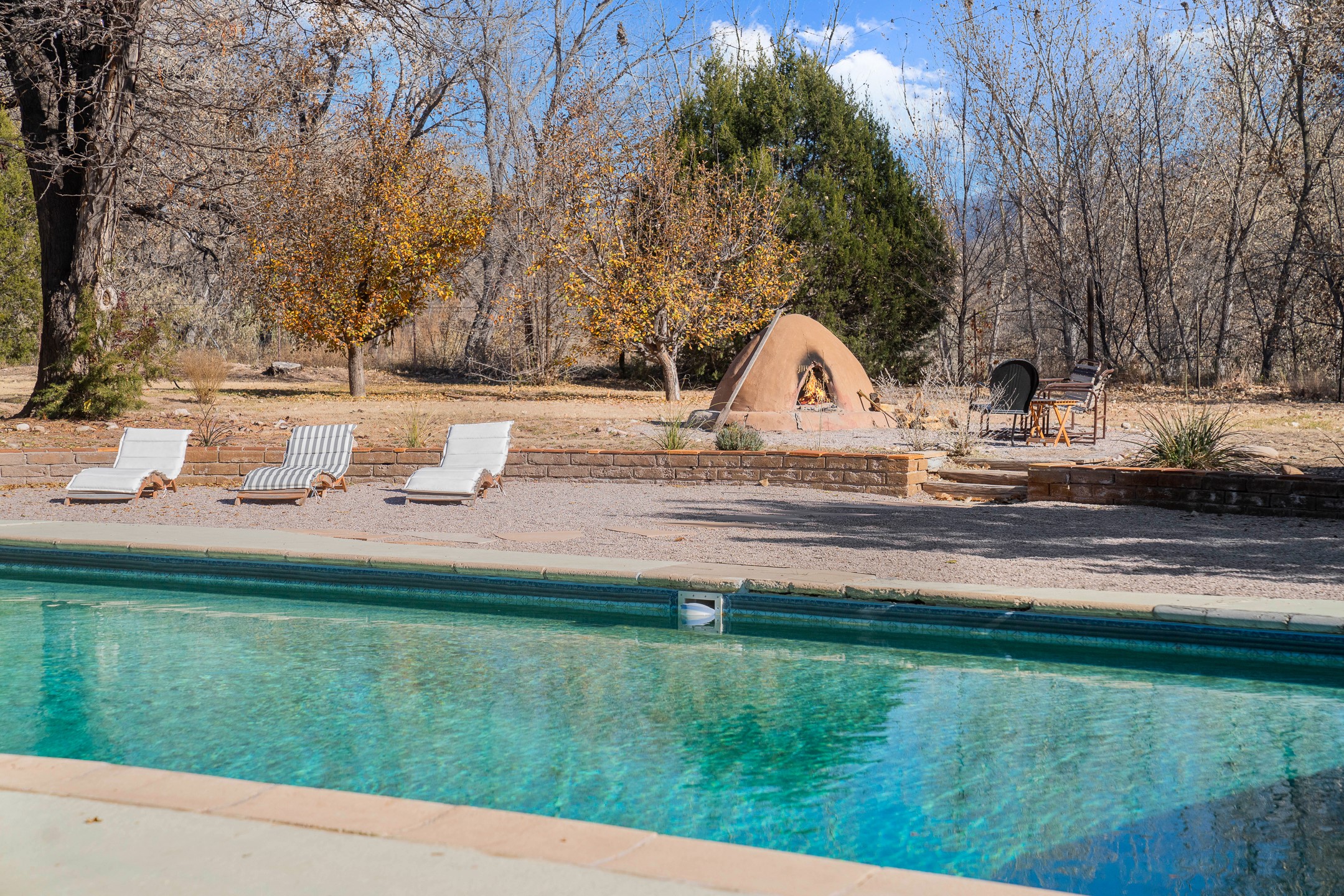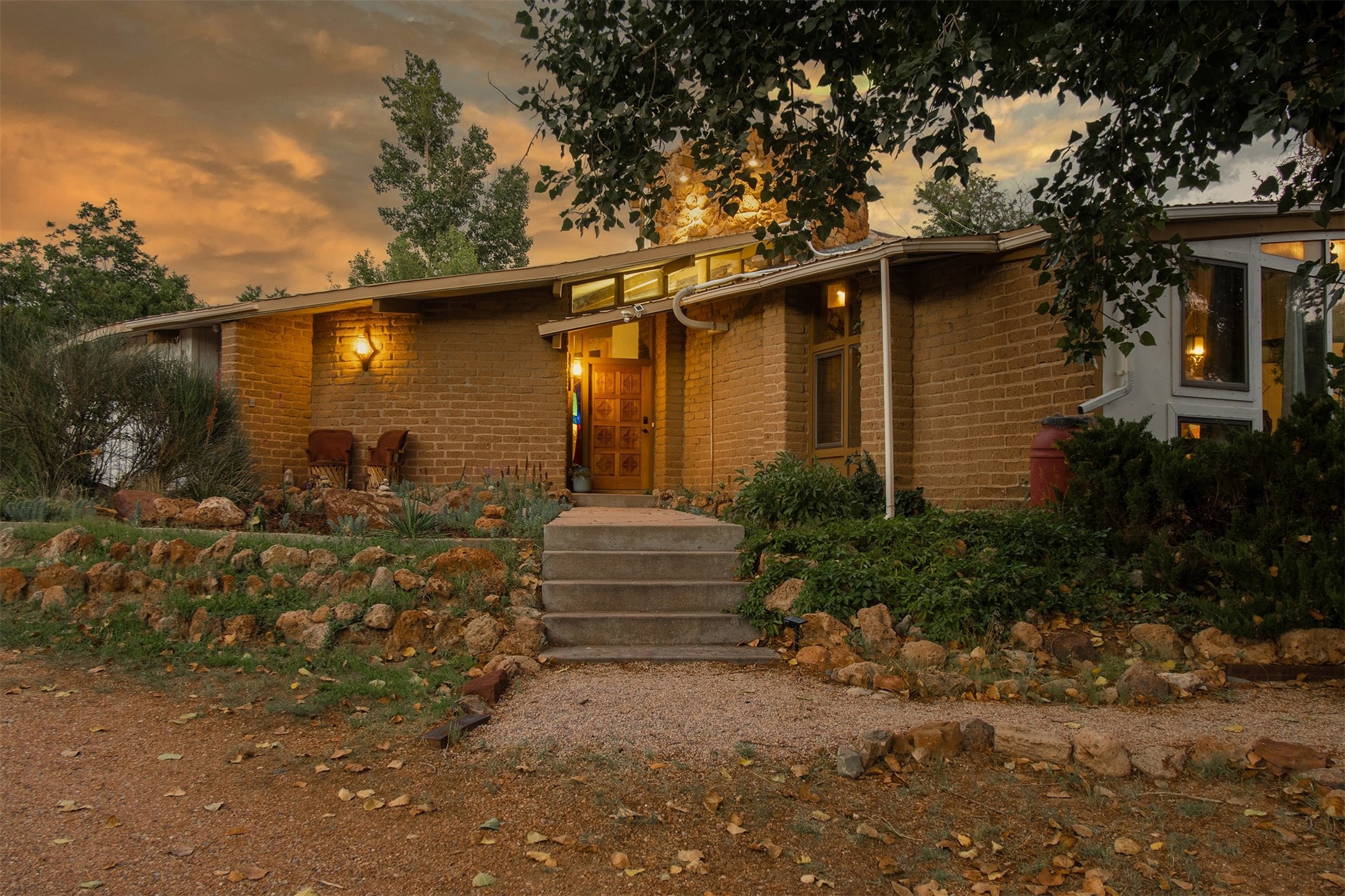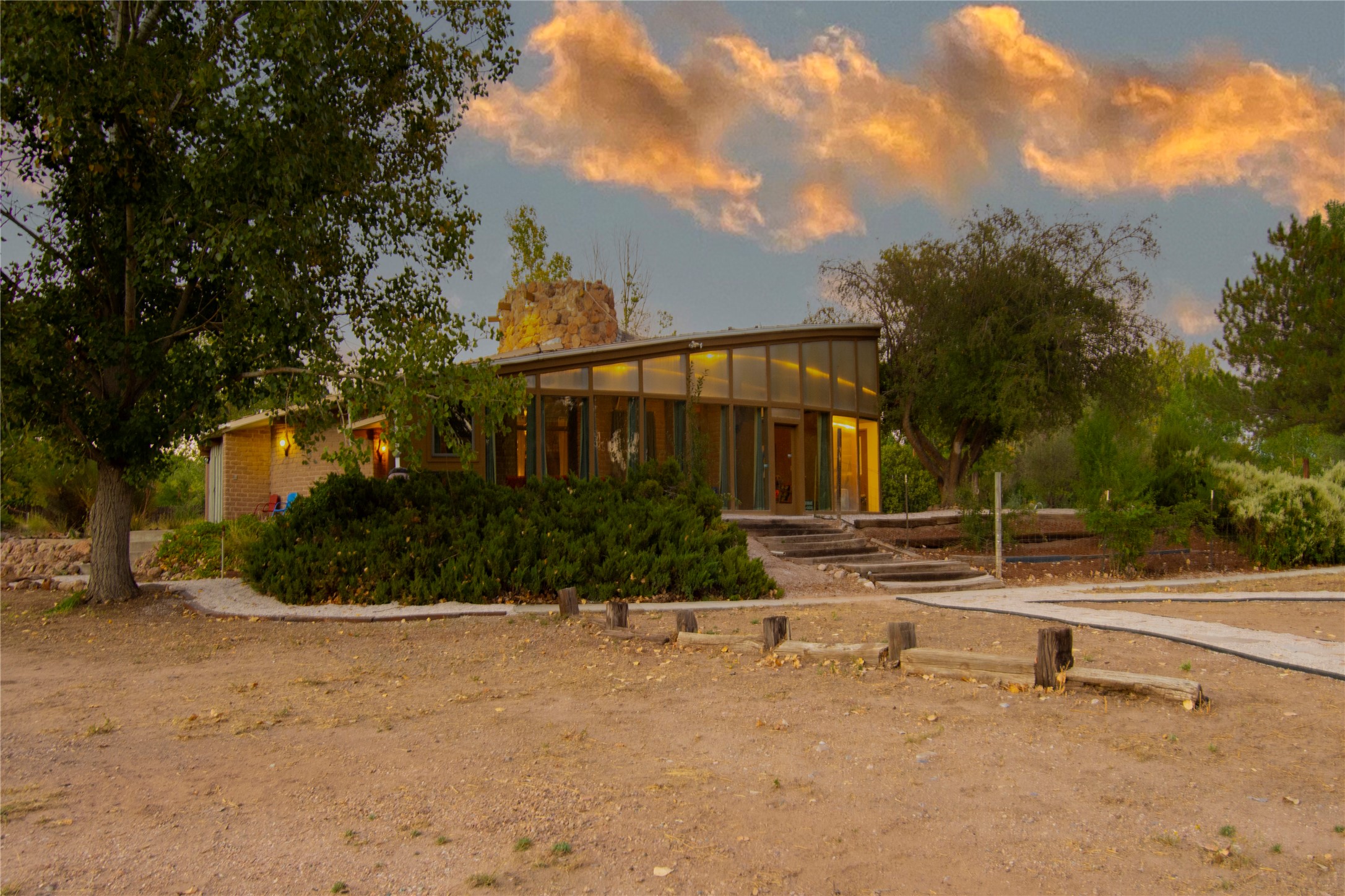 El Caracol Court | 34 State Road 503 is a truly distinctive riverfront property located along the Rio Nambe in the lush Nambe Valley. Designed by renowned local architect Allen L. McNown, a University of Oregon trained architect who settled in Pojoaque in the 1950s and became known for his contemporary adobe work with undulating forms and tinted-light interiors, including the modern church at Namb Pueblo. The home combines artistic design, functionality, and nature in an extraordinary way. Its form is inspired by the spiral geometry of a nautilus shell, a motif McNown used in other celebrated "snail" houses in the valley, and this architectural concept defines a flowing interior that celebrates light, water, and organic space. Set on approximately 2.10 acres, the property is fully fenced and offers both privacy and usability. It benefits from surface water rights off the Rio Nambe as well as a shared well, providing flexibility for landscaping and irrigation. The grounds include mature trees, gardens, a swimming pool, storage shed, and a separate workshop--a combination rarely found in this corridor.The residence itself measures roughly 4,000 square feet with three bedrooms and three bathrooms. Key design features include adobe and frame construction, dramatic curving walls, exposed wood beams, a lava-rock fireplace, and a sweeping staircase that centers the home's open plan. Additional amenities include: 40' Private swimming pool with adjacent lounge area, covered portal, sunroom with glass enclosure, solar improvements, mechanical system updates, maintained roof and gutters, radon mitigation system, updated appliances, and enhanced irrigation infrastructure. Exceptional maintenance and stewardship, upgrades over recent years that have modernized systems while preserving the artistic integrity of the home. The property has also been operated as a short-term rental, generating consistent income and showing strong demand as a retreat or vacation destination.