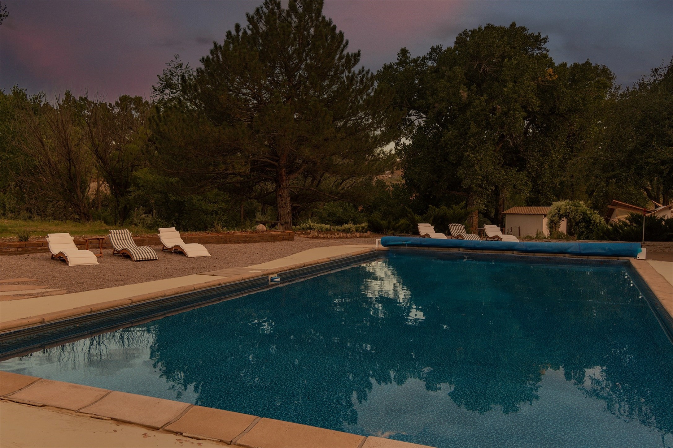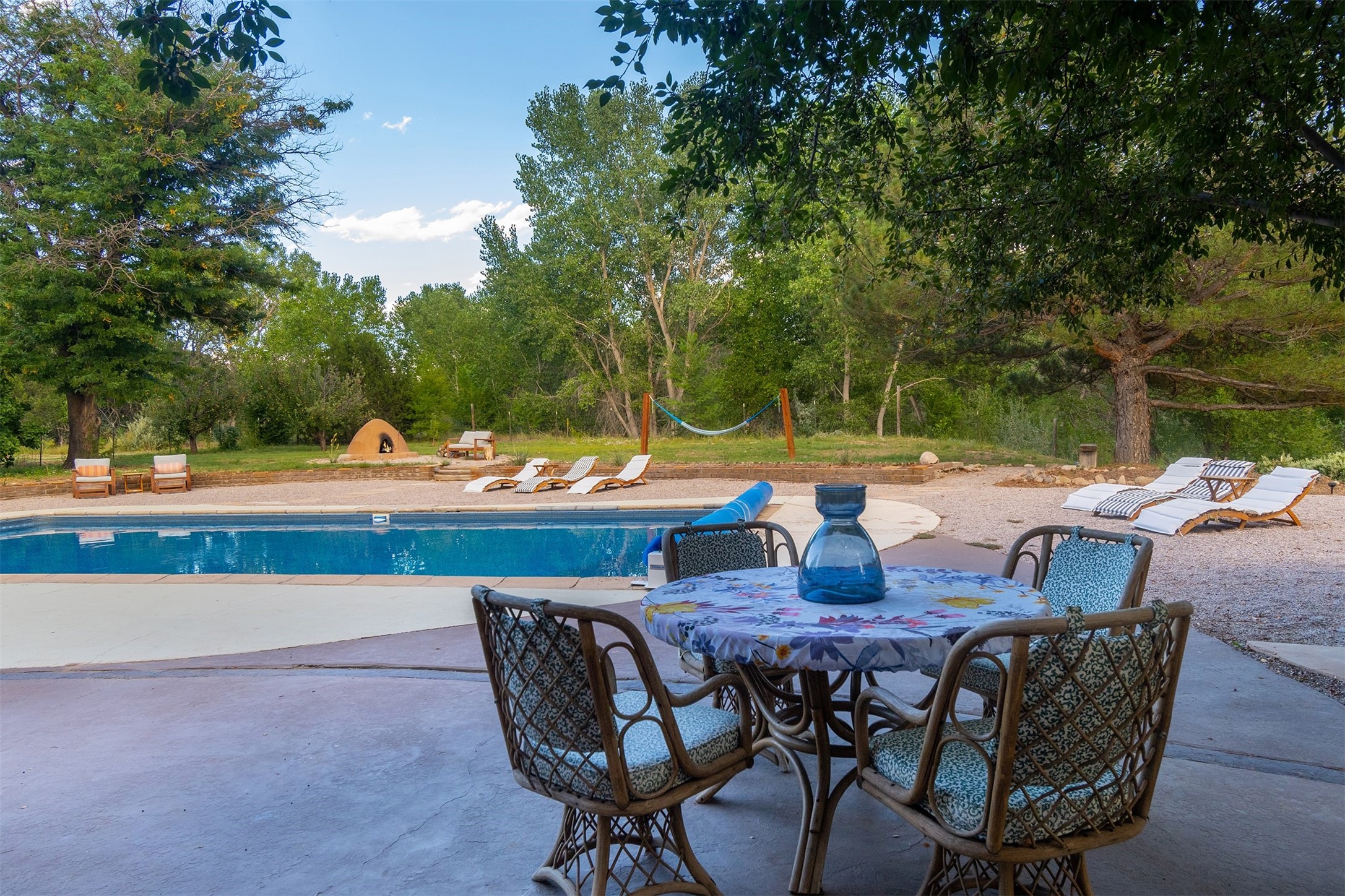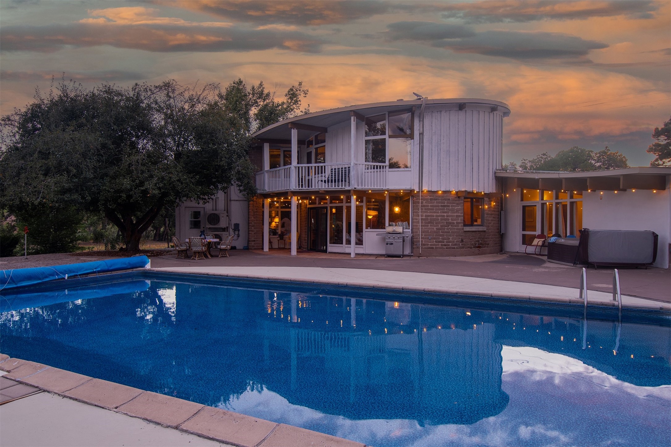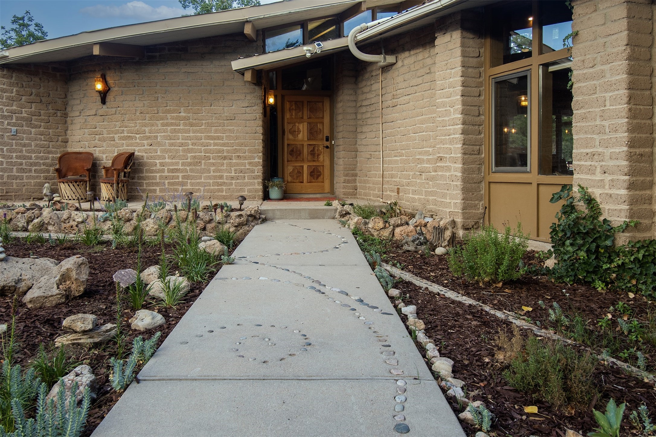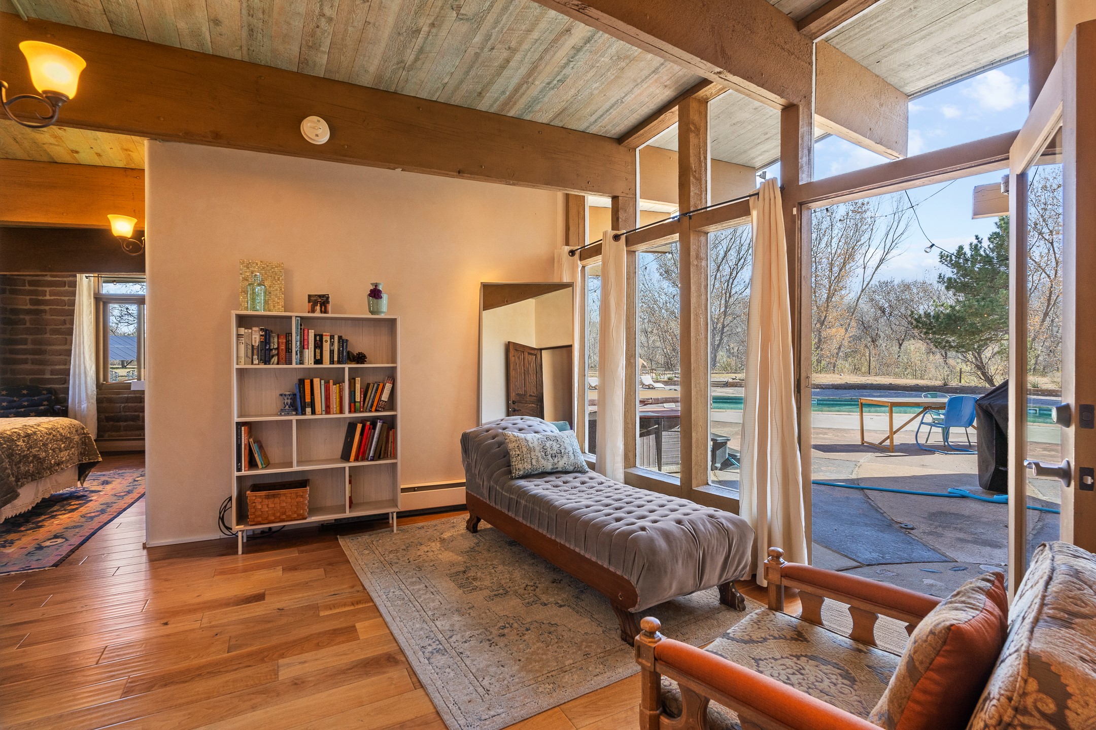 El Caracol Court | 34 State Road 503 is a truly distinctive riverfront property located along the Rio Nambe in the lush Nambe Valley. Designed by renowned local architect Allen L. McNown, a University of Oregon trained architect who settled in Pojoaque in the 1950s and became known for his contemporary adobe work with undulating forms and tinted-light interiors, including the modern church at Namb Pueblo. The home combines artistic design, functionality, and nature in an extraordinary way. Its form is inspired by the spiral geometry of a nautilus shell, a motif McNown used in other celebrated "snail" houses in the valley, and this architectural concept defines a flowing interior that celebrates light, water, and organic space. Set on approximately 2.10 acres, the property is fully fenced and offers both privacy and usability. It benefits from surface water rights off the Rio Nambe as well as a shared well, providing flexibility for landscaping and irrigation. The grounds include mature trees, gardens, a swimming pool, storage shed, and a separate workshop--a combination rarely found in this corridor.The residence itself measures roughly 4,000 square feet with three bedrooms and three bathrooms. Key design features include adobe and frame construction, dramatic curving walls, exposed wood beams, a lava-rock fireplace, and a sweeping staircase that centers the home's open plan. Additional amenities include: 40' Private swimming pool with adjacent lounge area, covered portal, sunroom with glass enclosure, solar improvements, mechanical system updates, maintained roof and gutters, radon mitigation system, updated appliances, and enhanced irrigation infrastructure. Exceptional maintenance and stewardship, upgrades over recent years that have modernized systems while preserving the artistic integrity of the home. The property has also been operated as a short-term rental, generating consistent income and showing strong demand as a retreat or vacation destination.