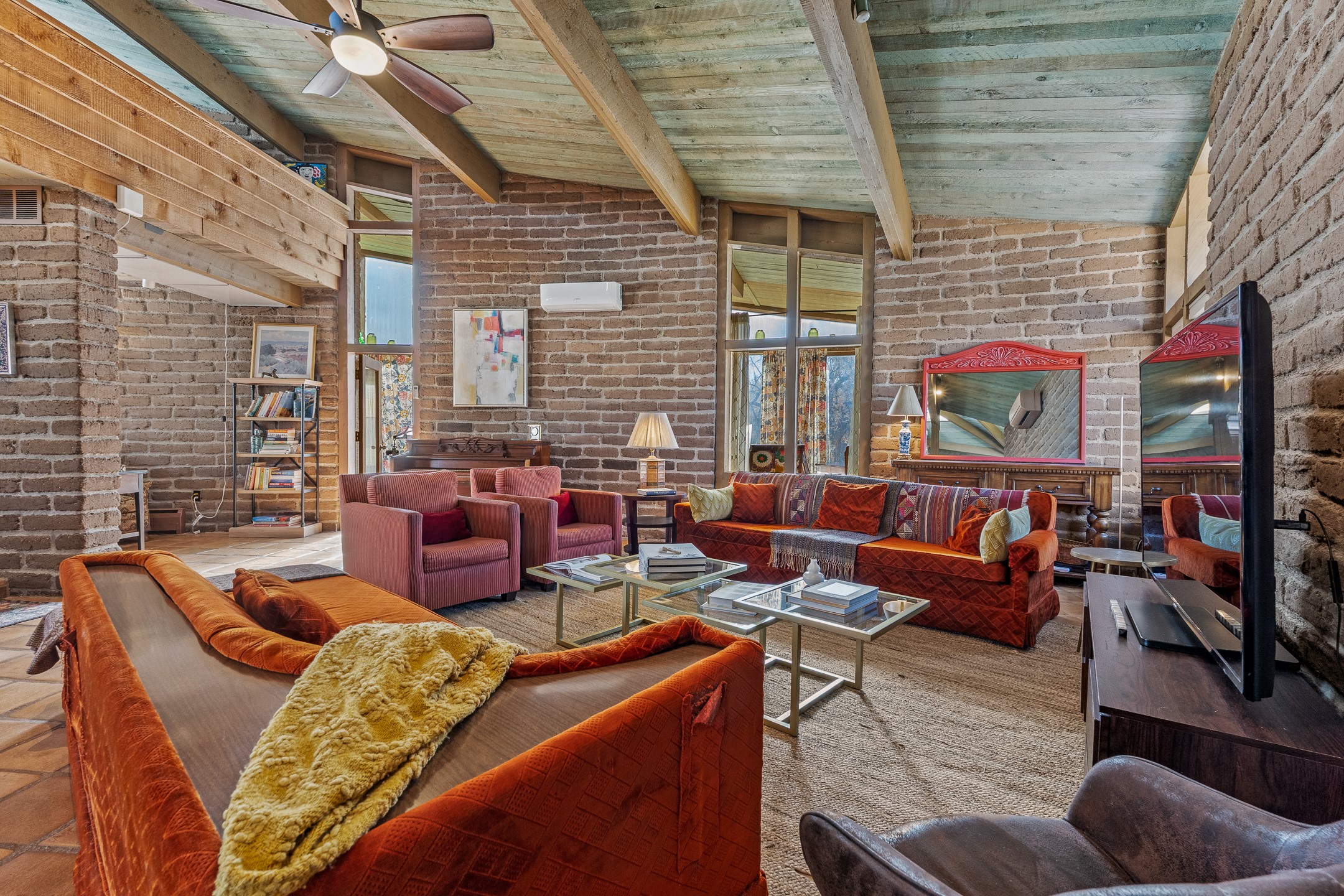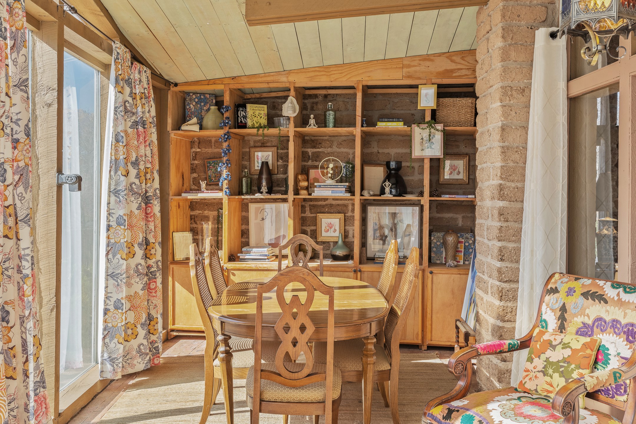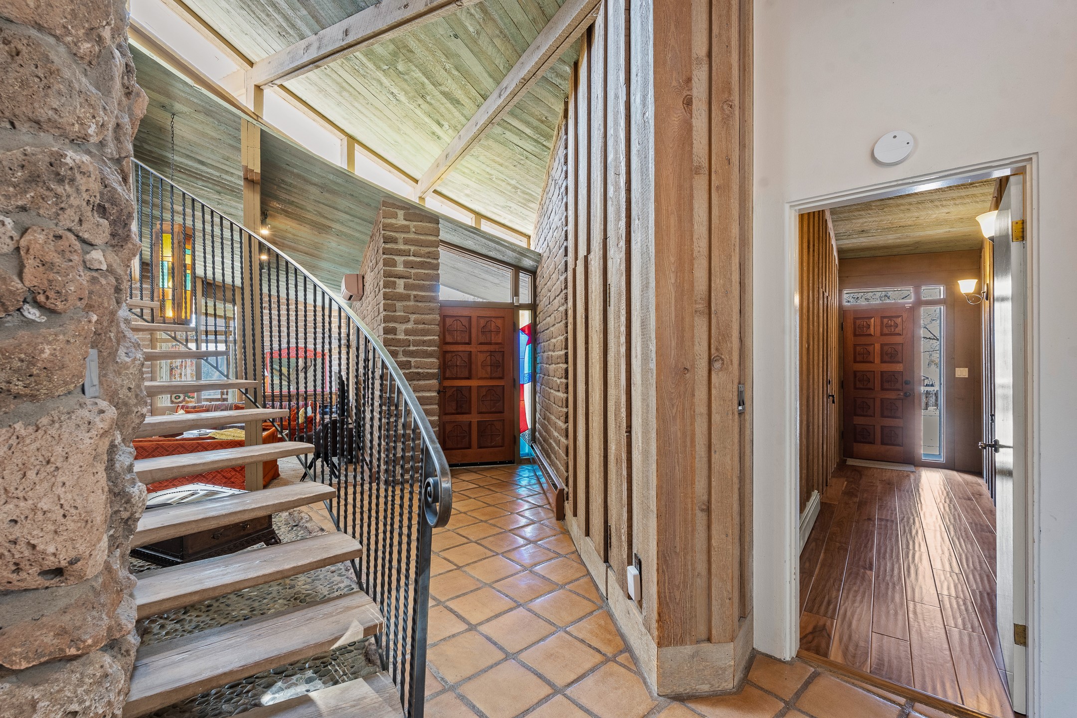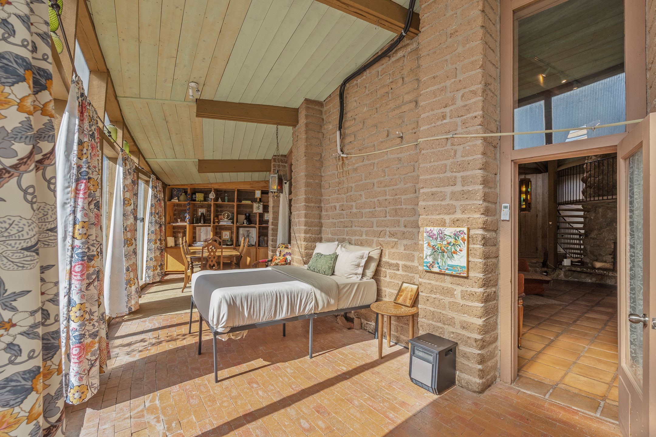 El Caracol Court | 34 State Road 503 is a truly distinctive riverfront property located along the Rio Nambe in the lush Nambe Valley. Designed by renowned local architect Allen L. McNown, a University of Oregon trained architect who settled in Pojoaque in the 1950s and became known for his contemporary adobe work with undulating forms and tinted-light interiors, including the modern church at Namb Pueblo. The home combines artistic design, functionality, and nature in an extraordinary way. Its form is inspired by the spiral geometry of a nautilus shell, a motif McNown used in other celebrated "snail" houses in the valley, and this architectural concept defines a flowing interior that celebrates light, water, and organic space. Set on approximately 2.10 acres, the property is fully fenced and offers both privacy and usability. It benefits from surface water rights off the Rio Nambe as well as a shared well, providing flexibility for landscaping and irrigation. The grounds include mature trees, gardens, a swimming pool, storage shed, and a separate workshop--a combination rarely found in this corridor.The residence itself measures roughly 4,000 square feet with three bedrooms and three bathrooms. Key design features include adobe and frame construction, dramatic curving walls, exposed wood beams, a lava-rock fireplace, and a sweeping staircase that centers the home's open plan. Additional amenities include: 40' Private swimming pool with adjacent lounge area, covered portal, sunroom with glass enclosure, solar improvements, mechanical system updates, maintained roof and gutters, radon mitigation system, updated appliances, and enhanced irrigation infrastructure. Exceptional maintenance and stewardship, upgrades over recent years that have modernized systems while preserving the artistic integrity of the home. The property has also been operated as a short-term rental, generating consistent income and showing strong demand as a retreat or vacation destination.