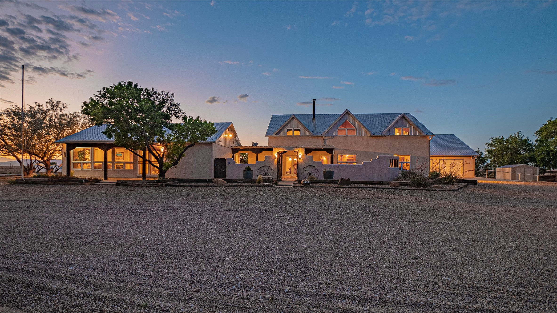 Rammed earth residence a total of 4,894 heated square feet, includes main house 3,099 sq ft and 1,795 sq ft casita. Casita would be perfect office or workspace, conveniently located. The main residence features four bedrooms and three and a half bathrooms, complemented by a flexible second living area that can function as either an office, library or tv room. The construction also emphasizes energy efficiency, contributing to overall savings. The property encompasses a total of 200+ acres fully fenced & crossed fenced. Gated entry, featuring a solar opener. 54' x 60' Eagle Steel Building, includes two interior frost-free faucets, 3/4" rubber mats, covered outdoor pens, and insulated ceilings for optimal climate control. 40' x 42' metal barn equipped with 220-volt electricity, pipe corrals, a storage with saddle racks, insulated garage doors, and concrete flooring. 10' x 14' greenhouse, an 8' x 12' Weather King portable building, a 12' x 12' feed shed, a 10' x 10' garden shed, and chicken coop with an enclosed run, making it ideal for agricultural pursuits.Equipped with a standby generator for the home & casita ensuring continuous electricity for the essentials. Gutters for effective water management across the home, casita, and barns. Interior & exterior spaces include tongue and groove, sturdy posts, beams, and corbels. The landscape is well-established, showcasing mature trees and a variety of fruit trees. An automatic bubbler and drip irrigation systems ensure efficient watering, while two courtyards provide additional outdoor living areas. The property is further enhanced by flagstone patios and sidewalks, creating inviting pathways throughout the low maintenance grounds.An attached insulated and finished two-car garage is complete with a locking storage room for added convenience. Additionally, the home & casita offer a finished attic space for additional storage. This property has it all and is waiting for you!